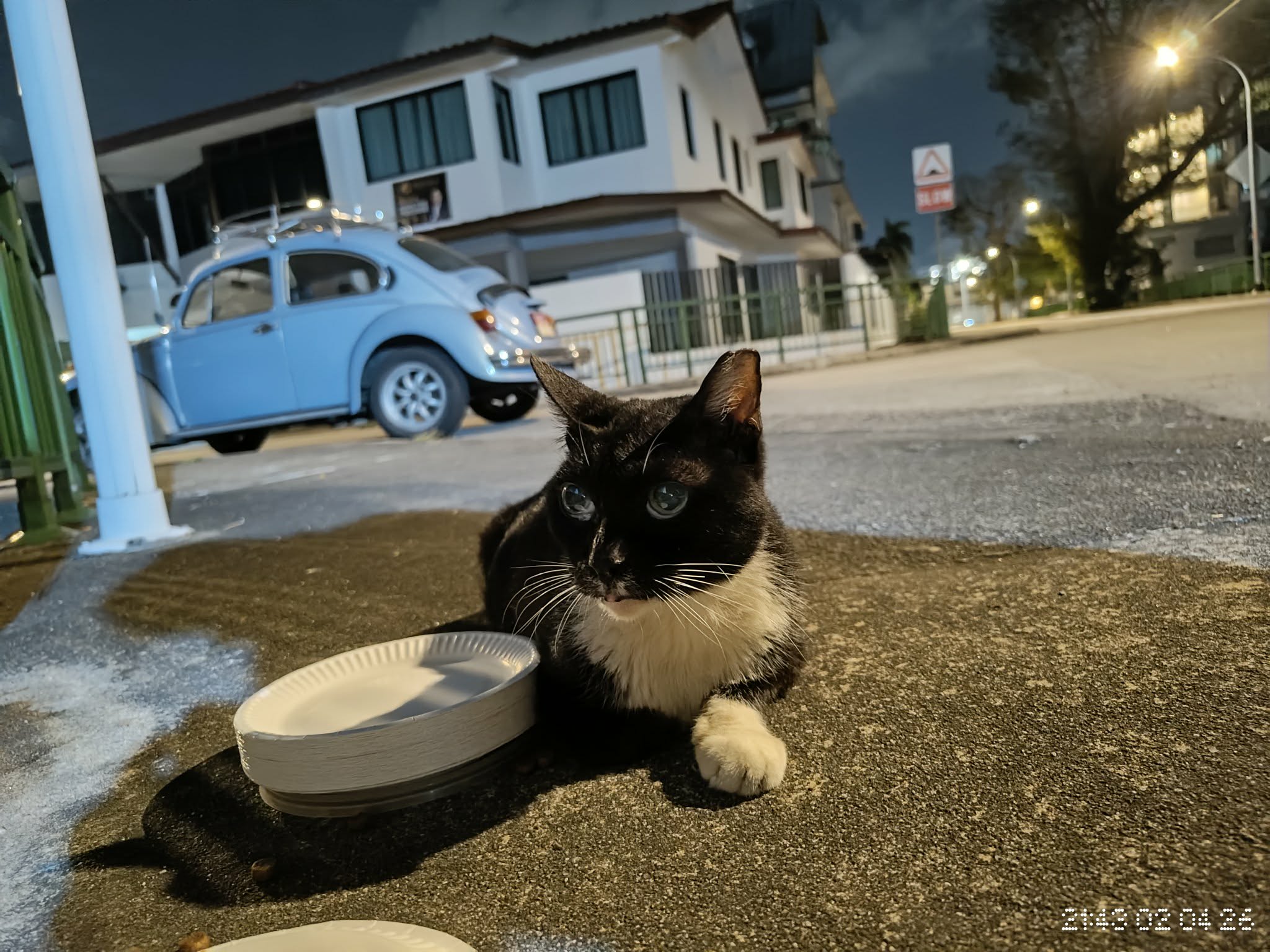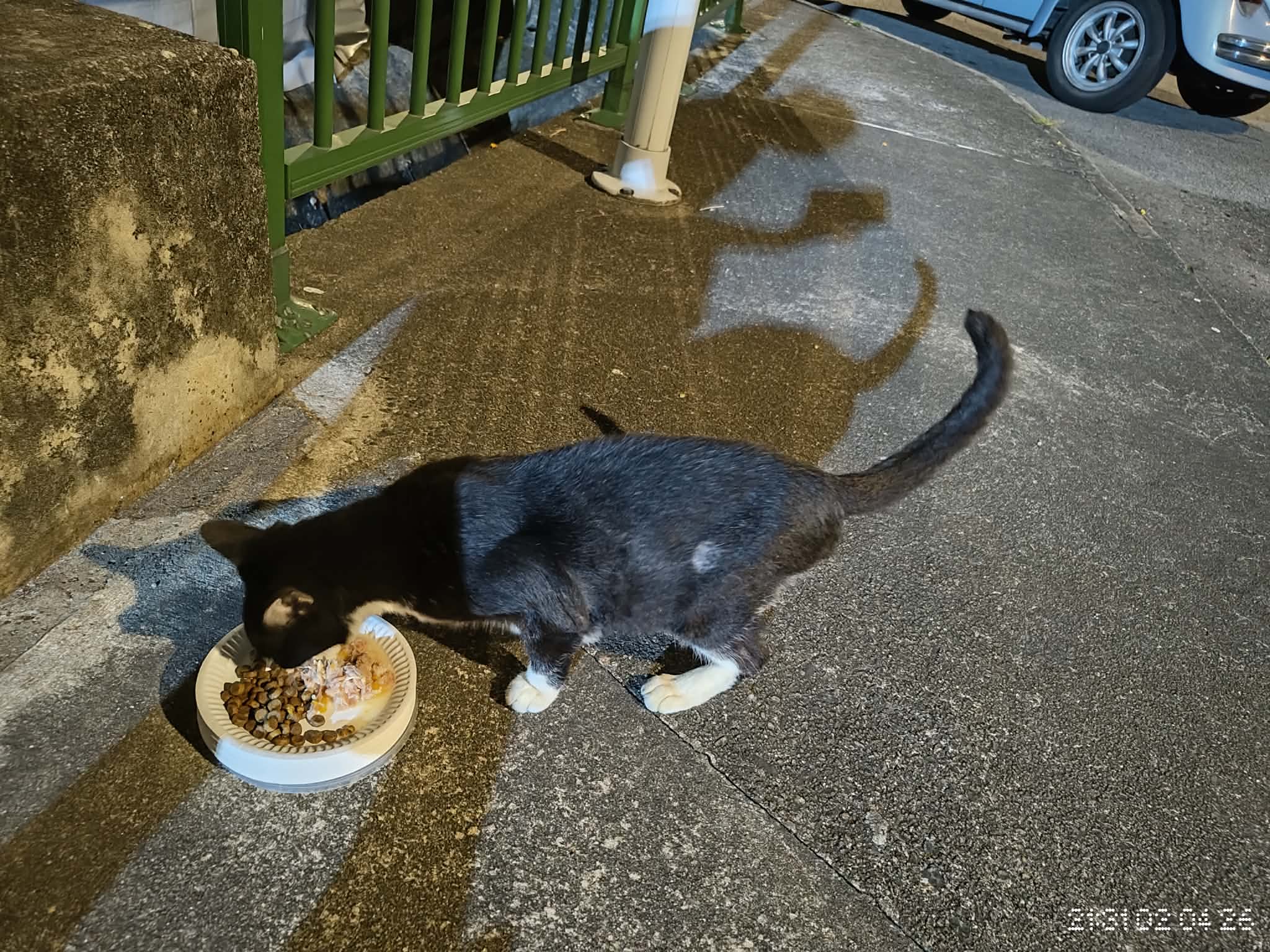 Just a community cat i get to know while looking for snow. not close. he come out sometime if really hungry. Normally he eat those rubbish food on floor i think. scare of human