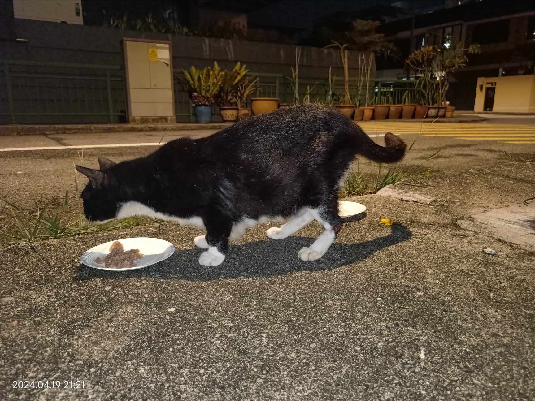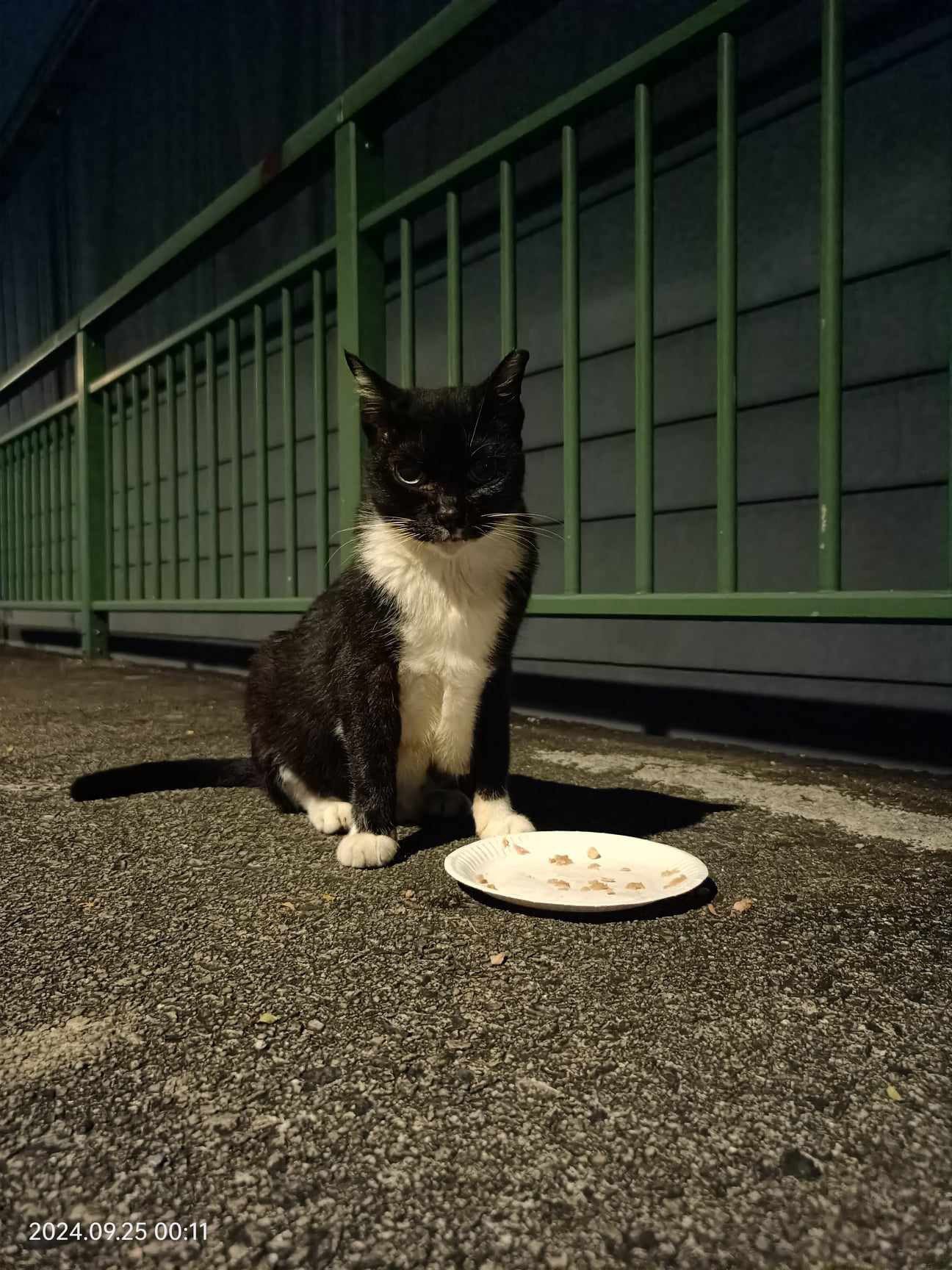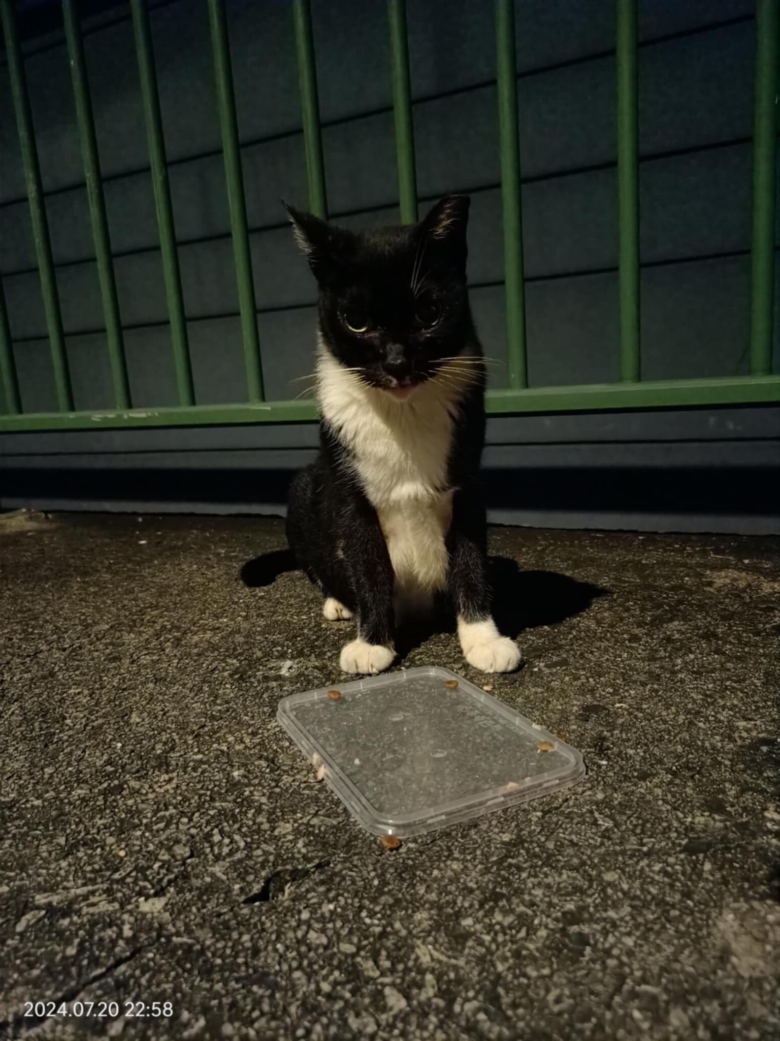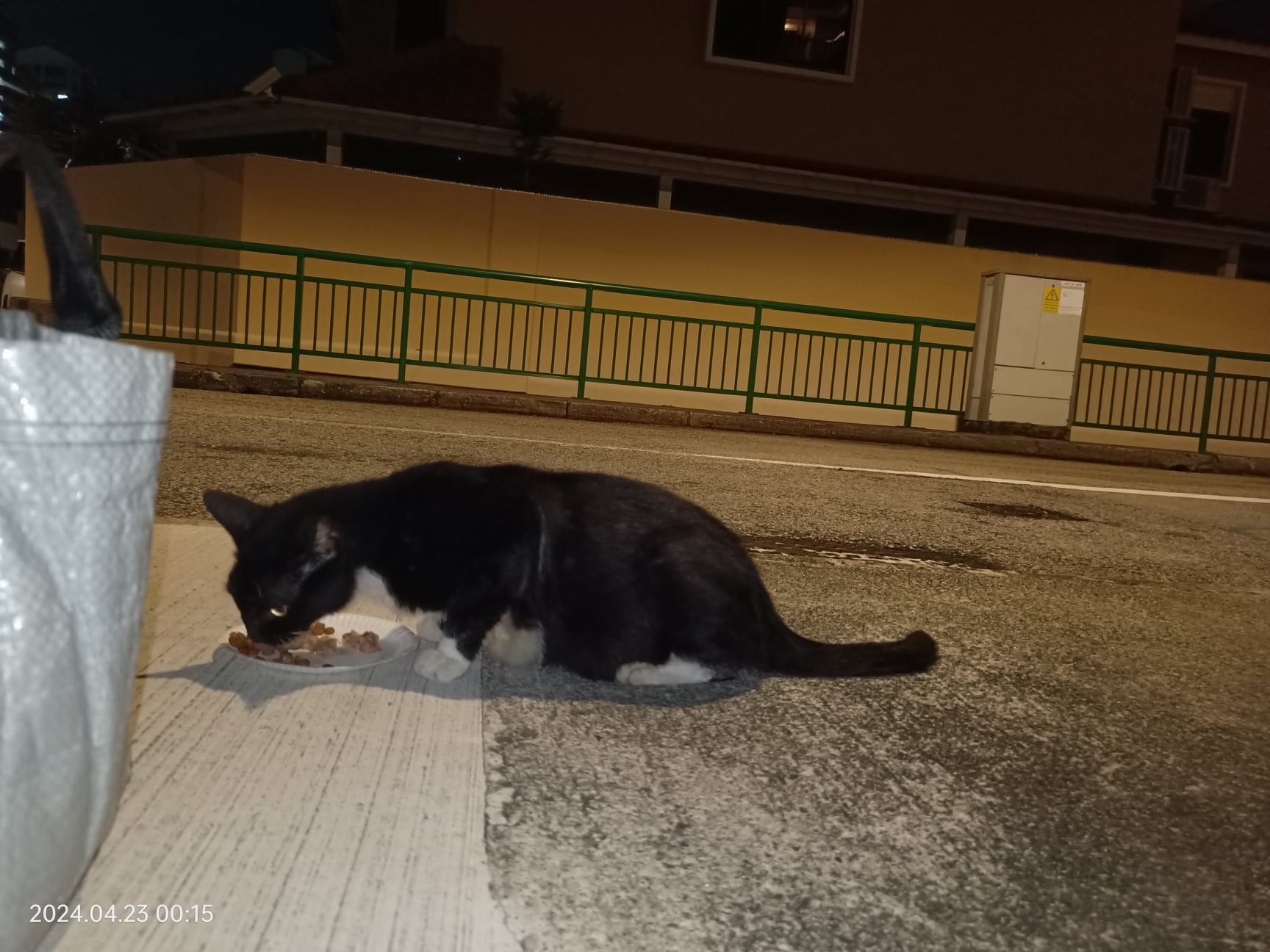 Just a community cat i get to know while looking for snow. not close. he come out sometime if really hungry. Normally he eat those rubbish food on floor i think. scare of human