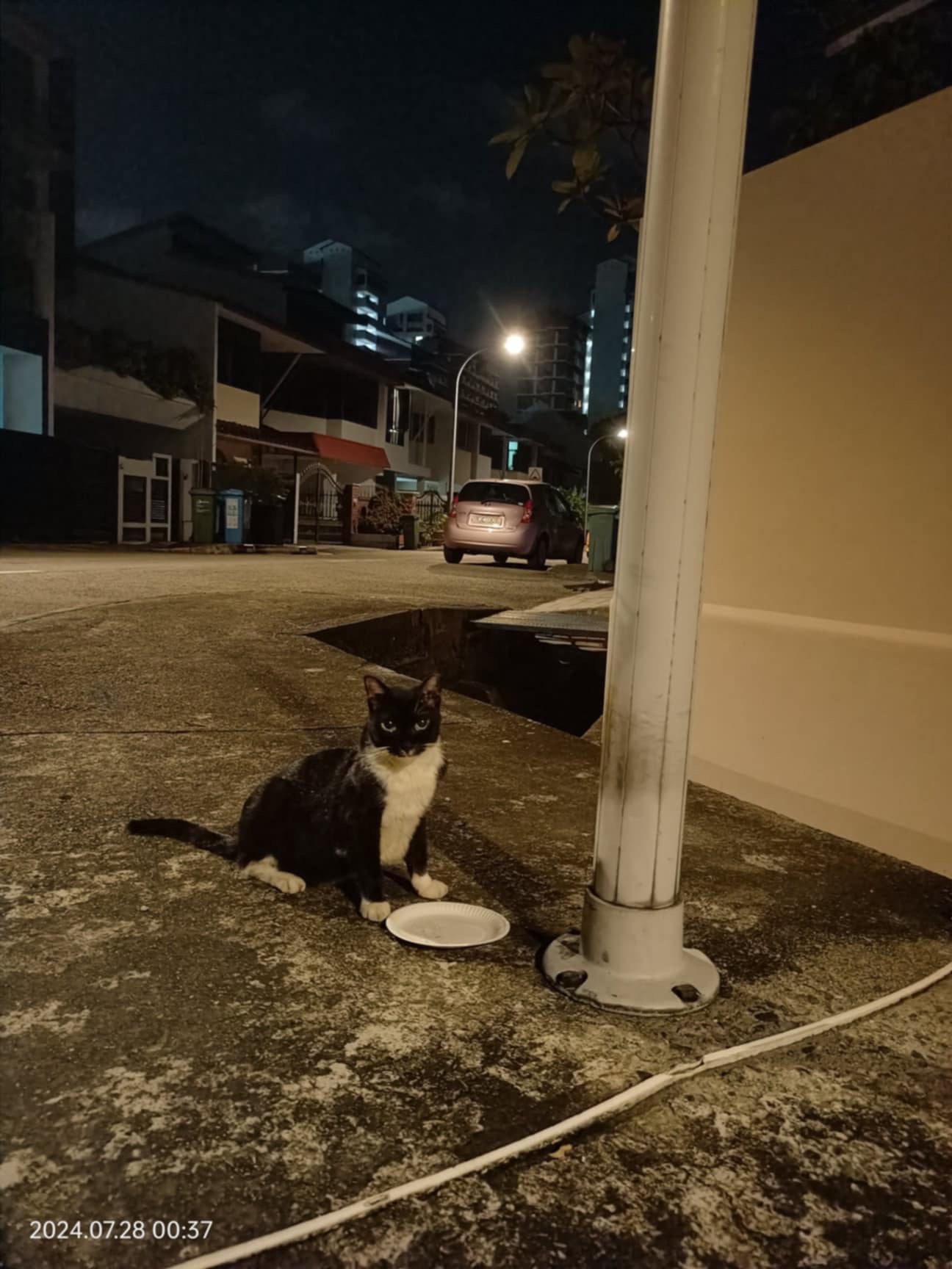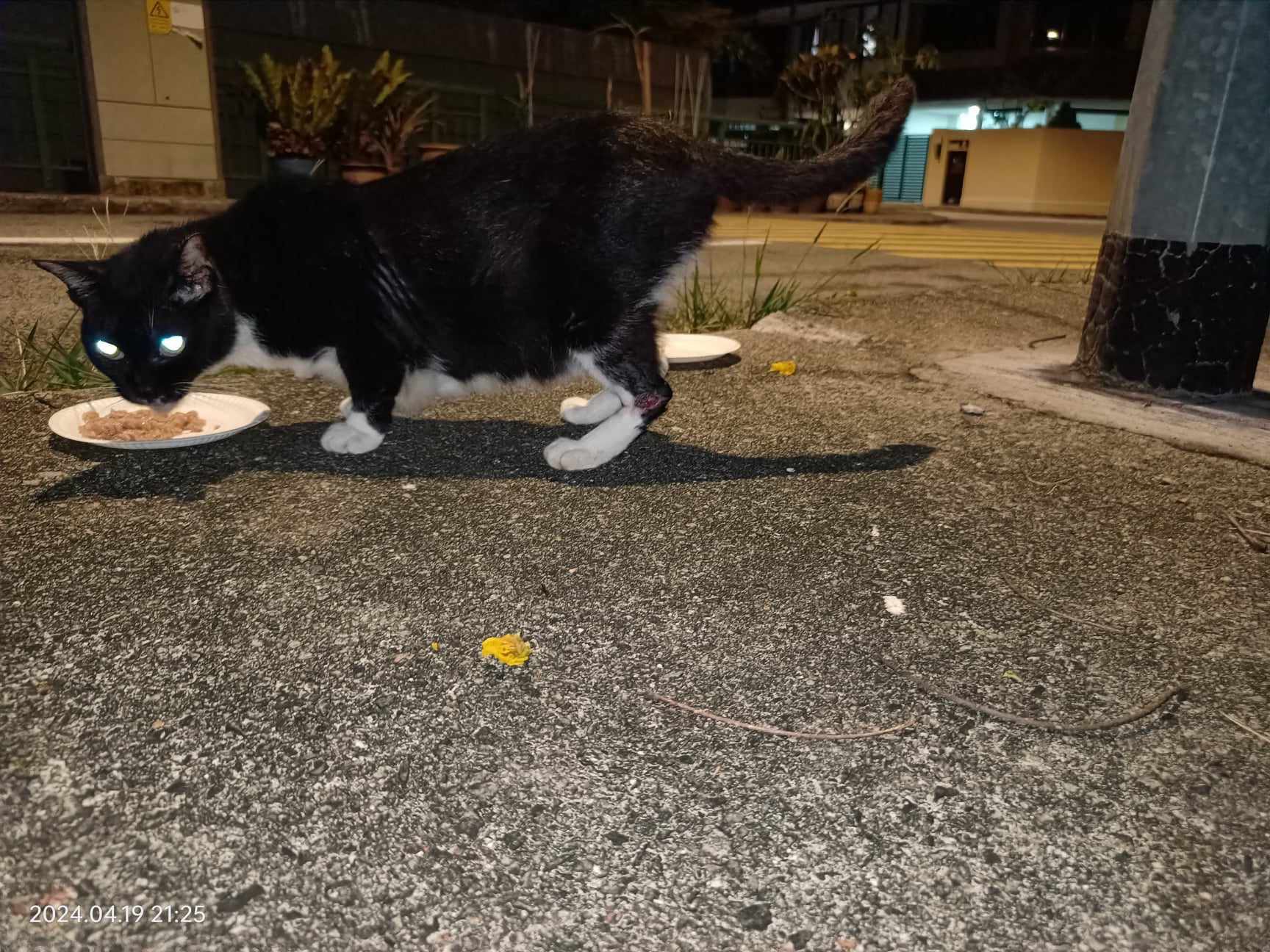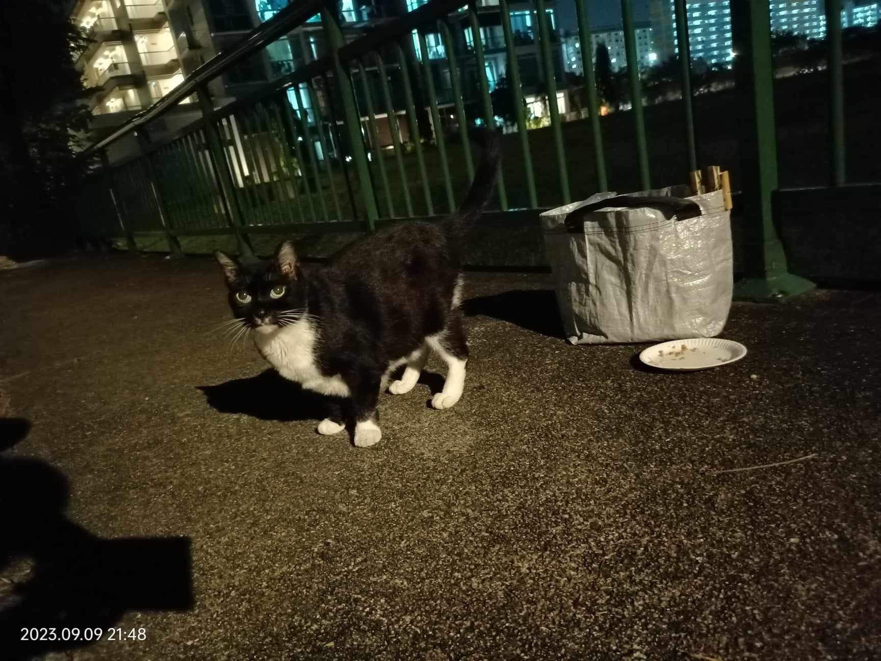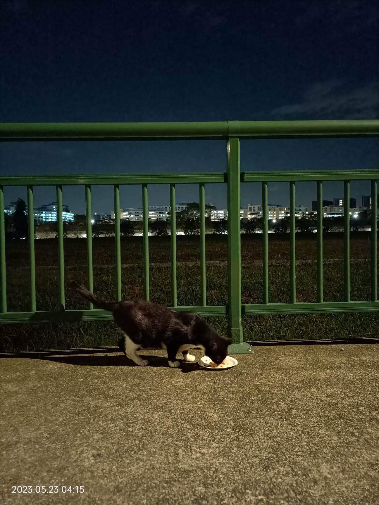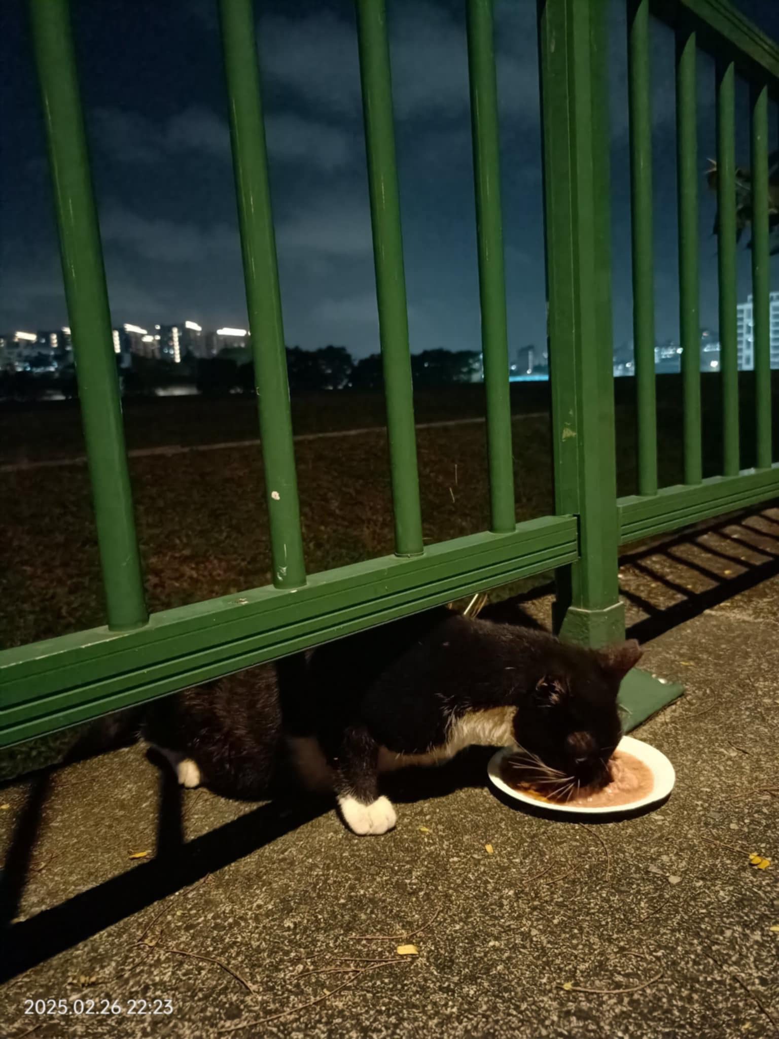 Just a community cat i get to know while looking for snow. not close. he come out sometime if really hungry. Normally he eat those rubbish food on floor i think. scare of human