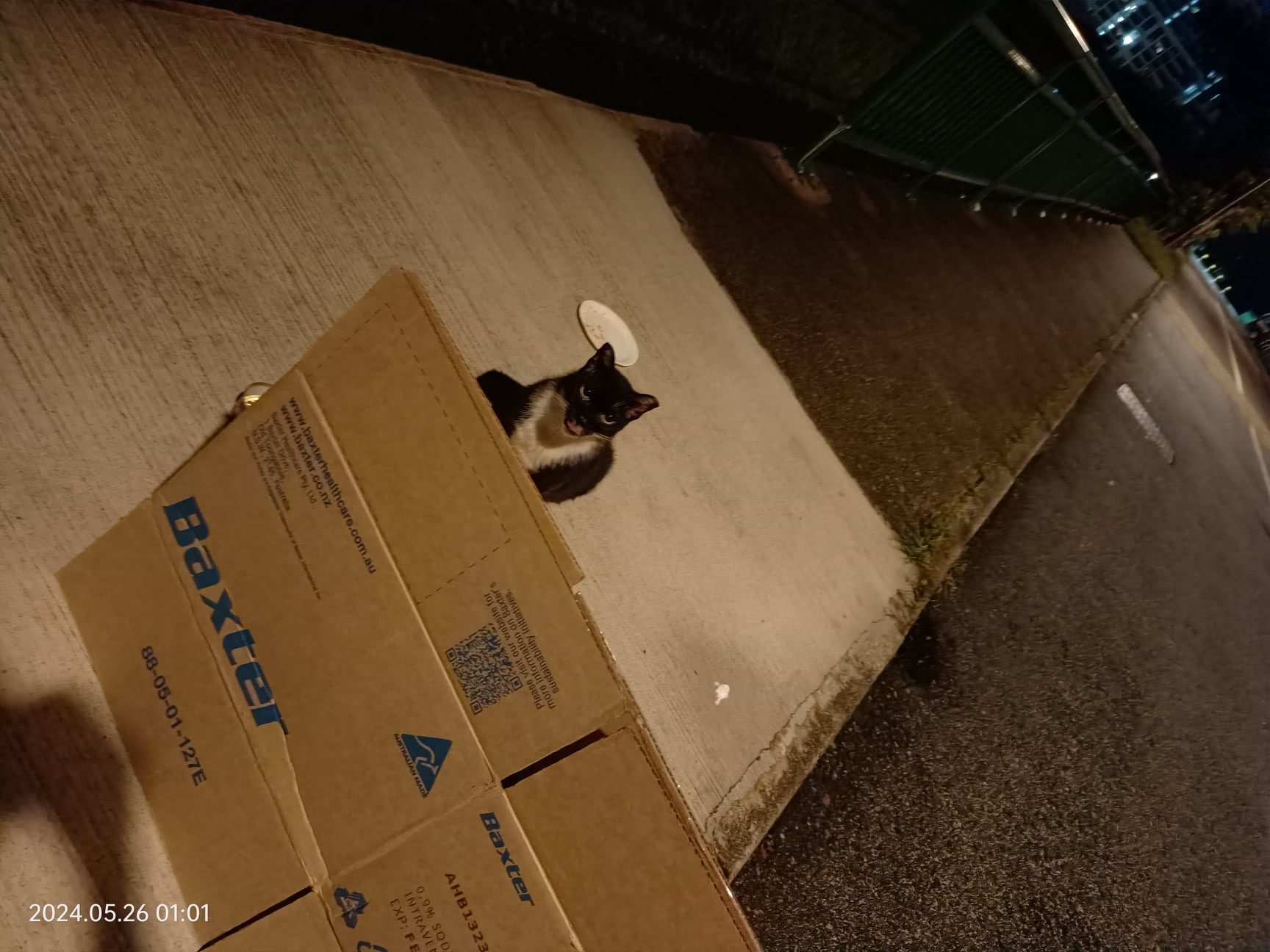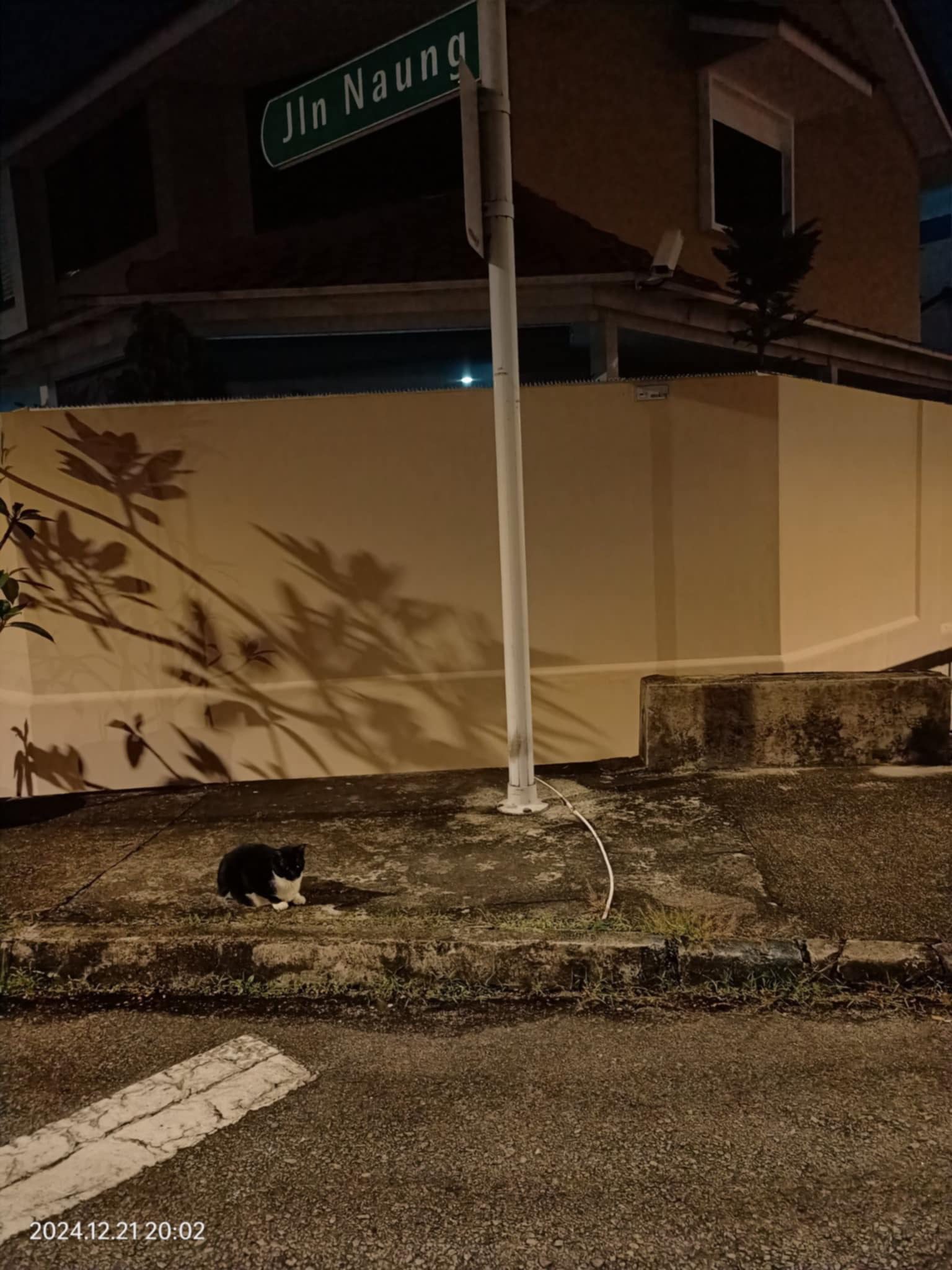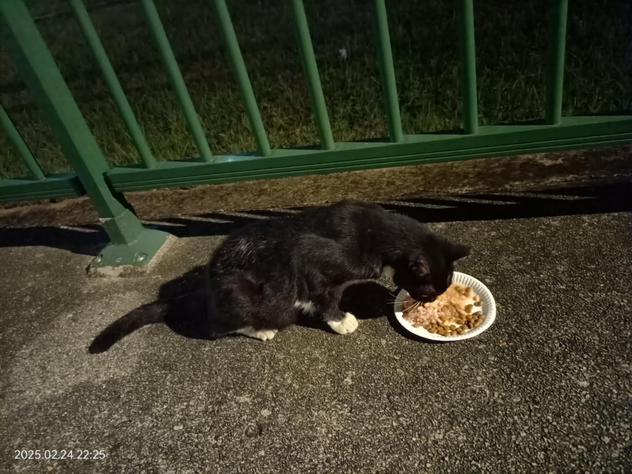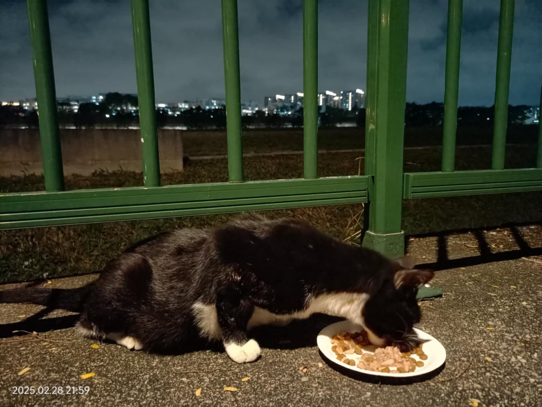 Just a community cat i get to know while looking for snow. not close. he come out sometime if really hungry. Normally he eat those rubbish food on floor i think. scare of human