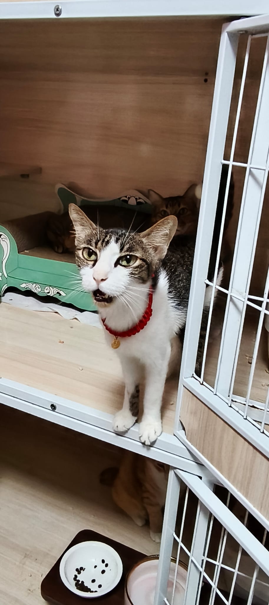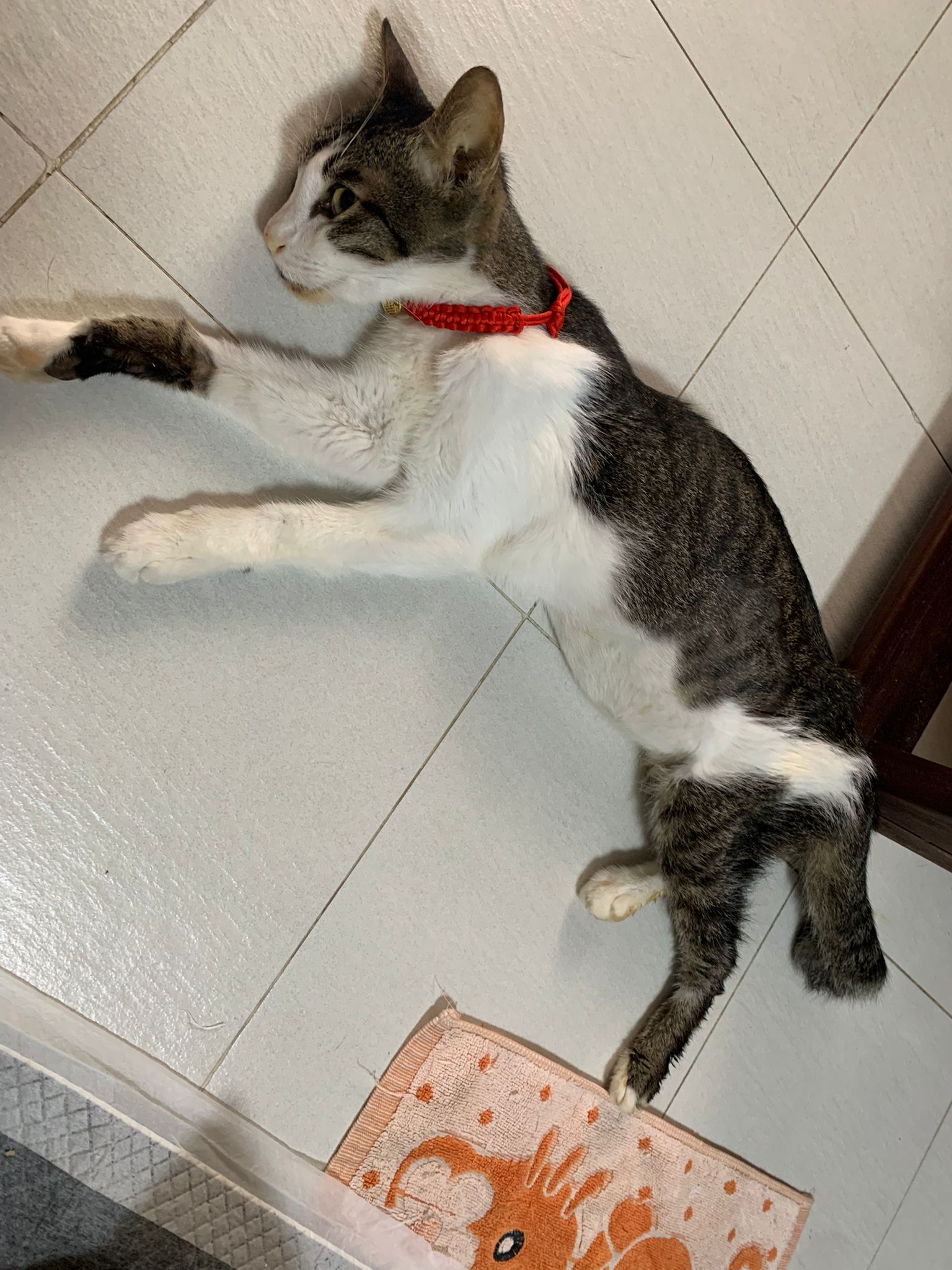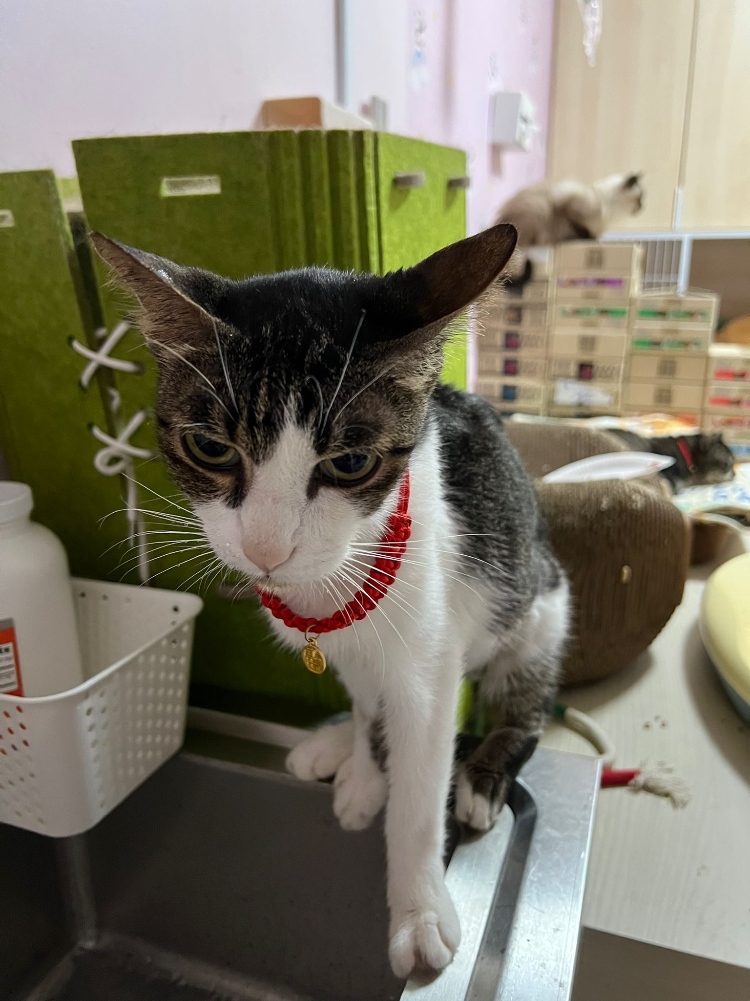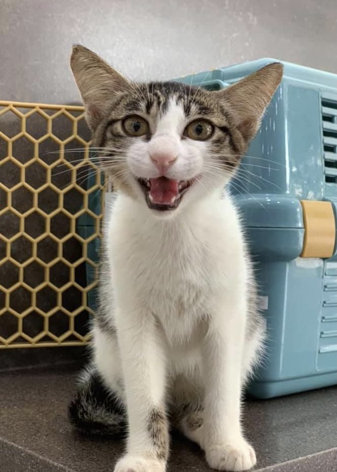 “bring to AD on26. Im otw to james tan to vacc and fiv felv. Two n half months. Rescurer thought is girl, so called mei mei on vaccination card, he is called ah boy now. Deworm done. Only Revo do later. They just give kibble. Adult kibble. Yes he ate some of their adult cat kibbles last night. Last time he ate was 6+am in the morning, in total he ate about 1 big scoop of food. I believe the current kibble we’re on is snappy Tom (my cat loves the little anchovies) Then nv pee or poo yet. Did not eat much. Last night so active also this am in cage”