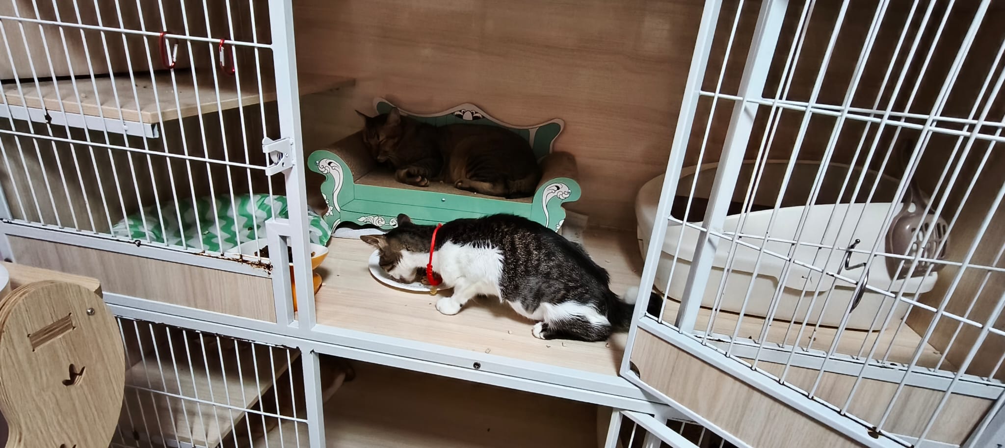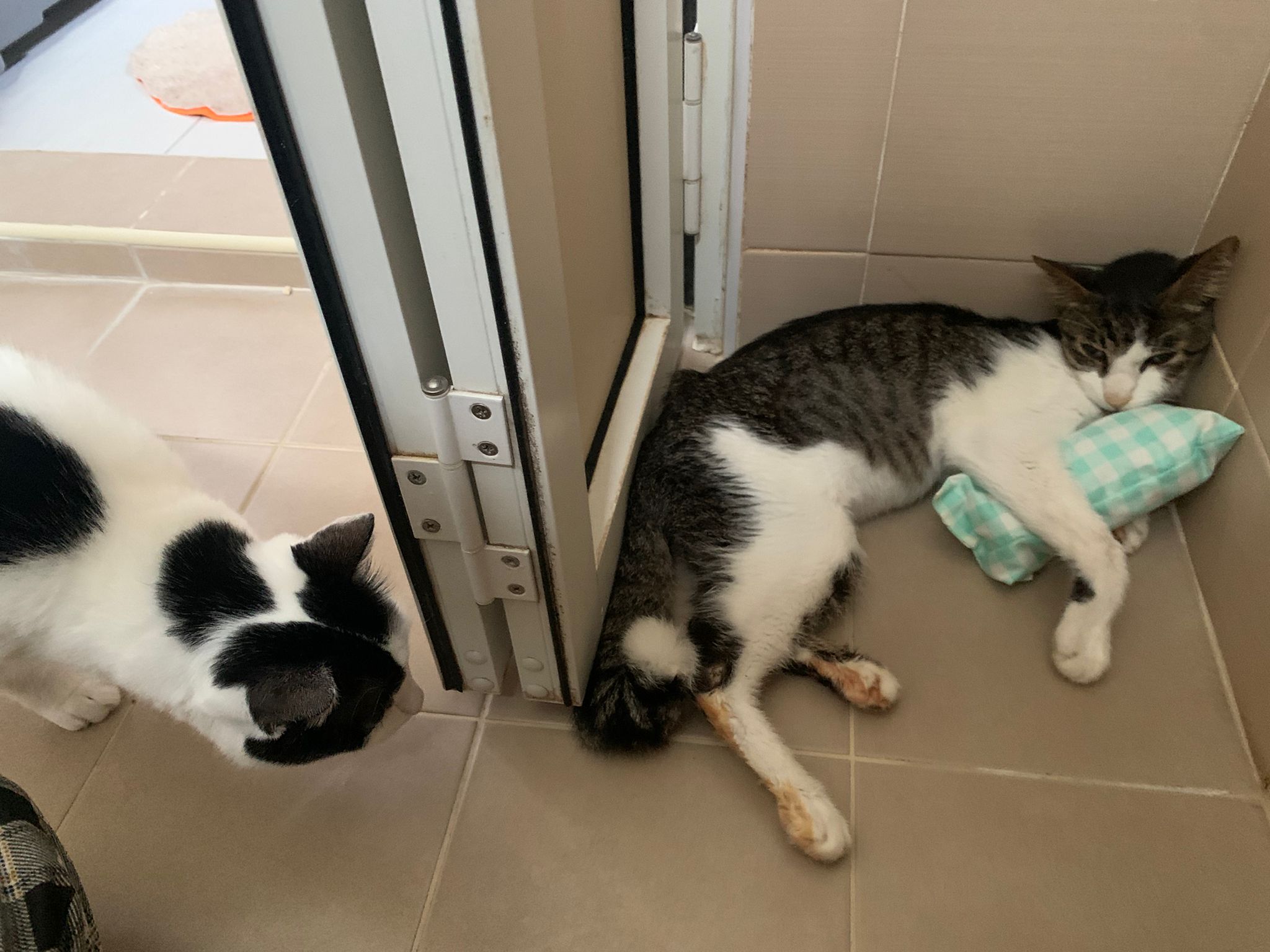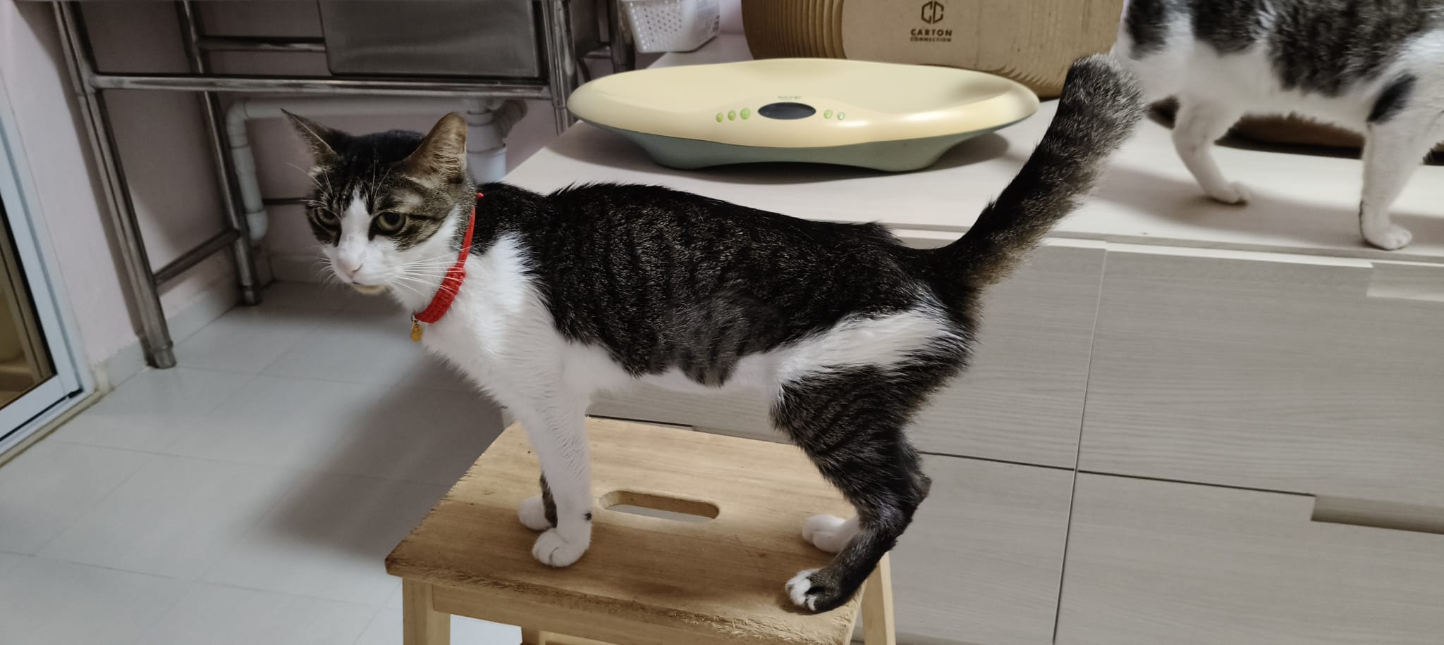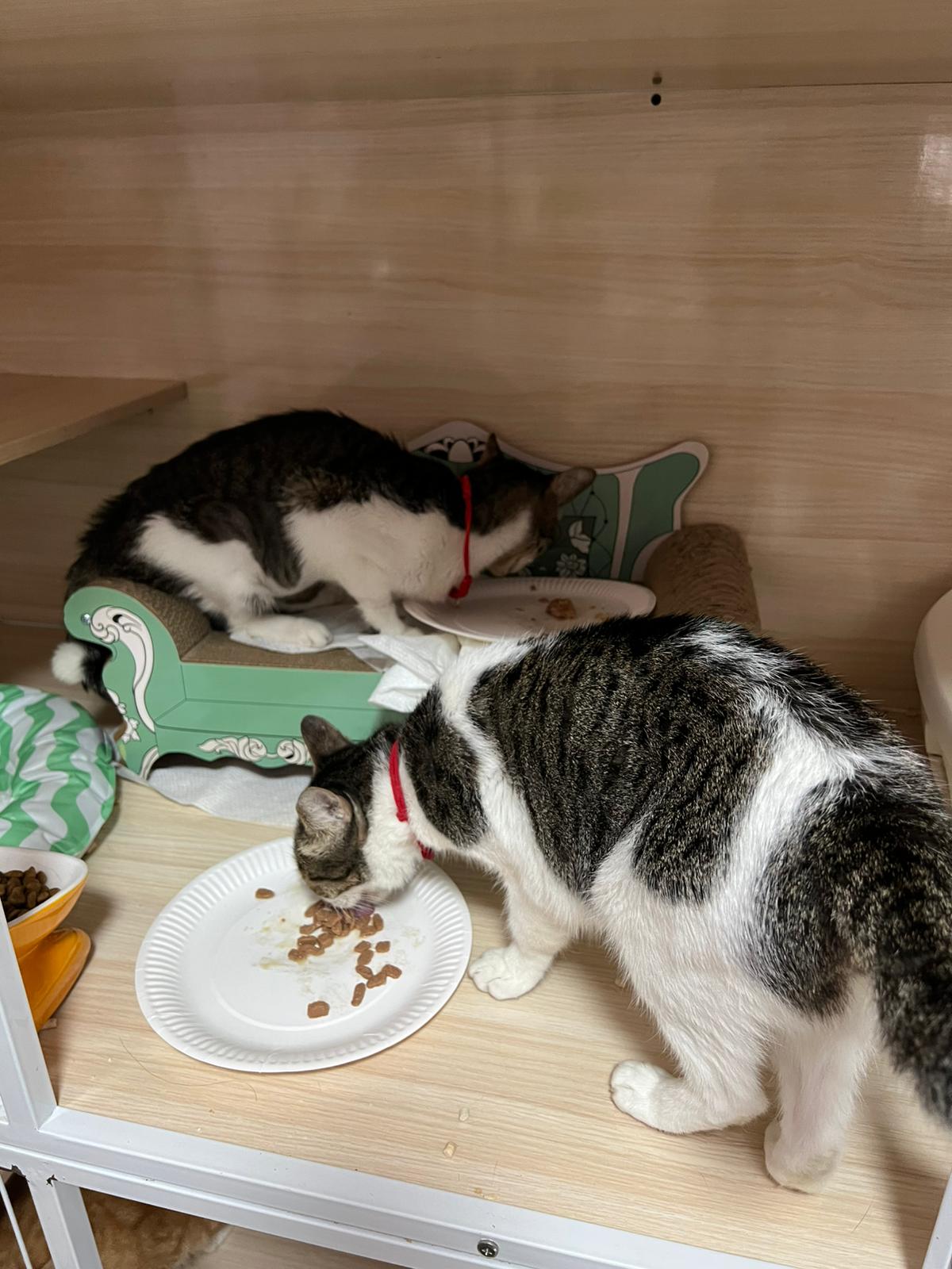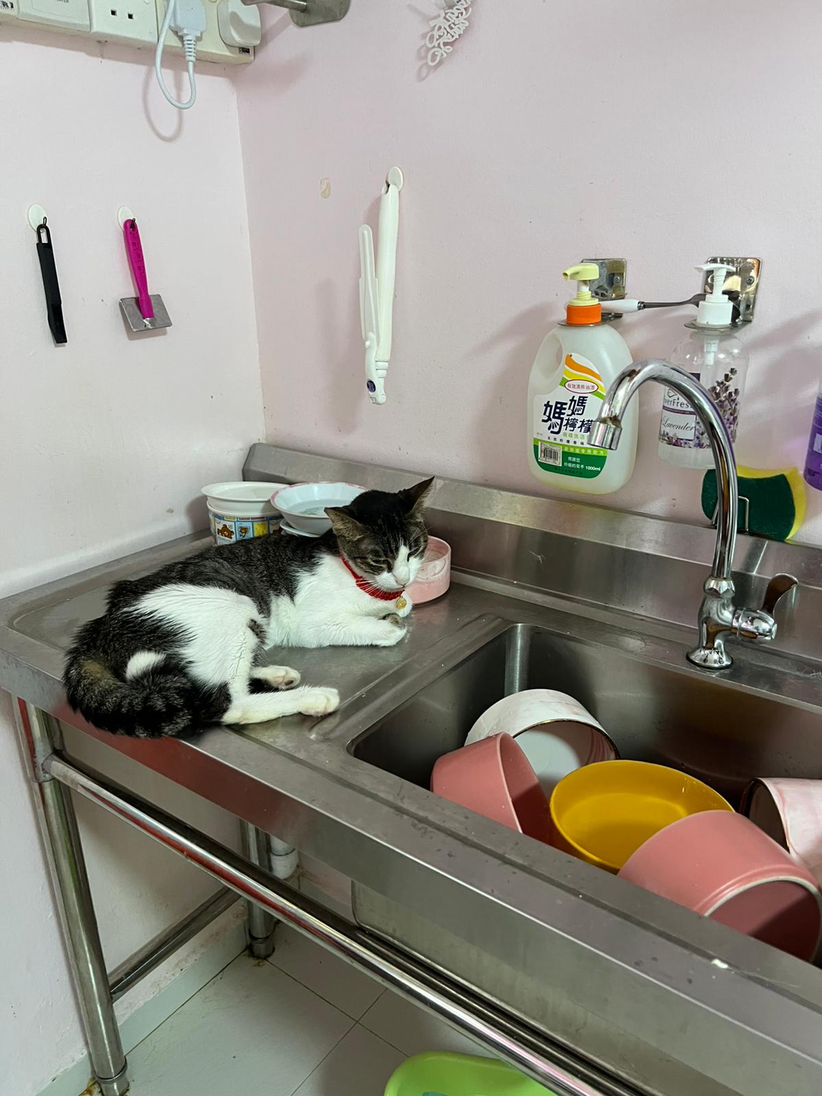 9.30am+: Will wait for breakfast w the rest. Drink from flowing tap. Kitty staying close to ah boy.