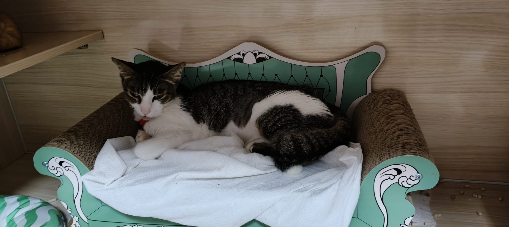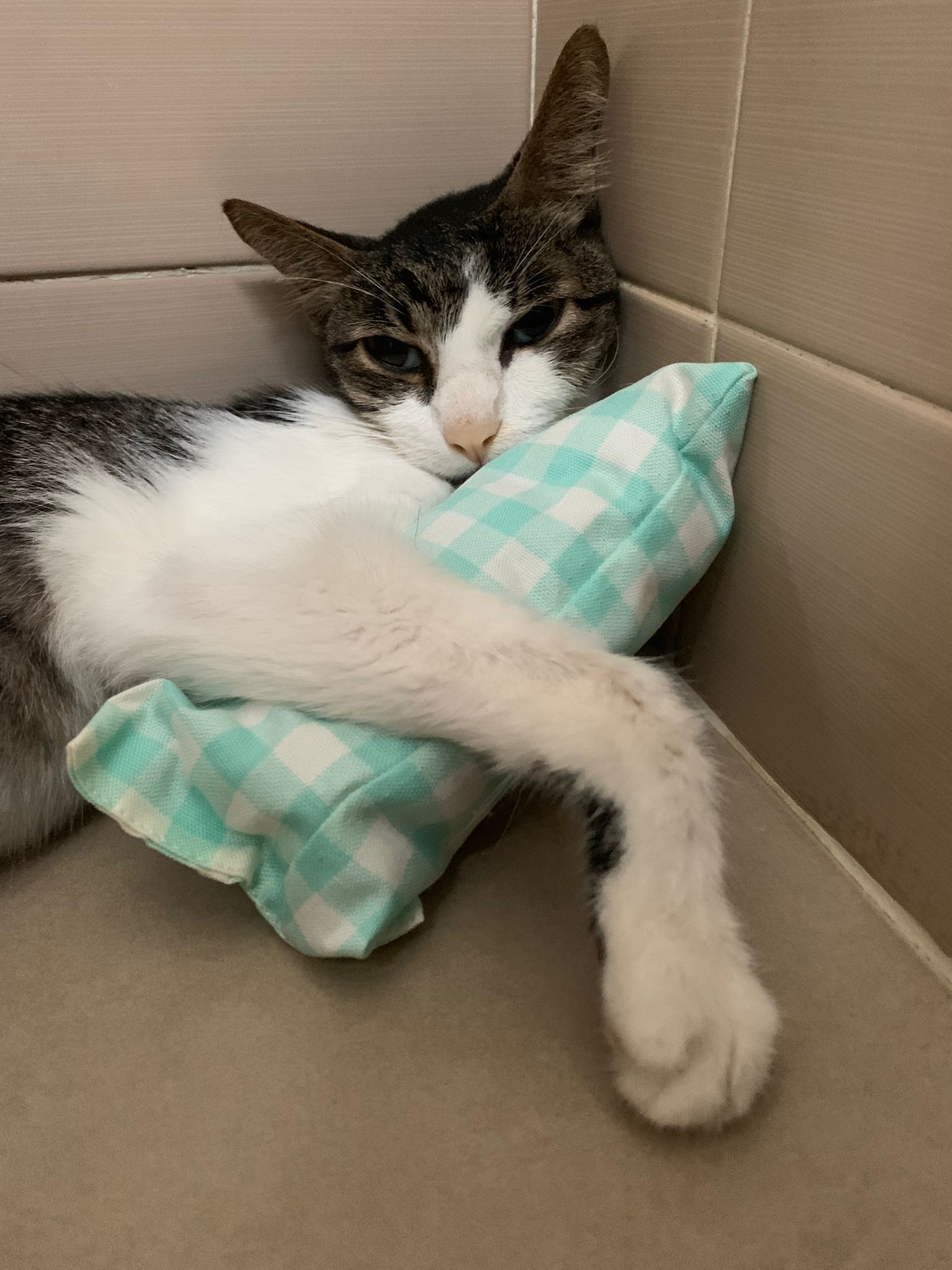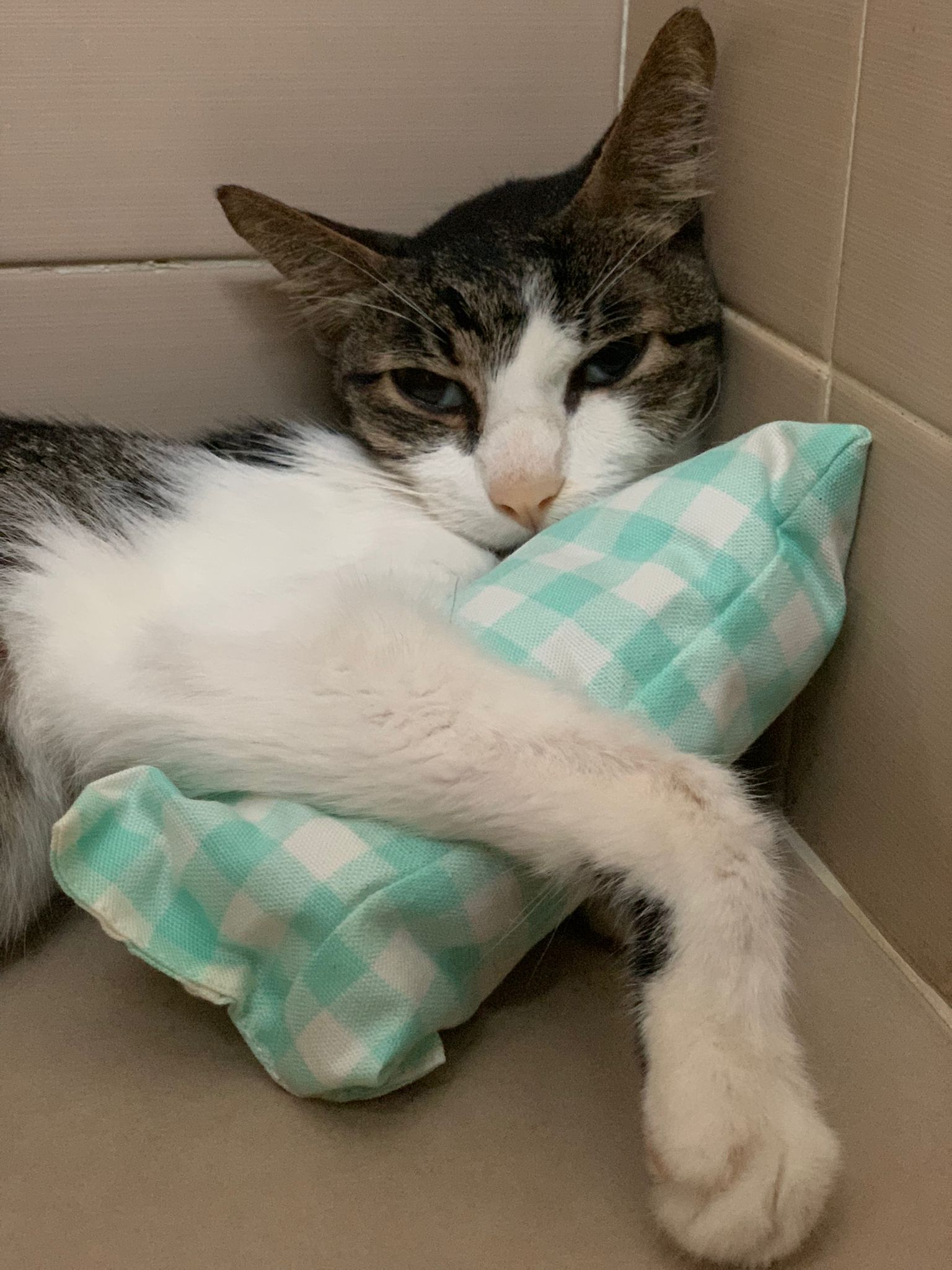 B4 I leave he is in her toilet, corner, I told him if he wanna peace to slowly leave, we let him be. But know everyone love him. Even joy come visit him. I gave him our last Joni powerful catnip toy for him to hug, no reaction. Just let him hug for comfort.