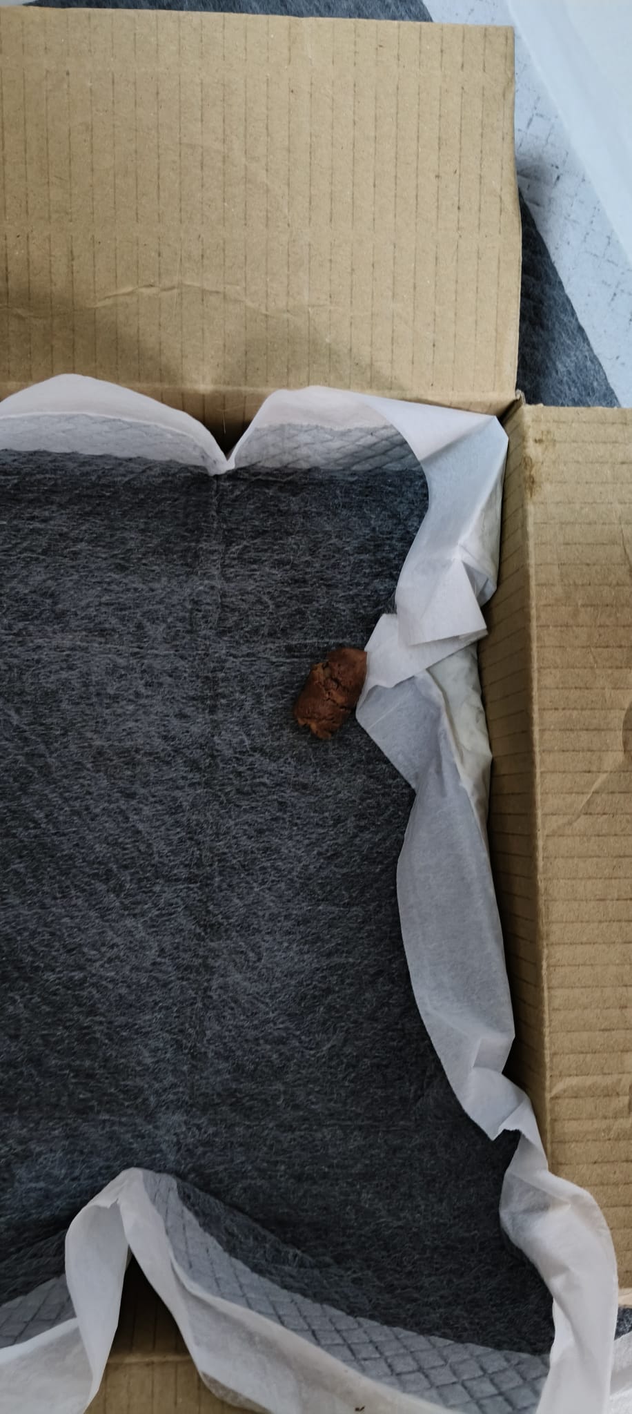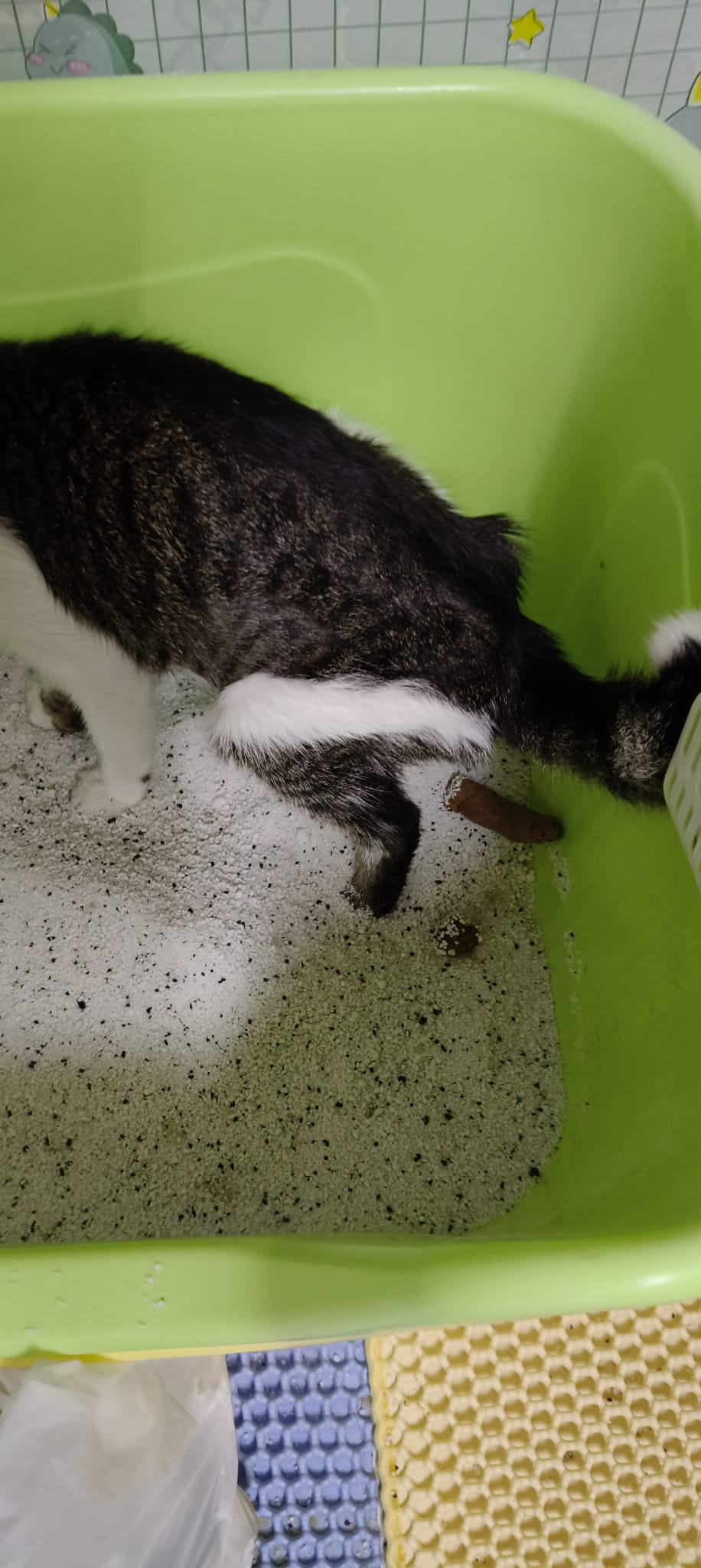 8.19am: mmm:”He’s not eating. He was sleeping near toilet. In his pee. Wet body” – oh he is at mmm toilet. Got poo near his butt, 1.5/5, but got a pc of 4cm 4.5/10 poo on the Peeped- should be too weak to poo.