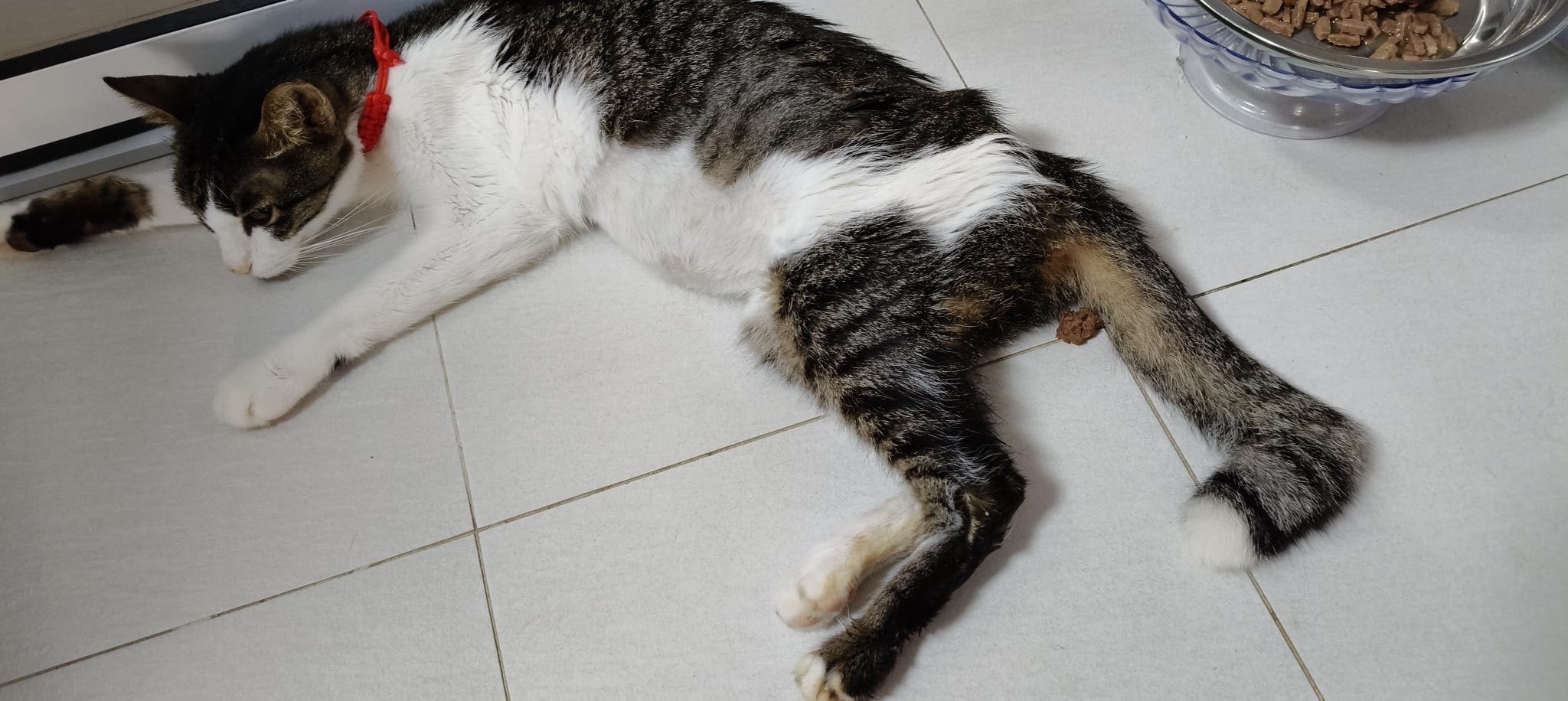 Night: mmm;”I reached home n he came to door to ask for food. Gave him. He ate. Then I carried him to bin. Spots of pee. Then this. Like gastric”