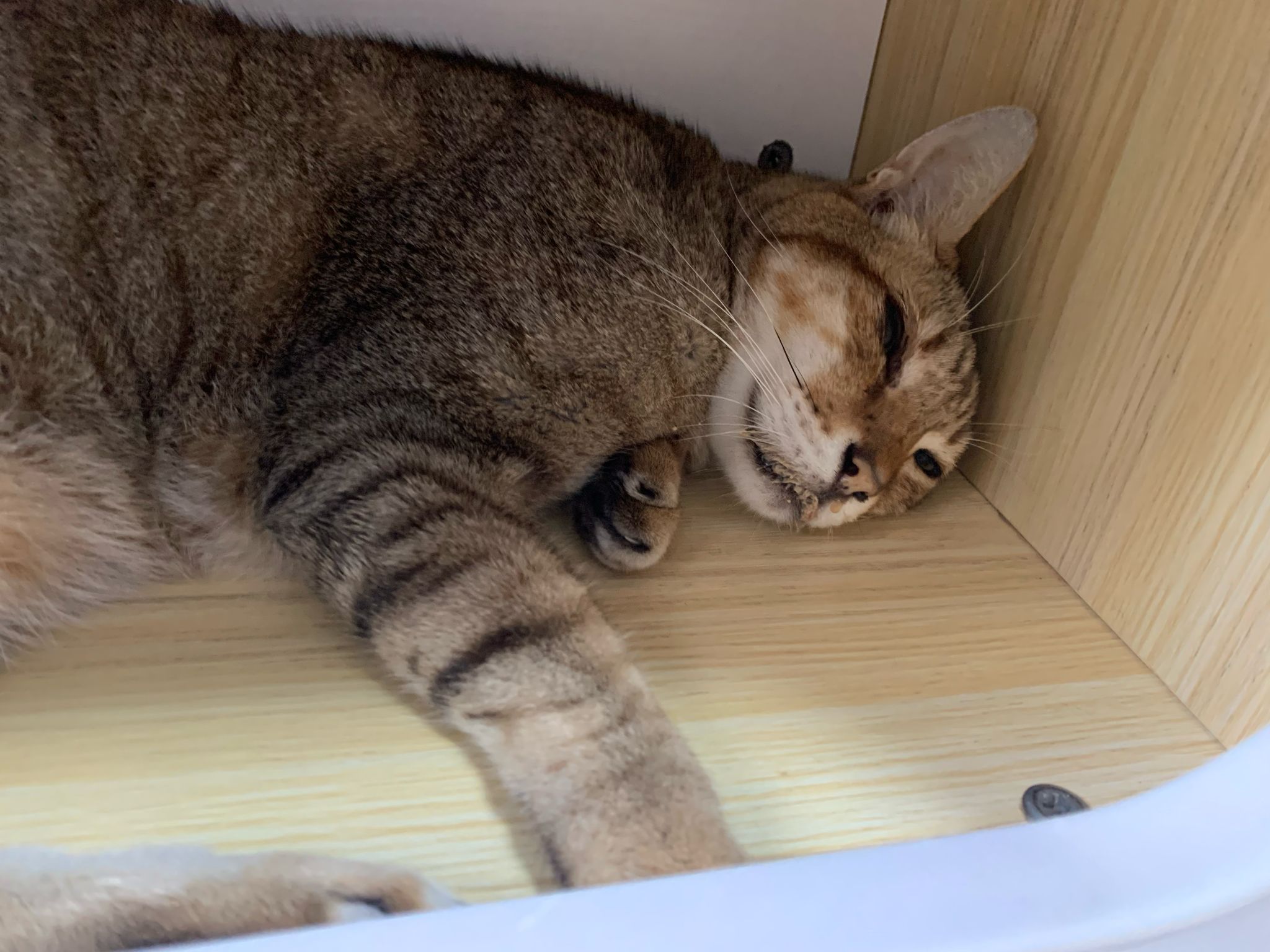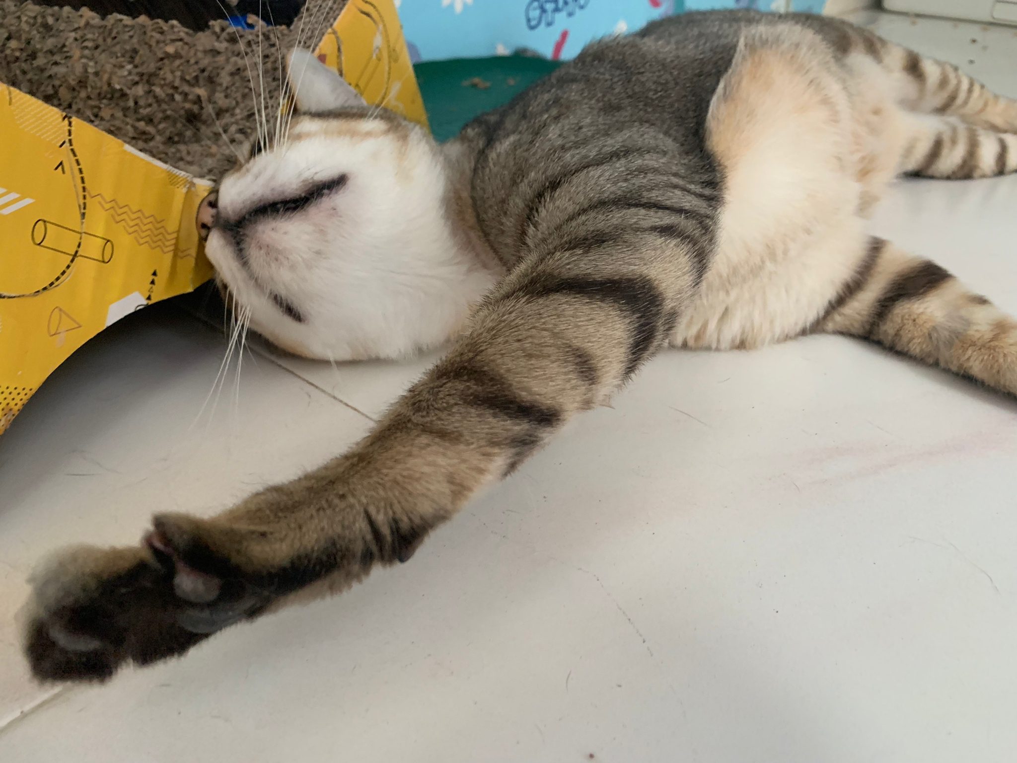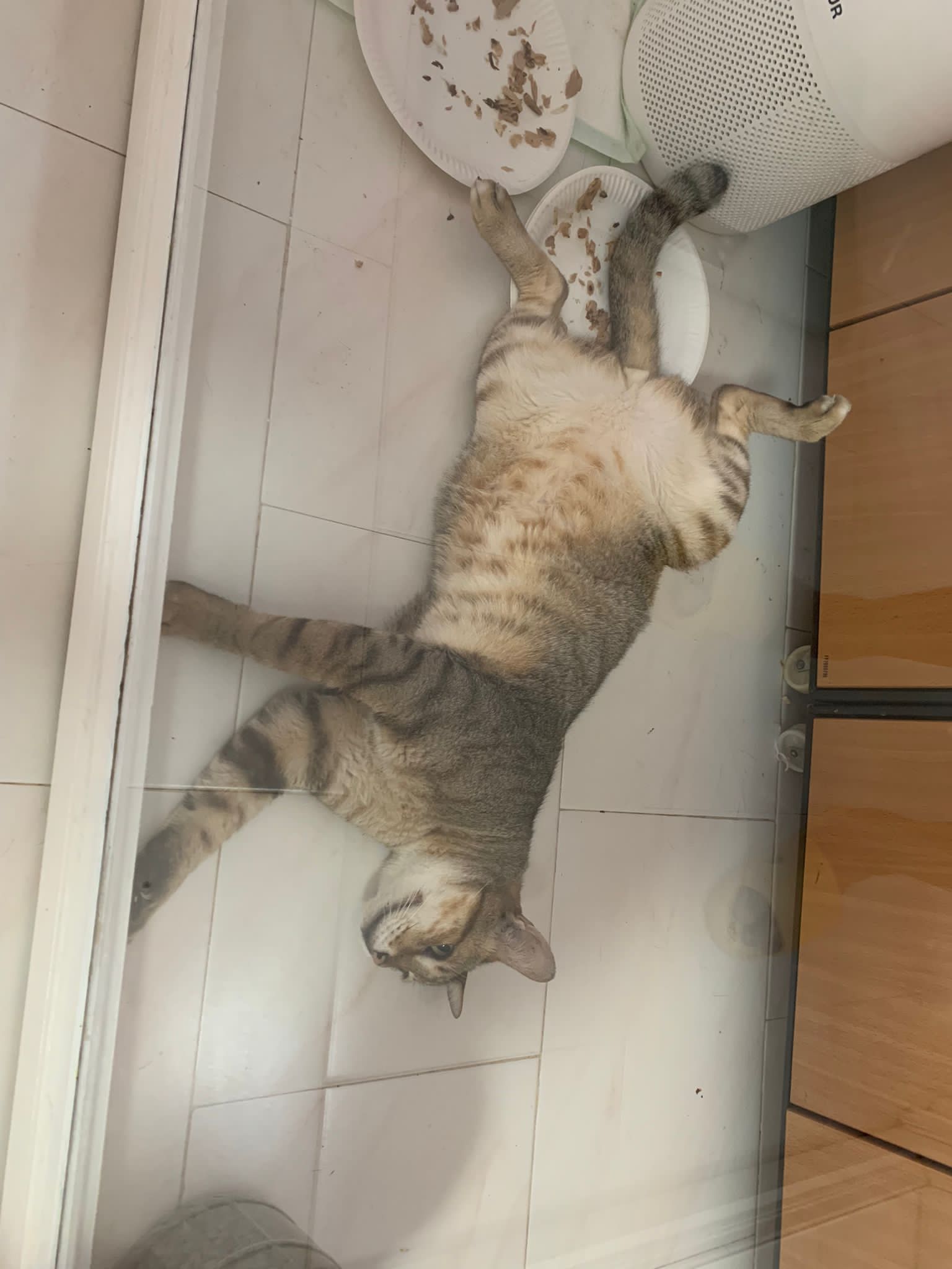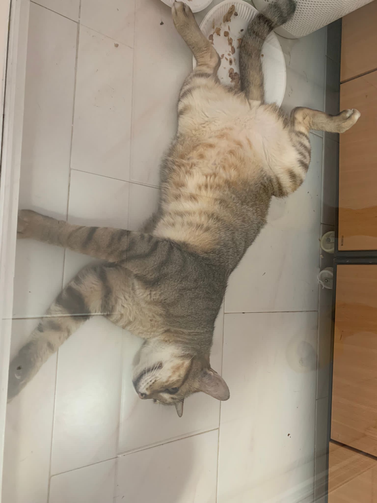10.29am: from Ip: he sleep beside Xiami bin, scary pose, check 1015am: he is at the front kibble buffet area.