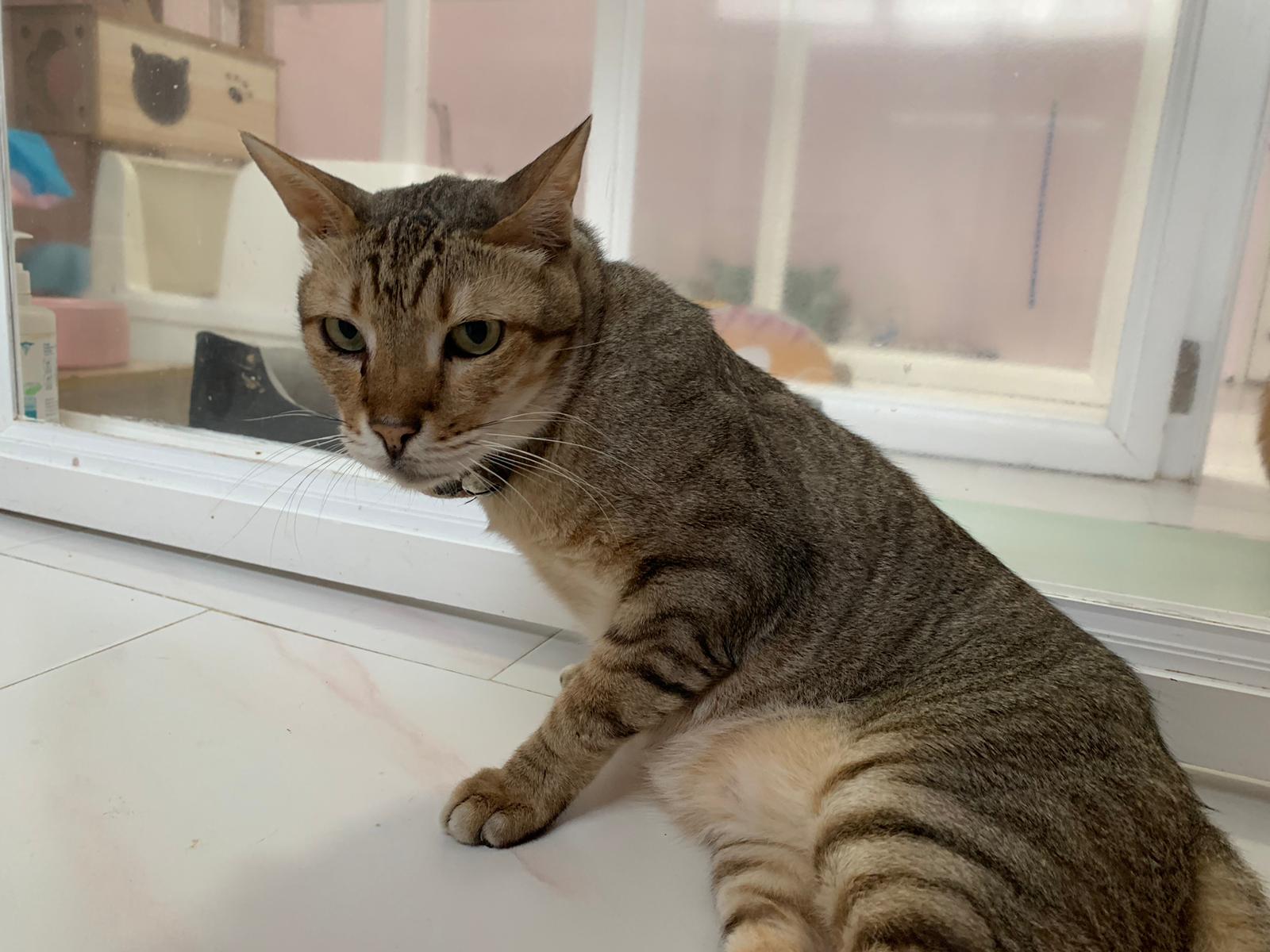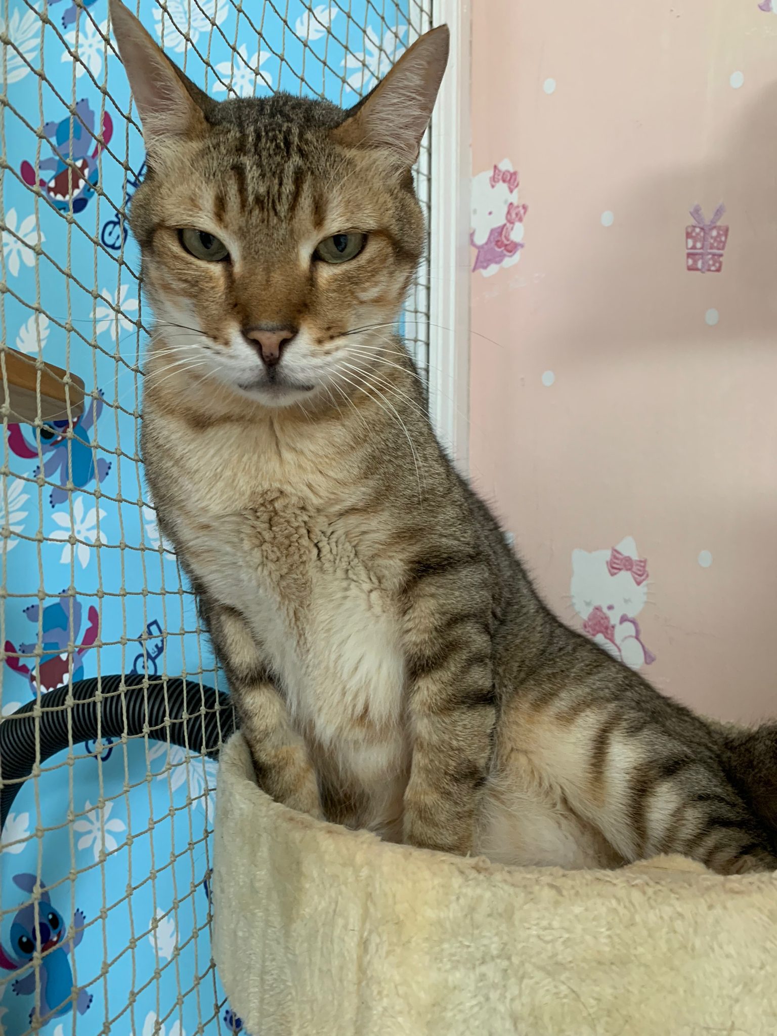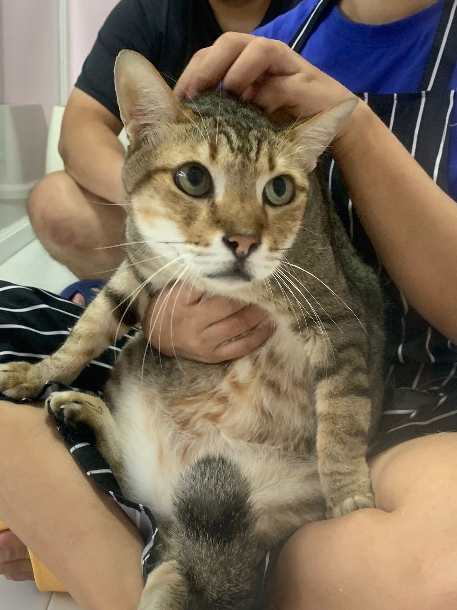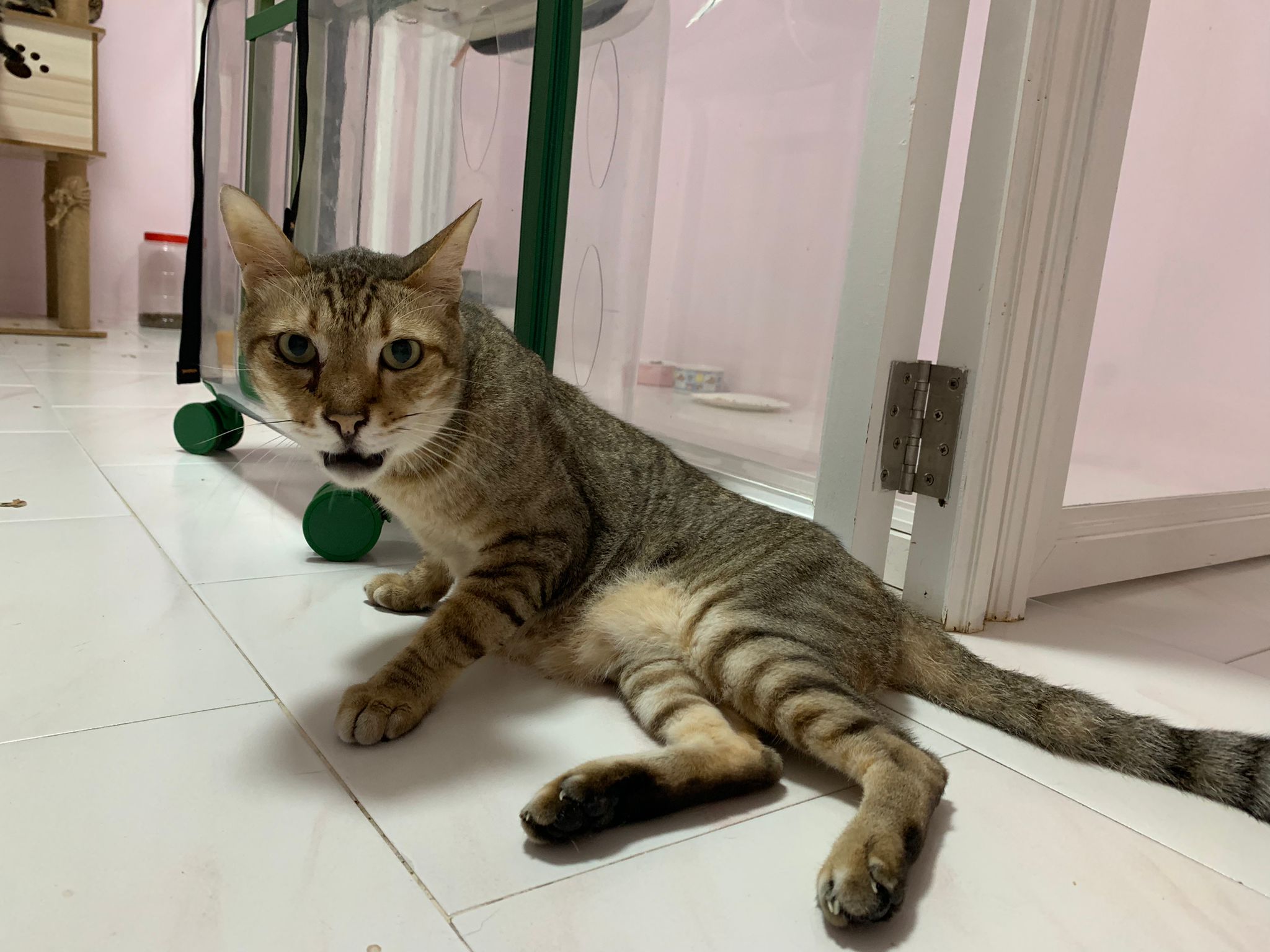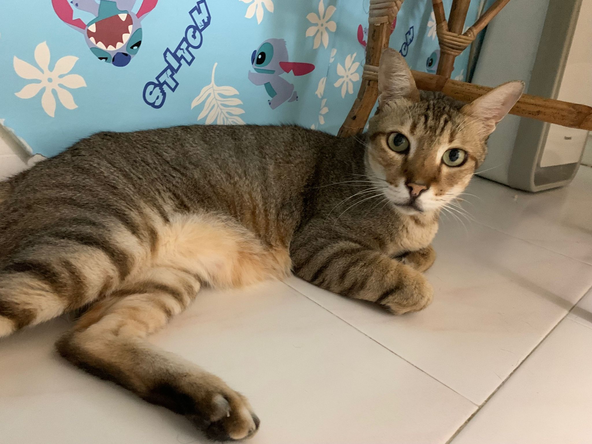 A very muscular boy, can be bad tempered, tend to eat food fast and vomit thereafter. Love me sayang n kiss him, can belly rub but again, have to be careful in case he got angry n his attack can be scary cos he is really strong. To be adopted with his brother Daring.