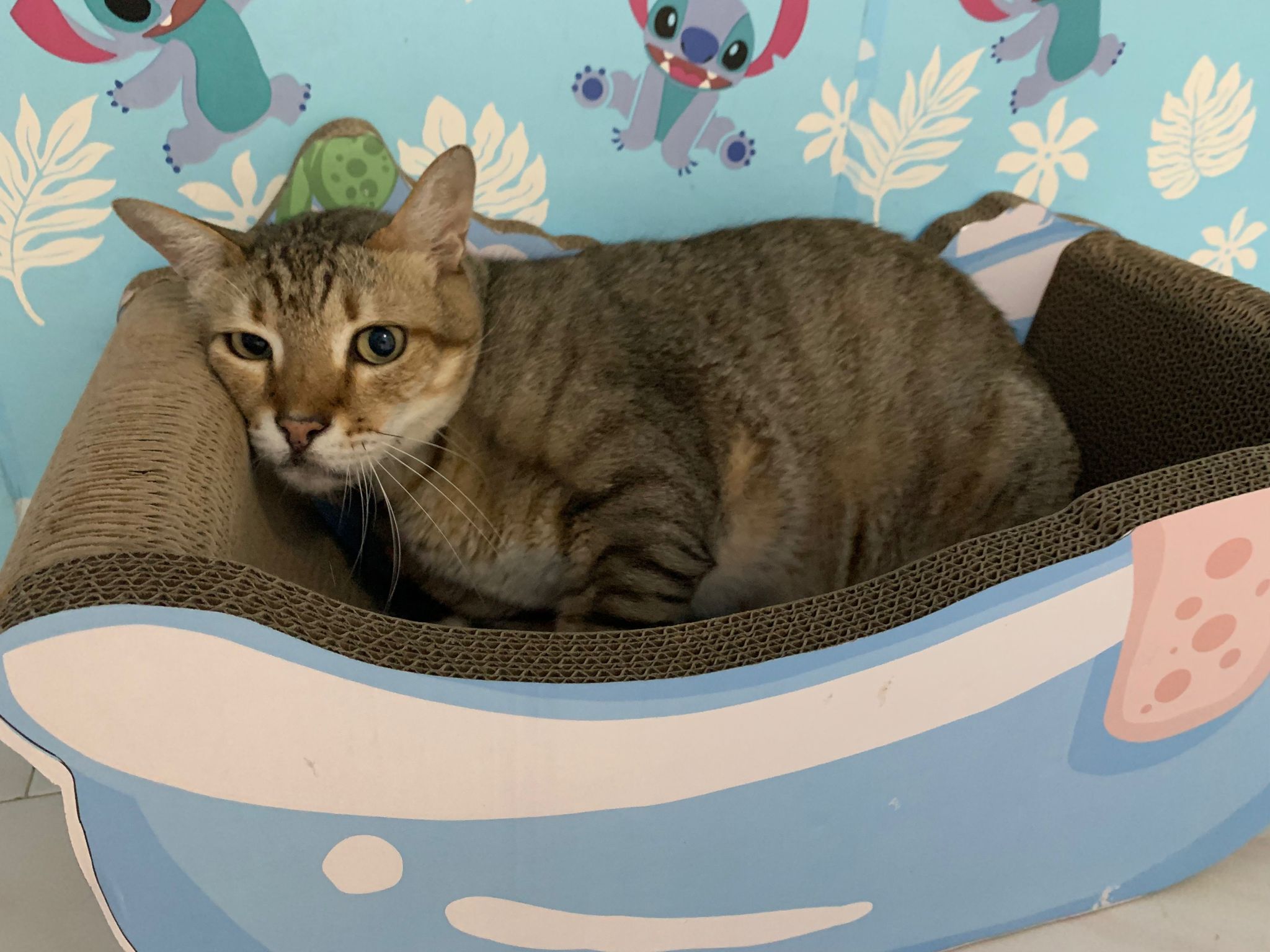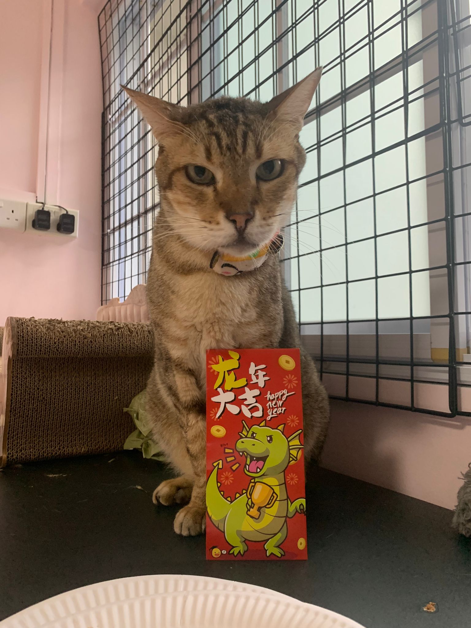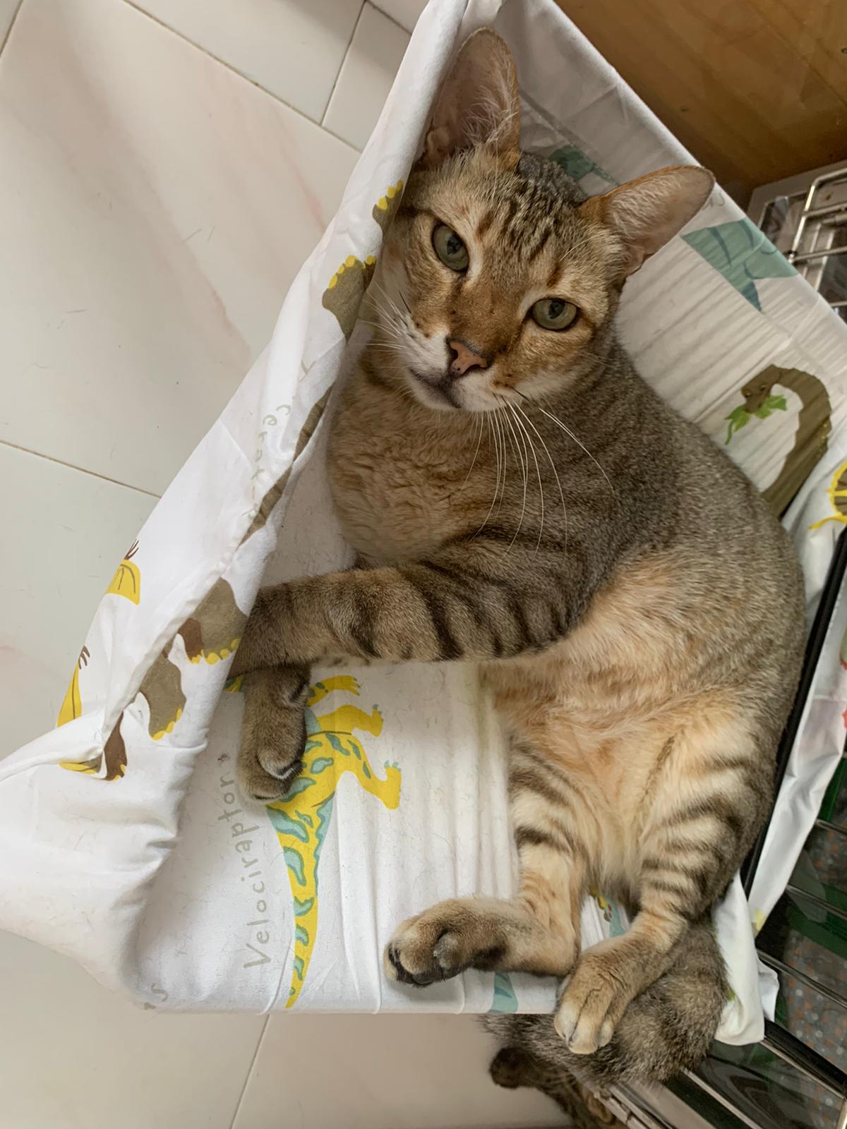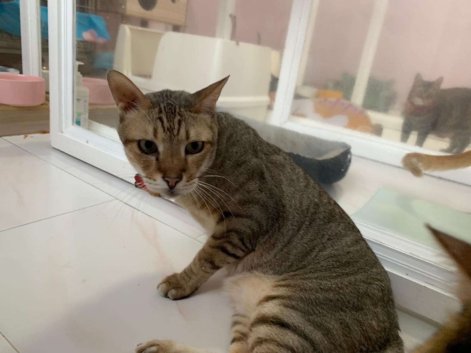 A very muscular boy, can be bad tempered, tend to eat food fast and vomit thereafter. Love me sayang n kiss him, can belly rub but again, have to be careful in case he got angry n his attack can be scary cos he is really strong. To be adopted with his brother Daring.