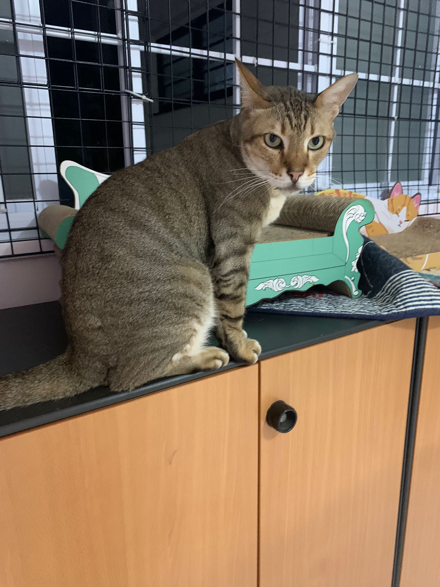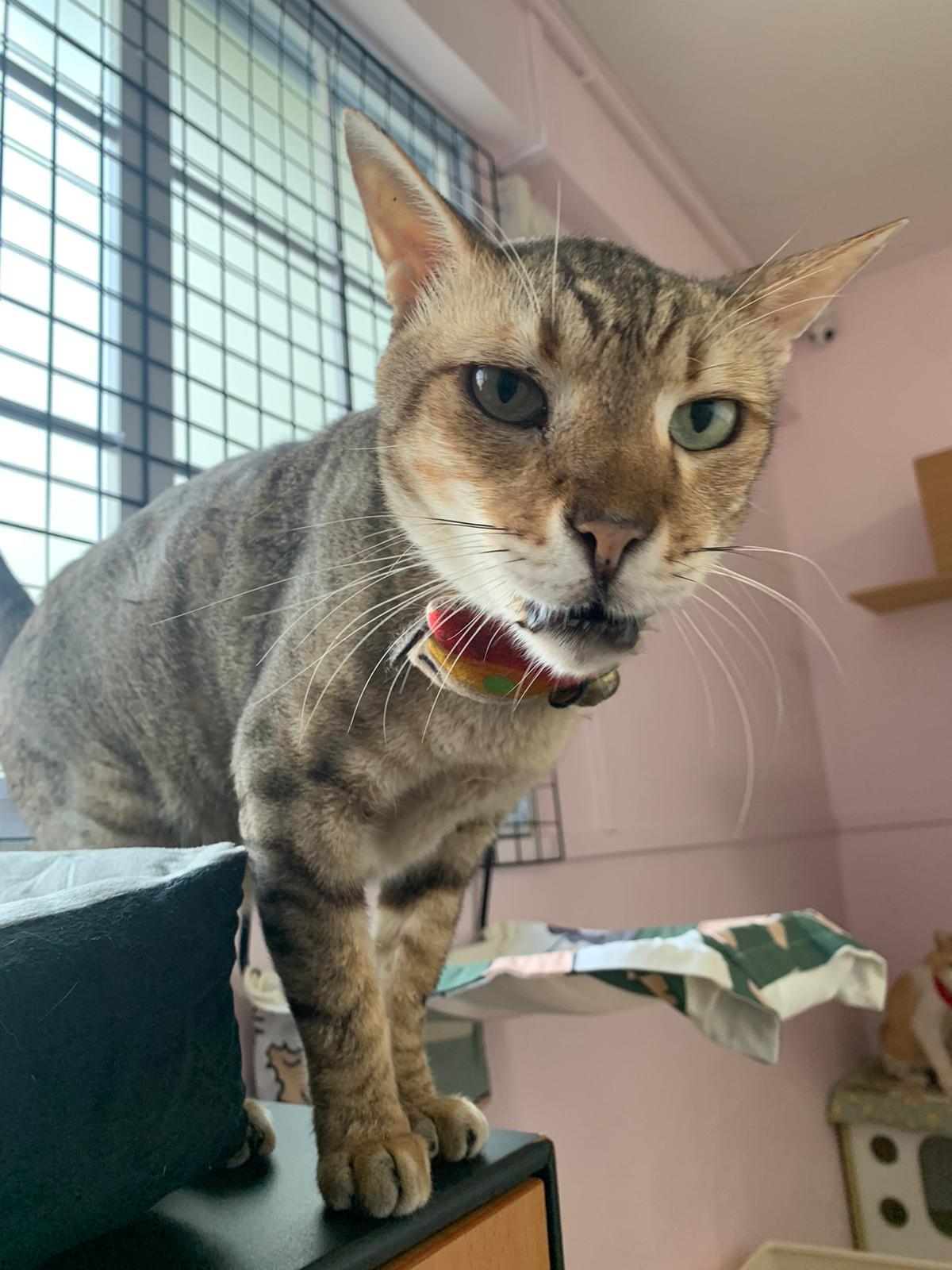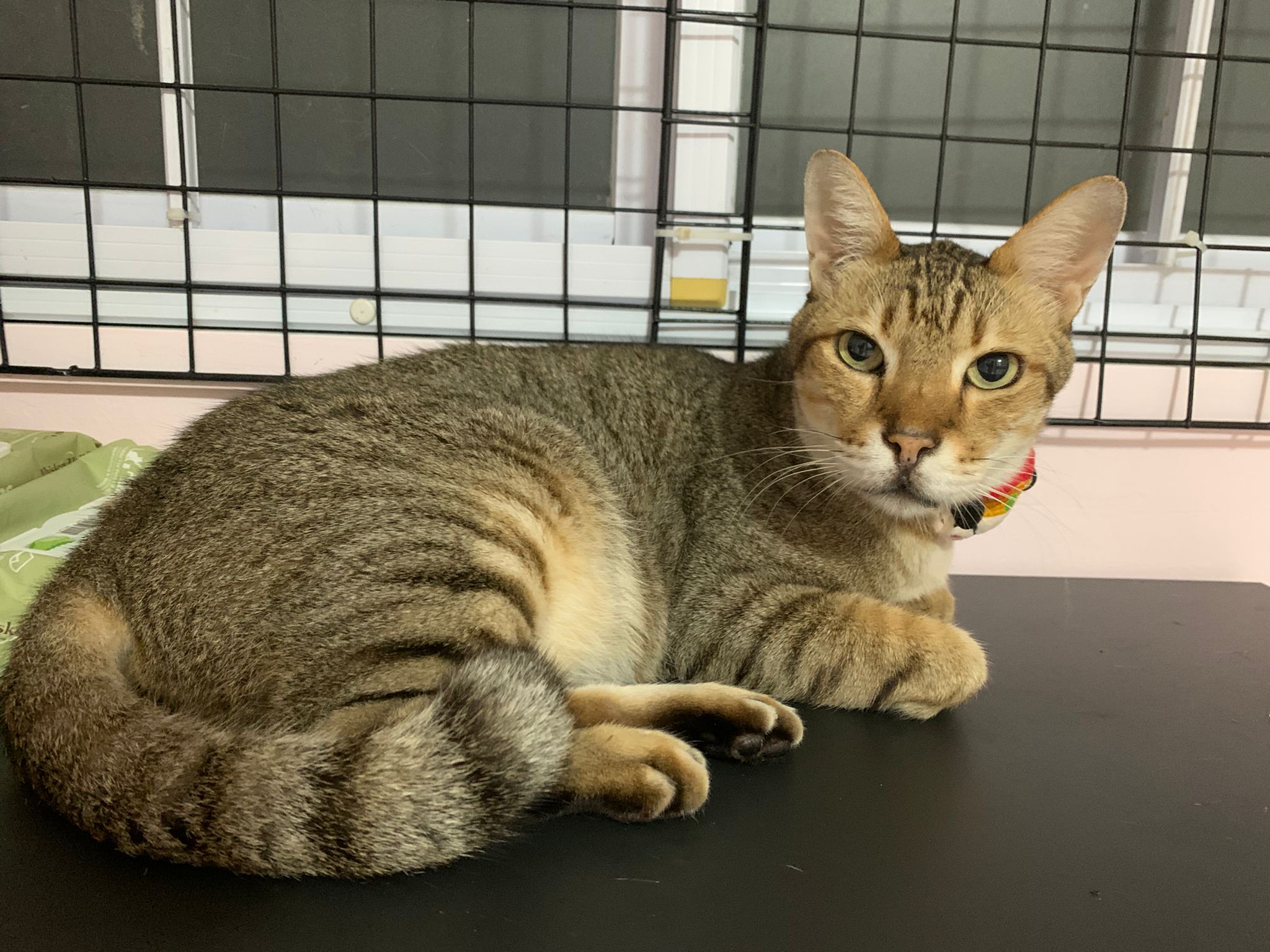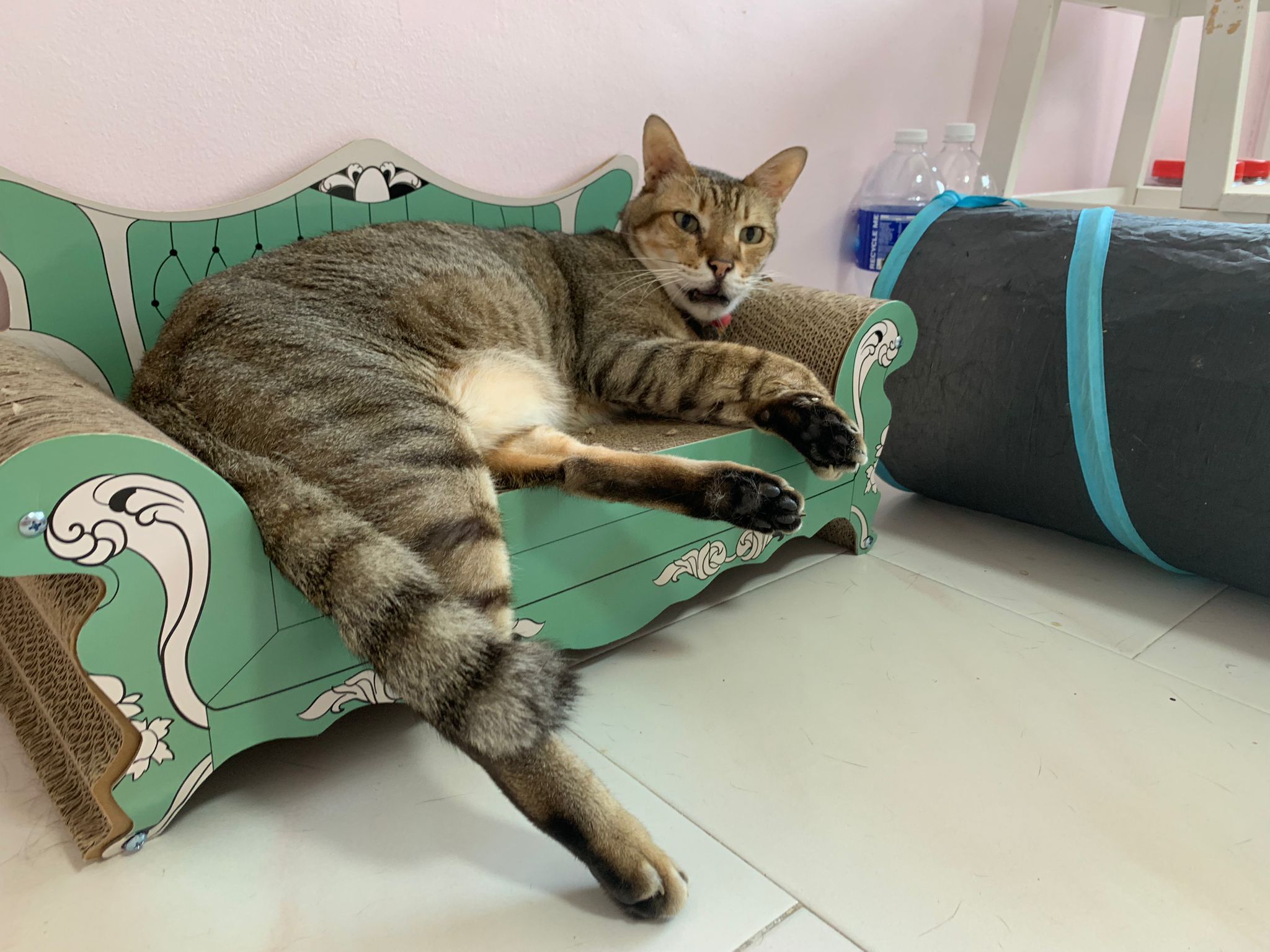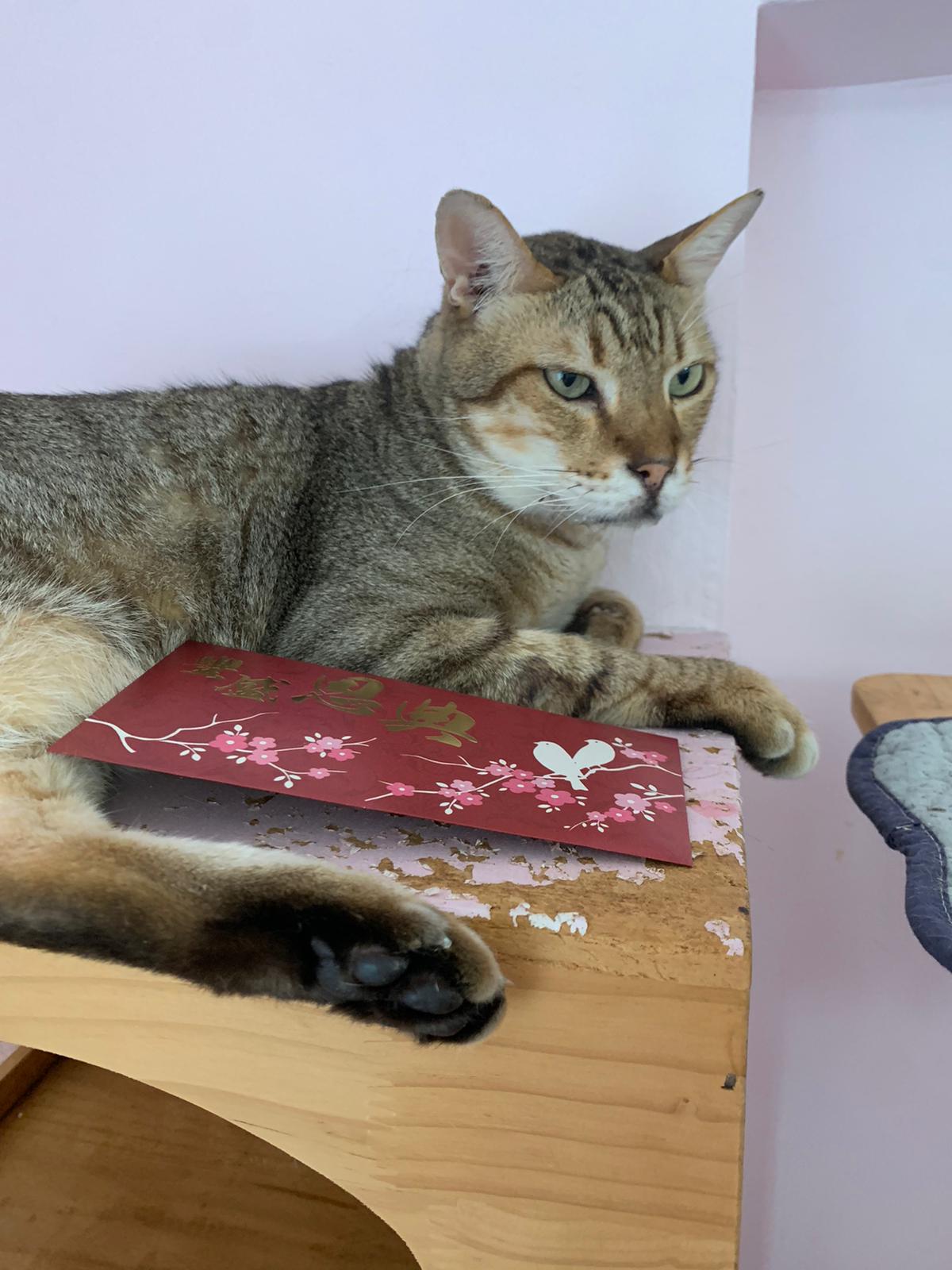 A very muscular boy, can be bad tempered, tend to eat food fast and vomit thereafter. Love me sayang n kiss him, can belly rub but again, have to be careful in case he got angry n his attack can be scary cos he is really strong. To be adopted with his brother Daring.