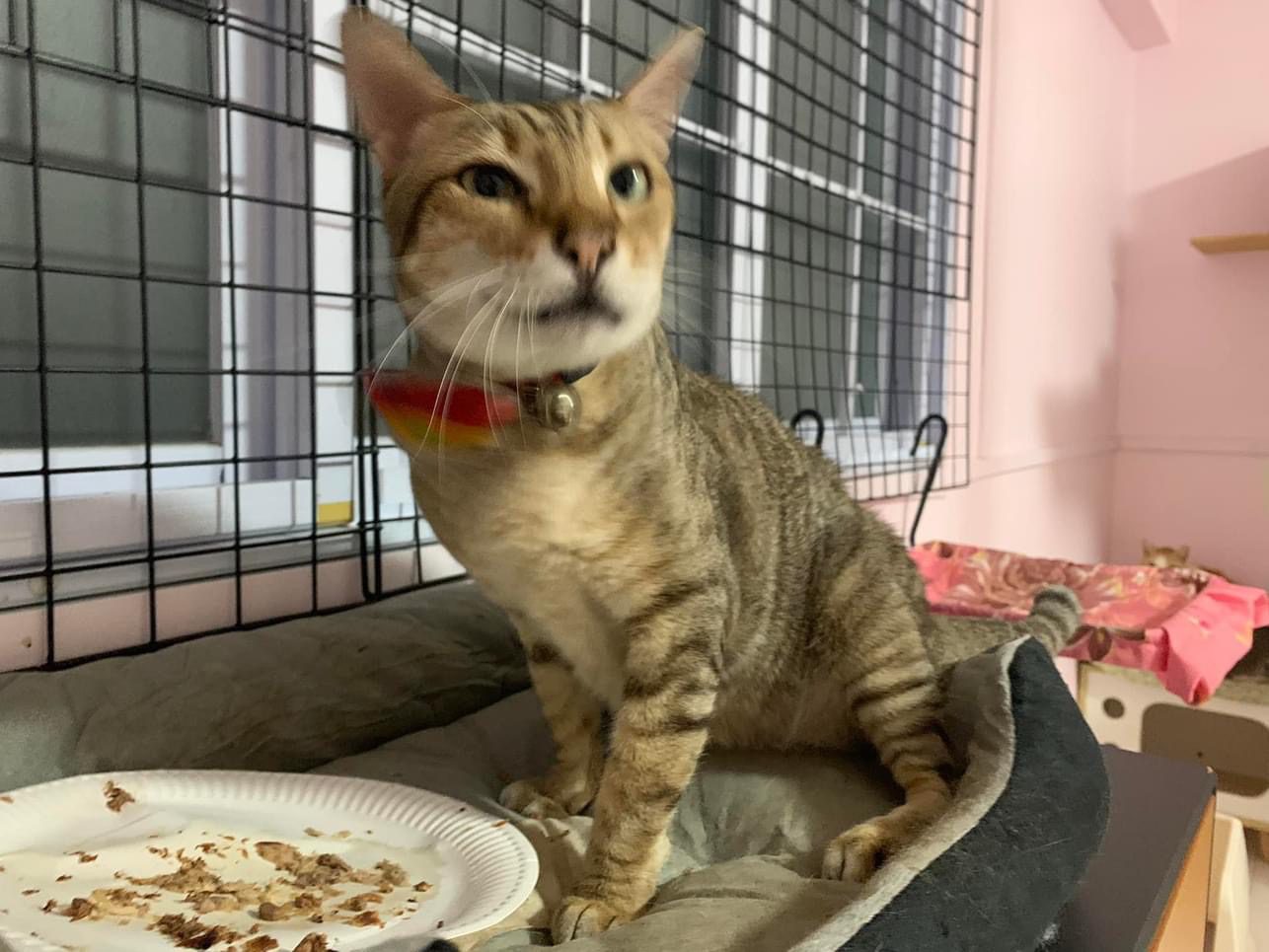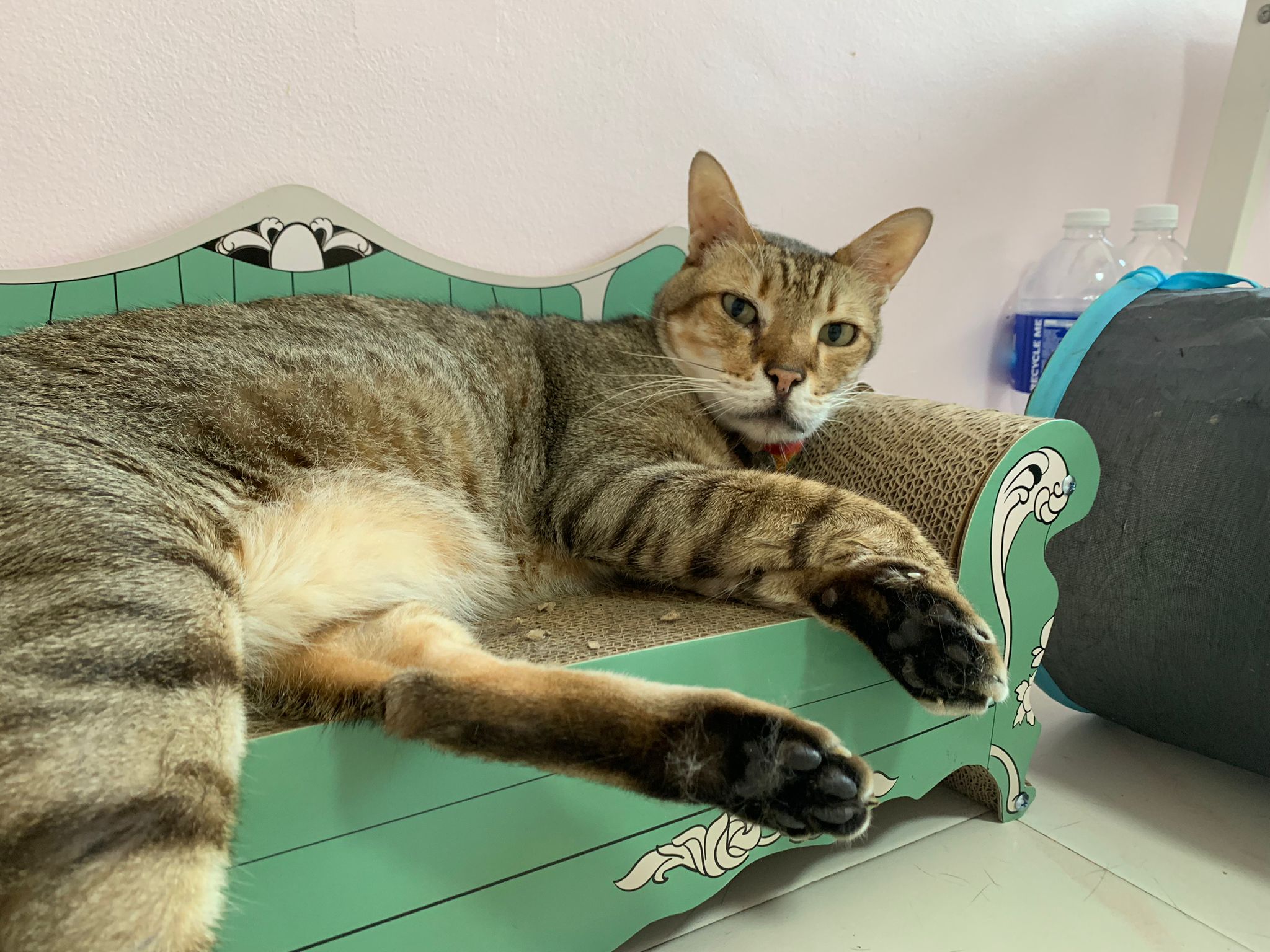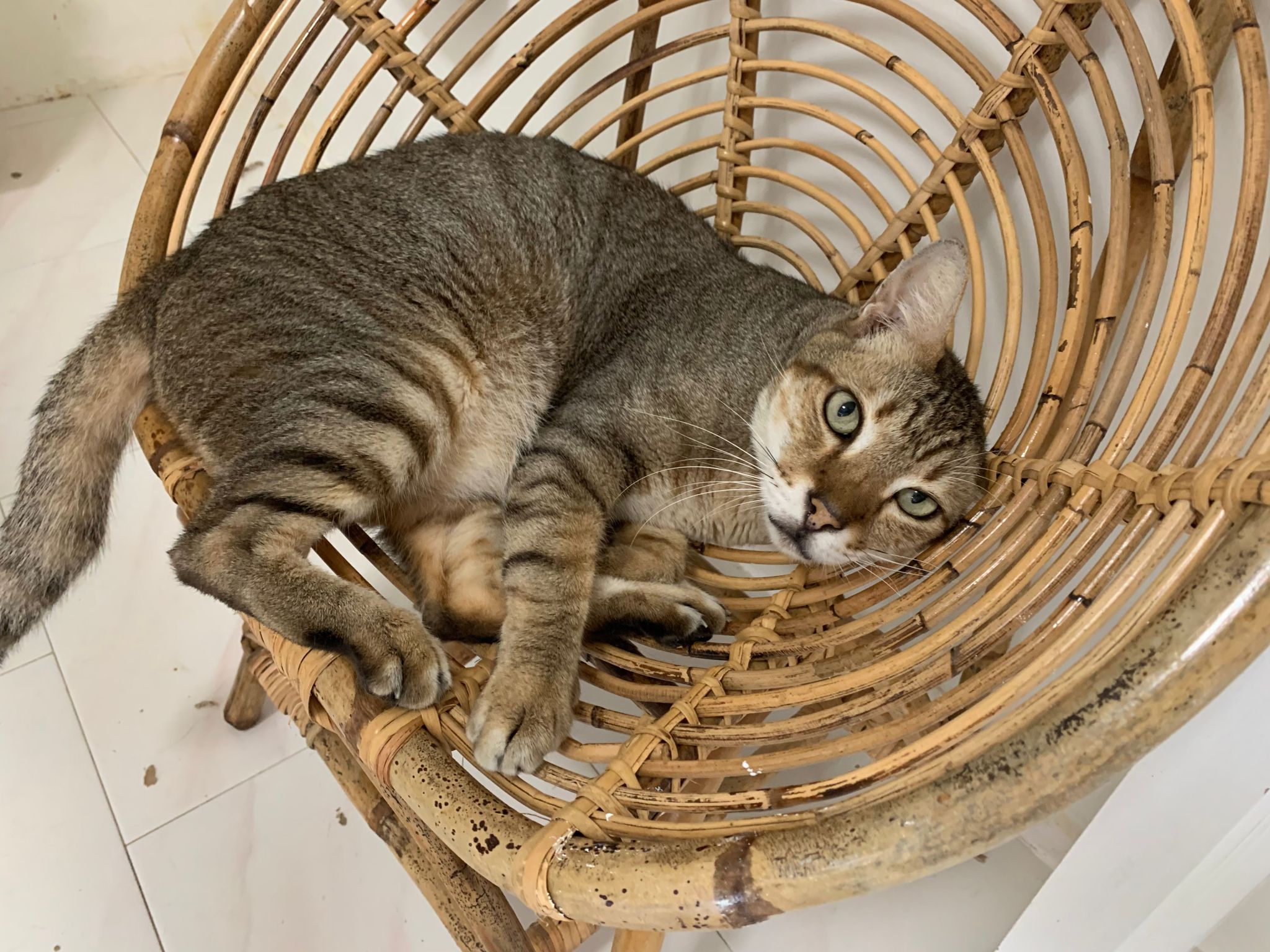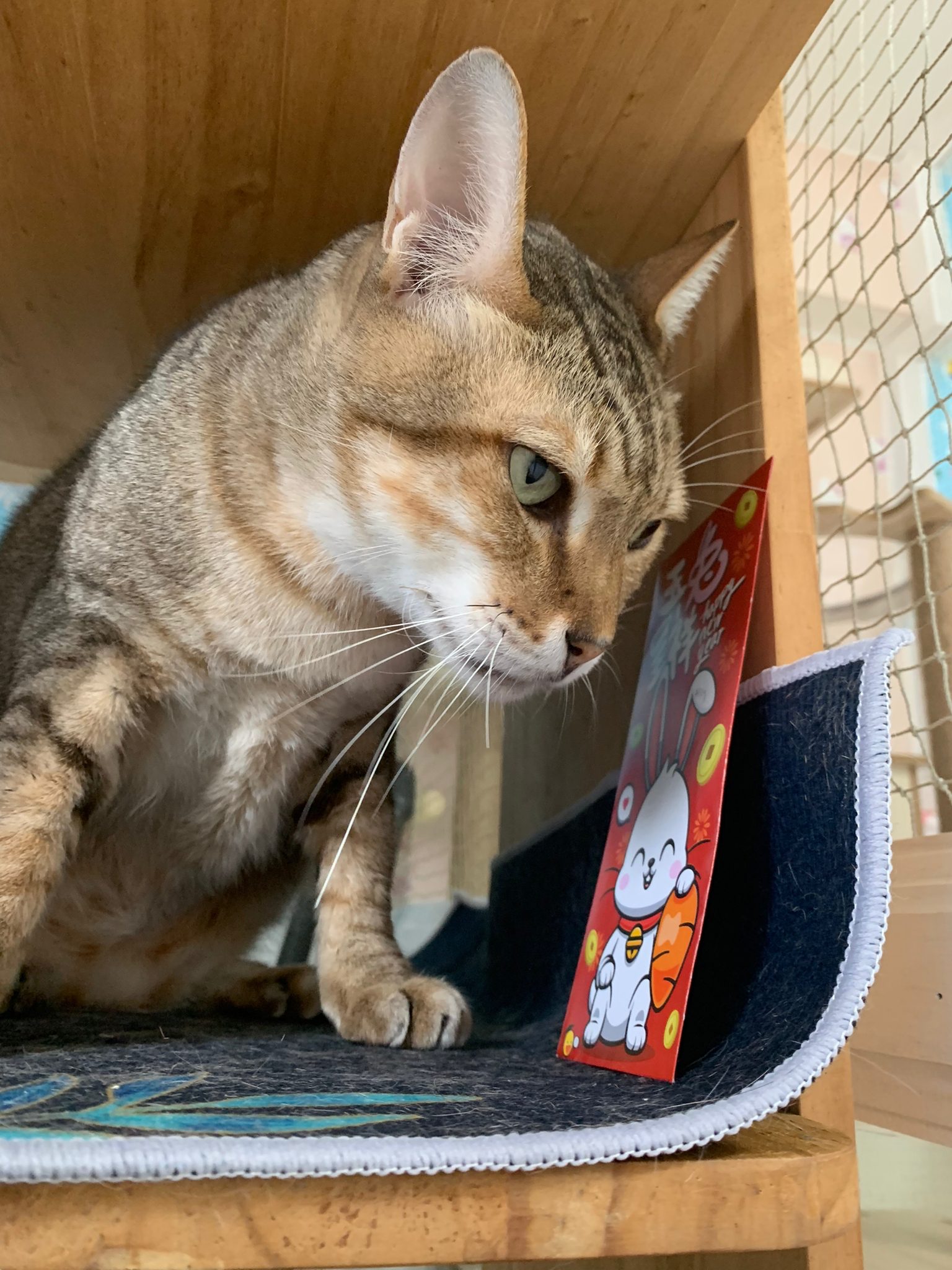 A very muscular boy, can be bad tempered, tend to eat food fast and vomit thereafter. Love me sayang n kiss him, can belly rub but again, have to be careful in case he got angry n his attack can be scary cos he is really strong. To be adopted with his brother Daring.