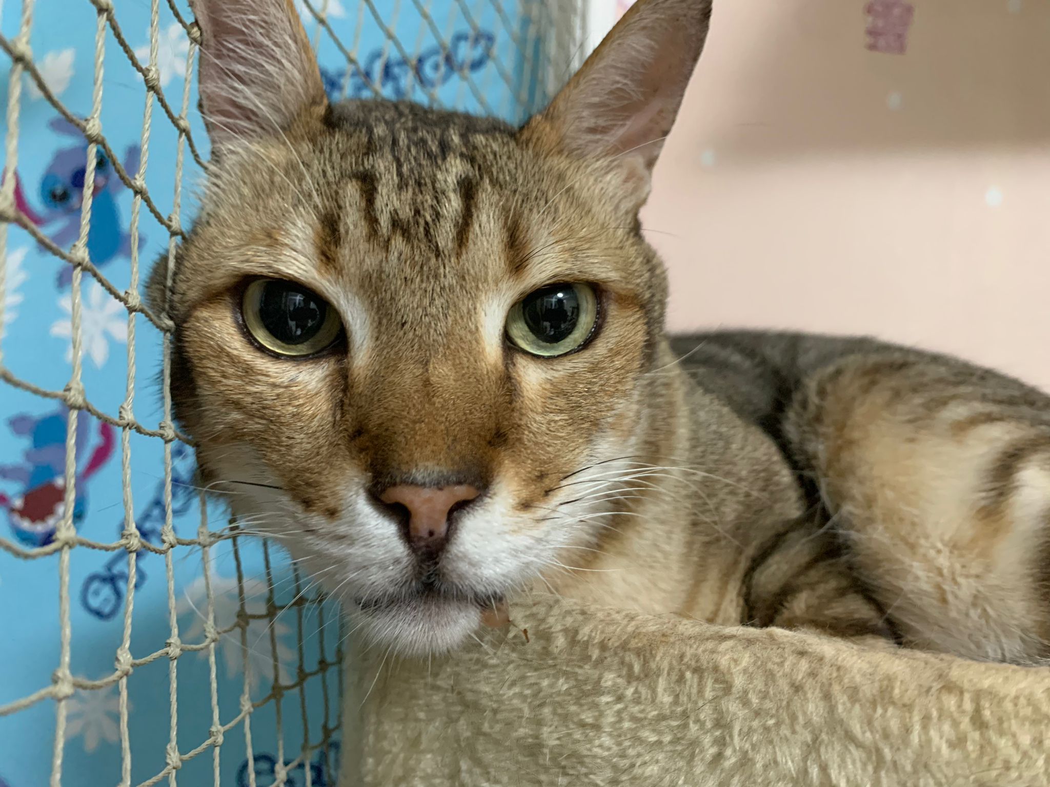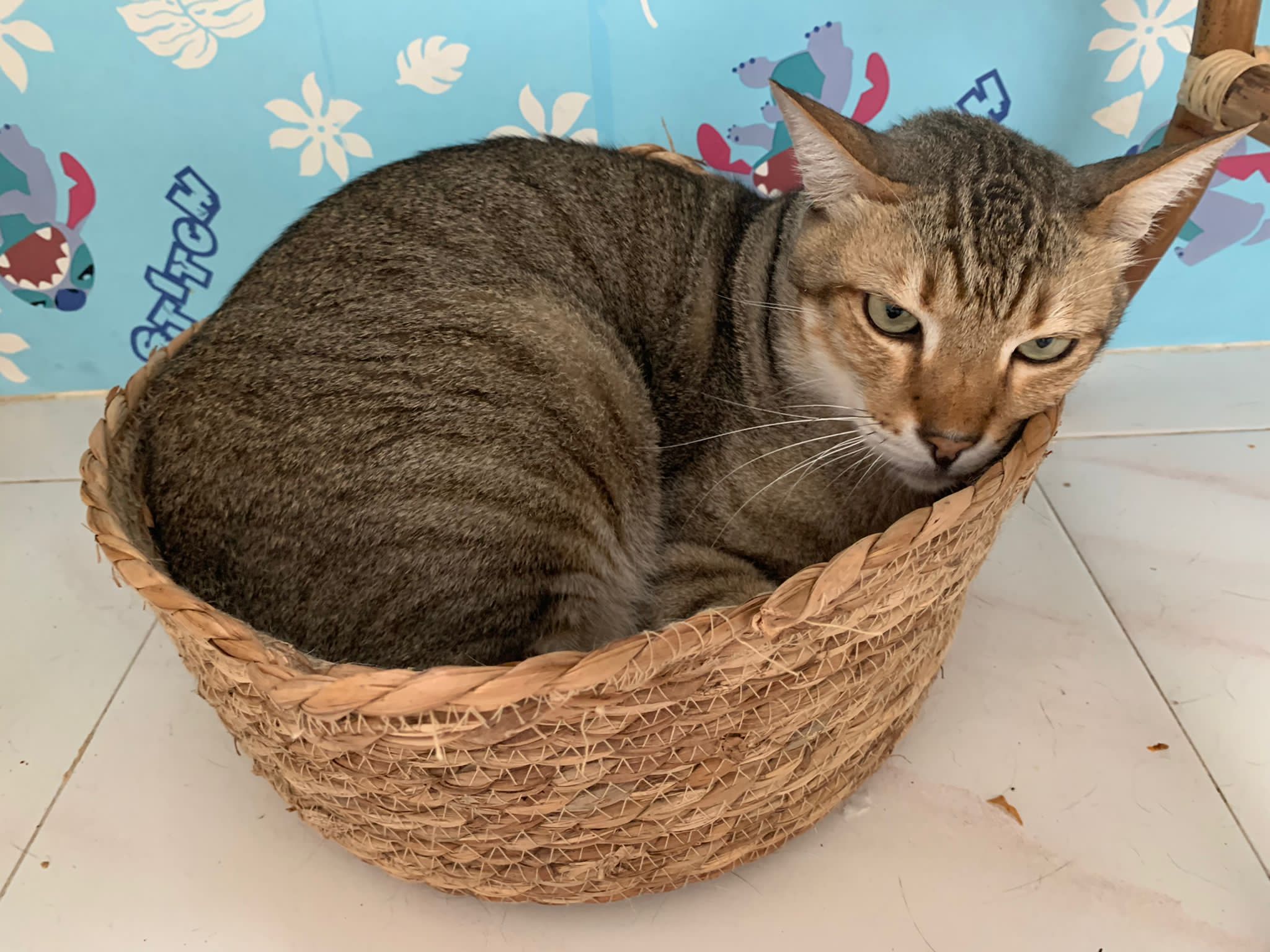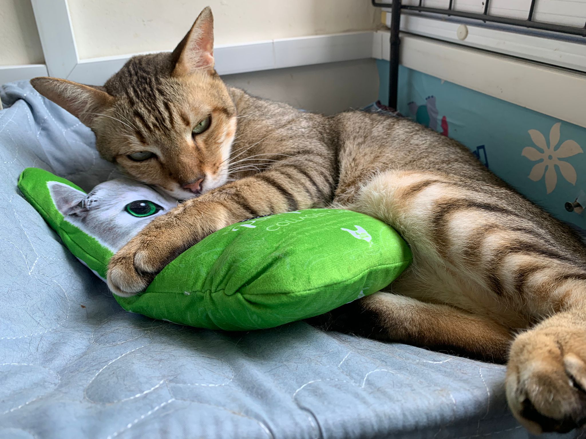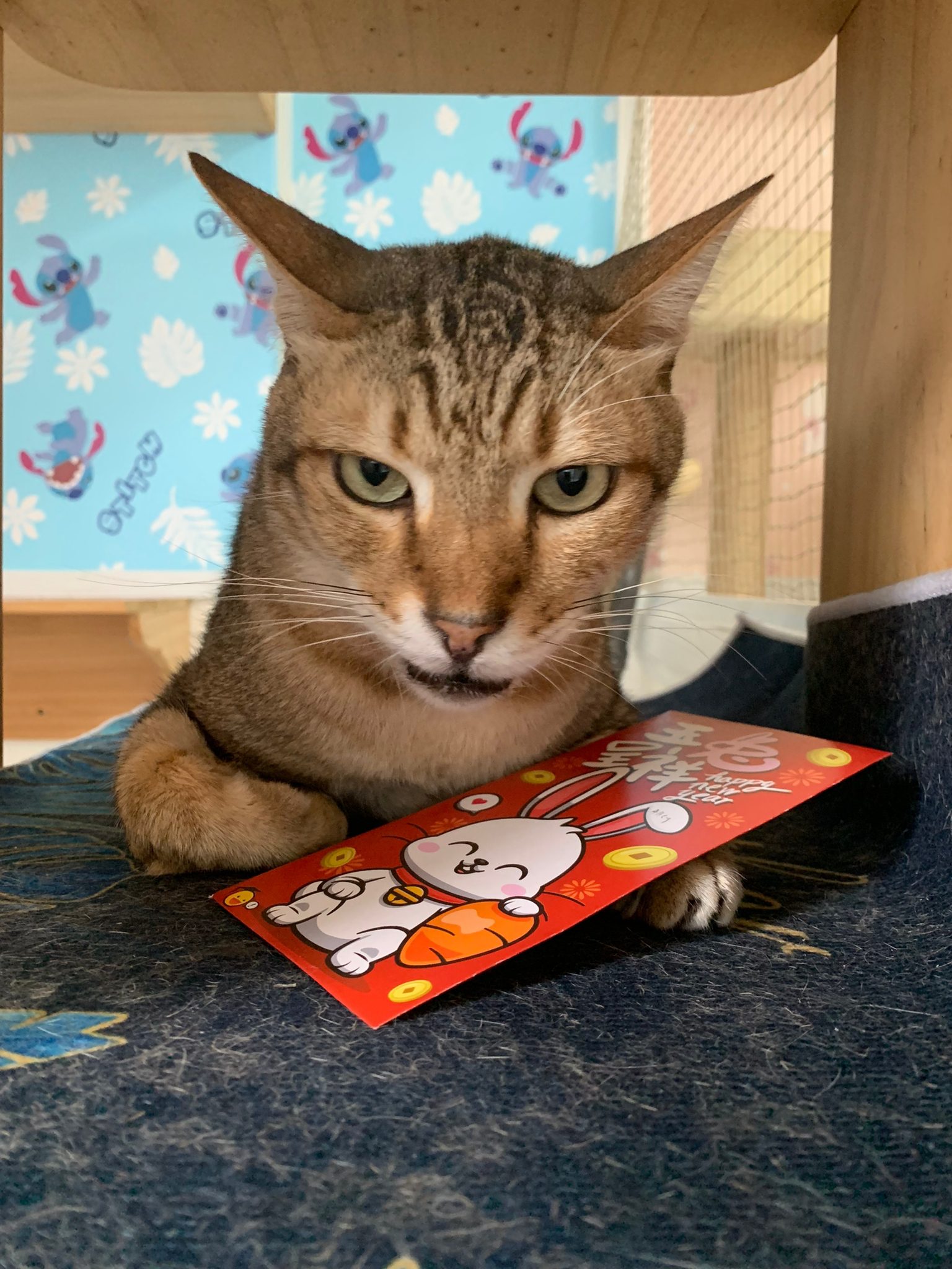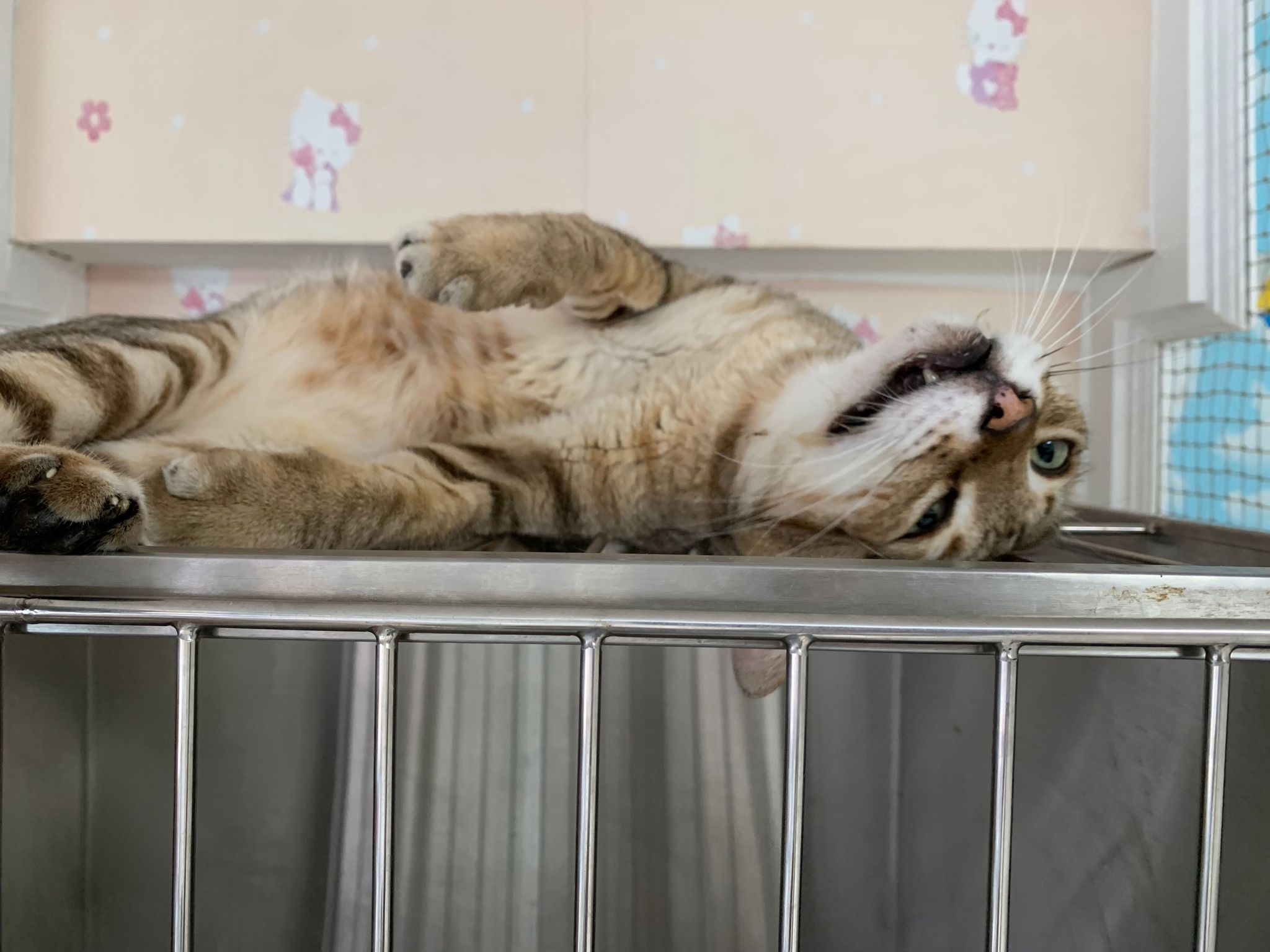 A very muscular boy, can be bad tempered, tend to eat food fast and vomit thereafter. Love me sayang n kiss him, can belly rub but again, have to be careful in case he got angry n his attack can be scary cos he is really strong. To be adopted with his brother Daring.
