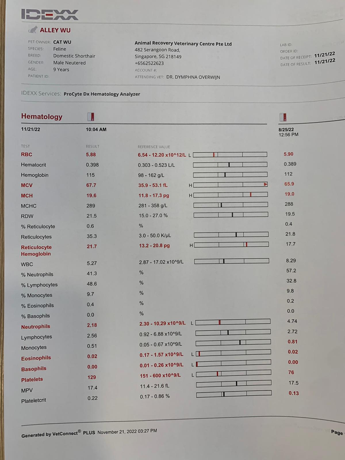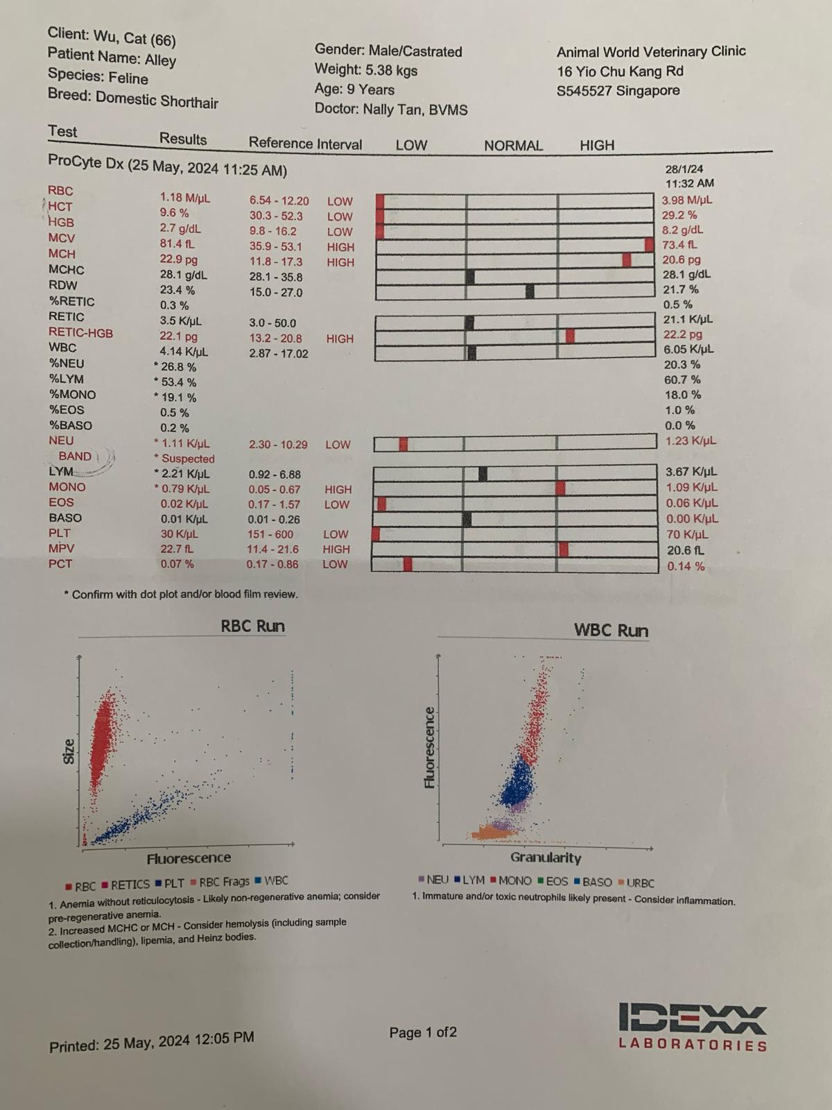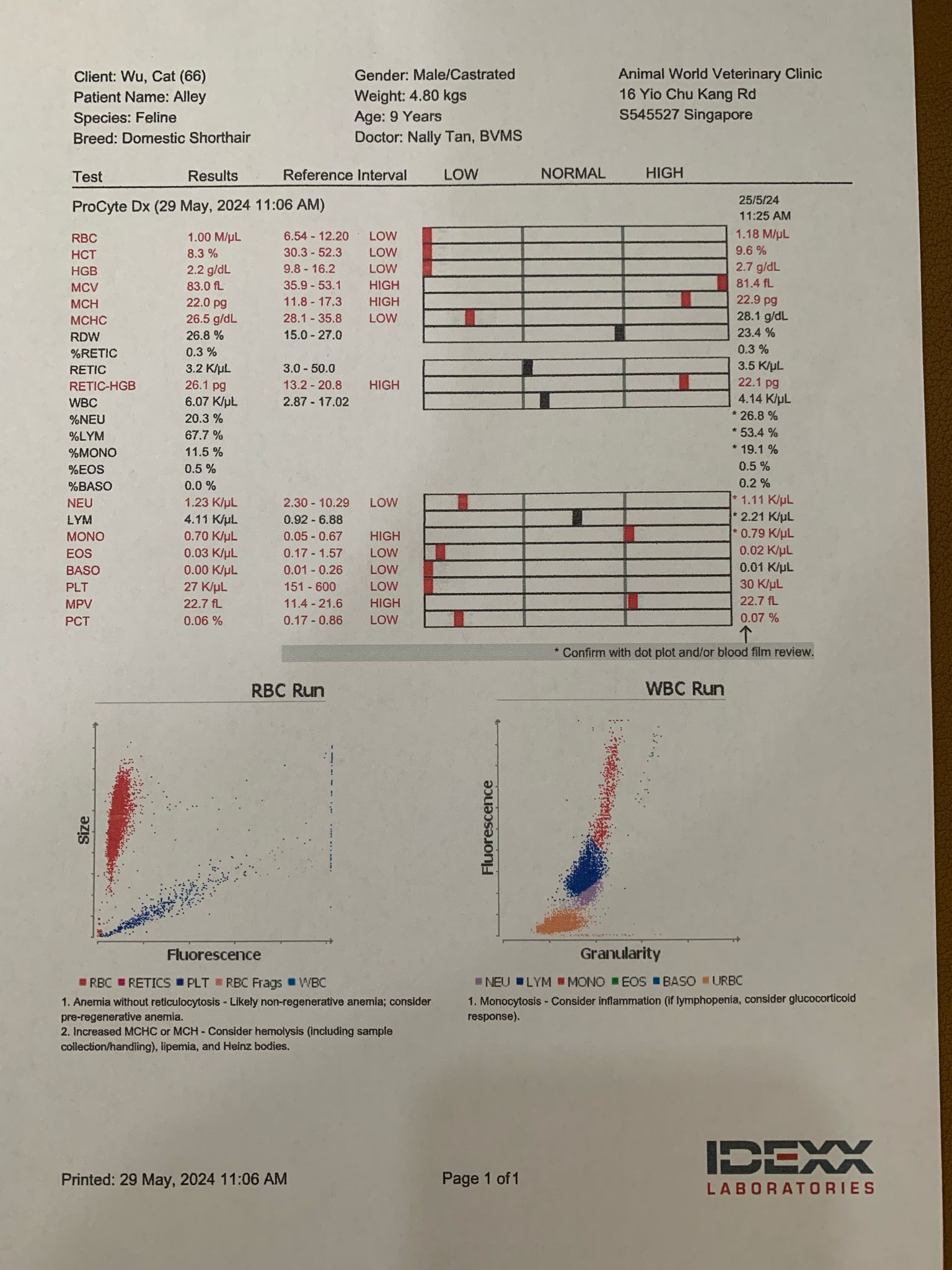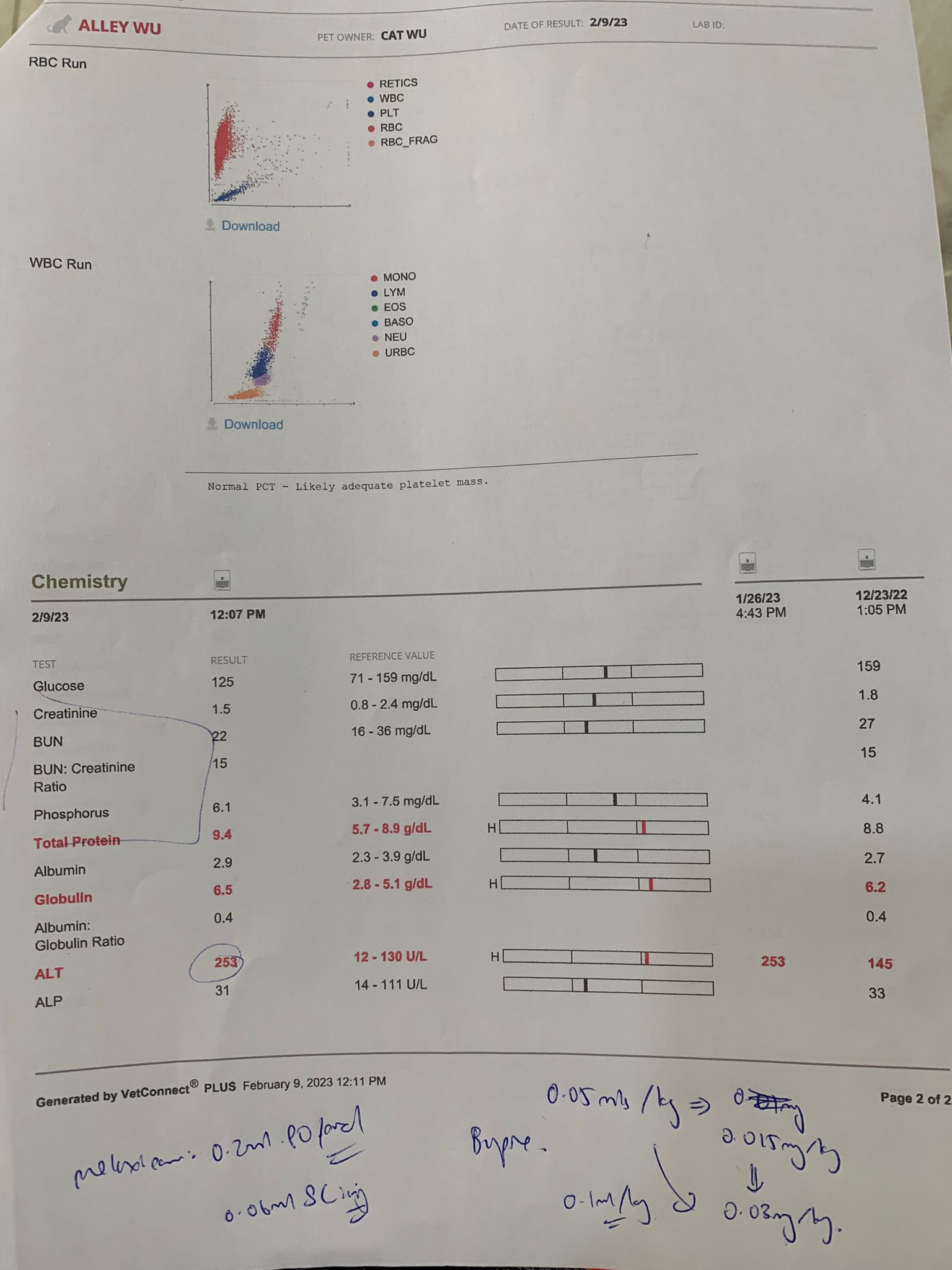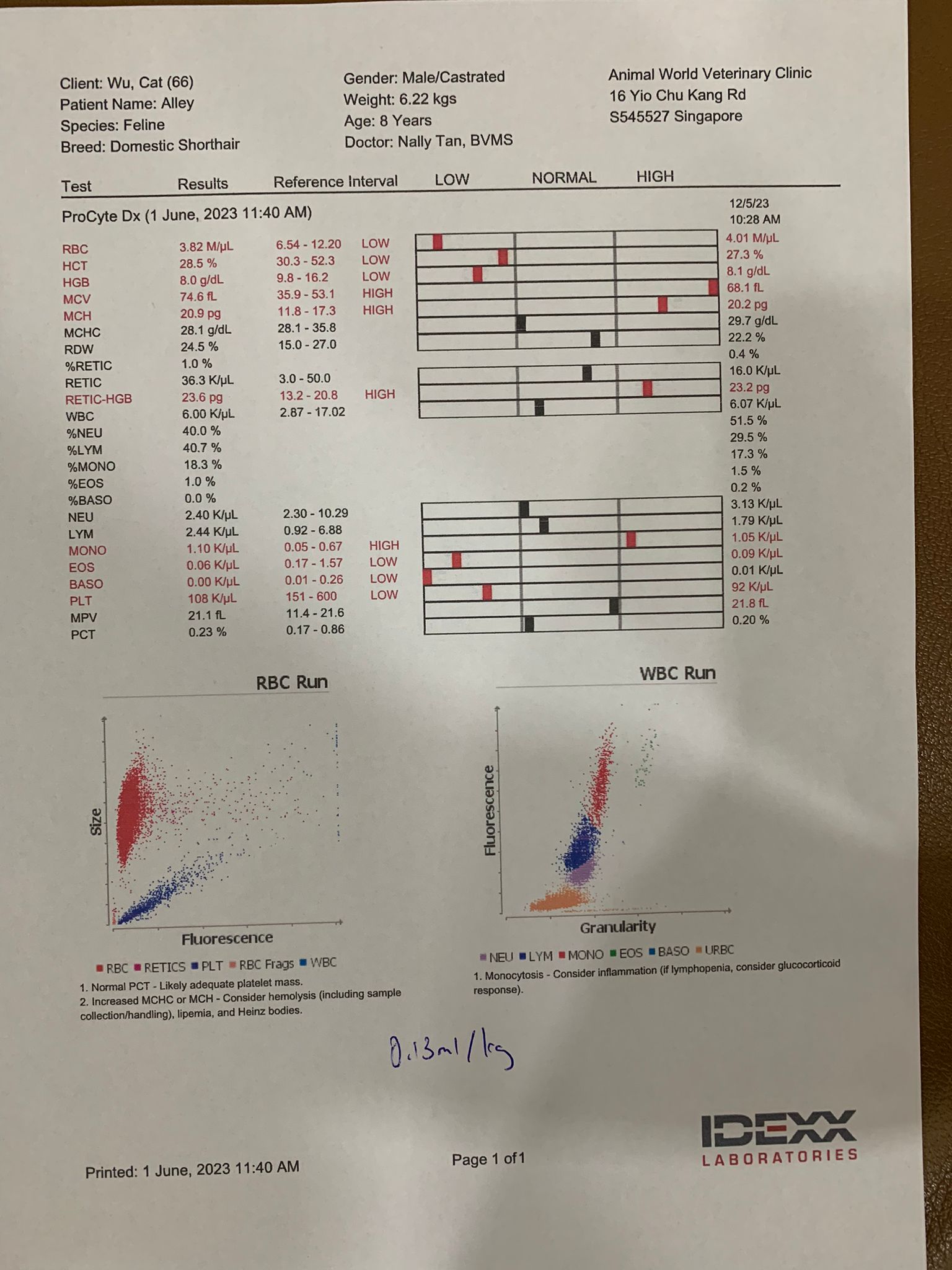 His HCT is 9.6%, severe anemic. Wa have to restart darbepoetin 1ug/kg. Once a week. later go back count dose. Doxy 10mg/kg (I’ll try give 2 notches) Marbo 2.75mg/kg (0.15ml). Bupre higher dose x twice. Liver got issue but -? Sigh. Kidney still good. The rest nothing significant. probnp abnormal. No pancreatitis.