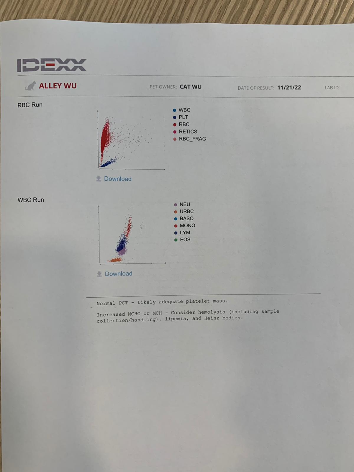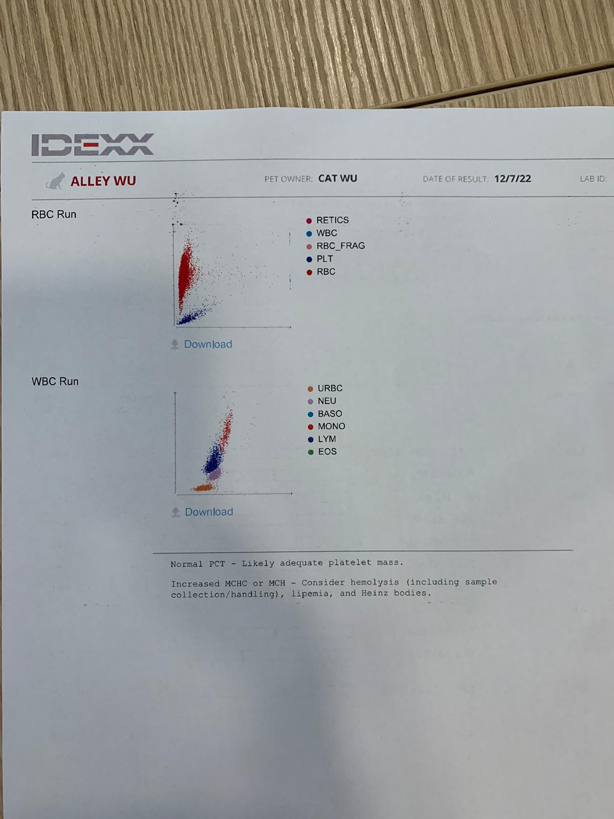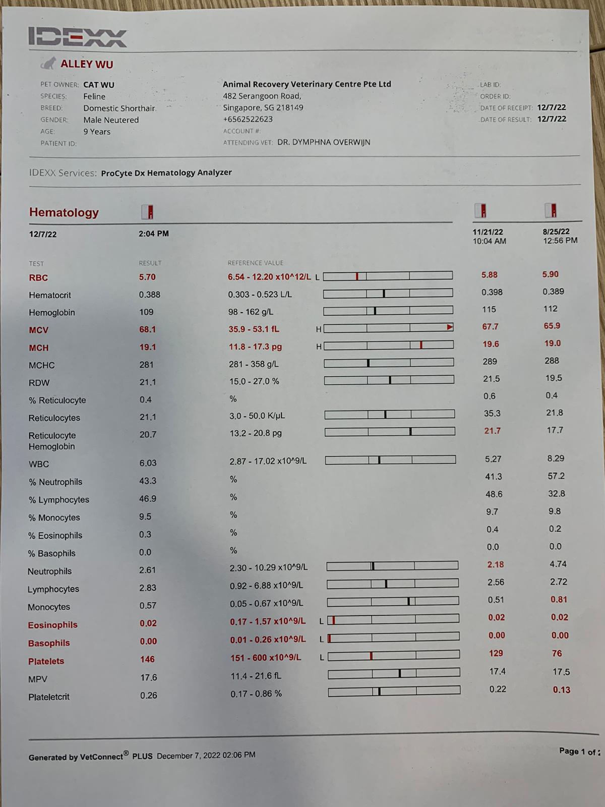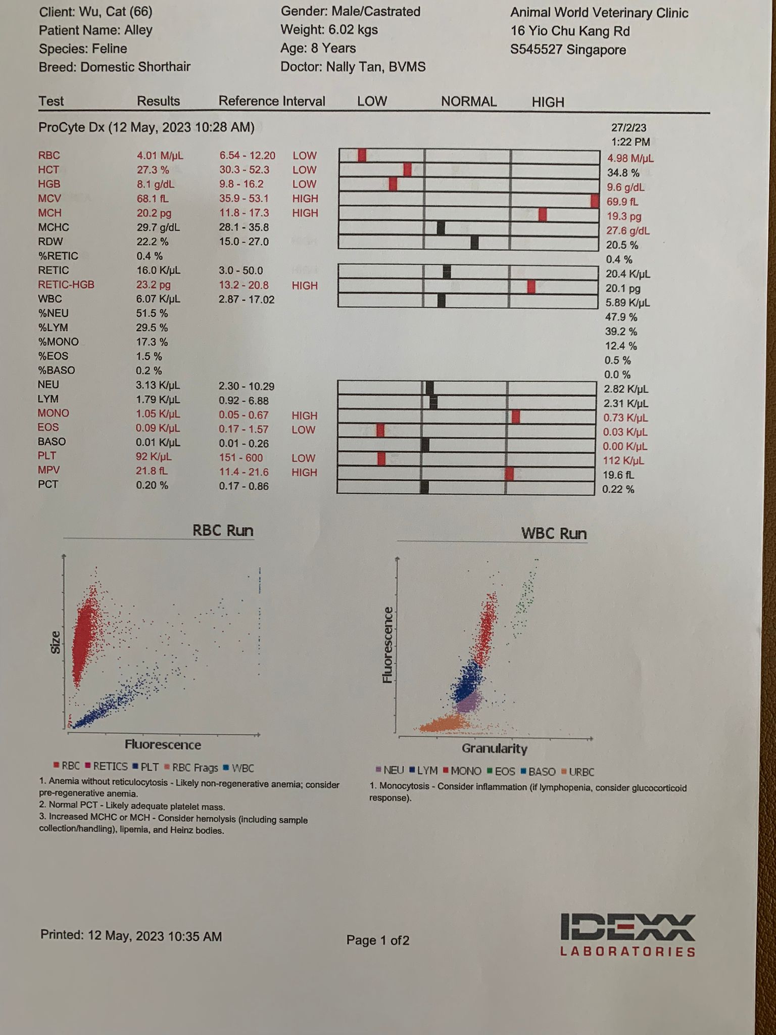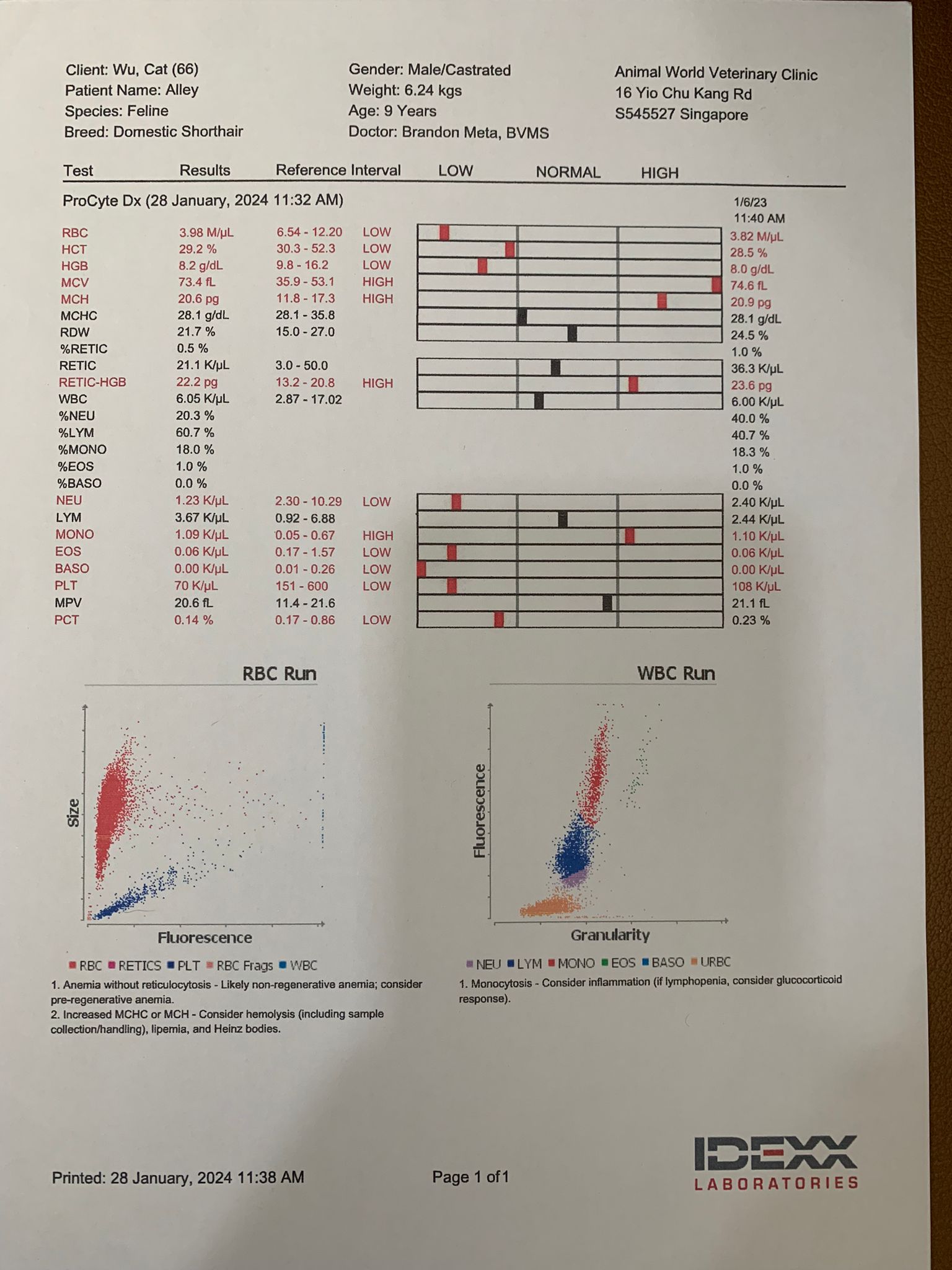 His HCT is 9.6%, severe anemic. Wa have to restart darbepoetin 1ug/kg. Once a week. later go back count dose. Doxy 10mg/kg (I’ll try give 2 notches) Marbo 2.75mg/kg (0.15ml). Bupre higher dose x twice. Liver got issue but -? Sigh. Kidney still good. The rest nothing significant. probnp abnormal. No pancreatitis.