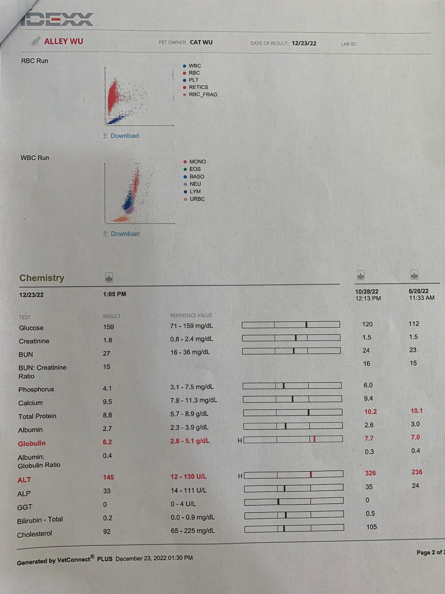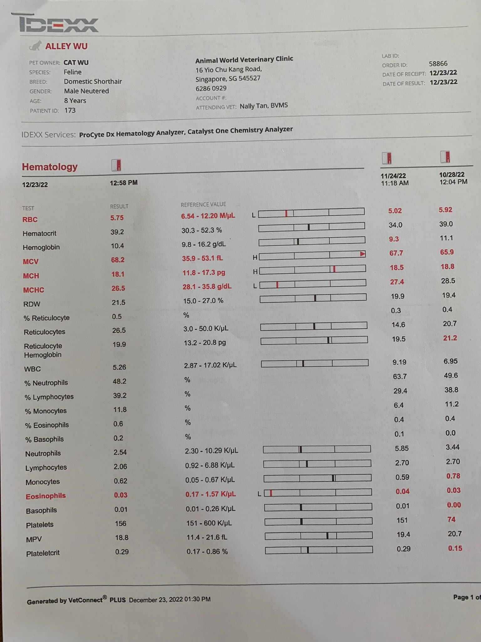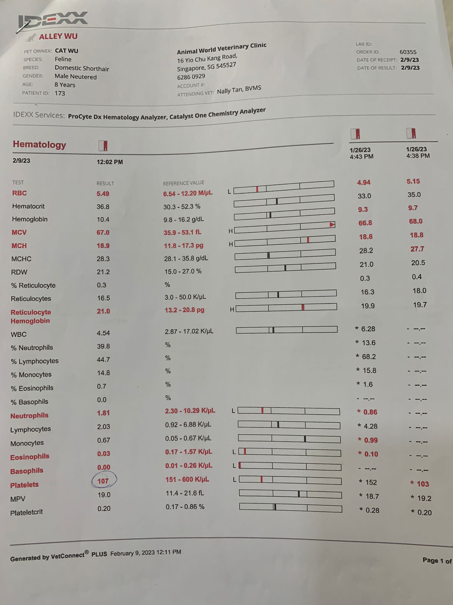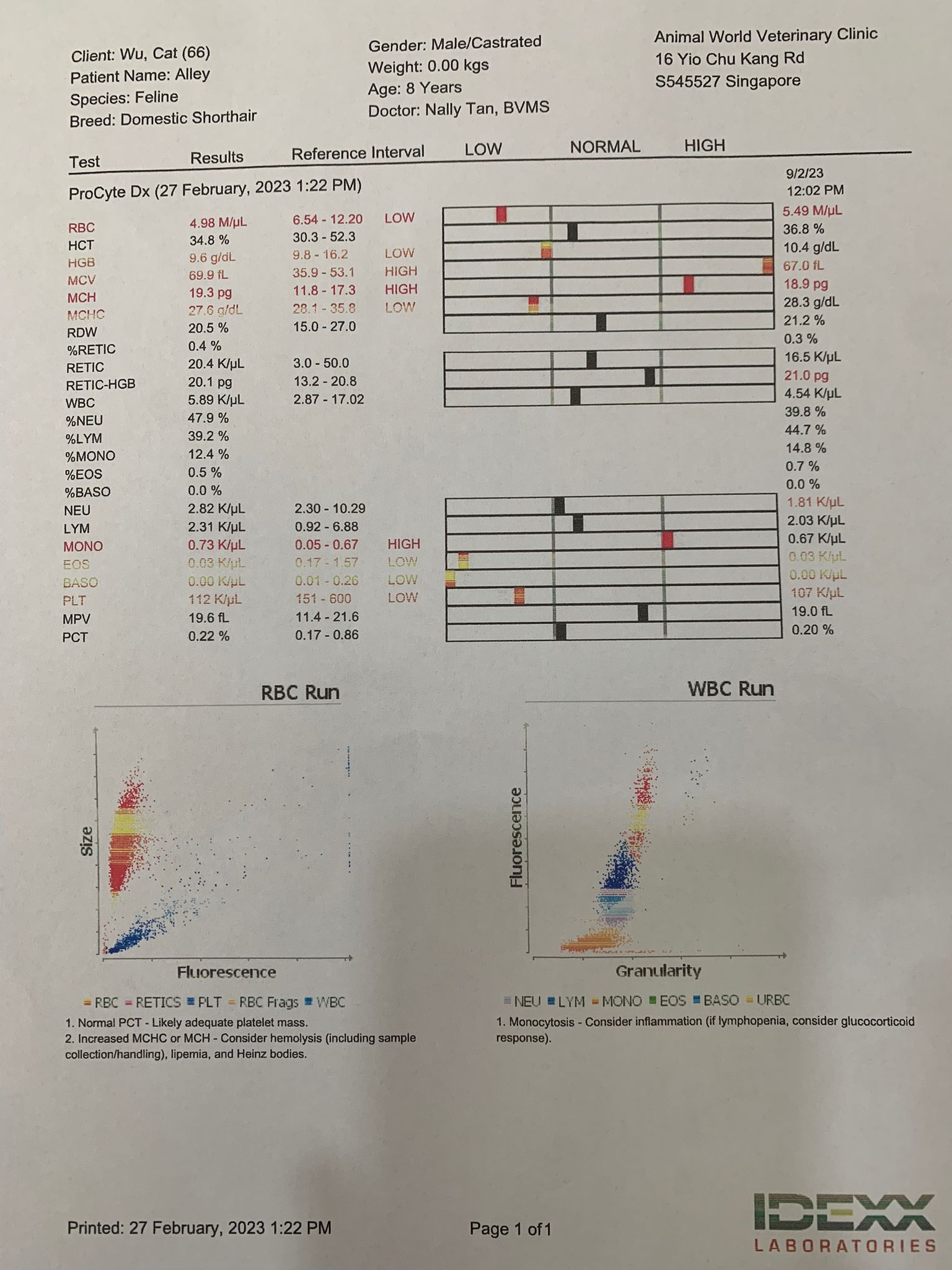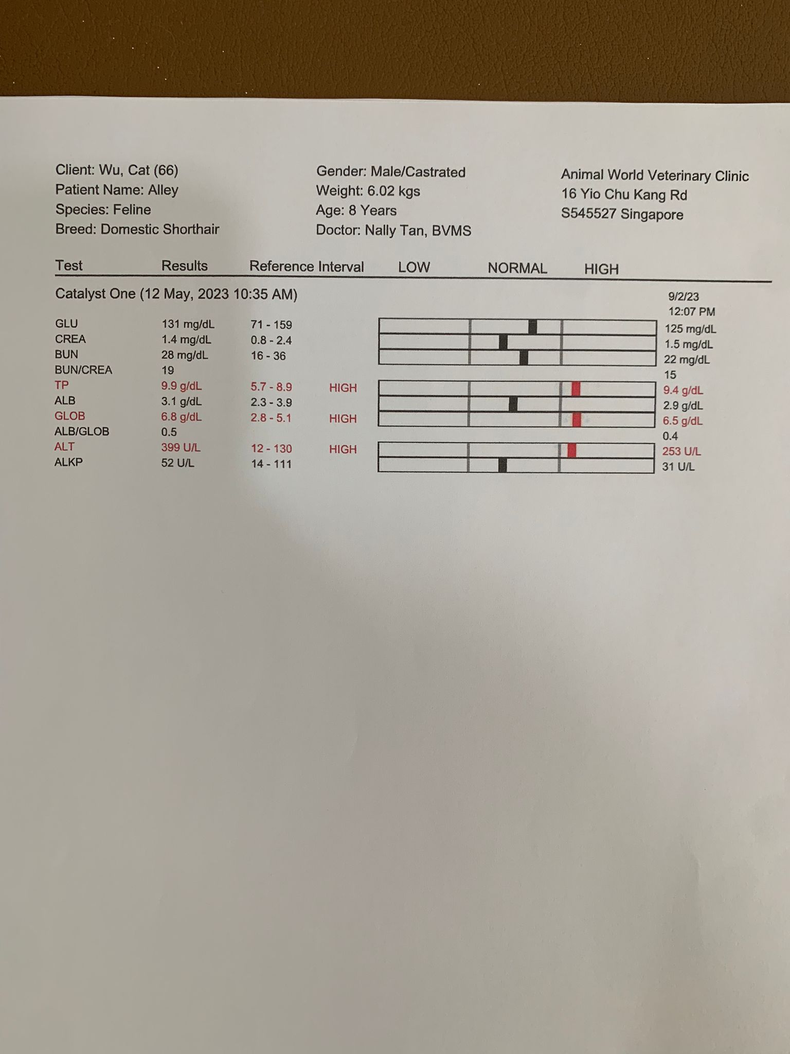 His HCT is 9.6%, severe anemic. Wa have to restart darbepoetin 1ug/kg. Once a week. later go back count dose. Doxy 10mg/kg (I’ll try give 2 notches) Marbo 2.75mg/kg (0.15ml). Bupre higher dose x twice. Liver got issue but -? Sigh. Kidney still good. The rest nothing significant. probnp abnormal. No pancreatitis.