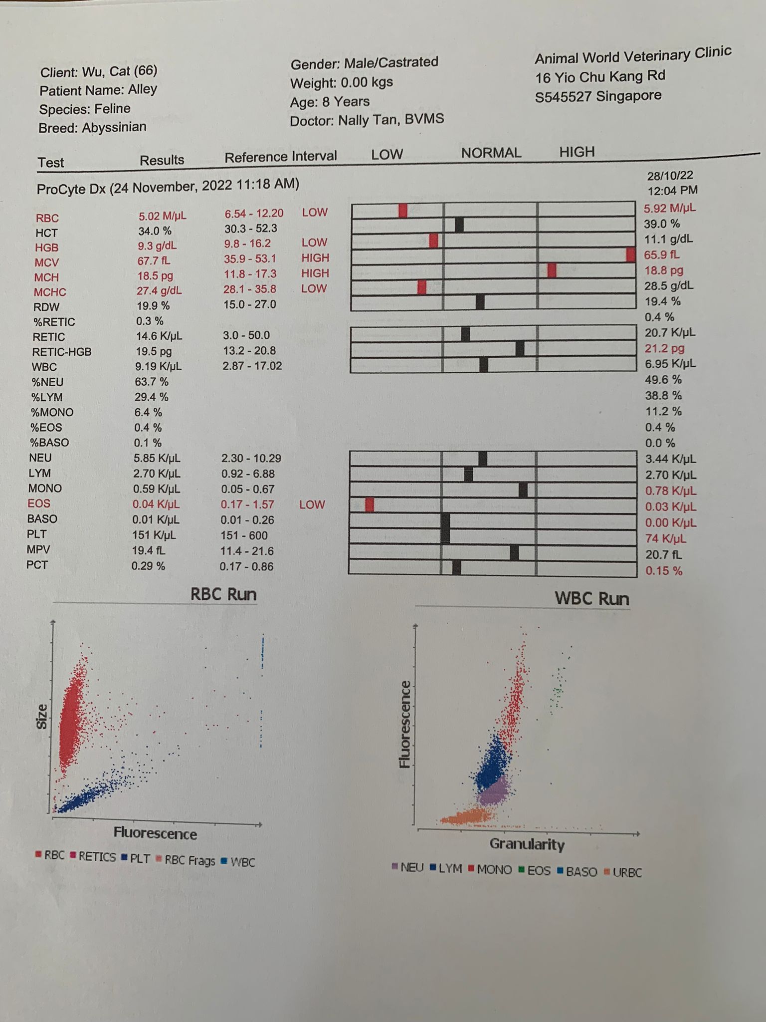 Taken 5ml of blood fr neck, Alex hold w w collar, didn’t touch mouth he is steady – cos taken Cbc chem15 lytes (reject sdma) probnp (cos got mur mur but he is anemic I’m sure) and fpli. His blood super diluted (Alex says like water).