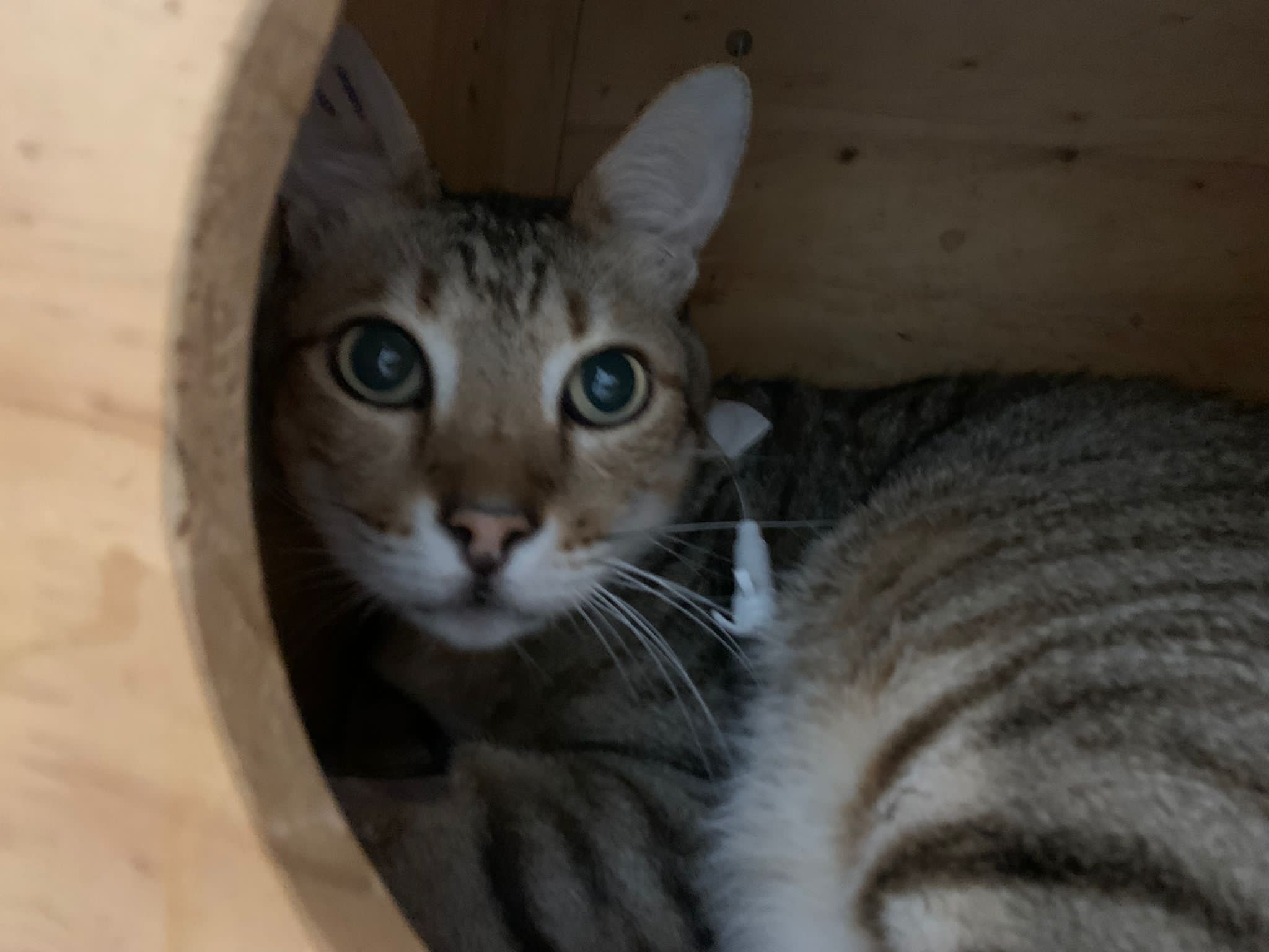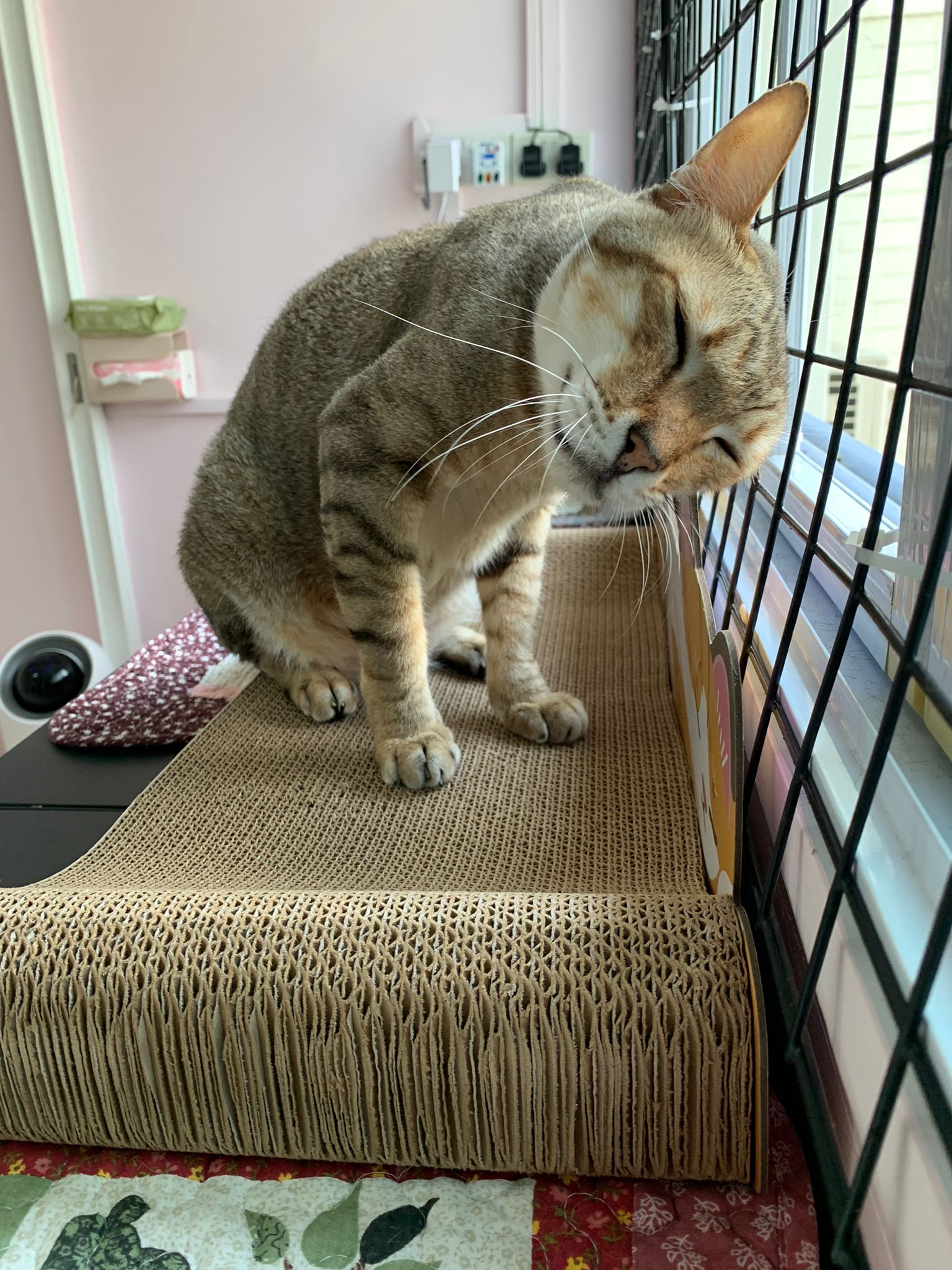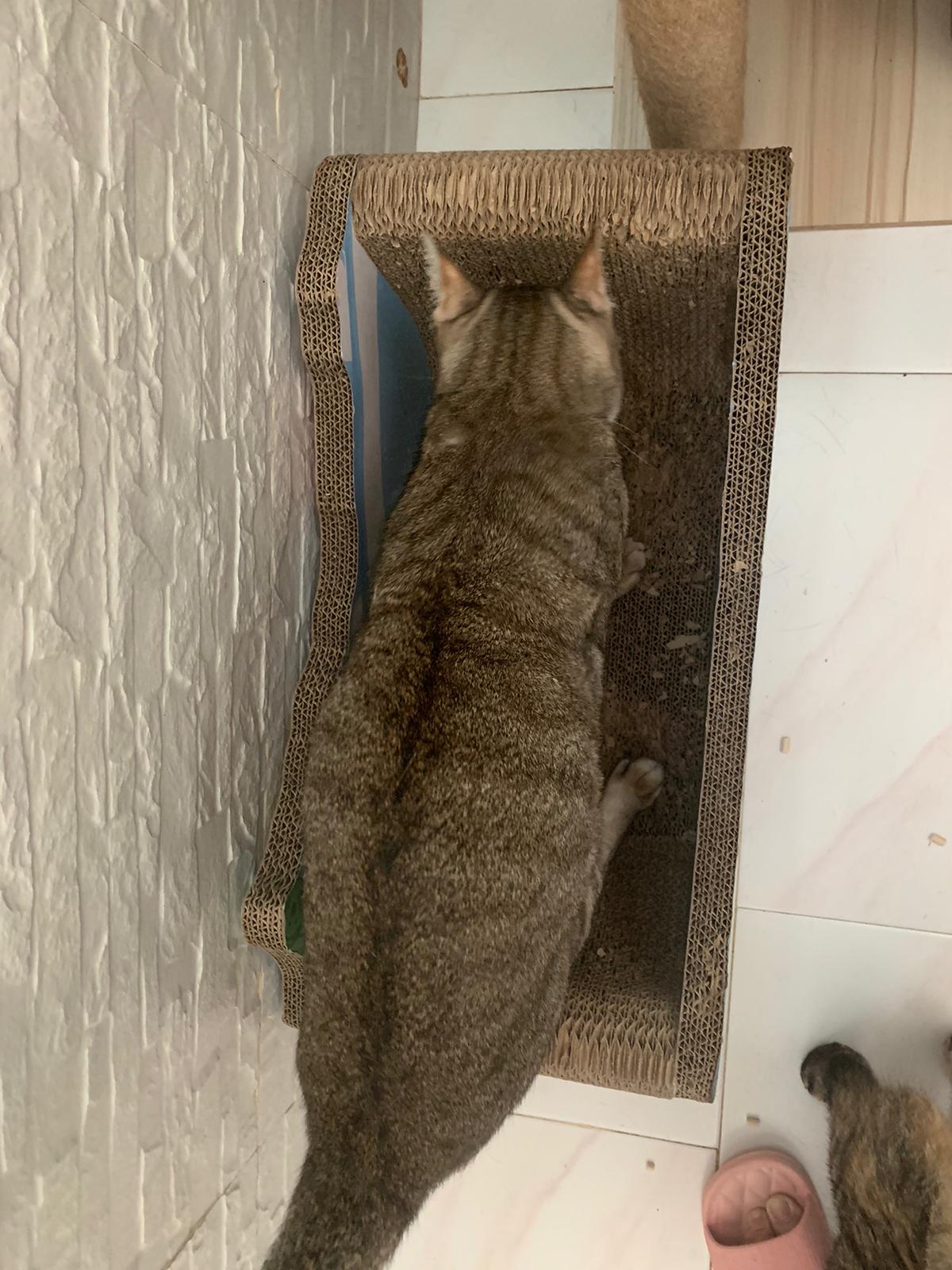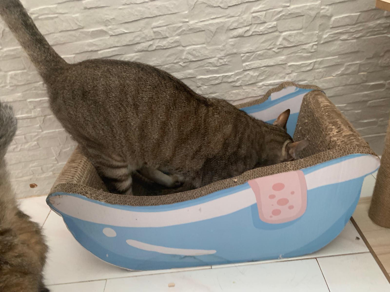 * Hide in cardboard I got A scare – look sianz n blur – think is Cos of the can of catnip inside