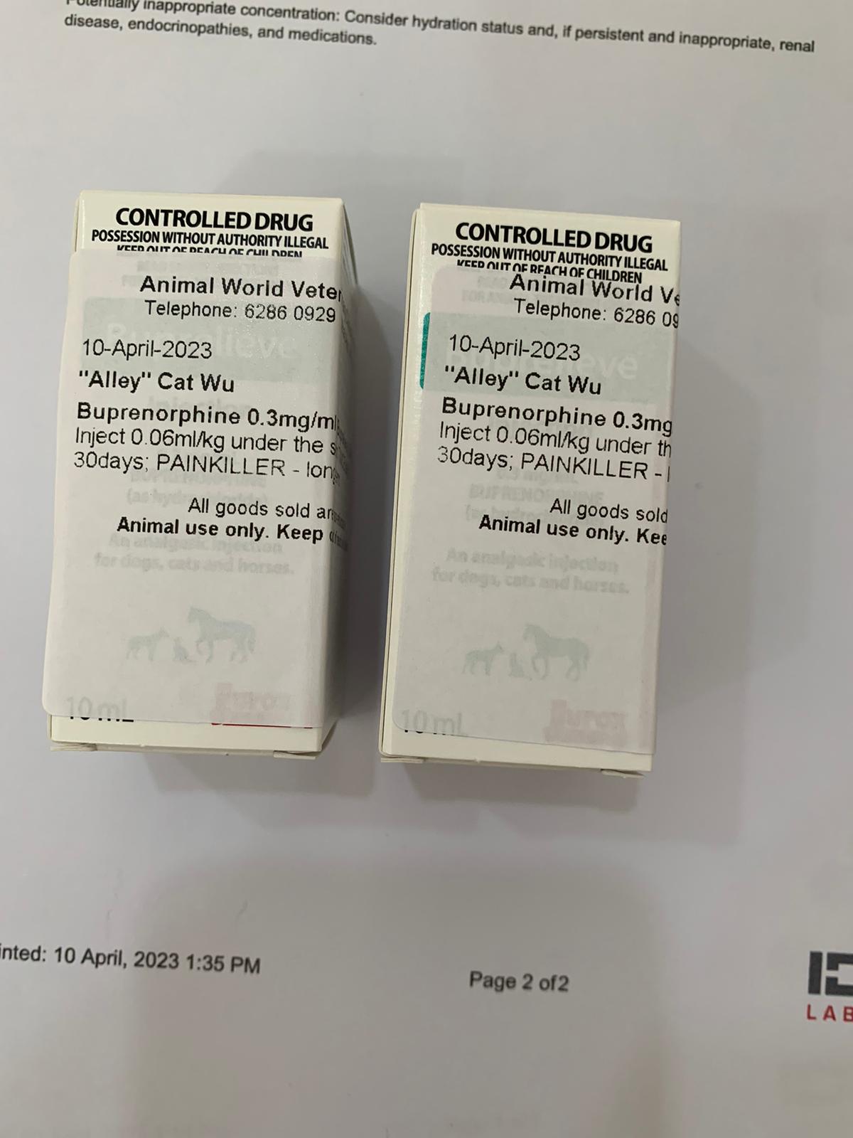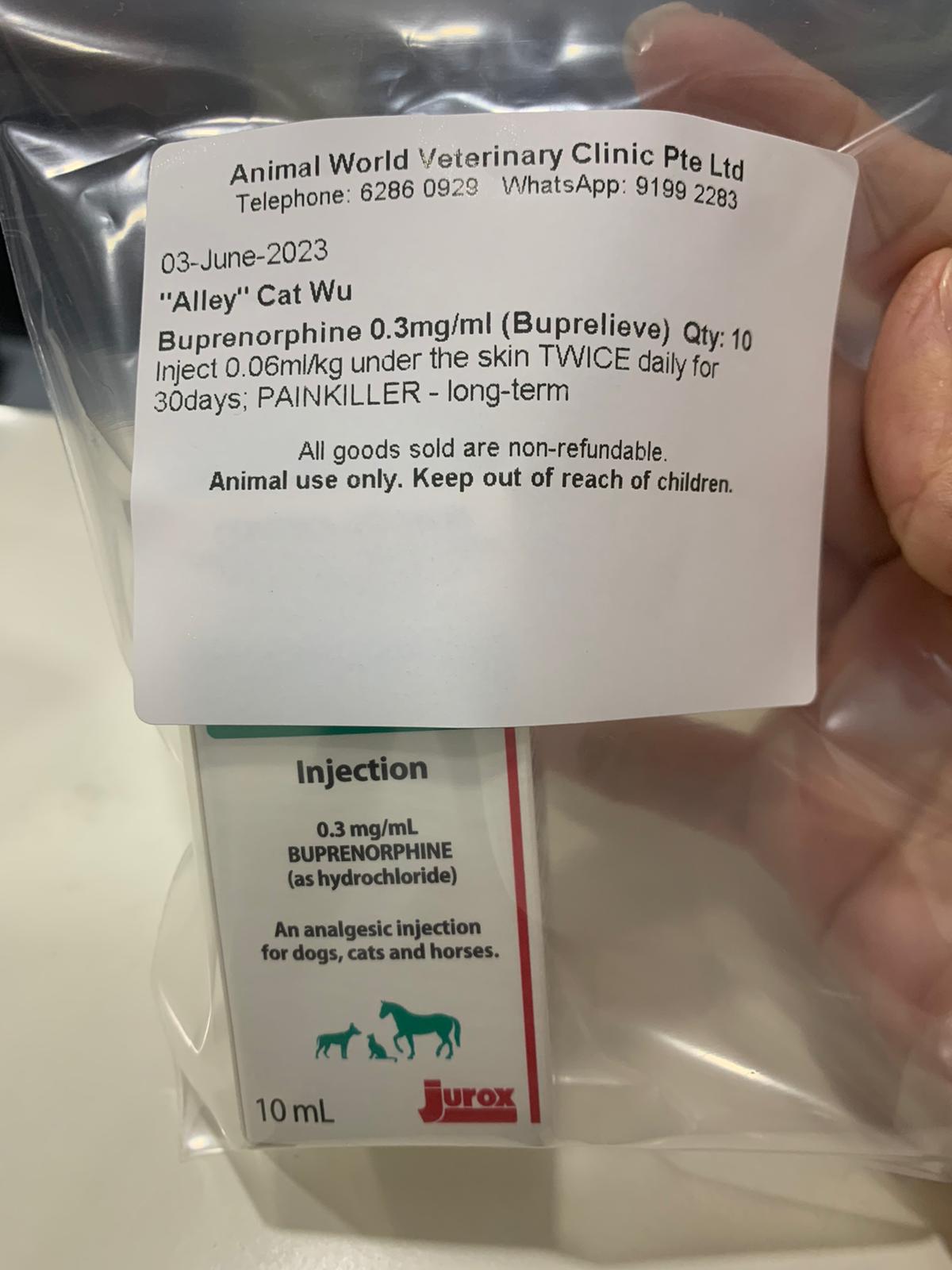 For now, I’ll up his dose to 0.27ml bupre. I still think he needs dexa jab (check first) but I think maybe need to start ab. Dexa is a steroid jab check le, sound like alley needs it but it can crush him faster. Choose safe route: