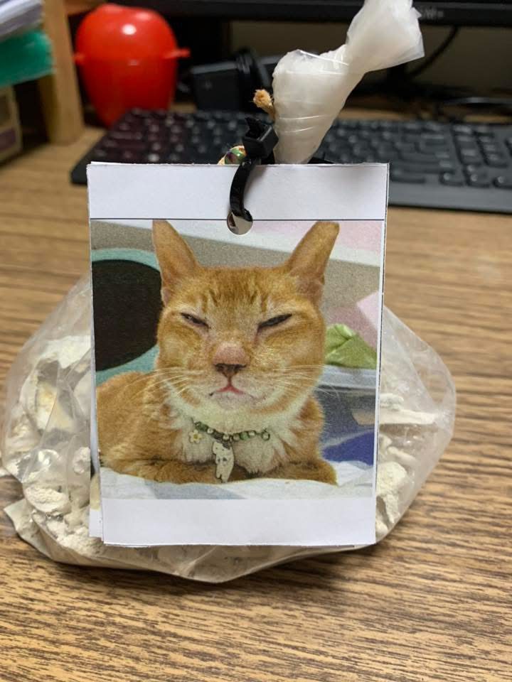 His bone can’t fit into urn. Next cat need to get the normal urn le, if not will be like didi and ah boy pack. I cable tie it.