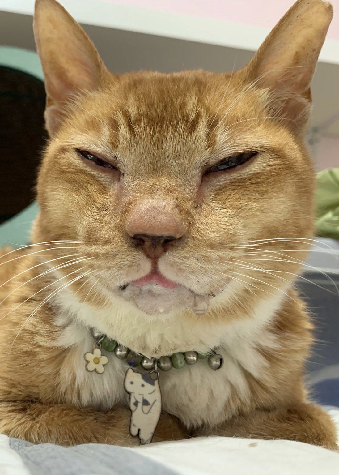 Bring back 猫房 i Subcut him a little. Look like he might go today on his own. Just sleep after finishing 40% of aixia green oldie. So cold on the floor. I put a blanket on him and a pillow for him to lie on. He prefer his face on the floor. Manja and tao come see him. May pass today.