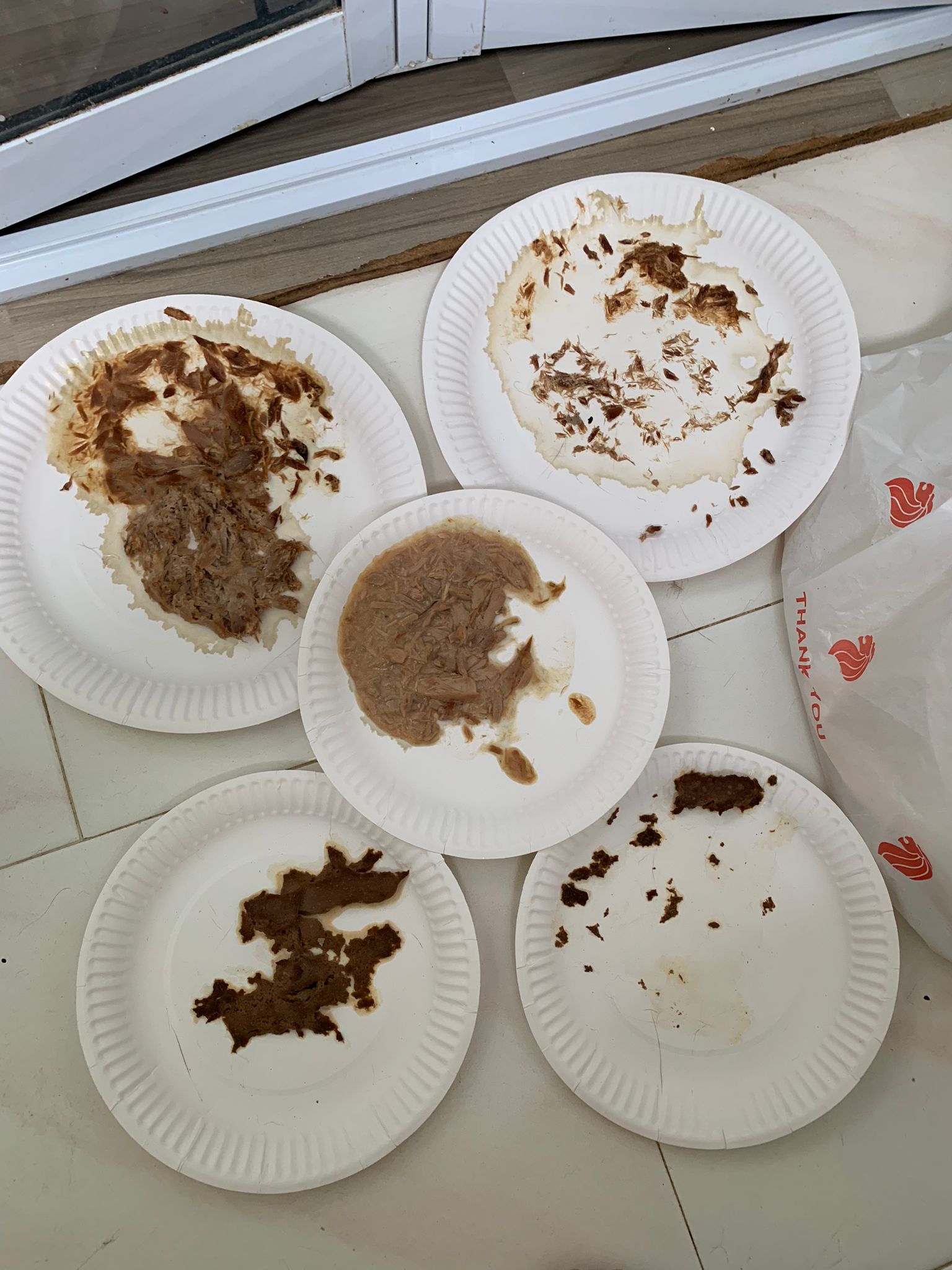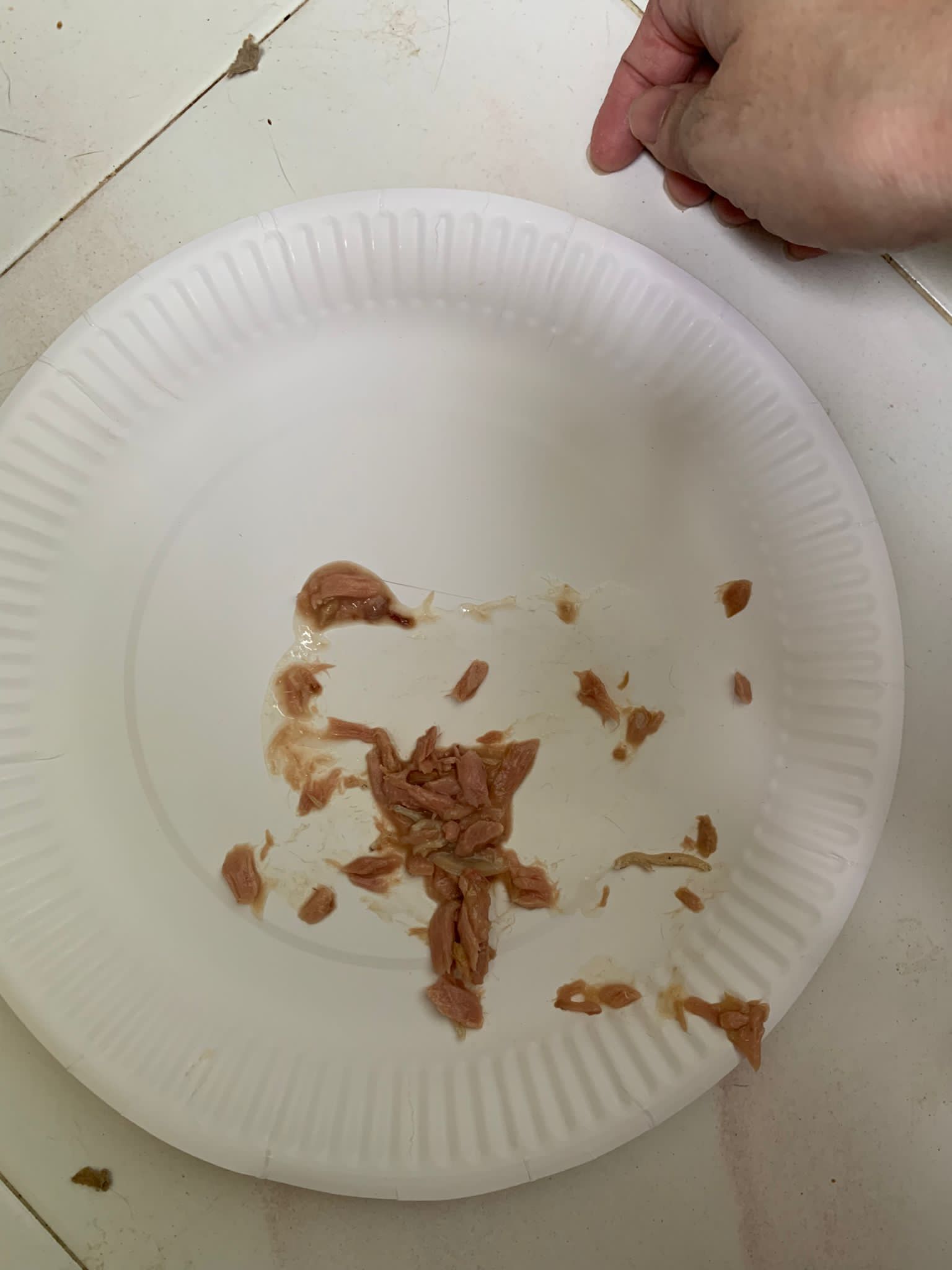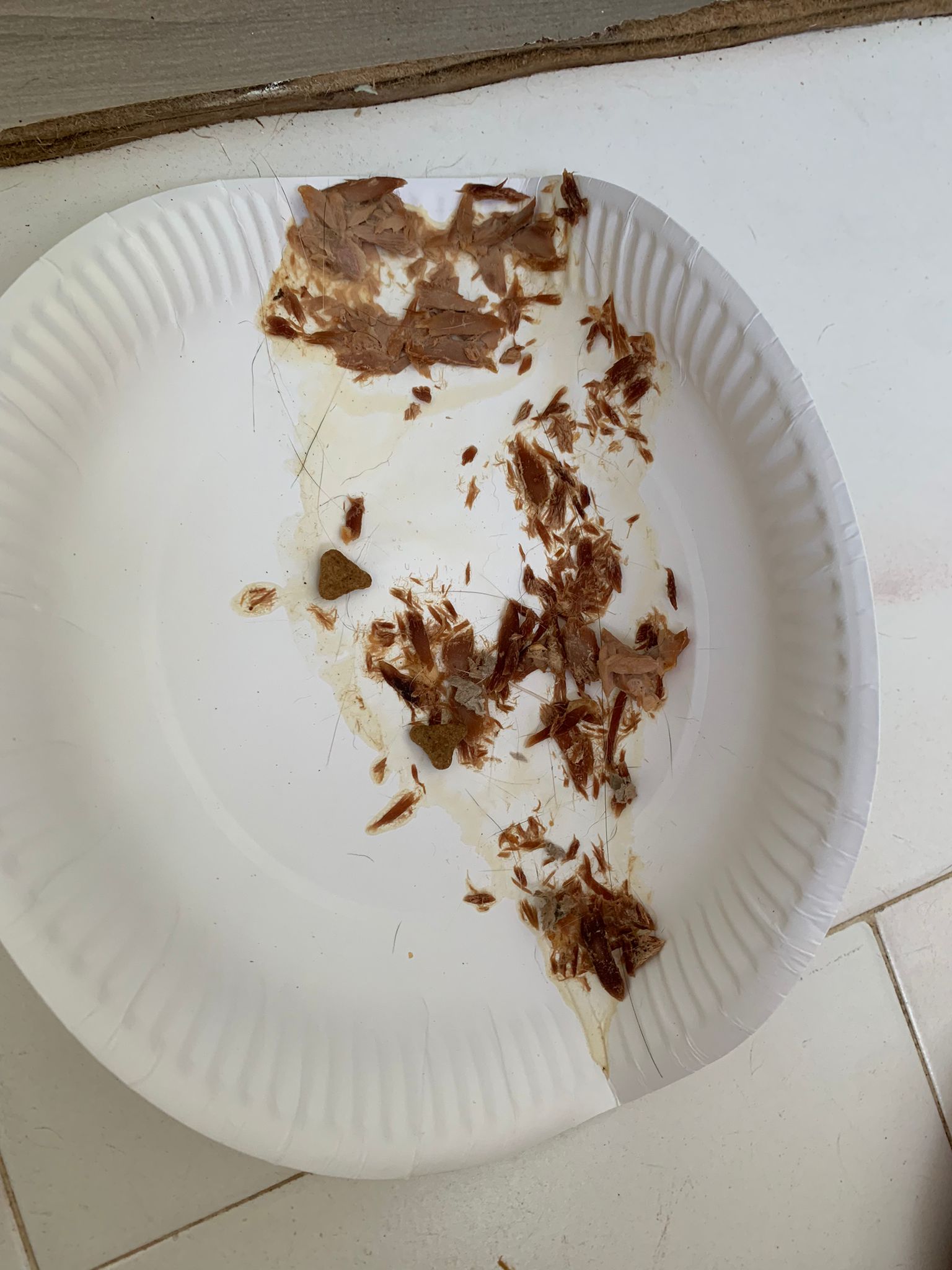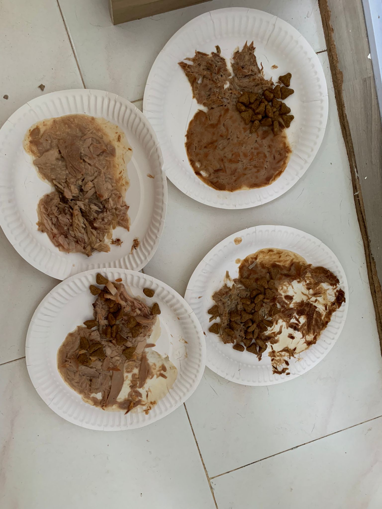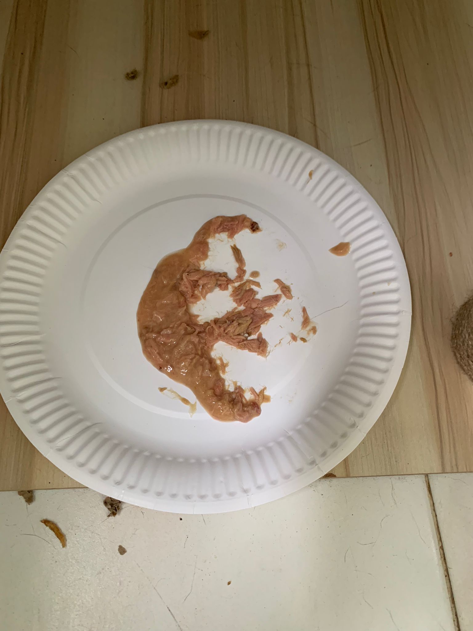 130pm: a plate totally emptied. His? Serve extra half more can on each plate. Someone did touch kibble cos drop 2 pieces on floor.
