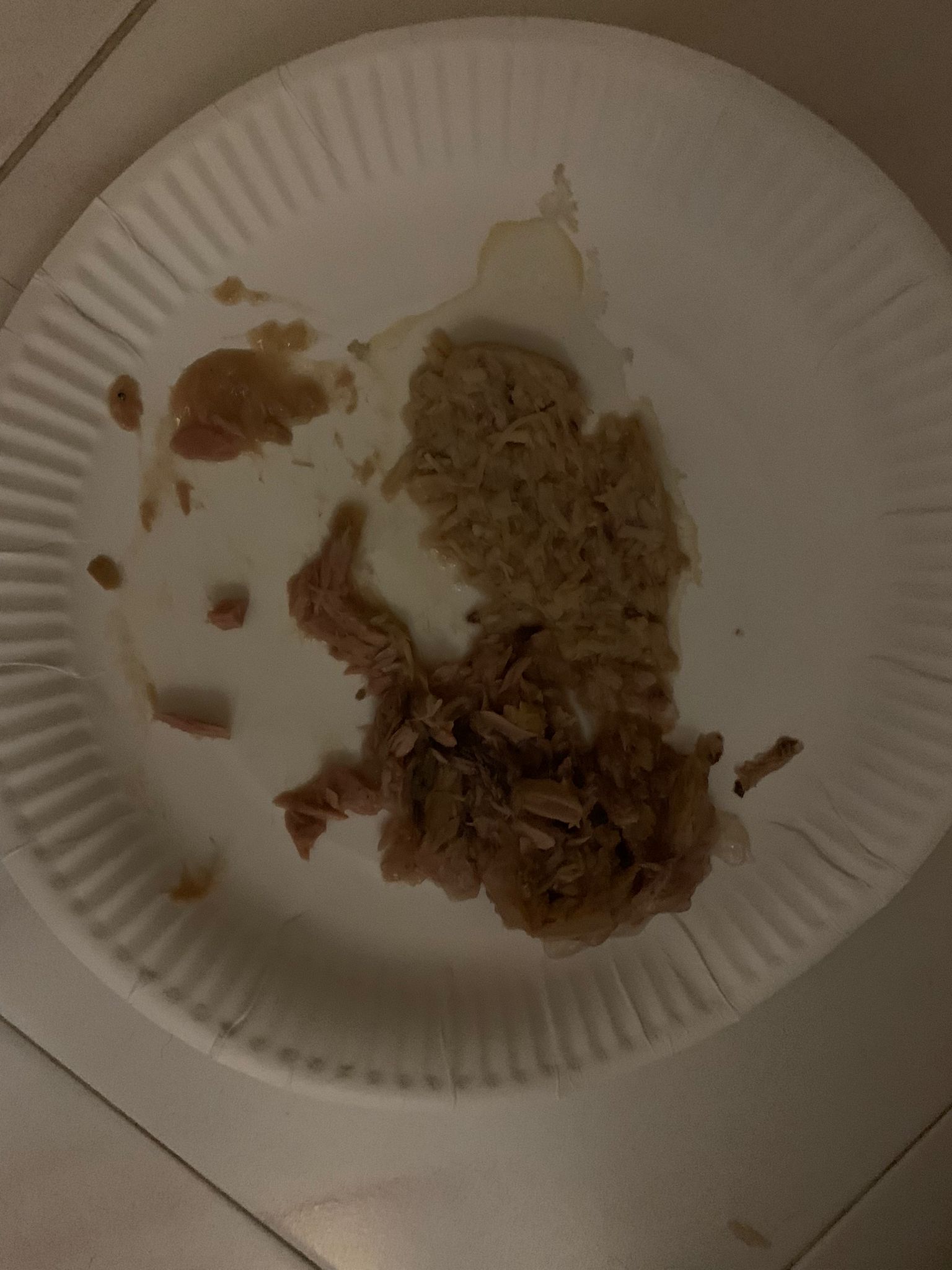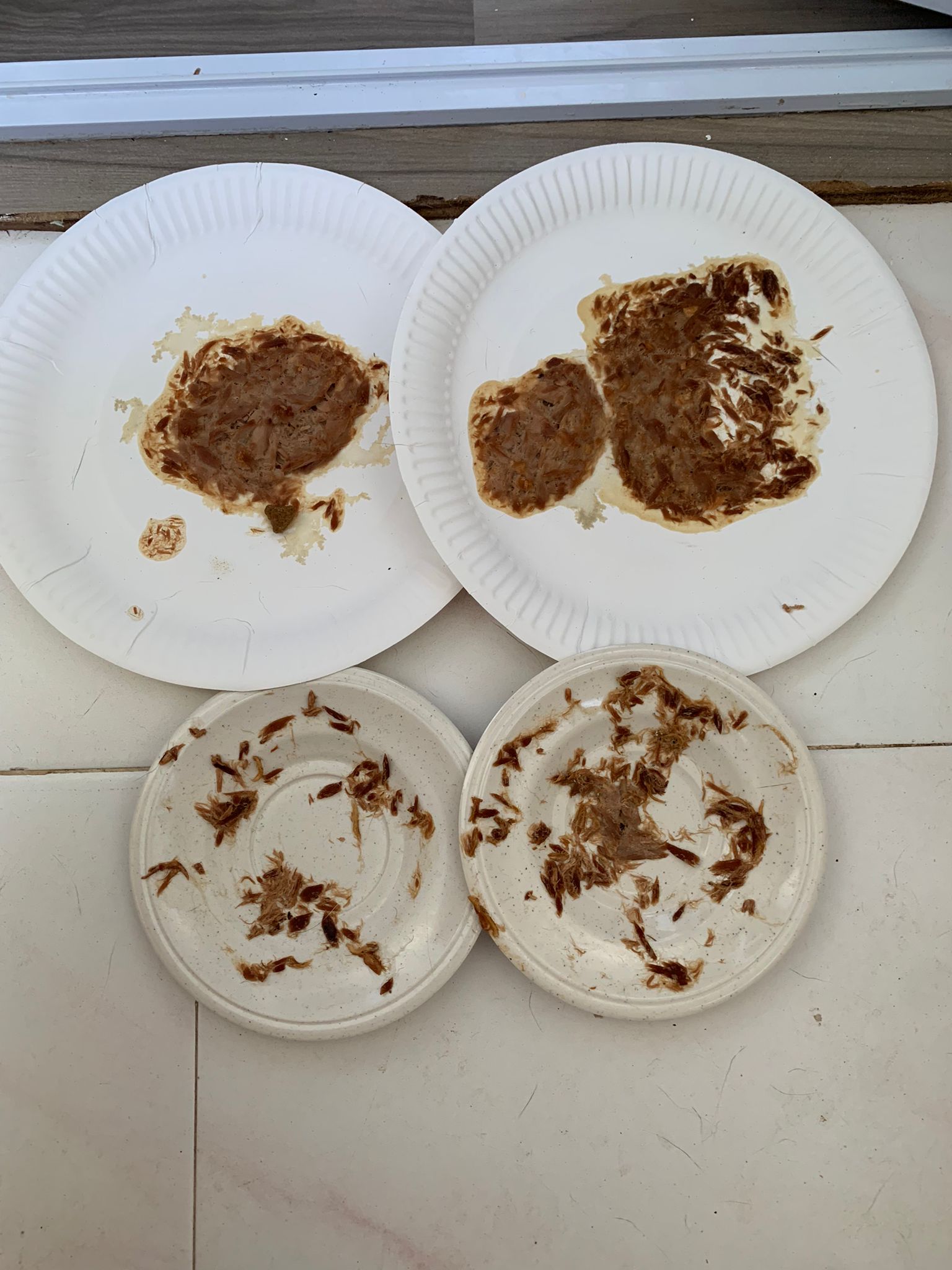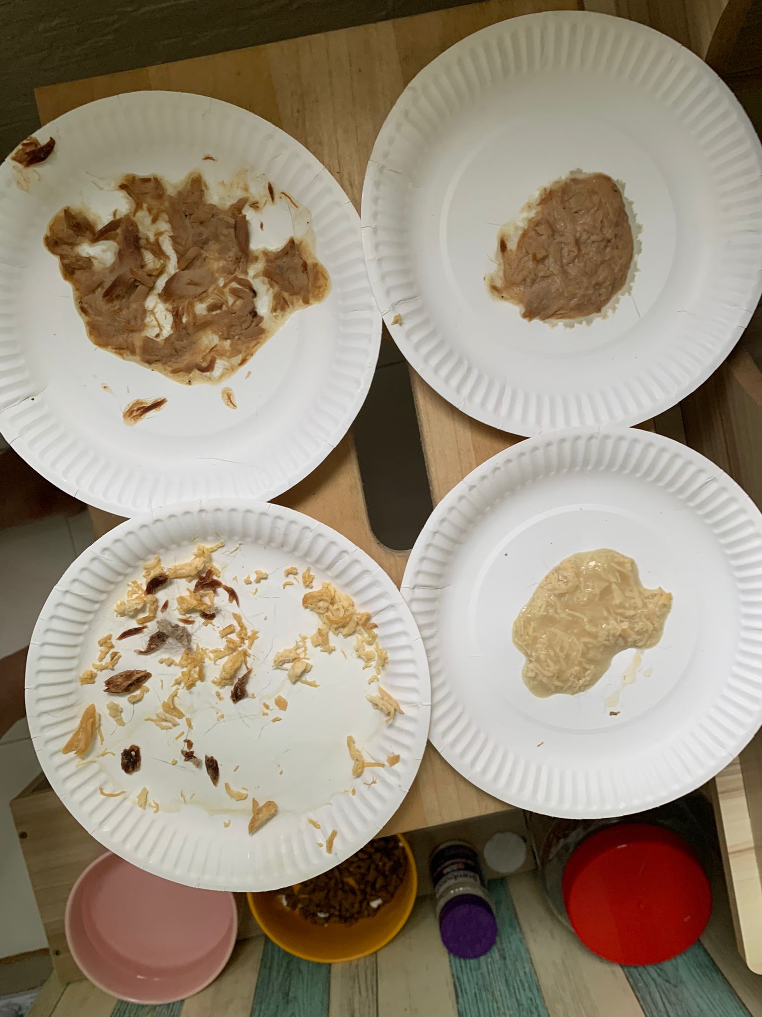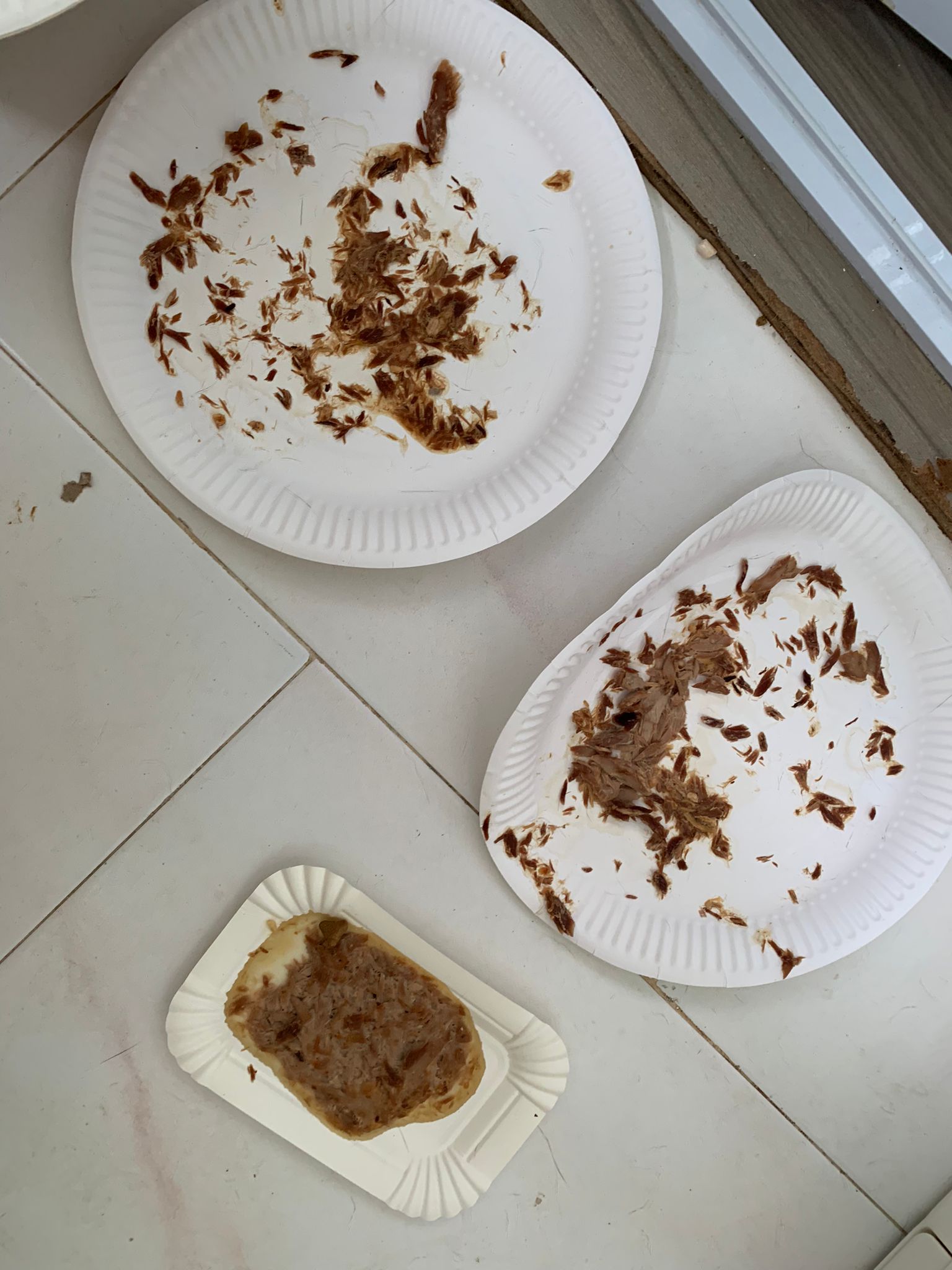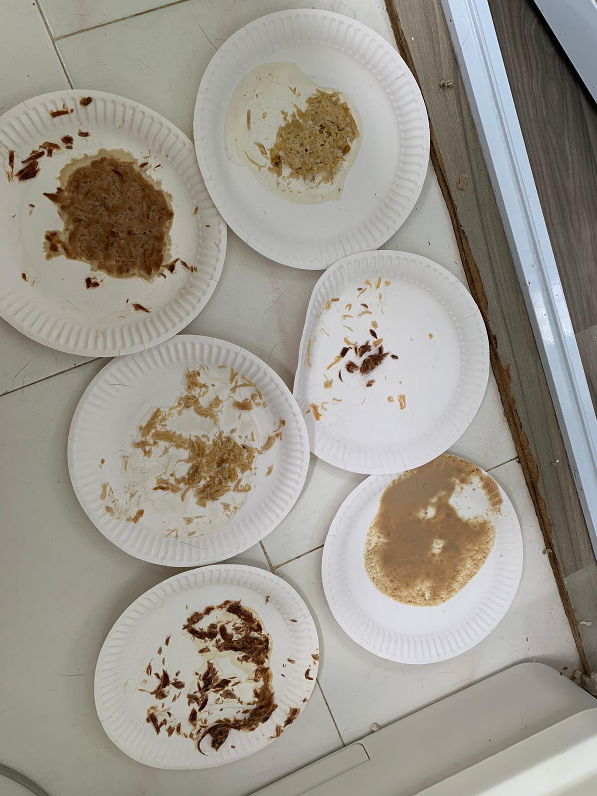 130pm: a plate totally emptied. His? Serve extra half more can on each plate. Someone did touch kibble cos drop 2 pieces on floor.