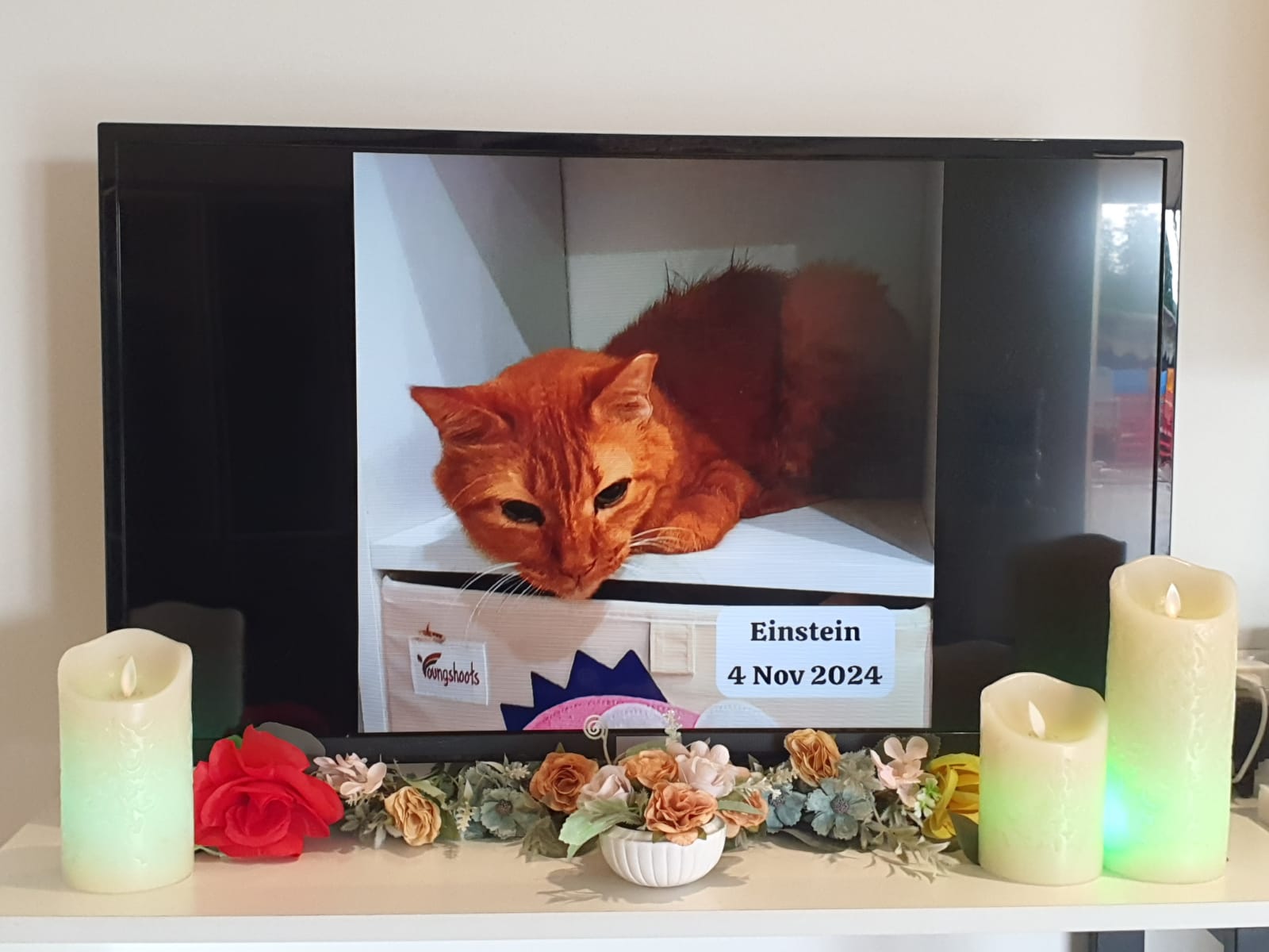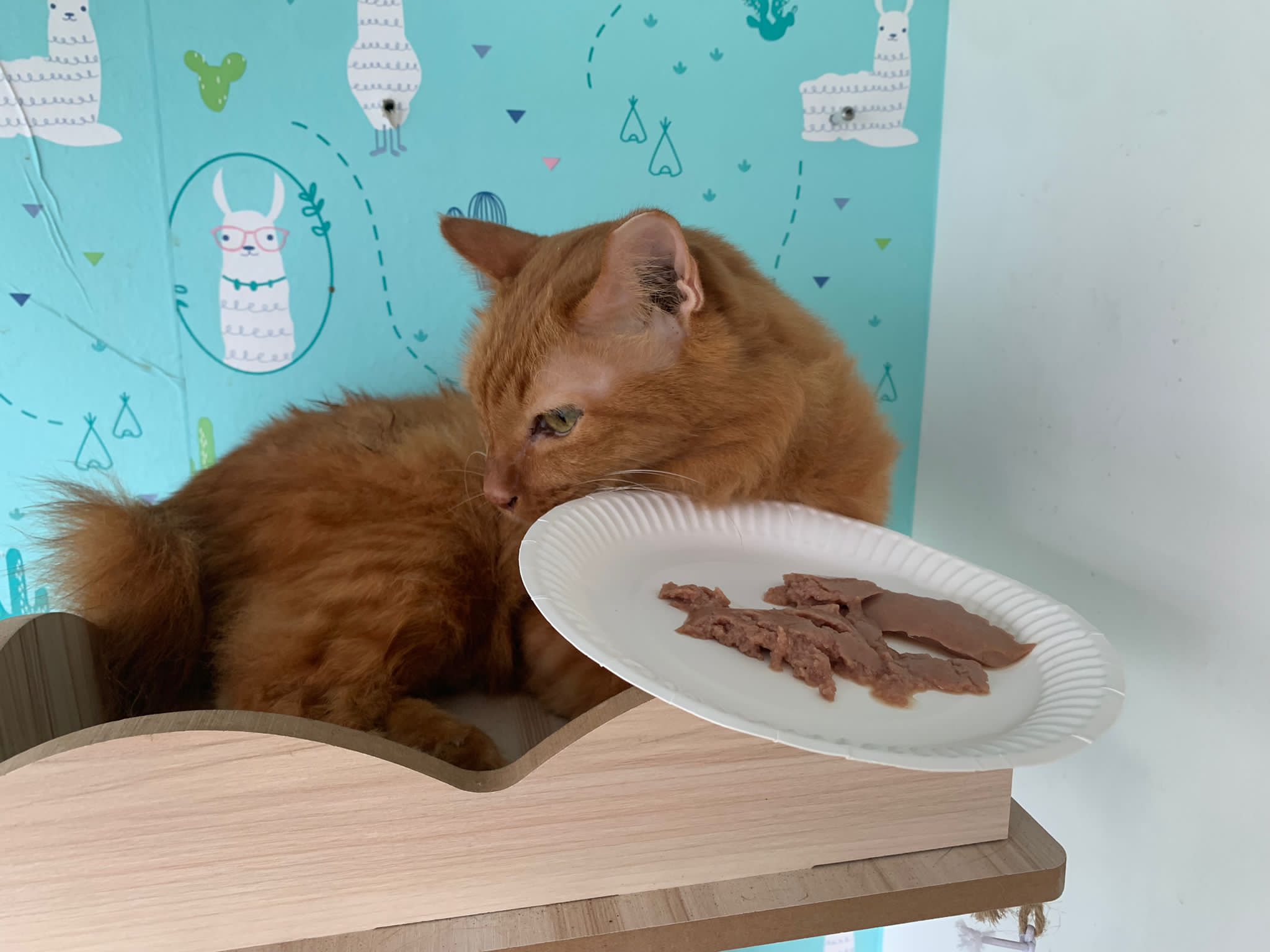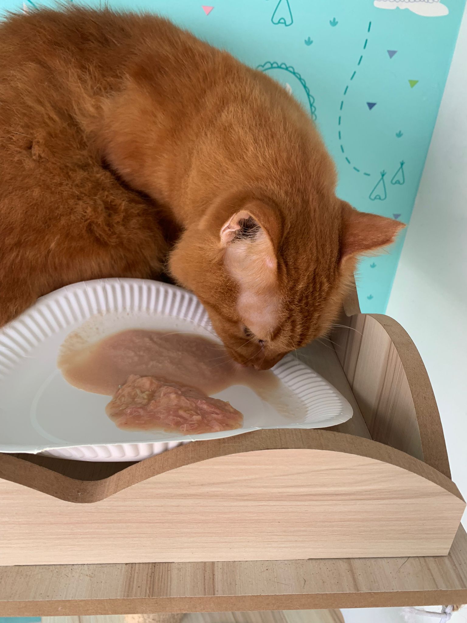 10.16am: serve his food w aixia kidney pouch w intestinal care – he likes. He finish. Like got come down find me – want more? Clean his eyes for him. No poo. Food plate cleared.
