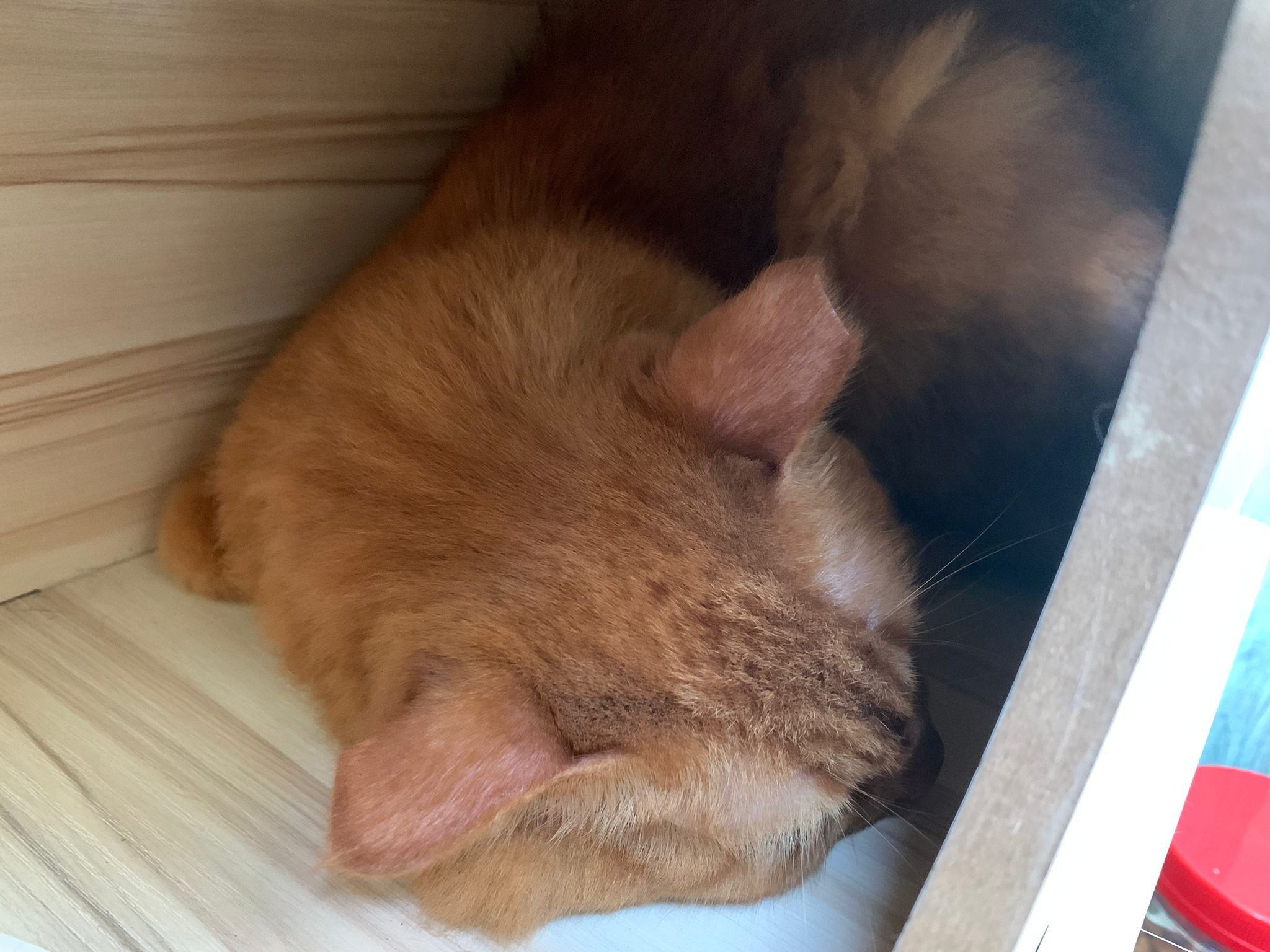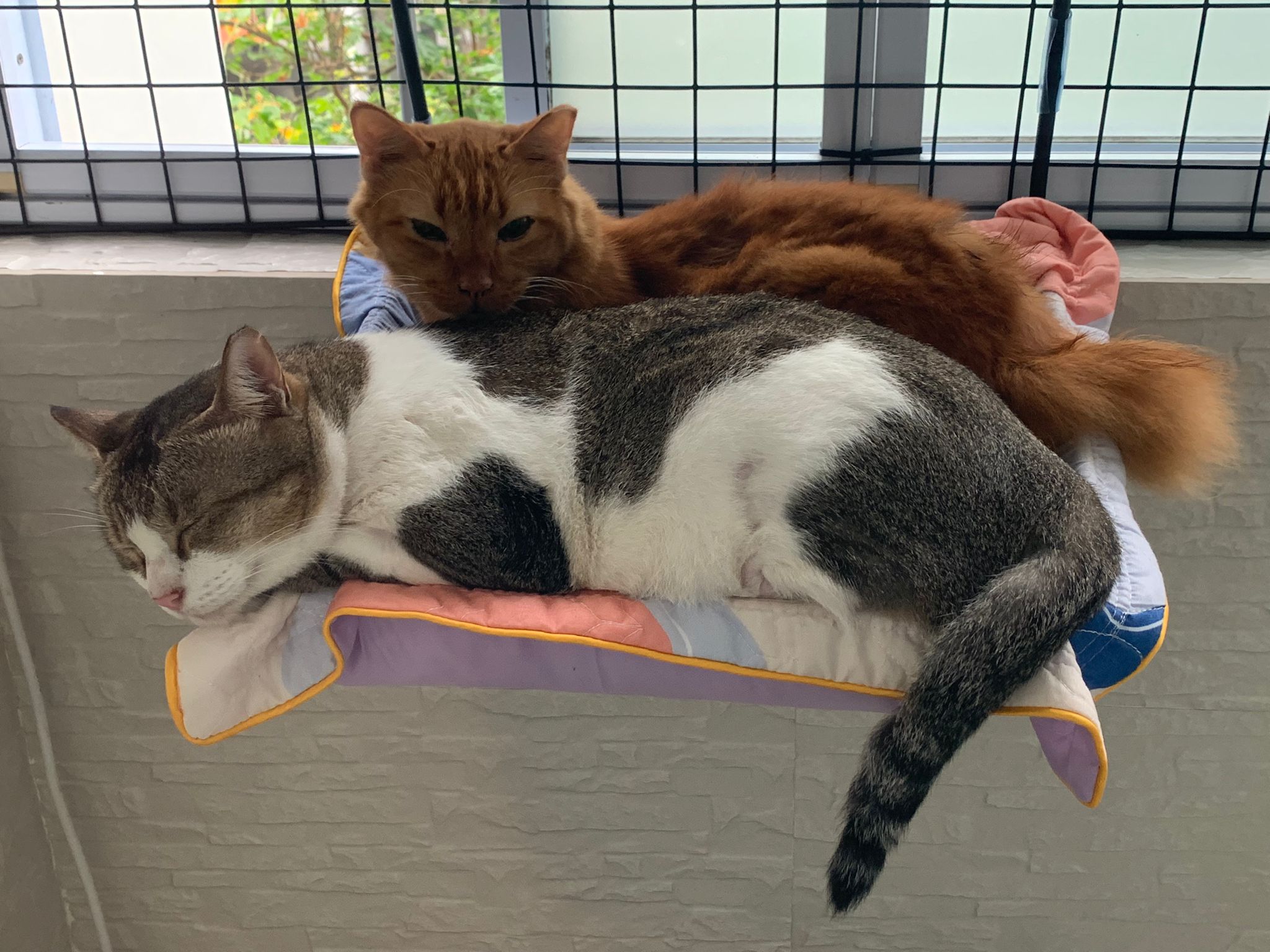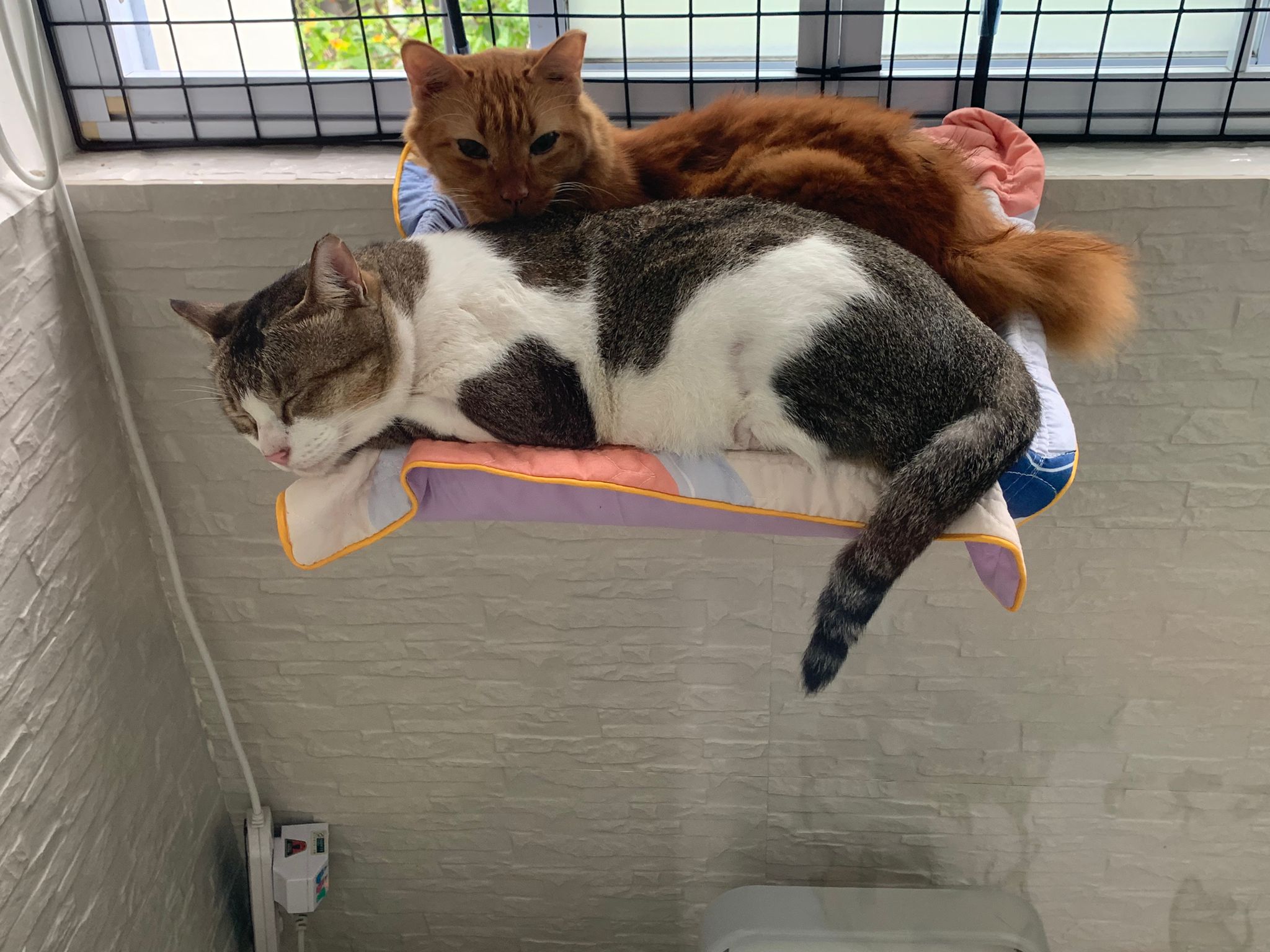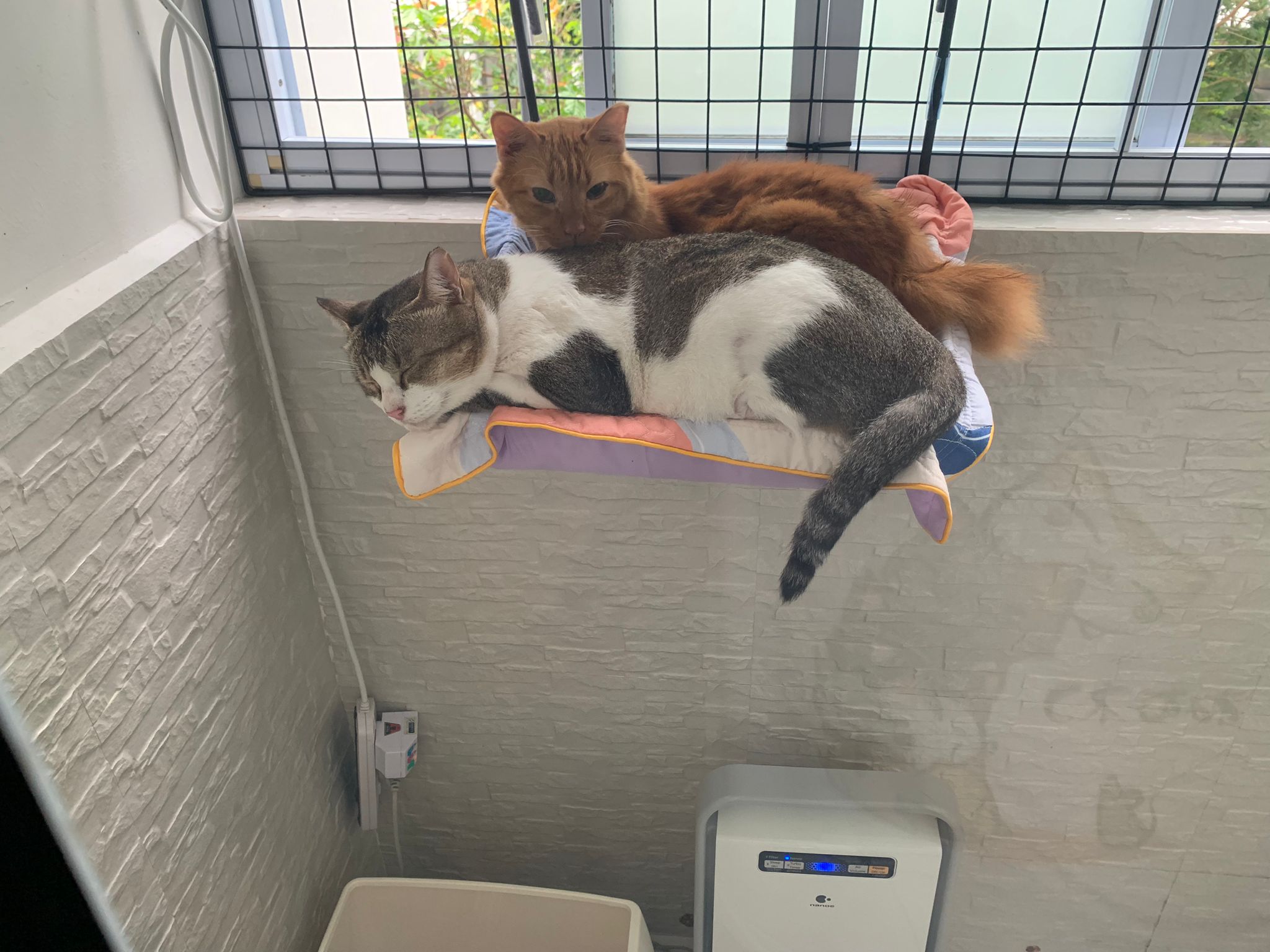 920am: wa today both at condo. Ein at the top deck again. they didn’t sleep on hanging bed anymore. Thru the night, they take turn to be on the hanging bed, ein on it the most time 2-5am, still grooming himself, someone confirm eat kibble.