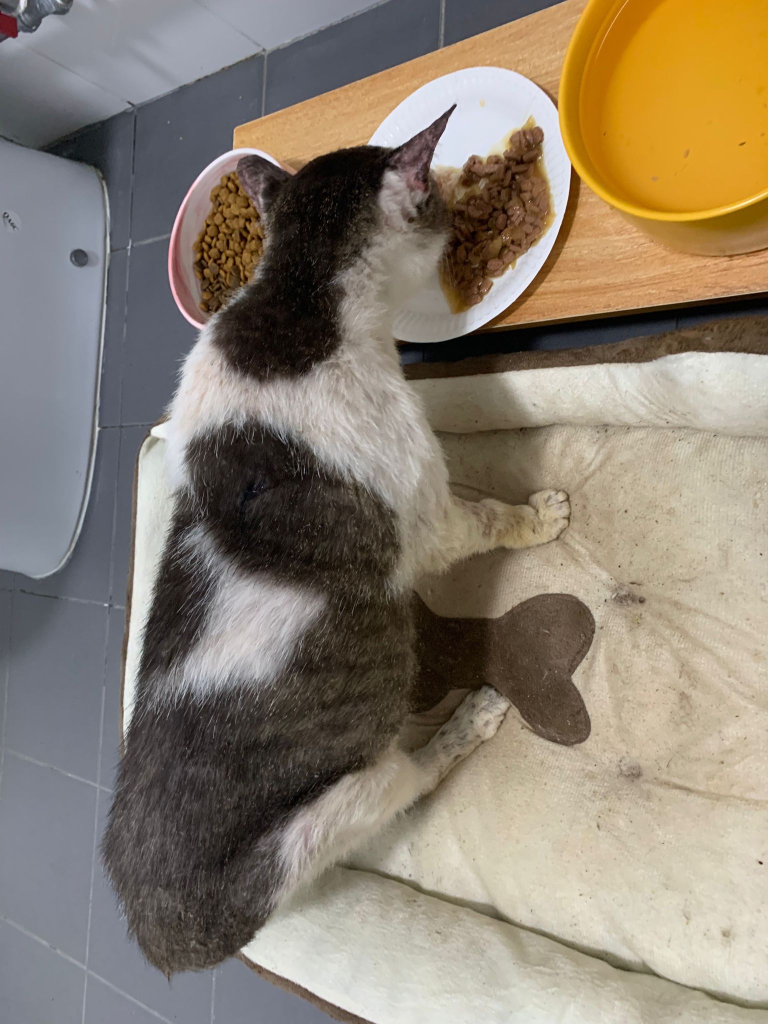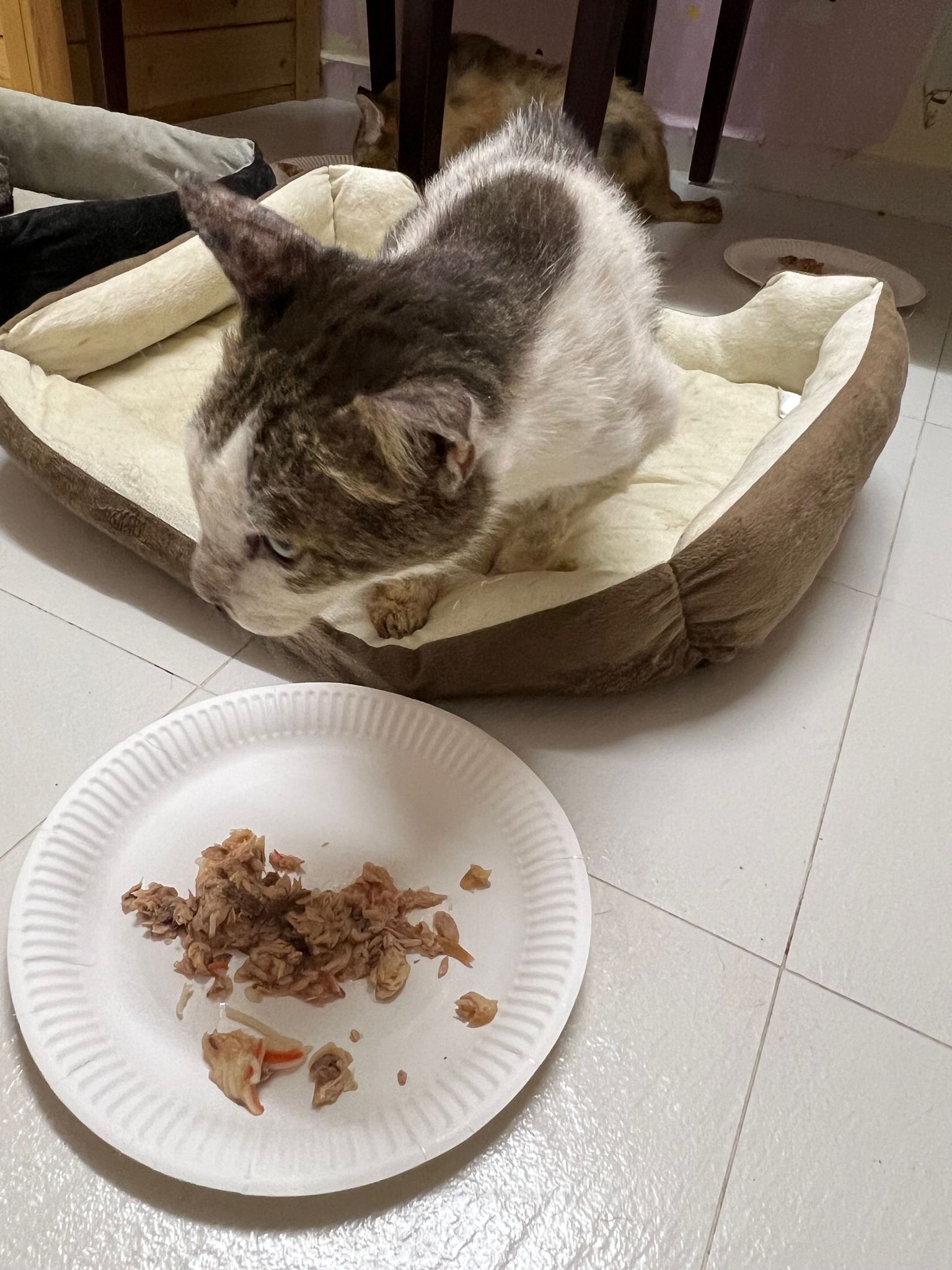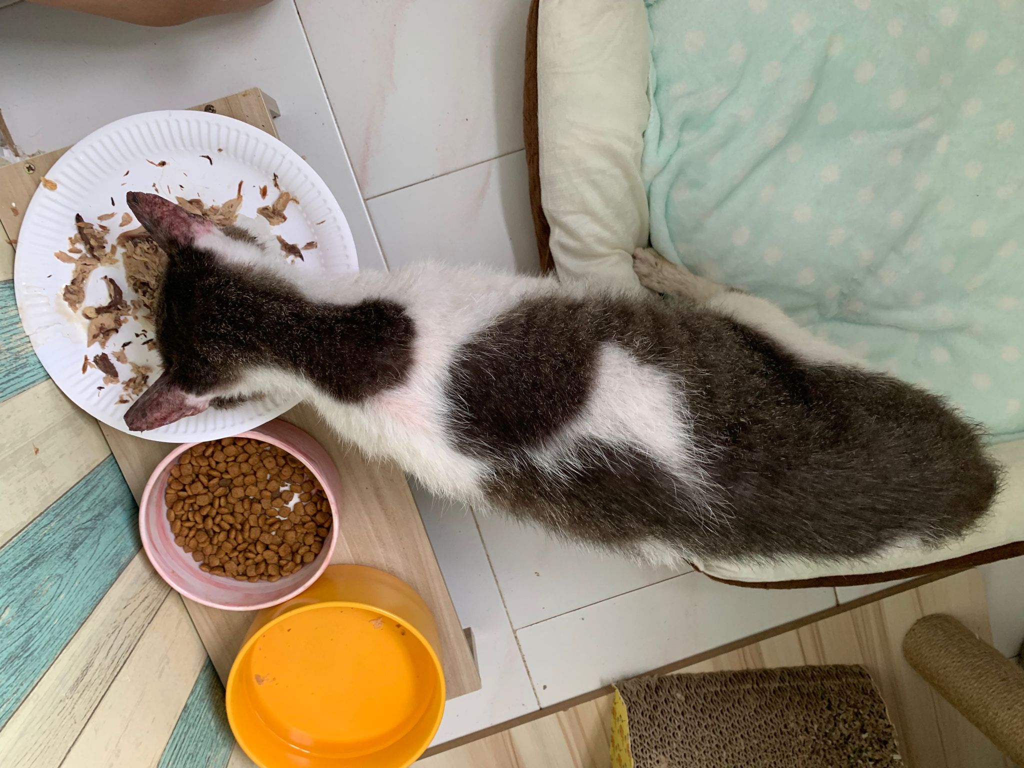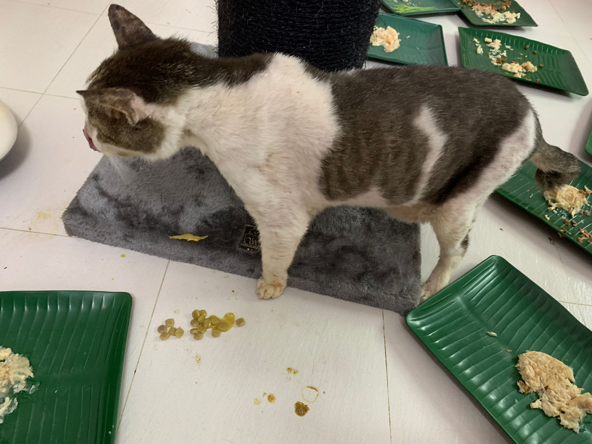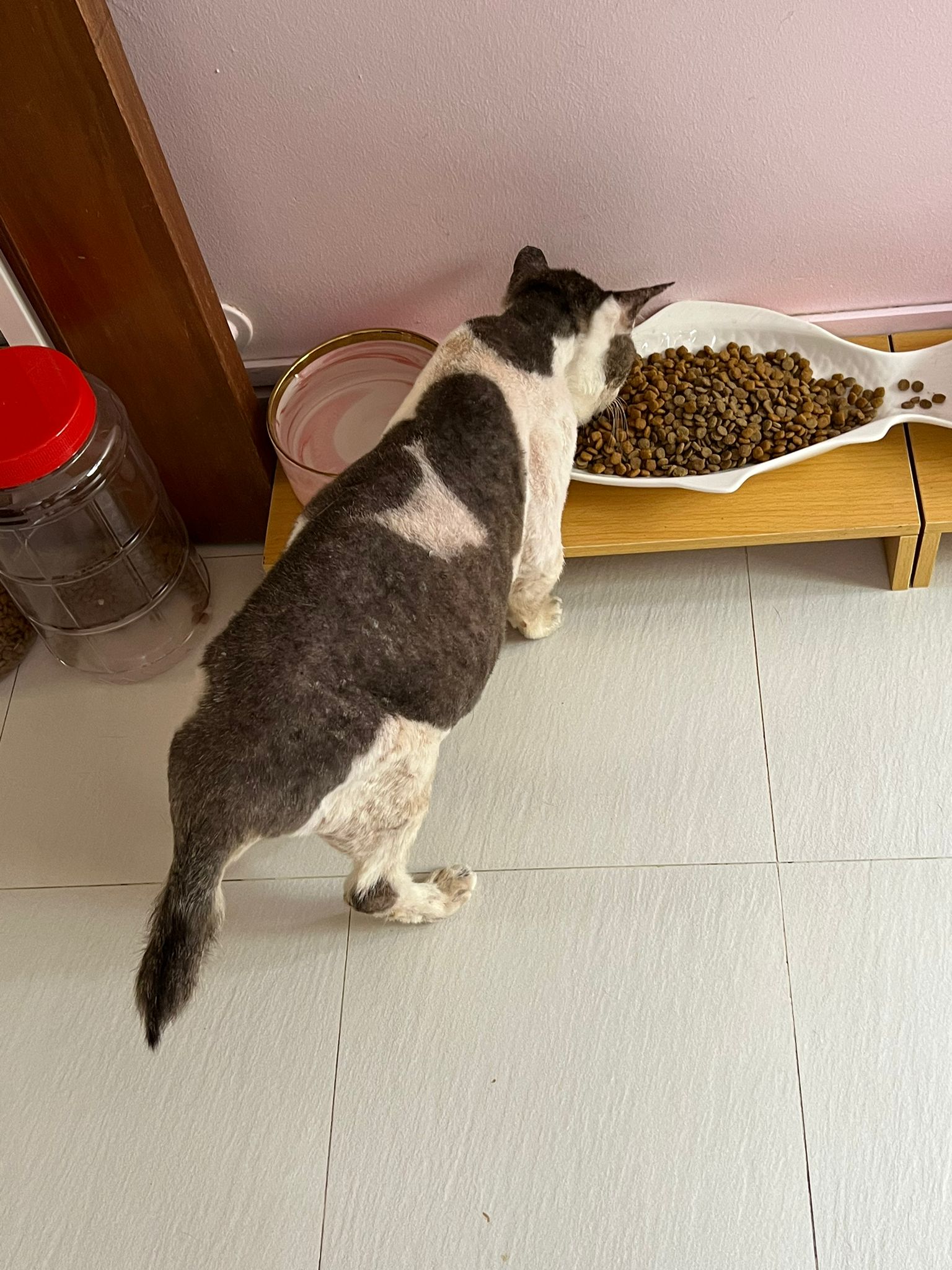 • update Fr Agnes: “This 2 day fat fat dun really eat well , few bite for can food .i put dry food mix with stream fish he also not very interested . This morning the bowl left abit But morning bf he also eat few bite on can food , have to put some dry food food .”