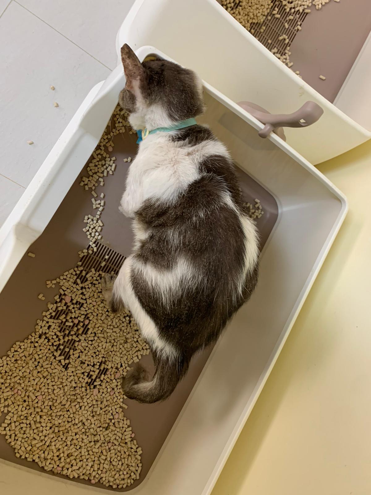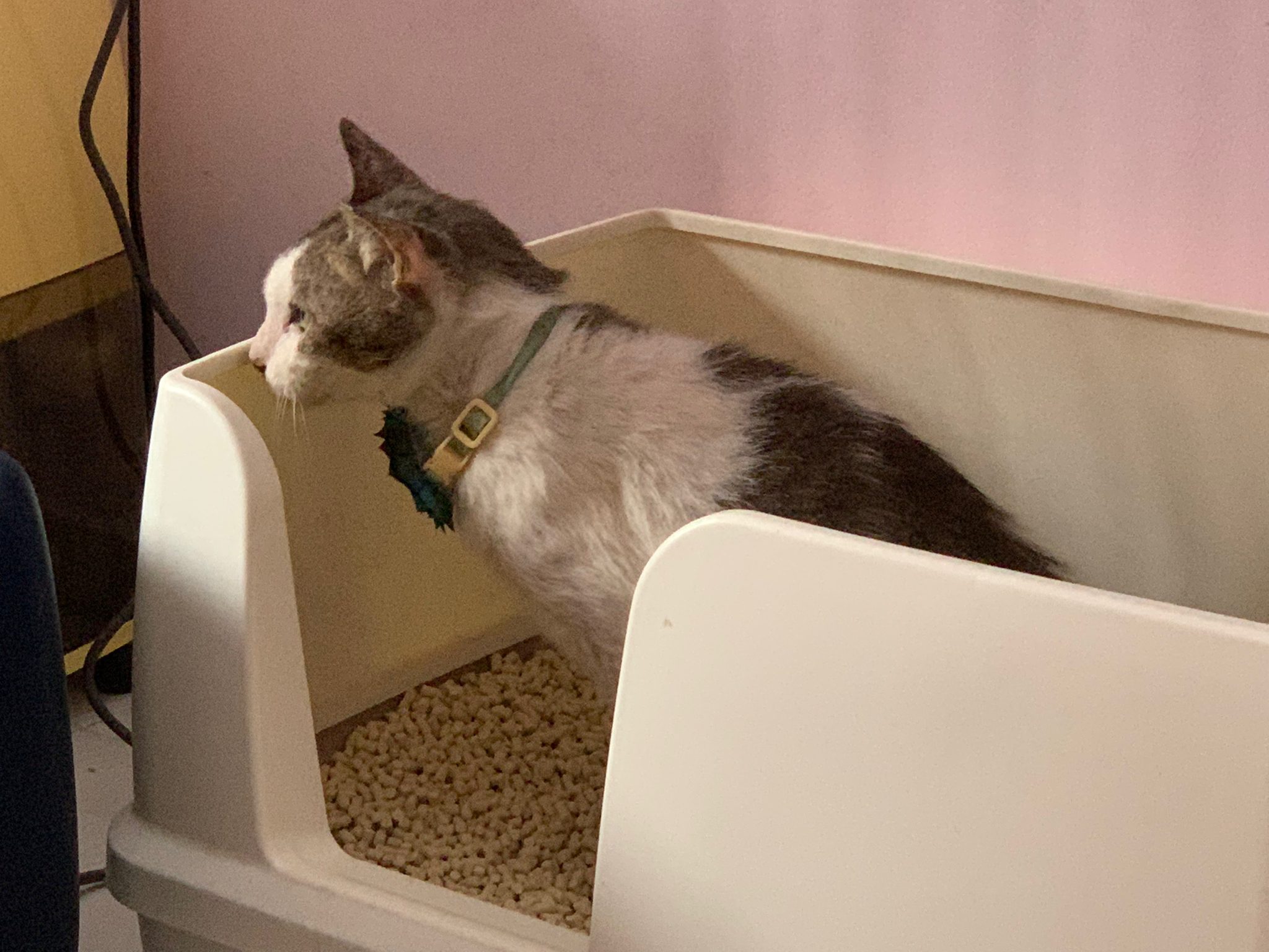 Morning: he walk to bin, adjust and front legs in bin, hind legs both not in n he poo. 4/10