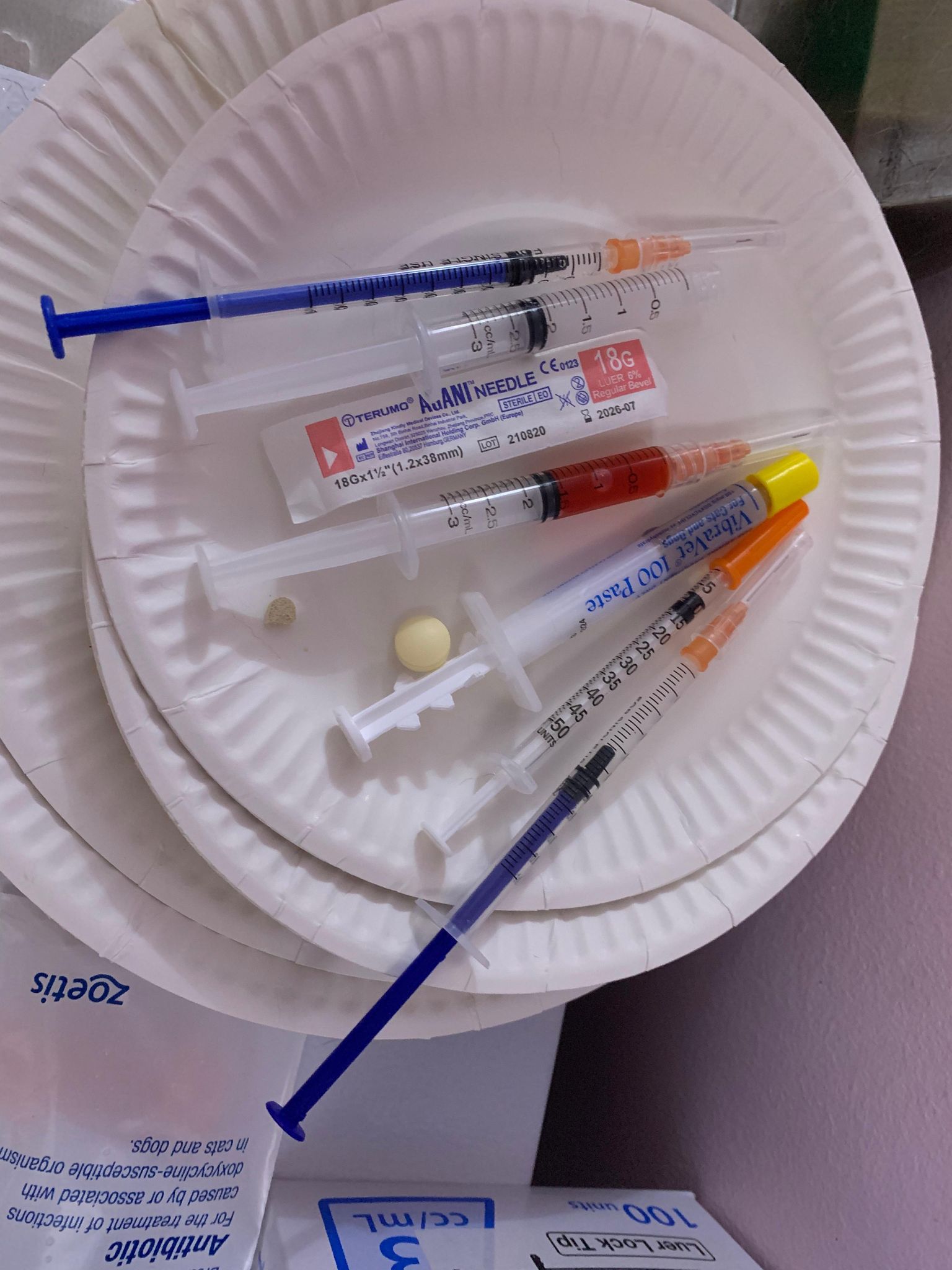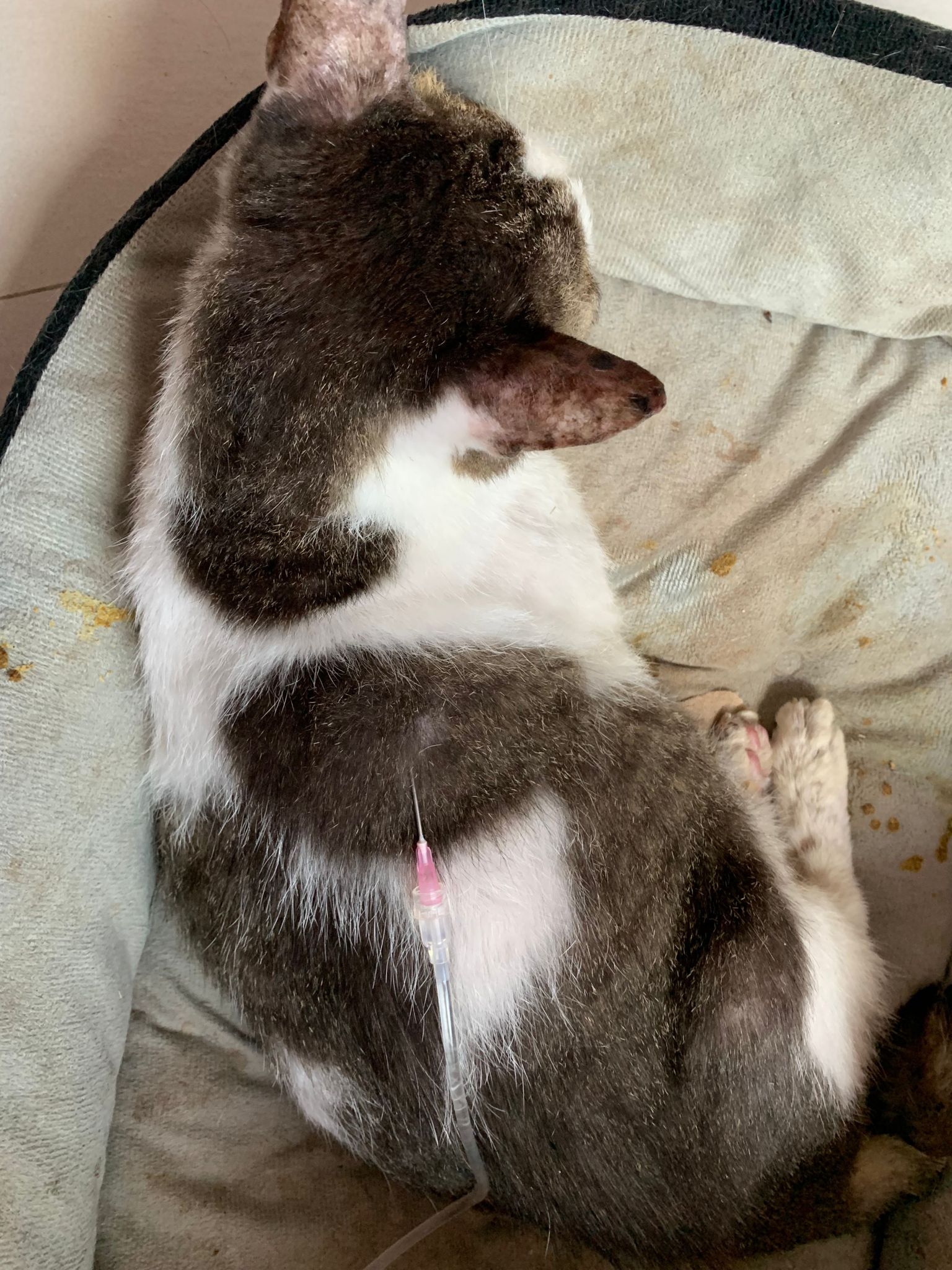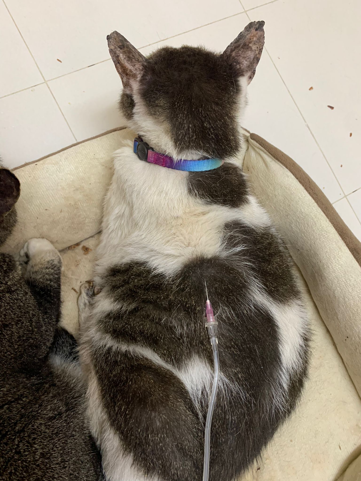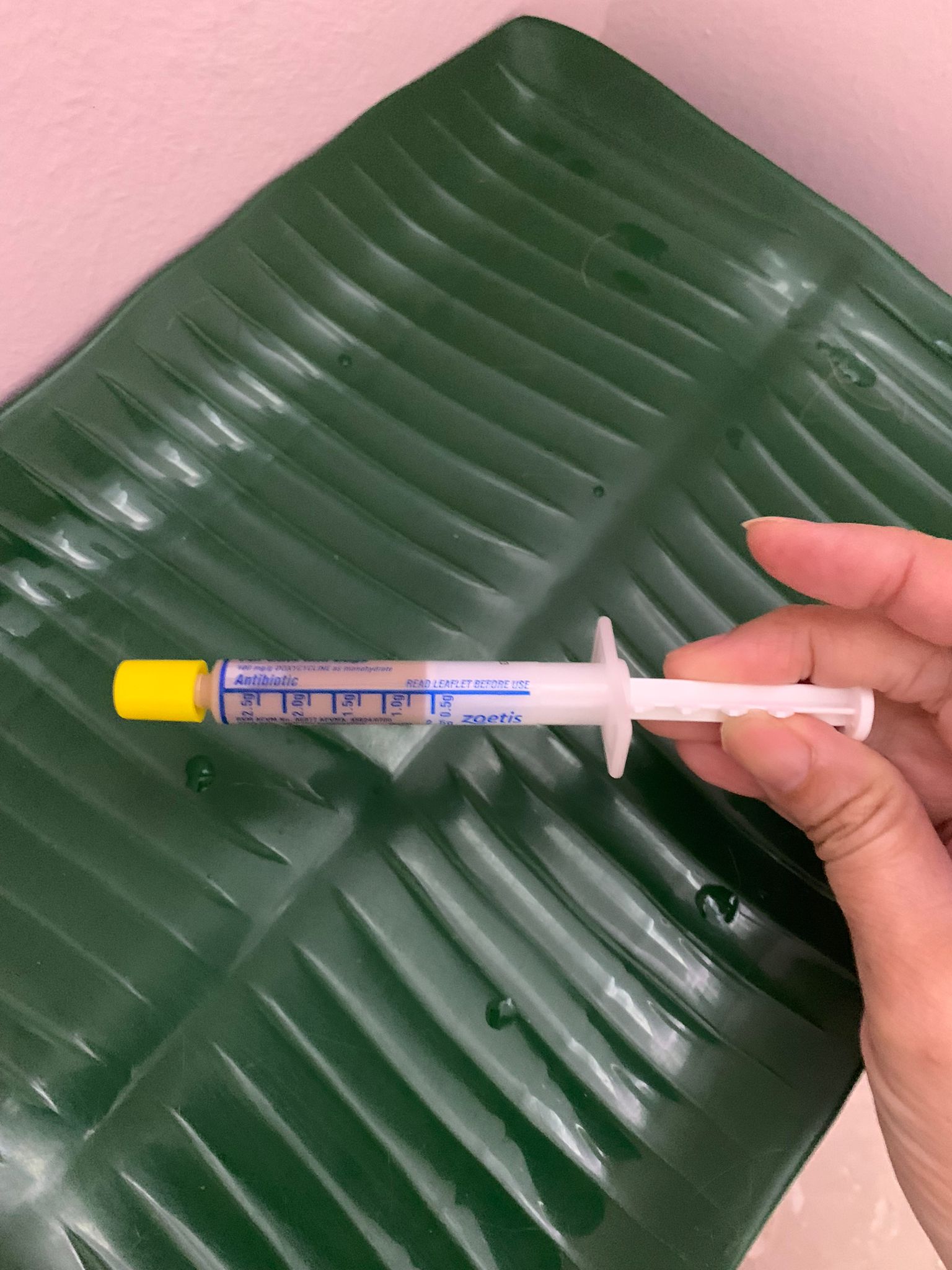 Morning: 6.09kg – gain 160g in 12 days. Today officially stop his clinda. Given Subcut w other meds