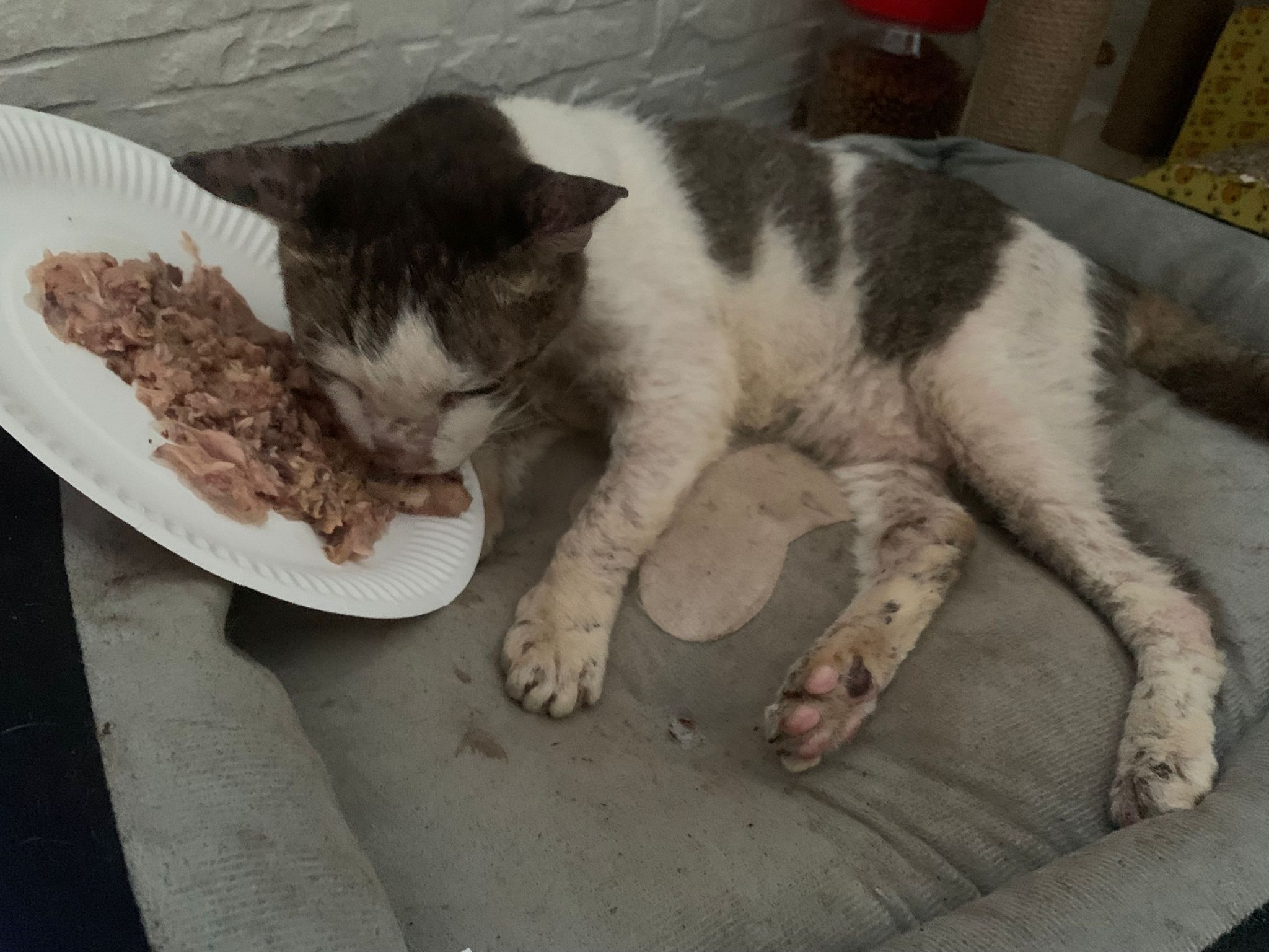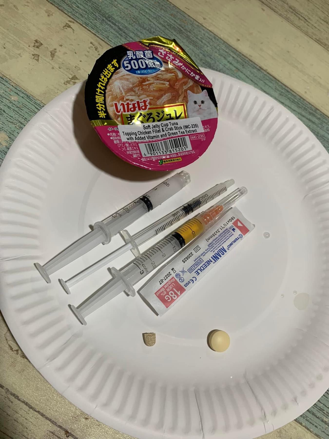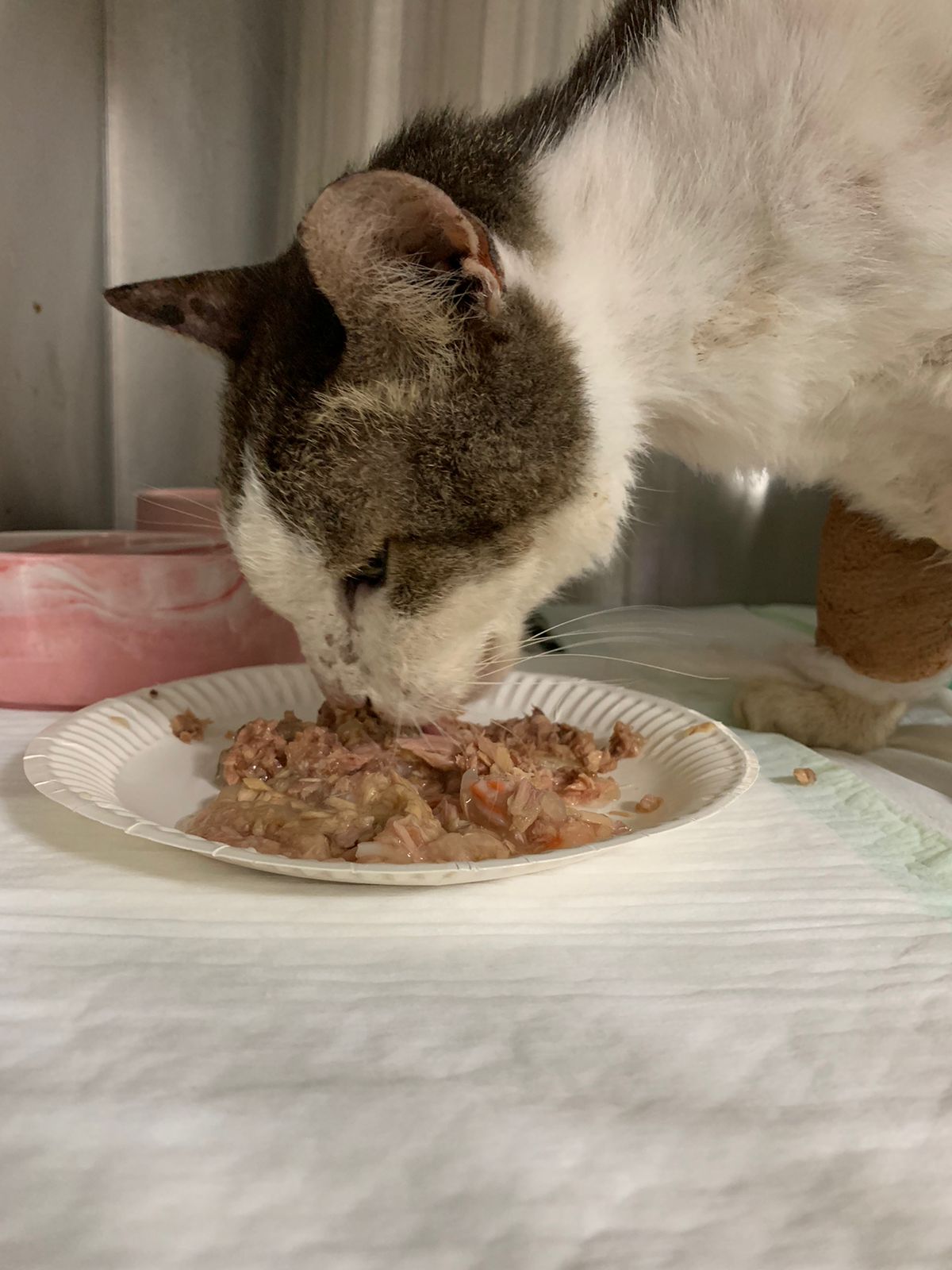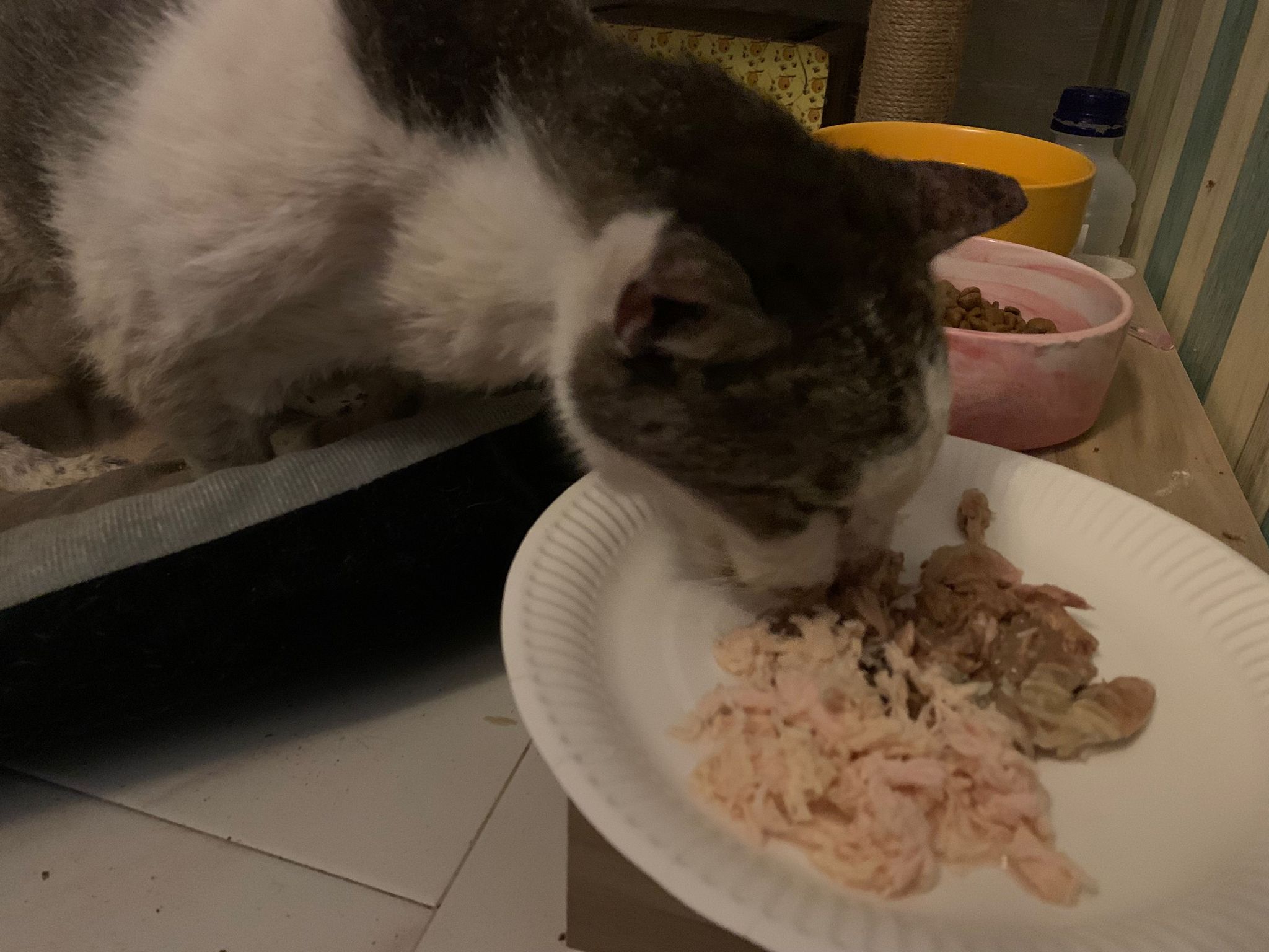 Morning: lucky he got eat. Think must serve real tuna food. Subcut him. And meds. Jack sayang him after that n I go to work. Did feel he is thinner