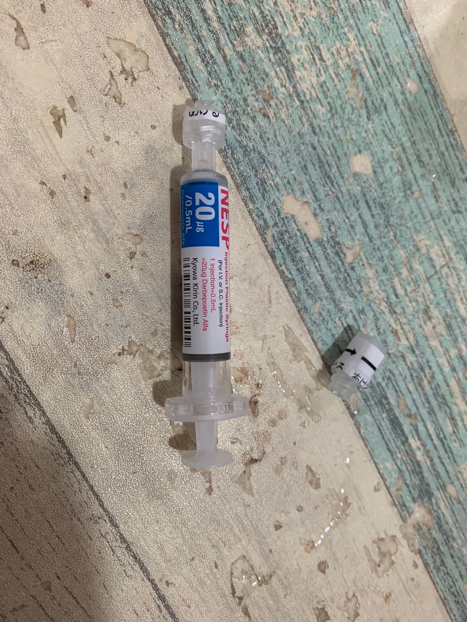 9.26pm; jo “Dunno y fei lay on the bin. came out himself” – today darbepoetin should be given. I got to go back Tmr give him the jab w Bs.