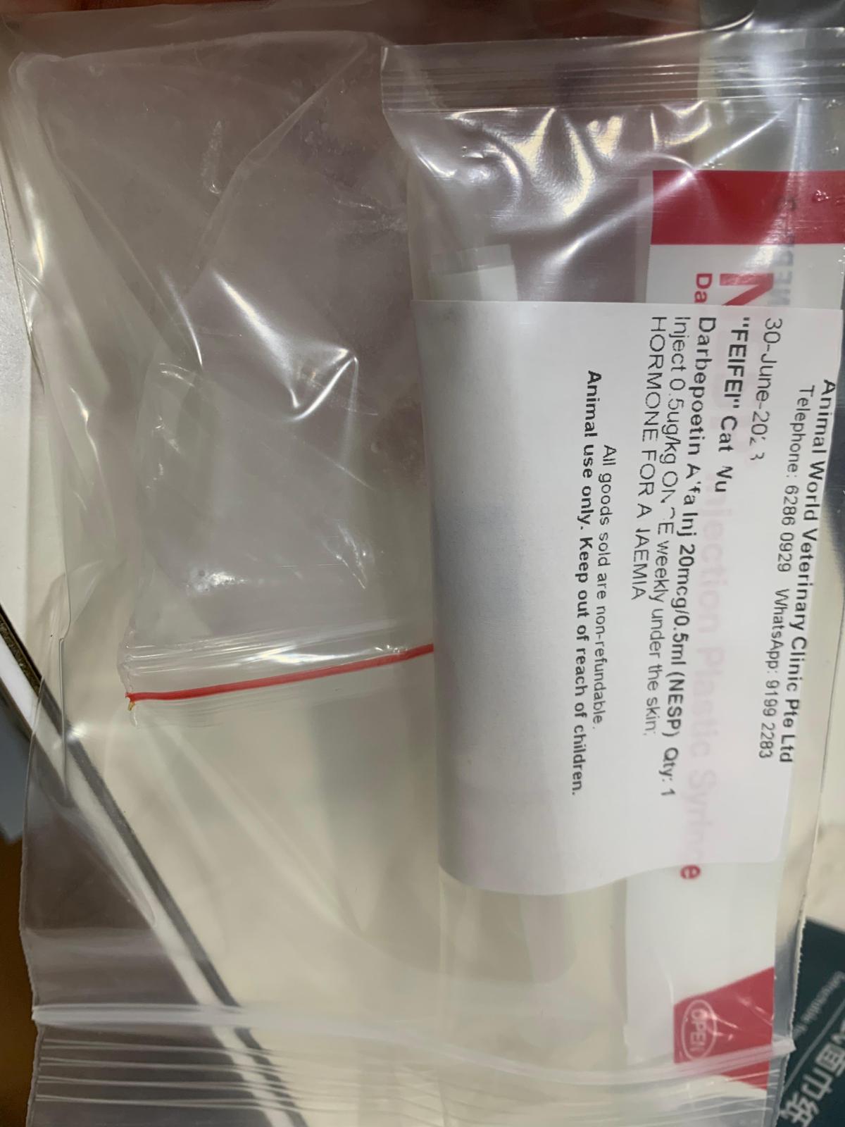 Argh so angry siak told dr Brandon fei needs 2 persons. He tried twice on his own n poke fei thrice just to get 0.5ml of blood. argh fei is a easy boy, just that I know he sure will move. Erm. Bloods generally improve. darbepoetin working have to continue. Bought a new tub 40ug.