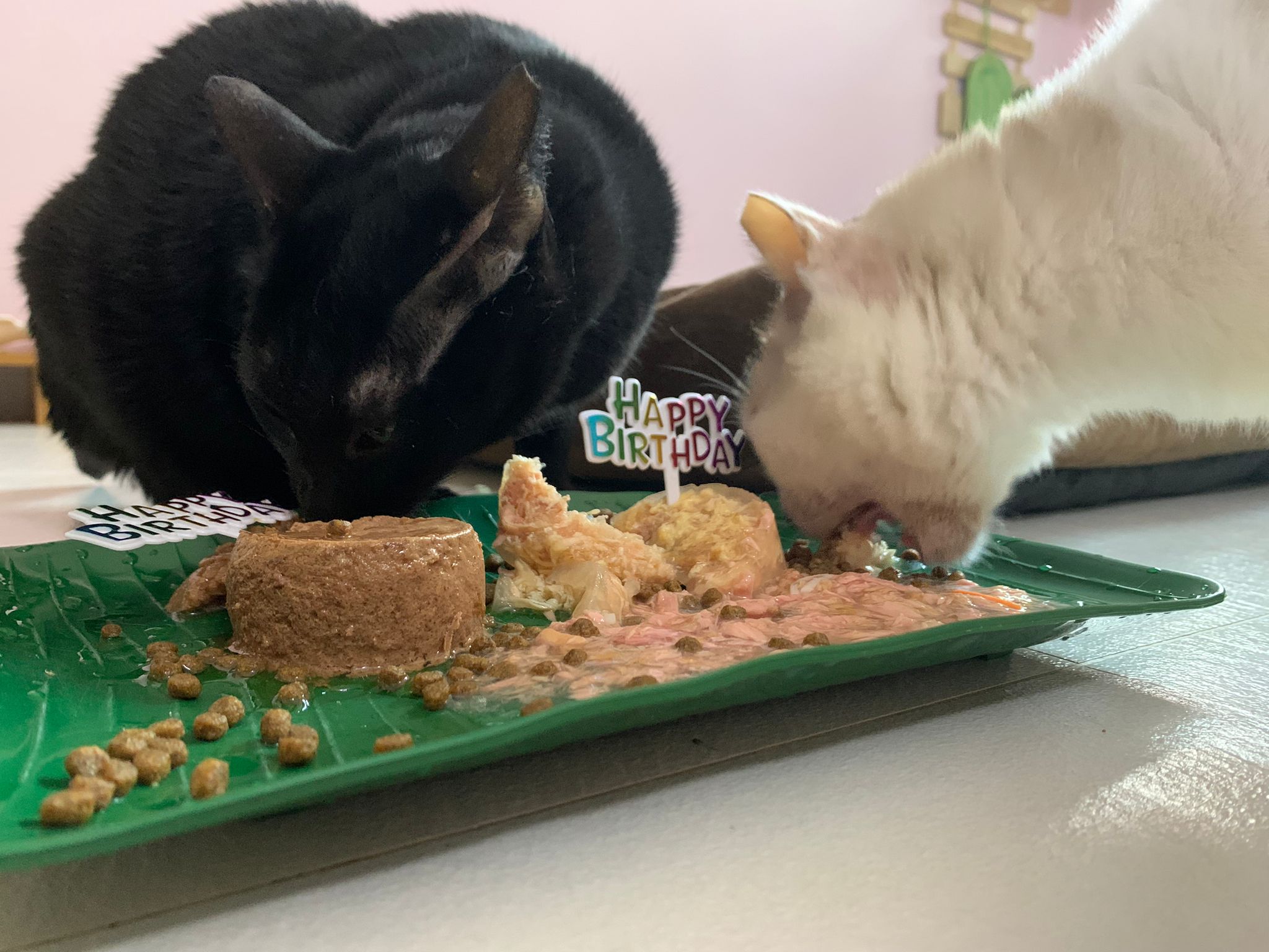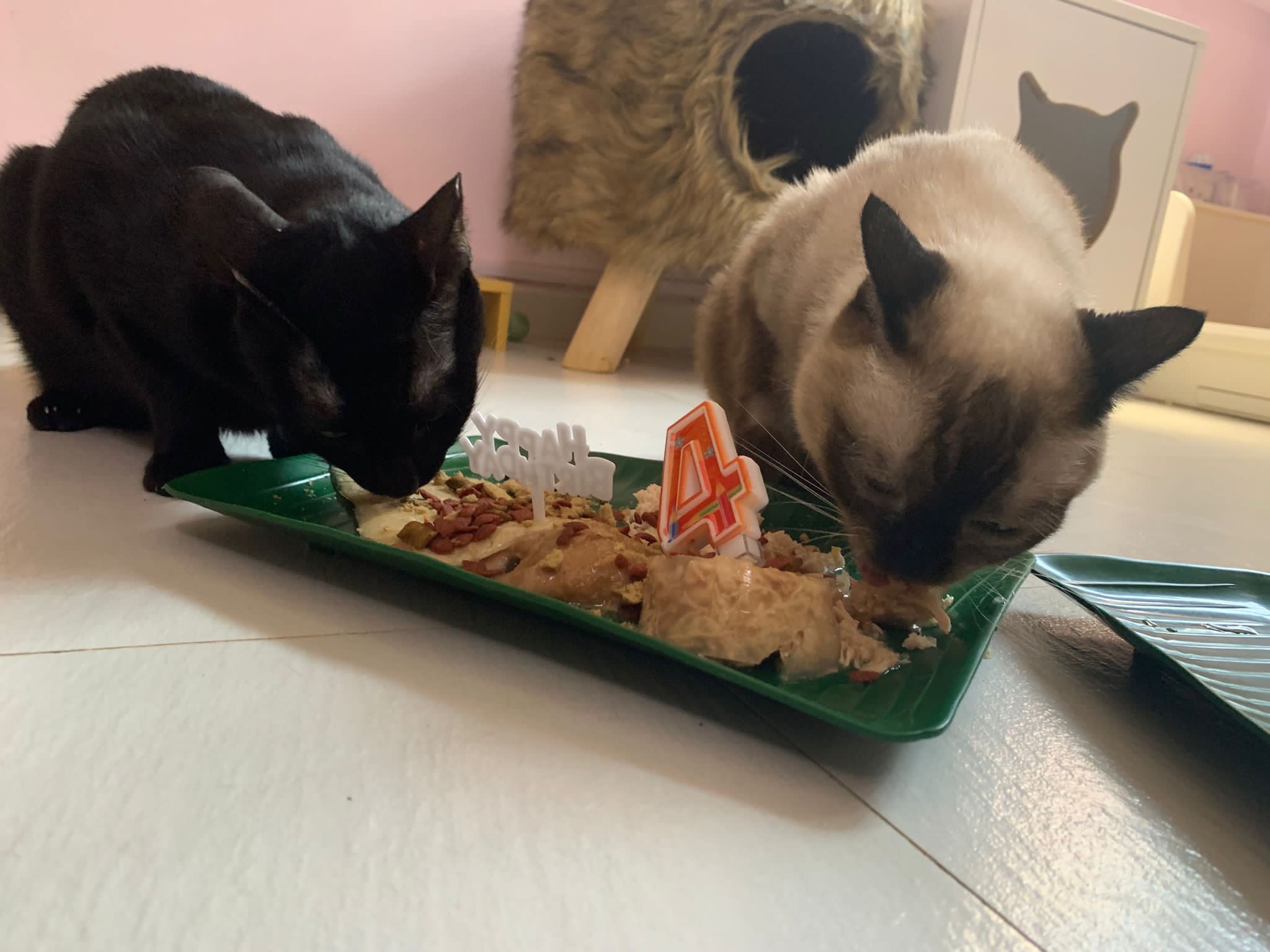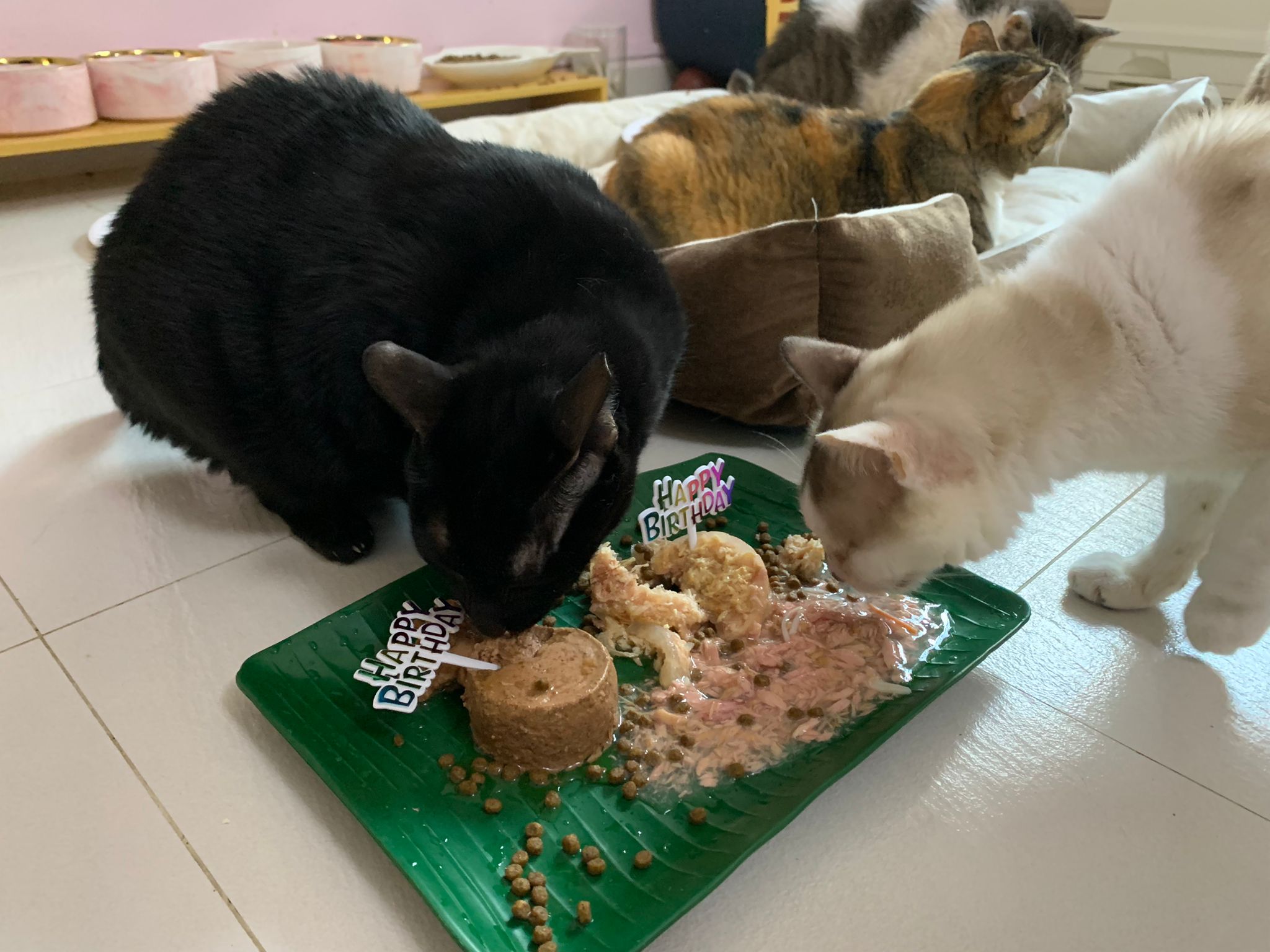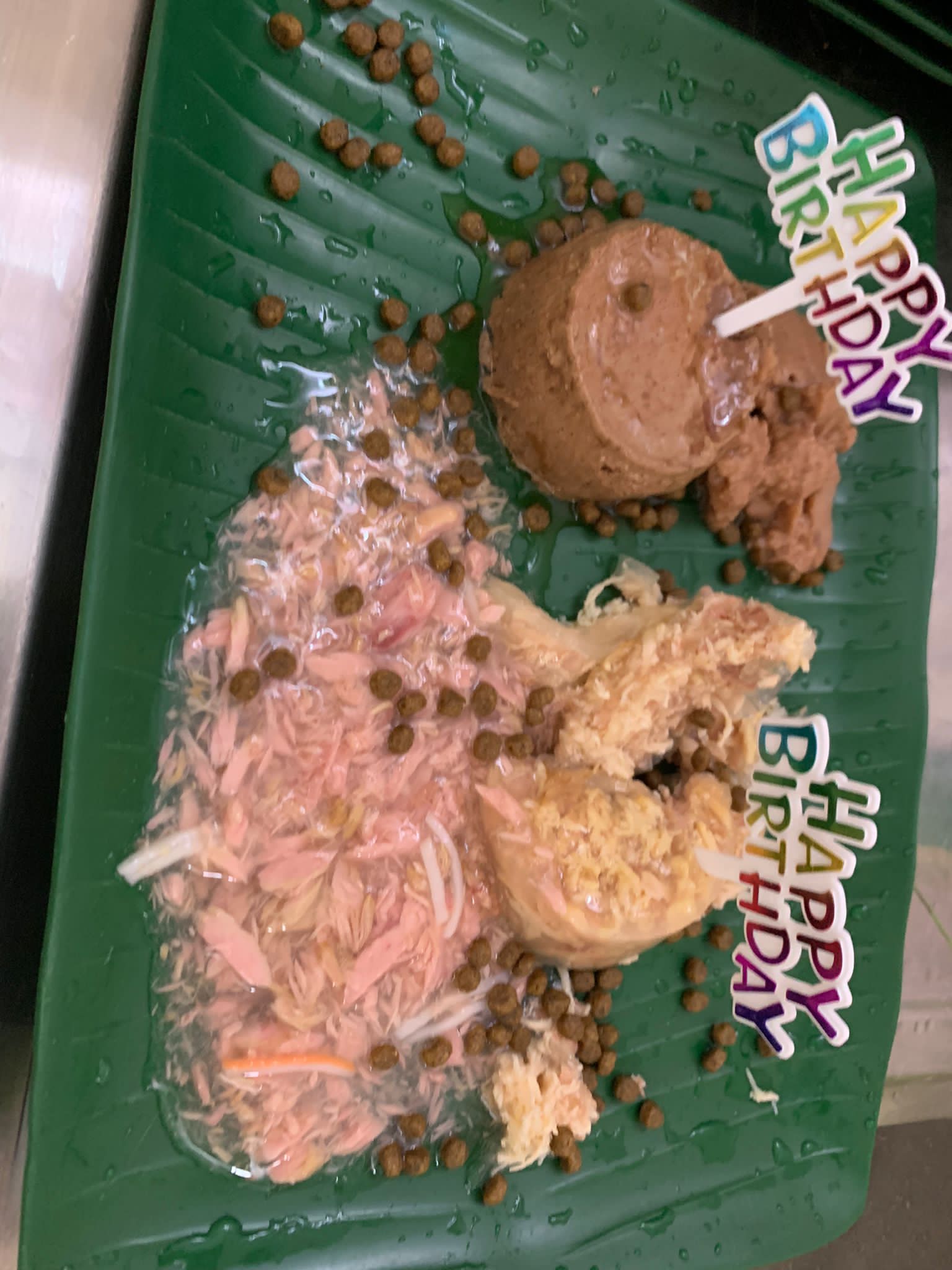 Morning: junior n Nala celebrate their 4th bday in 猫房. Got ciao chicken, sheba meow meow meow the eyes so big. Ha give her a bit from both the bday kids plates. She is happy.