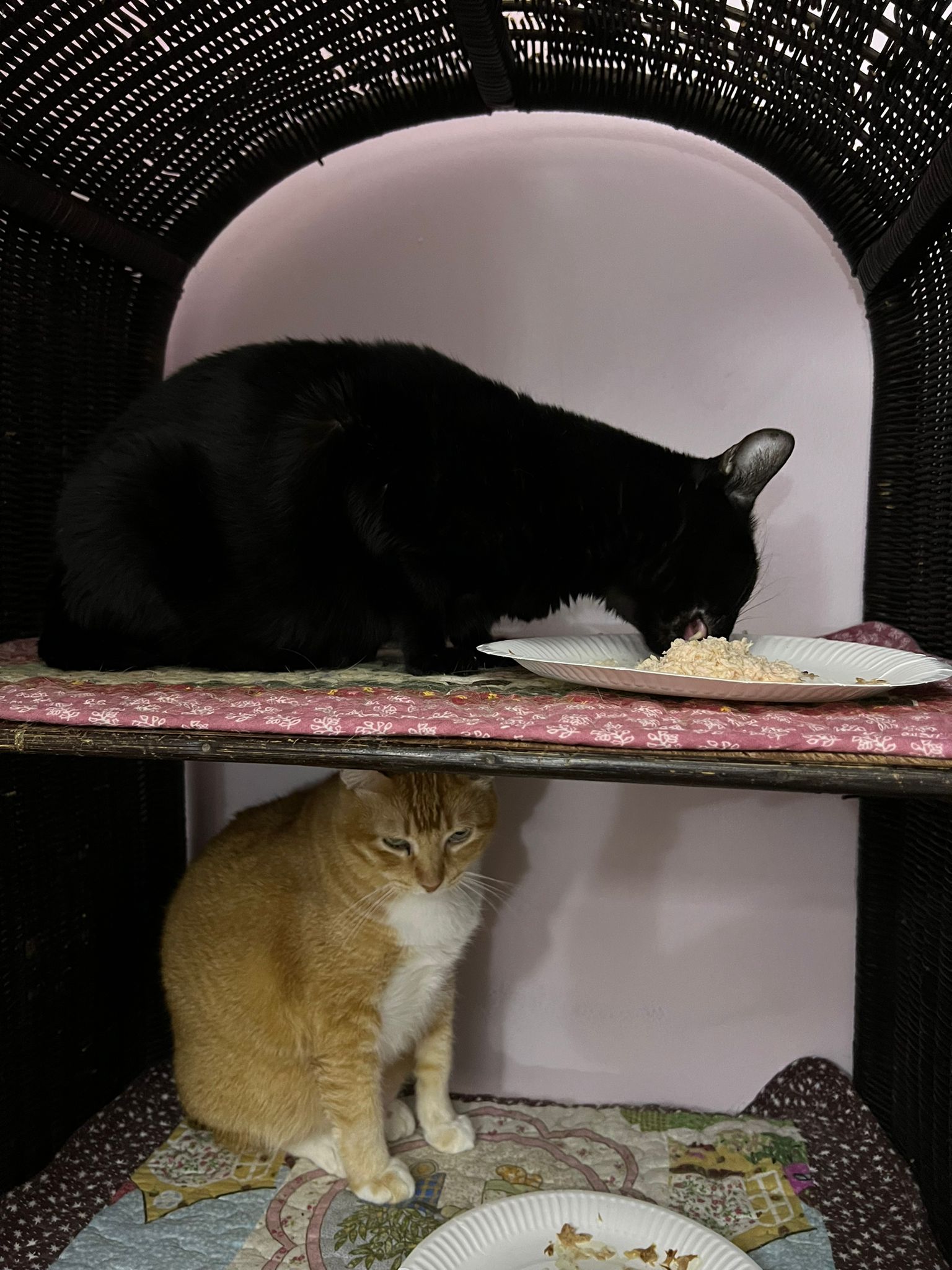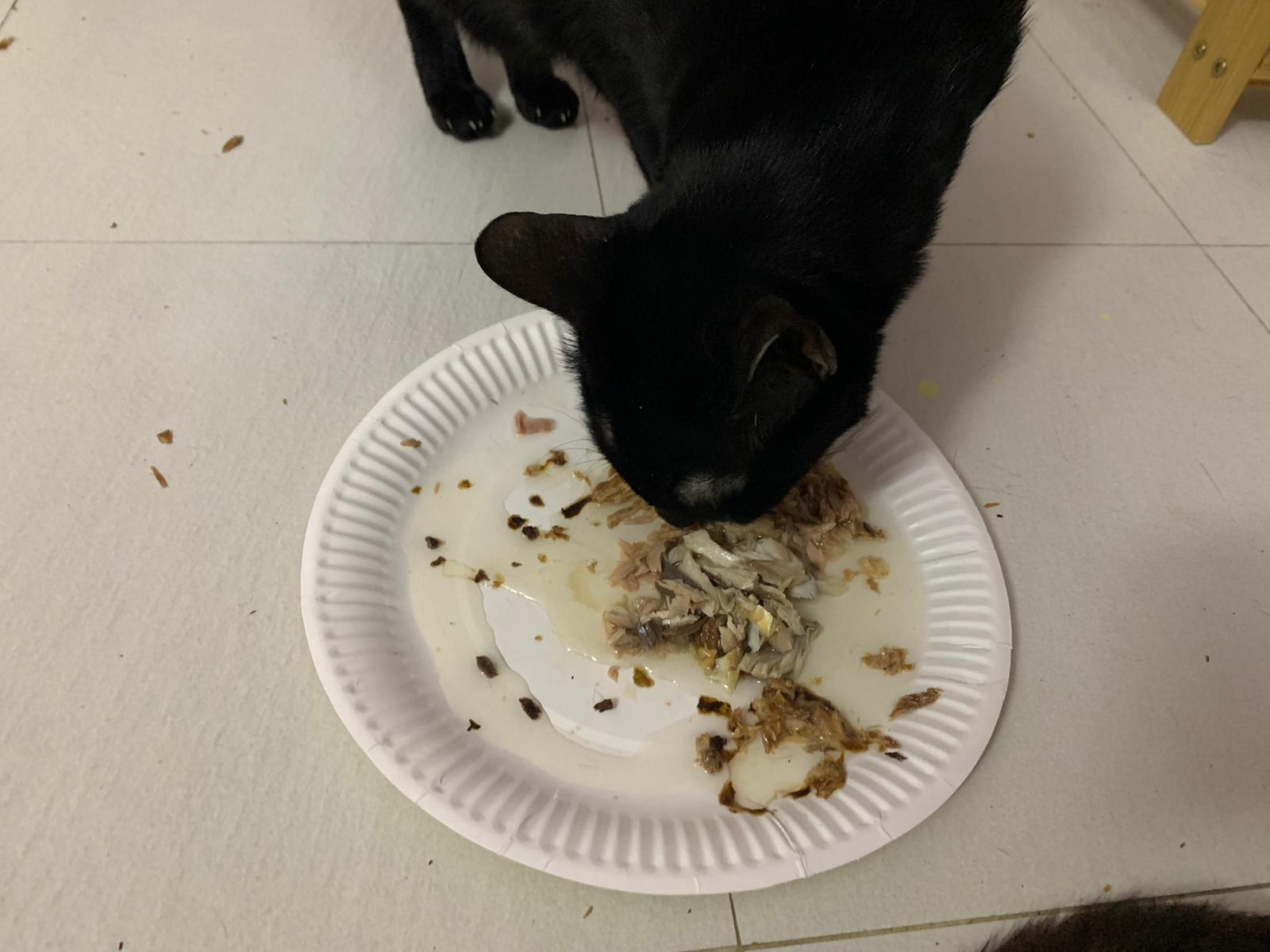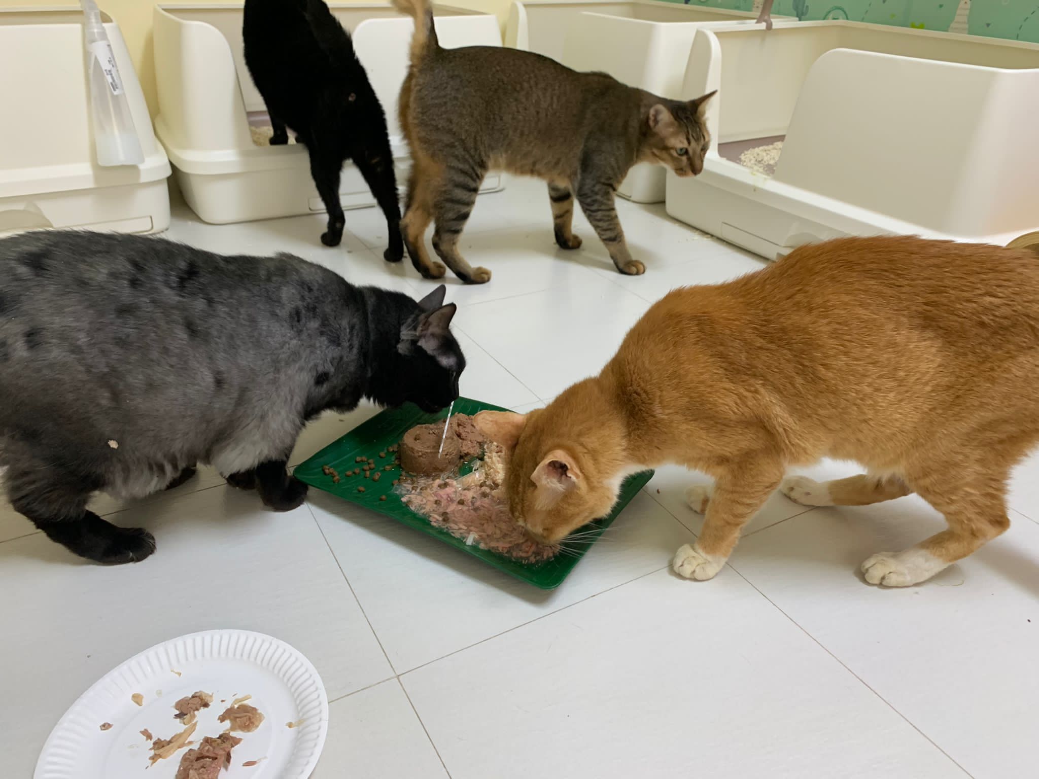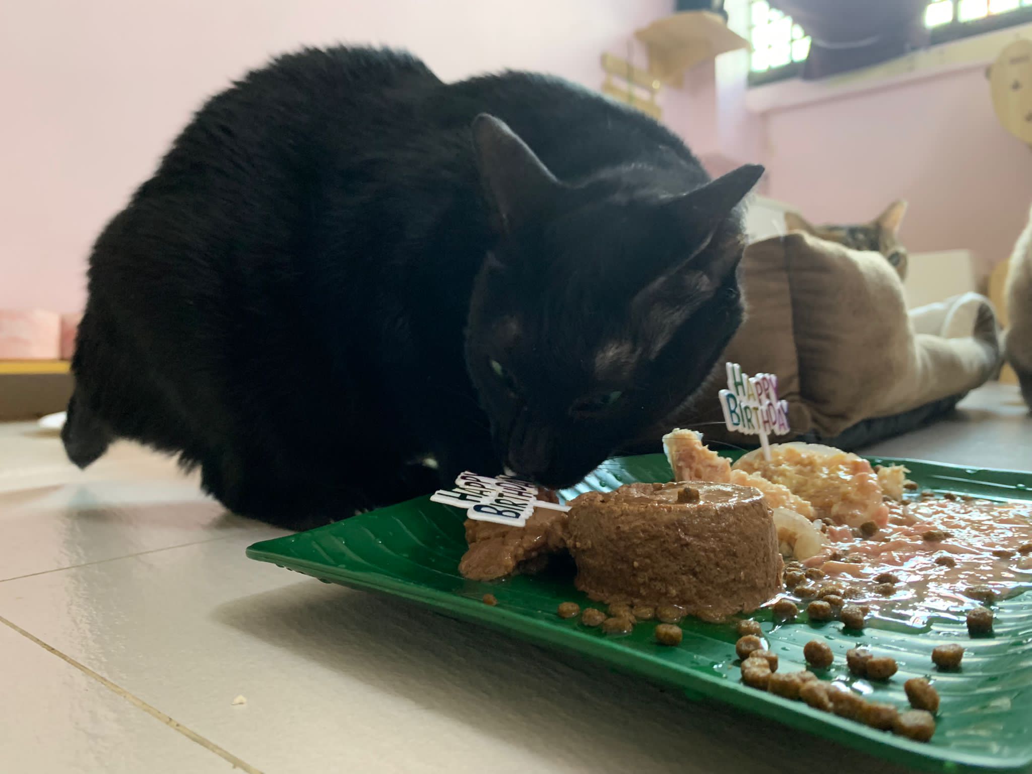 Morning: junior n Nala celebrate their 4th bday in 猫房. Got ciao chicken, sheba meow meow meow the eyes so big. Ha give her a bit from both the bday kids plates. She is happy.