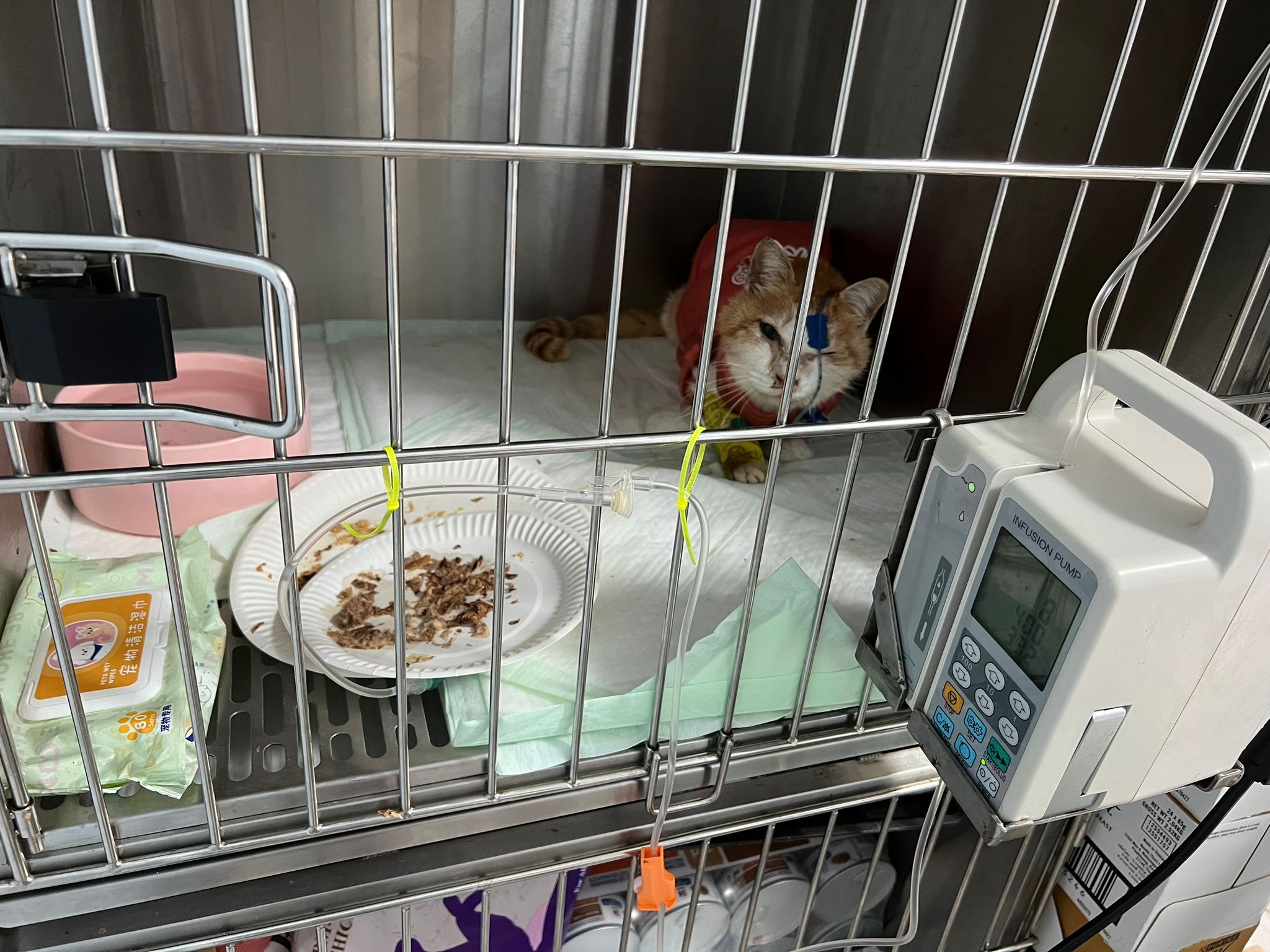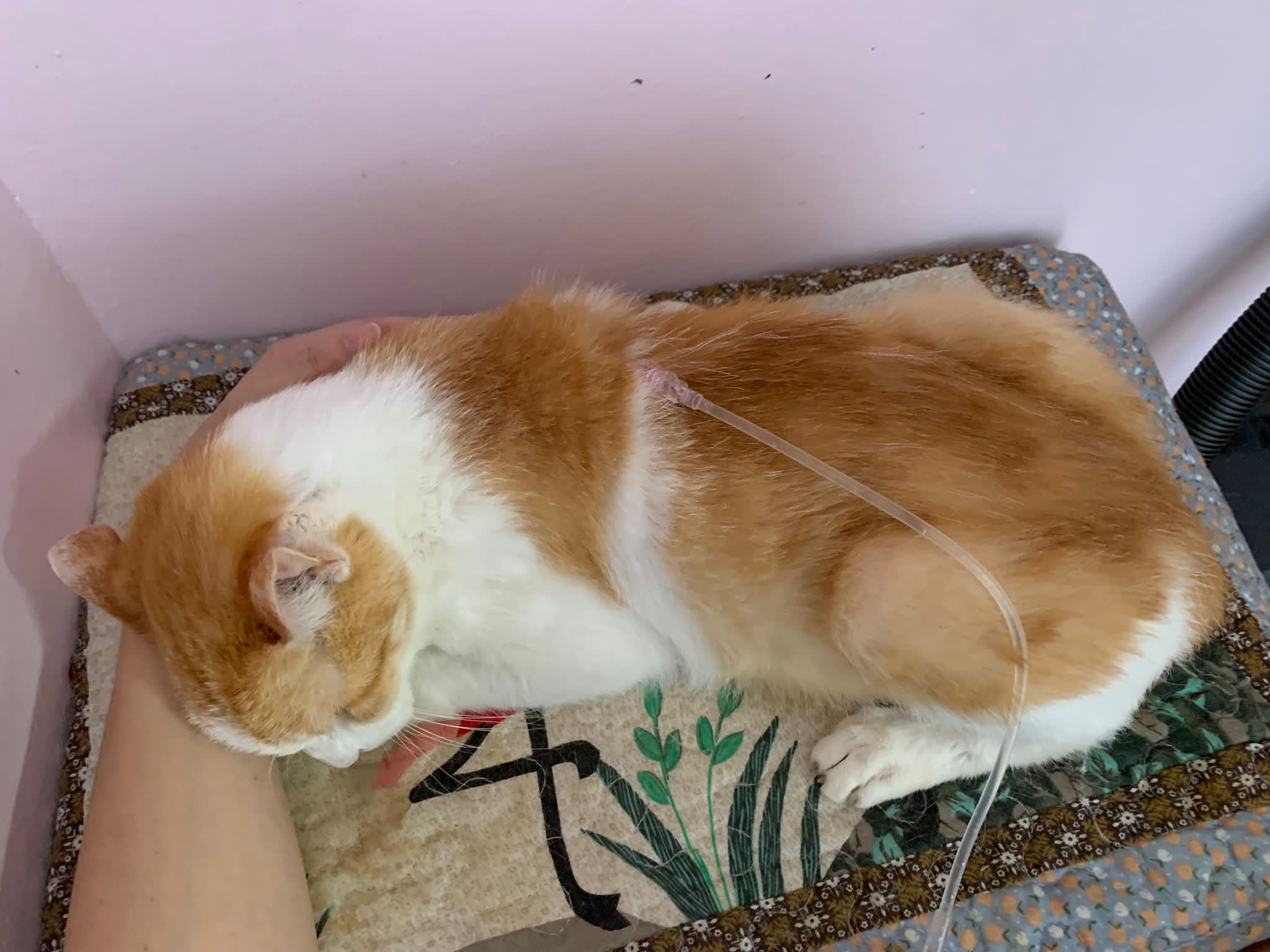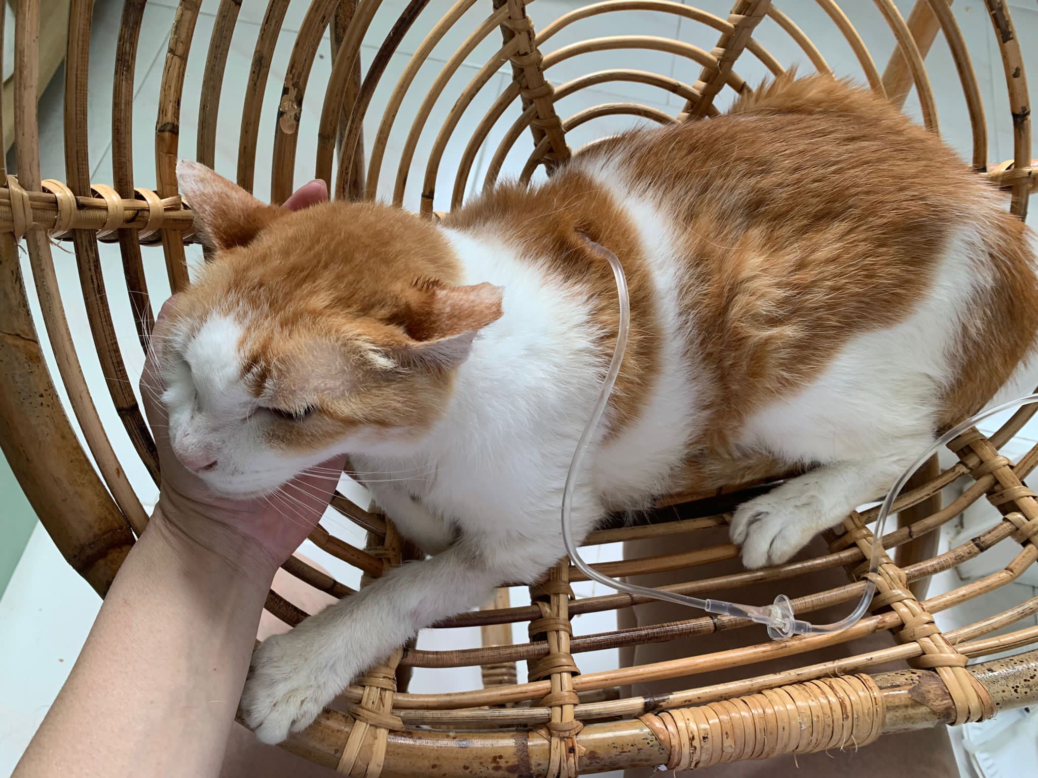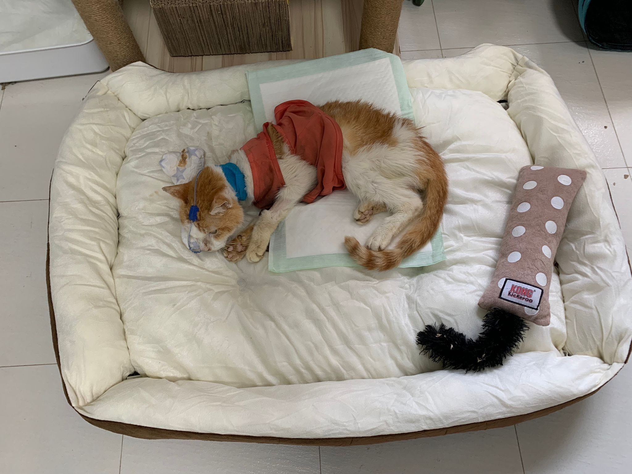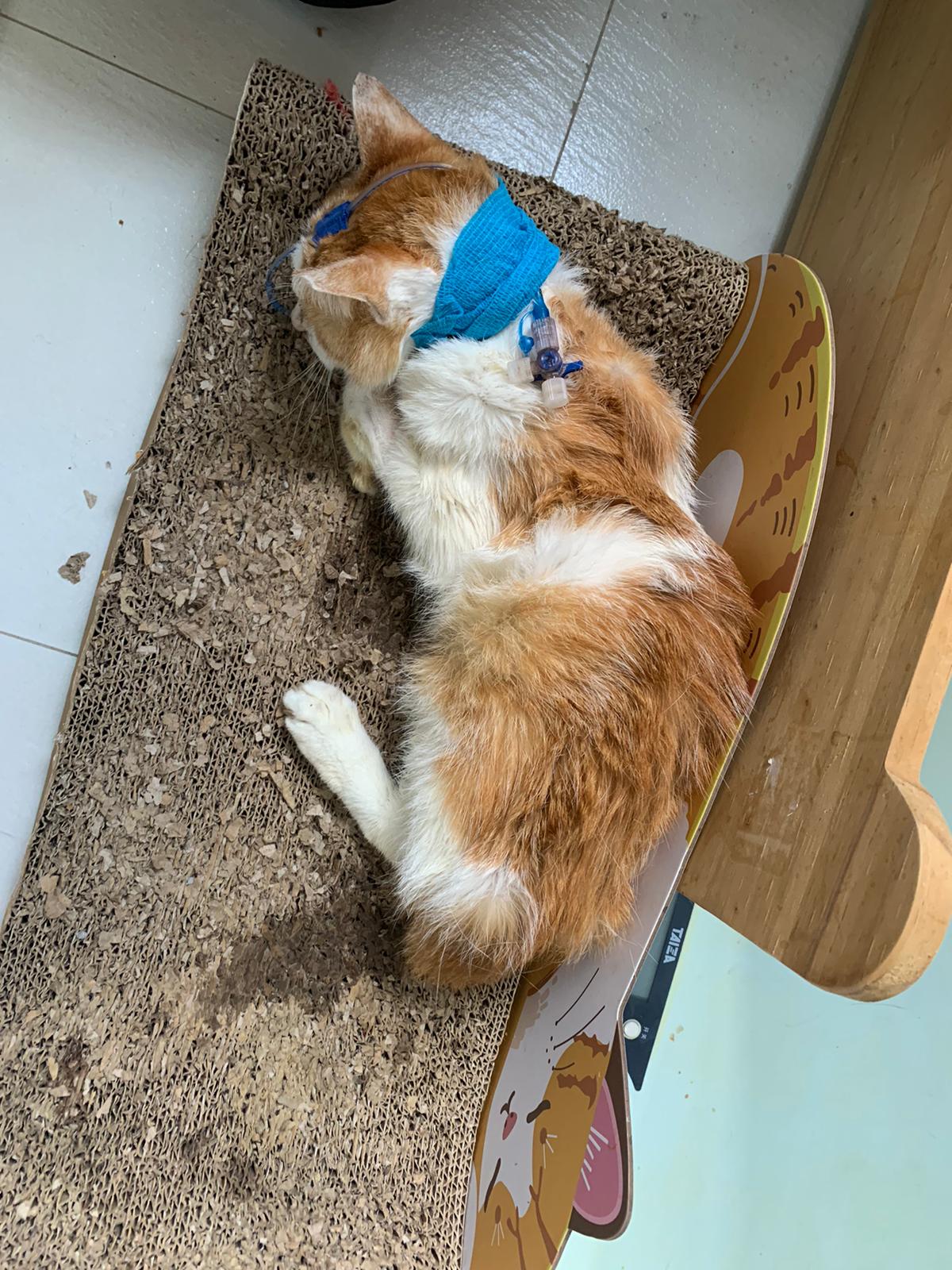 1pm: back to 猫房. He move back to room and I give him a big bed. Tube fed 40ml. Tube not v smooth alr. Subcut 100ml and given Clav n Cerenia. tmr then start Marbo and I have to check his darbepoetin jab day.