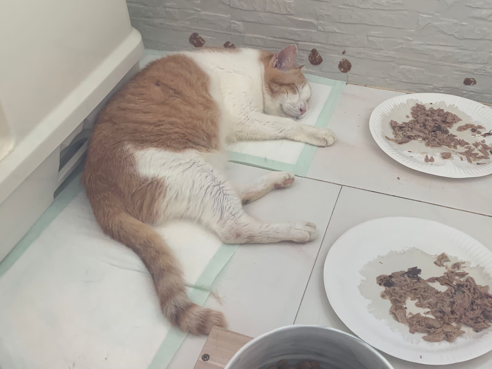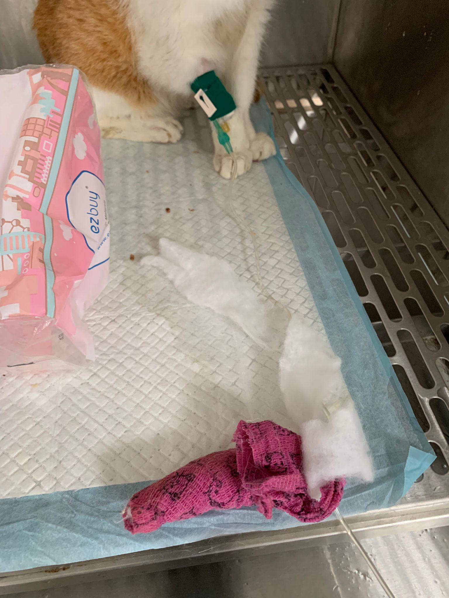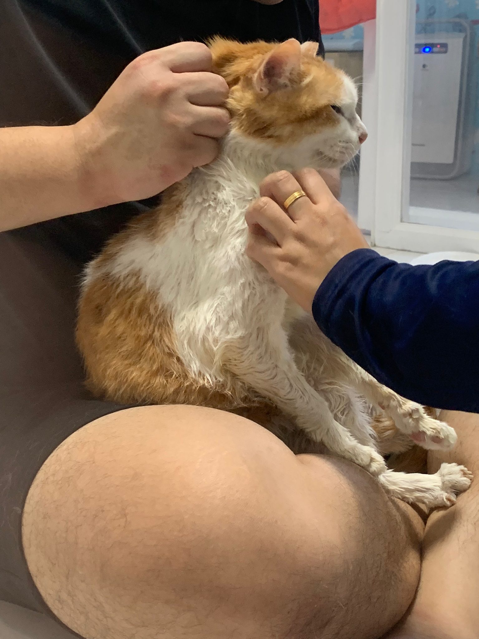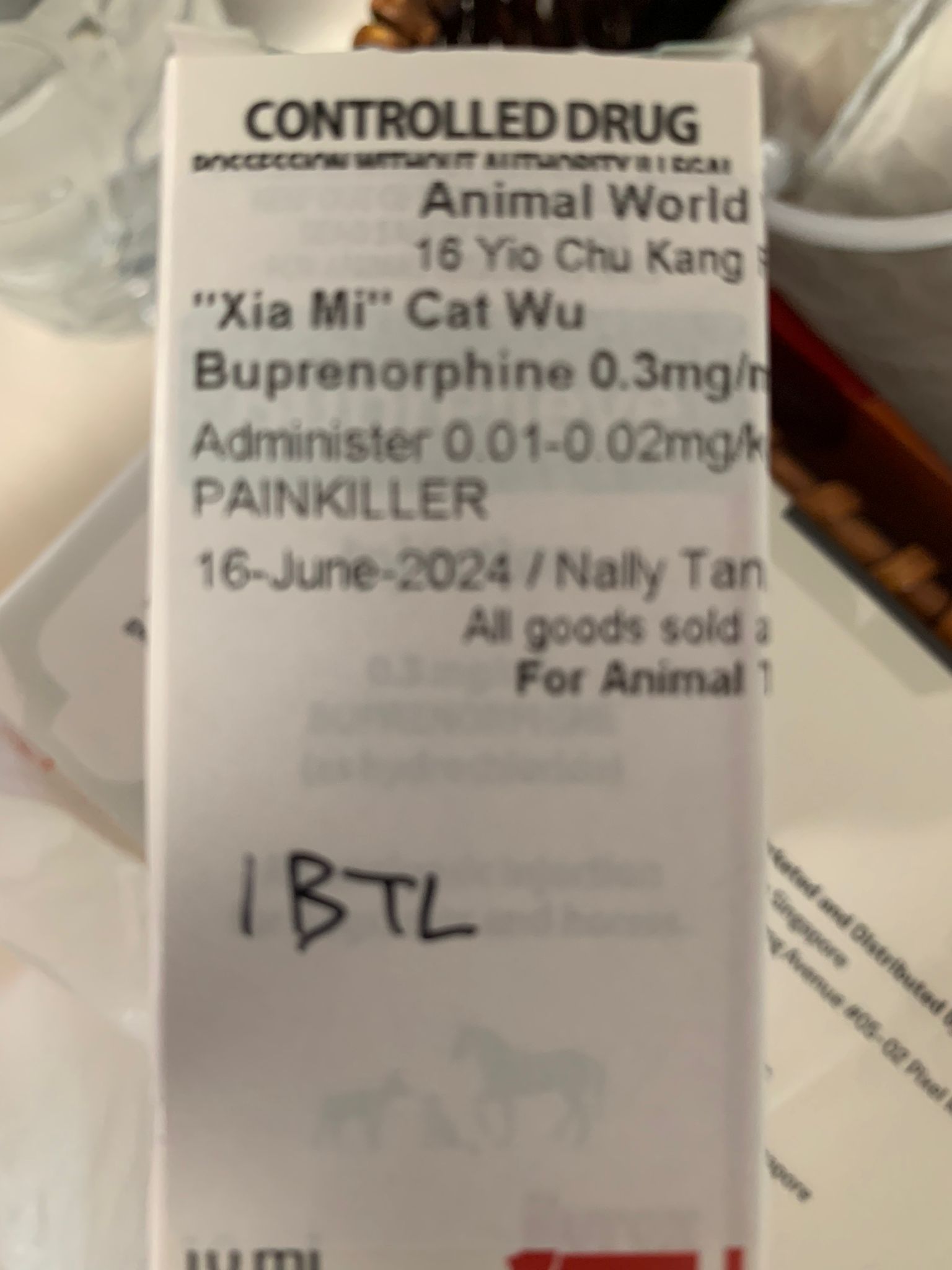 11am; given bupre. Got pee. no poo – but I found one piece 3cm 6.5/10 stuck in his butt, I help him take out. He is just too weak. No strength. later go back then i Subcut him n give Cerenia. Tube fed 40ml kd. Can feel that he feel nausea so I didn’t push. Later we back from seeing dr Brandon then I tube feed more.