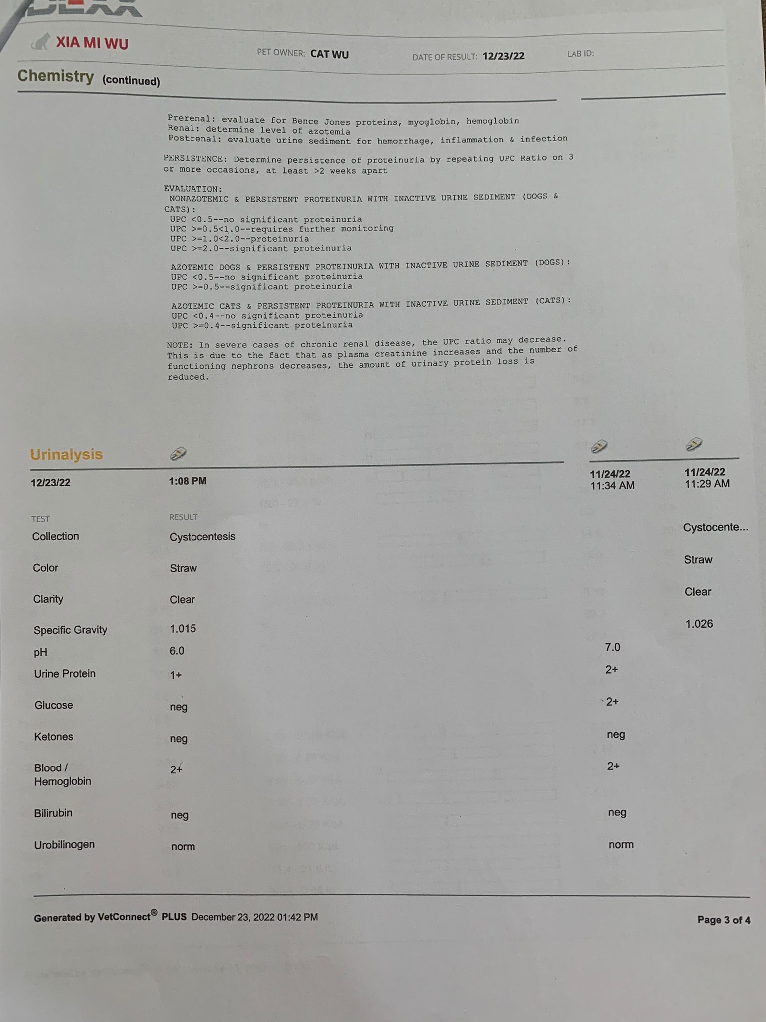 urine protein1+, Sg 1.017, blood 2+ UPC 0.83