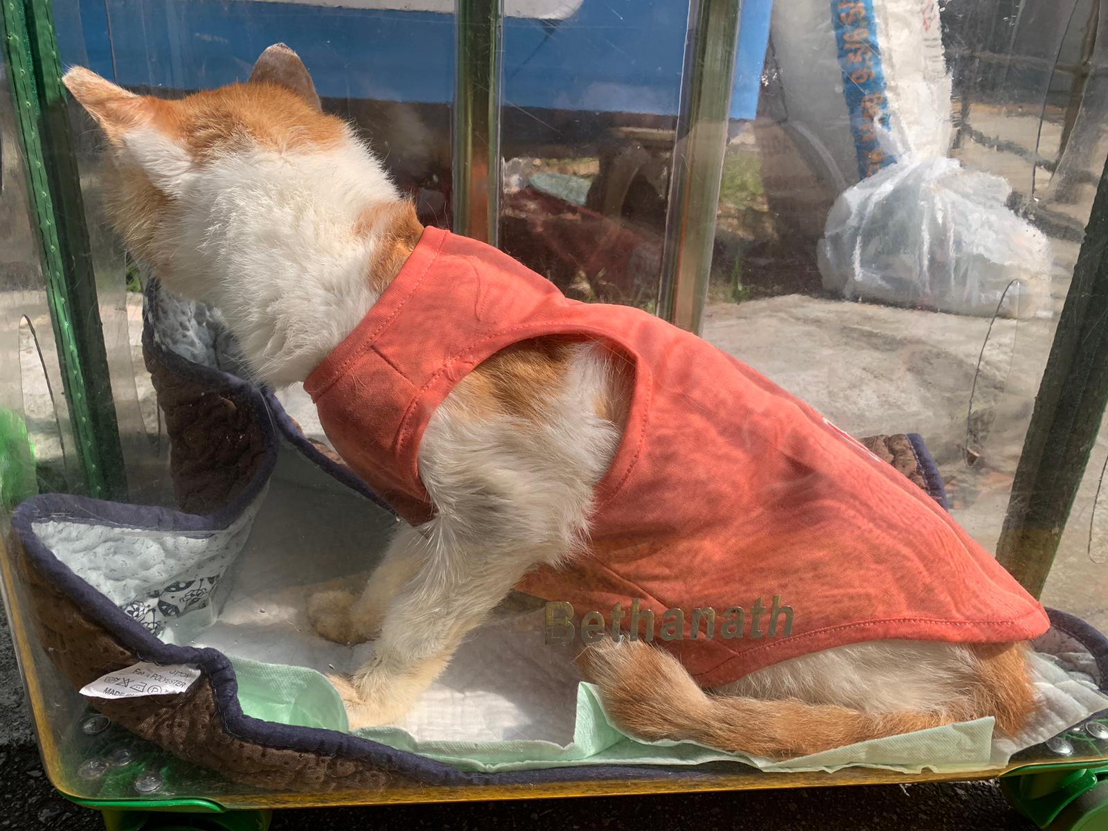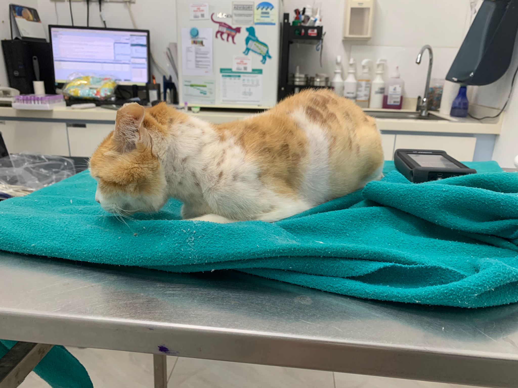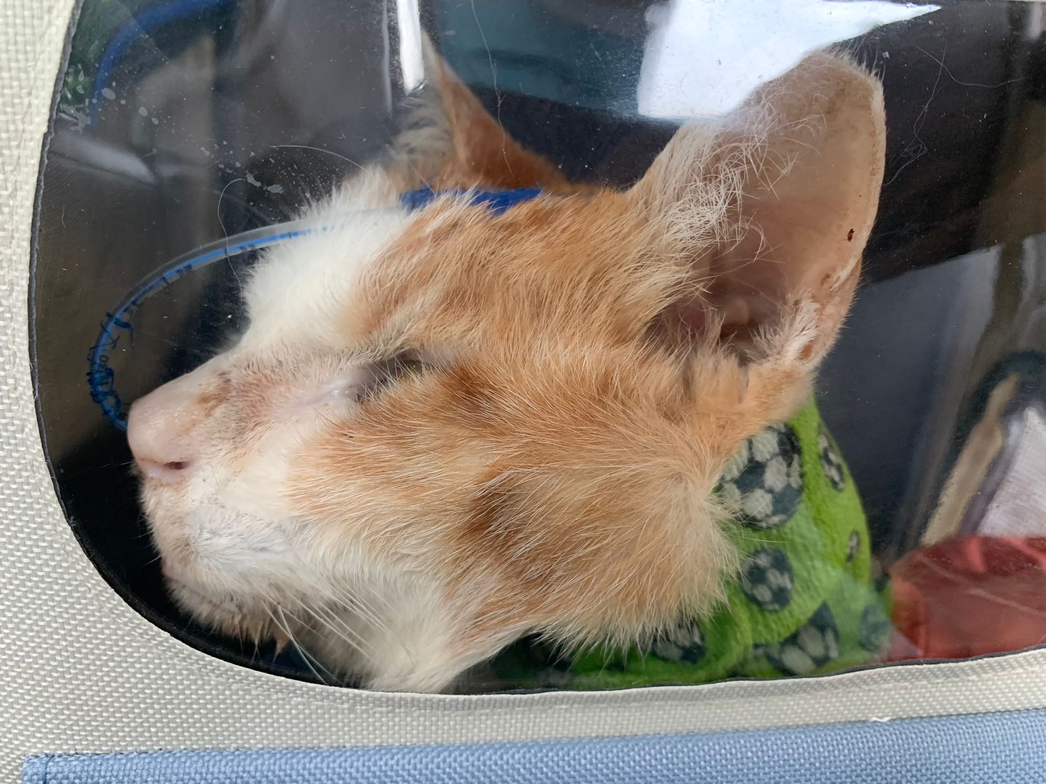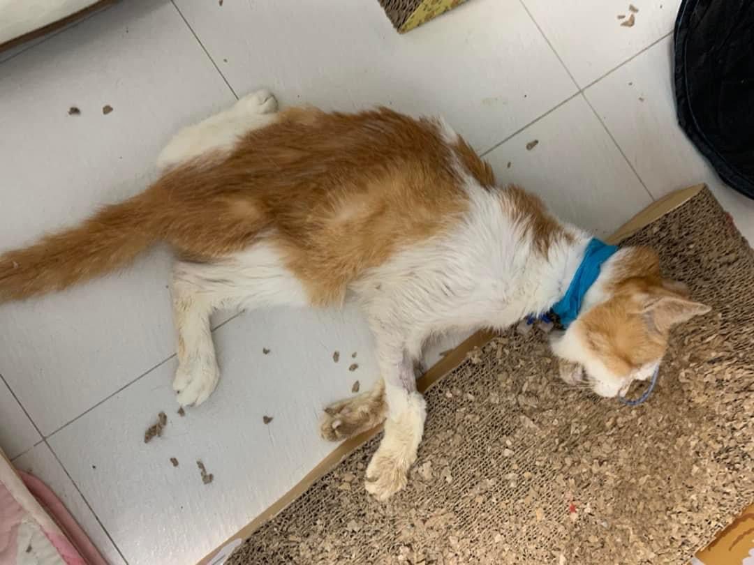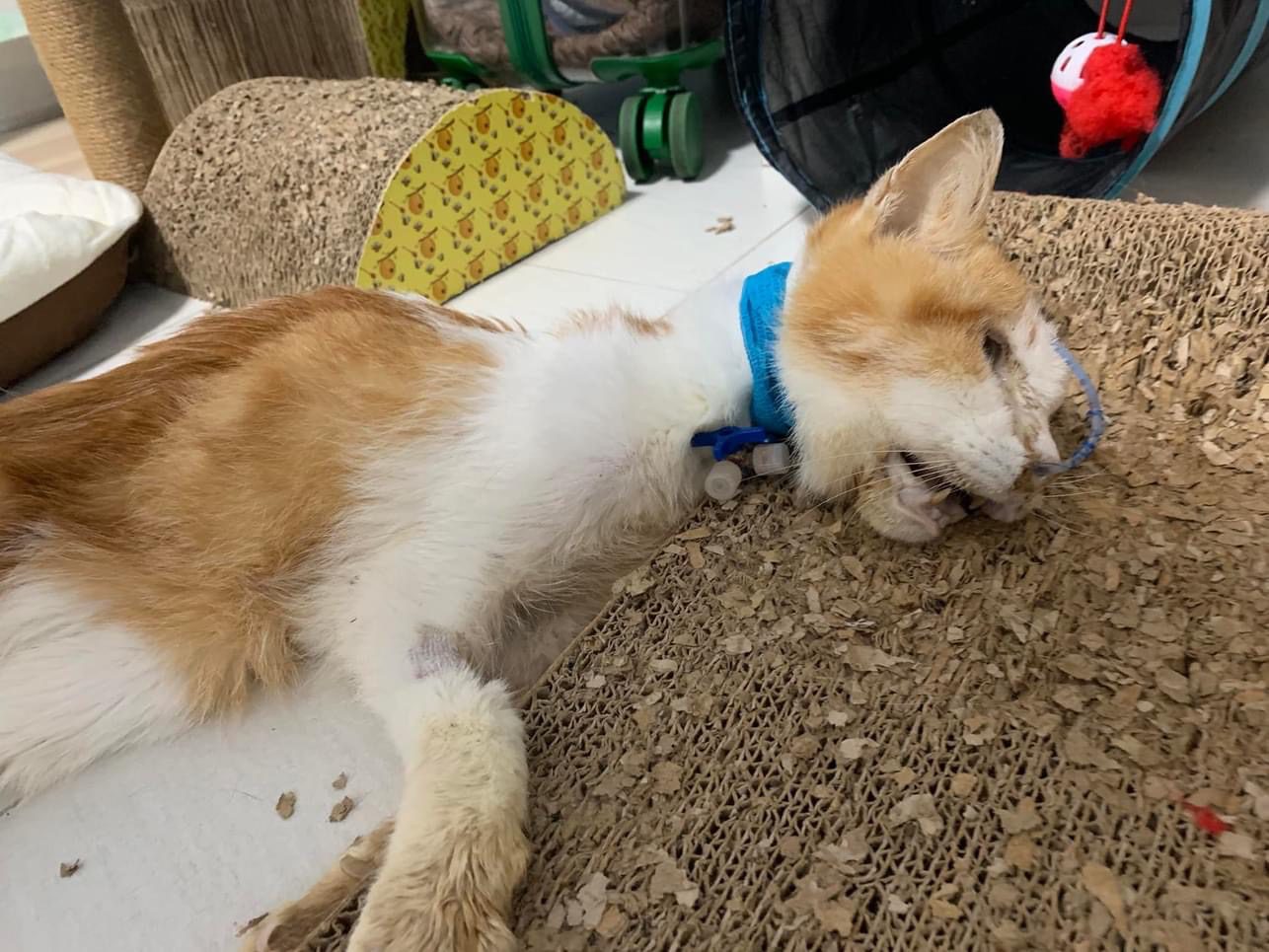 Almost 1pm then get into felv room, tube fed him 80ml Kd. Today given darbepoetin 0.1ml 20ug, ie 4ug for his 2.53kg weight. That’s 1.5 times the usual dose. Started Marbo too. 2mg/kg. Clav still continue. He can still move but choose to stay on the sofa. I took off his t shirt. Let him rest.