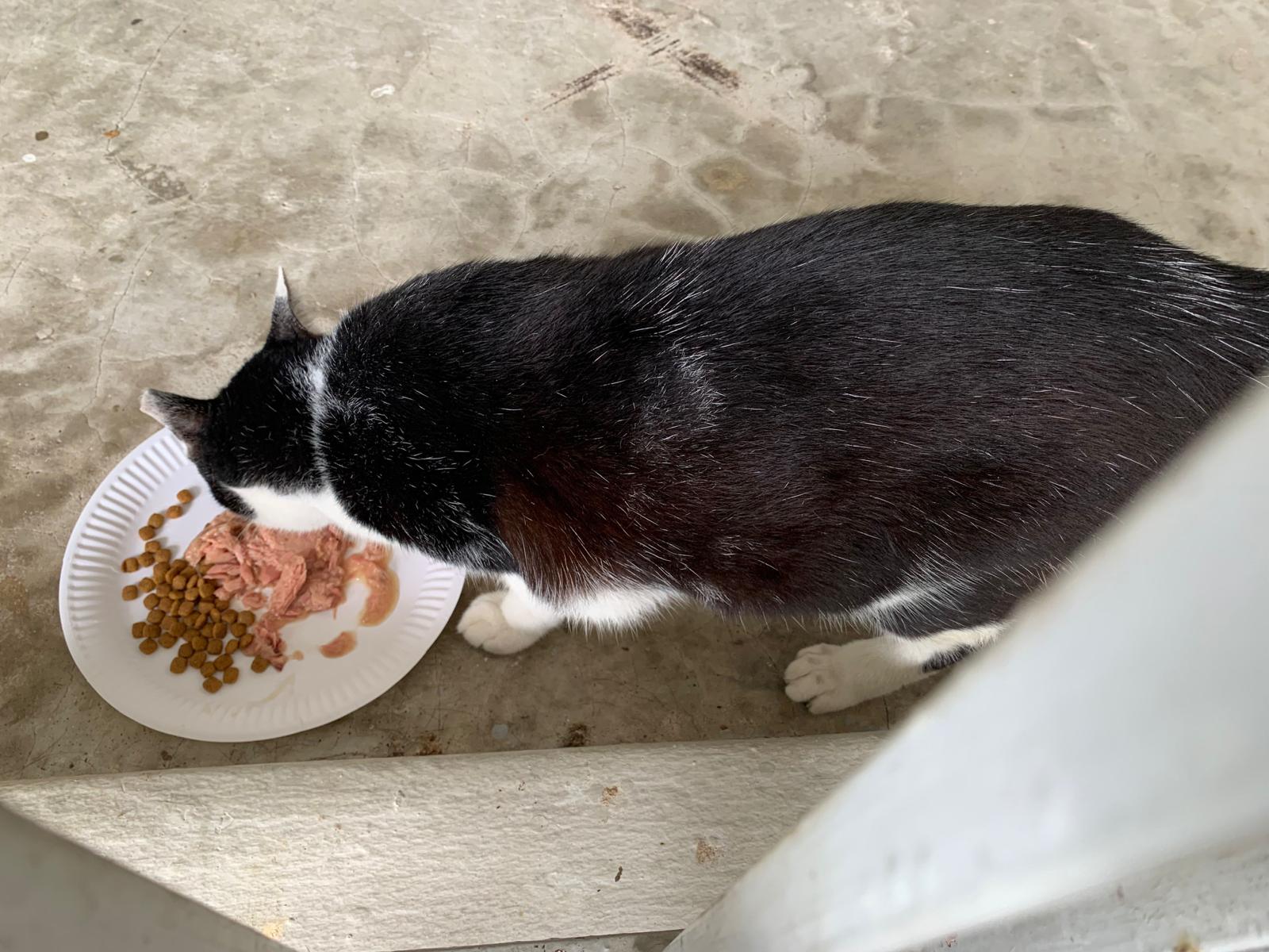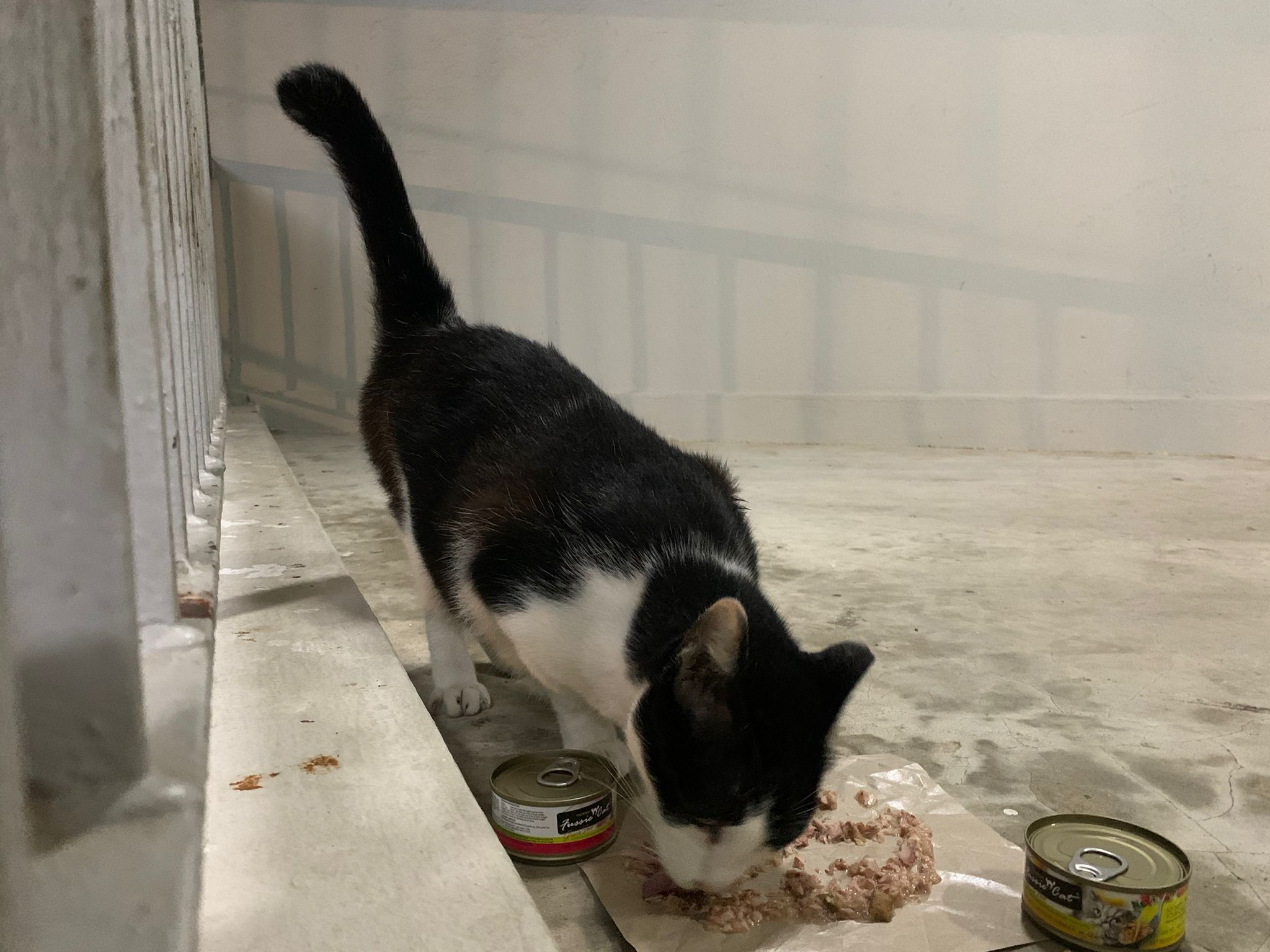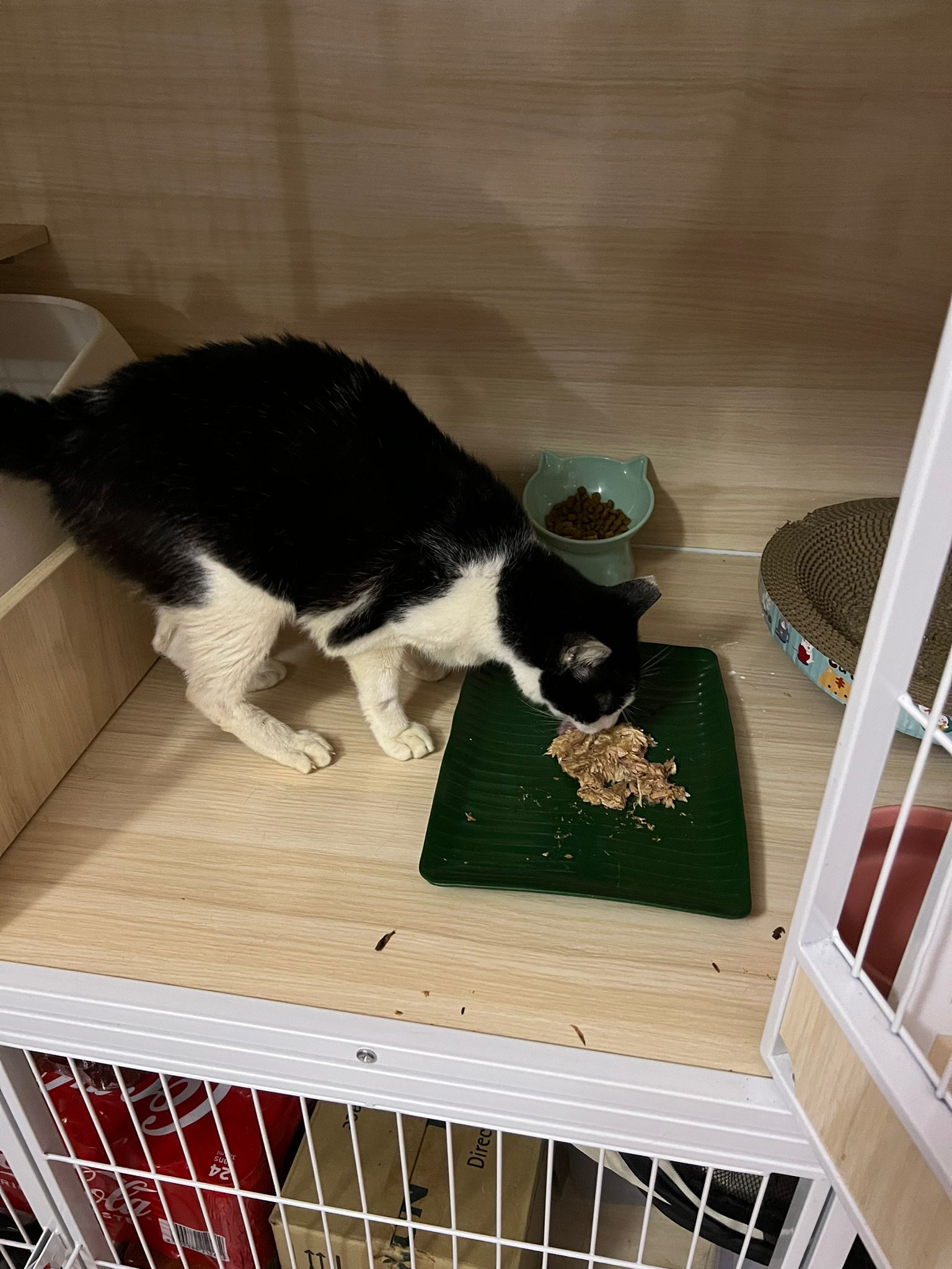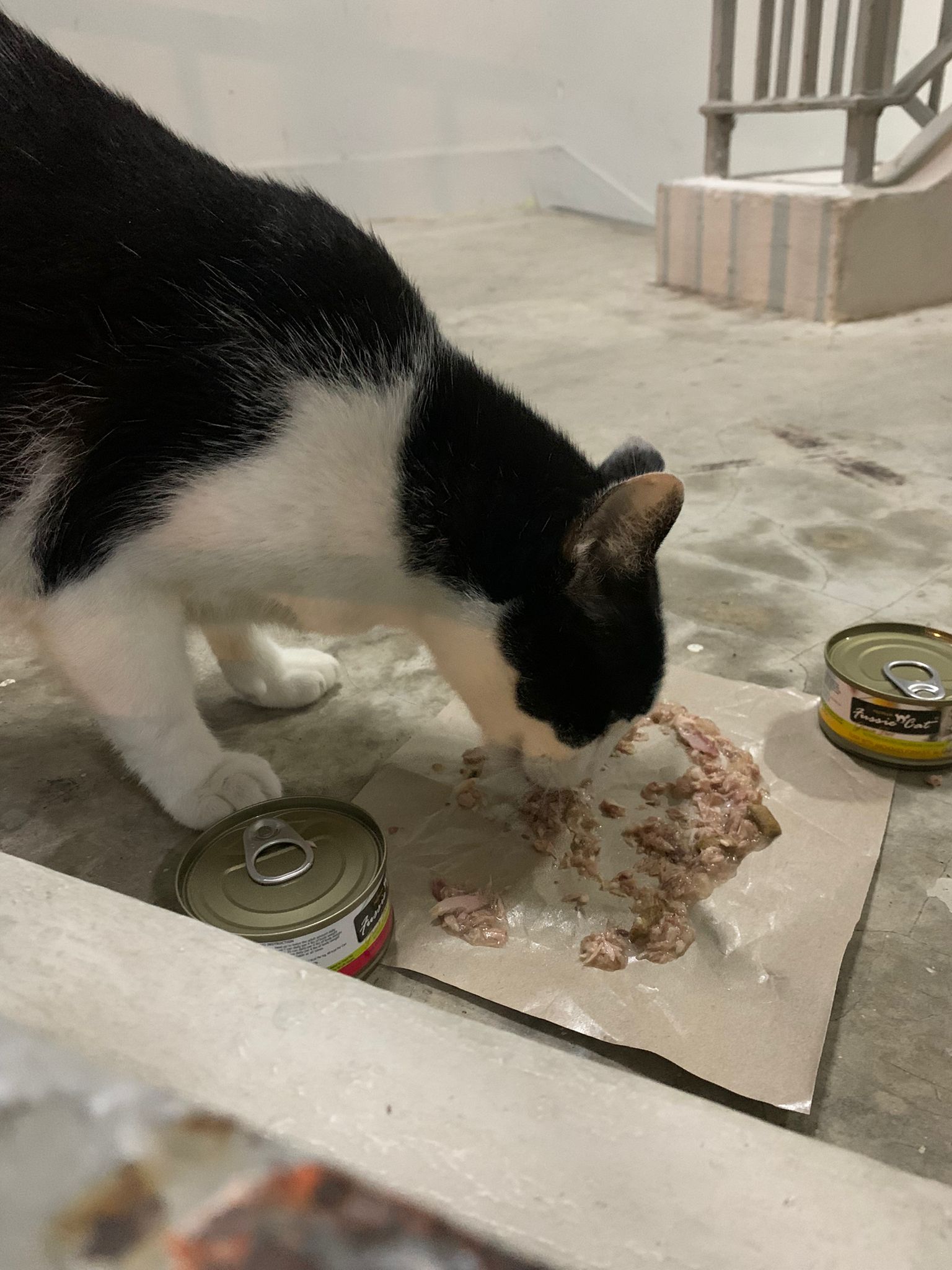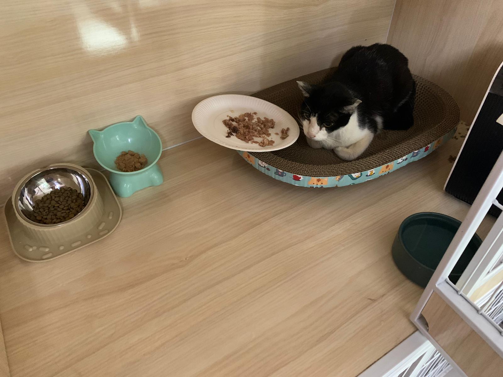 Noon: I packing house and xl wants me sayang. He quite close to me I serve him tuna w chicken ham and urinary kibble and left it at 1.5 floor for him to continue eating.