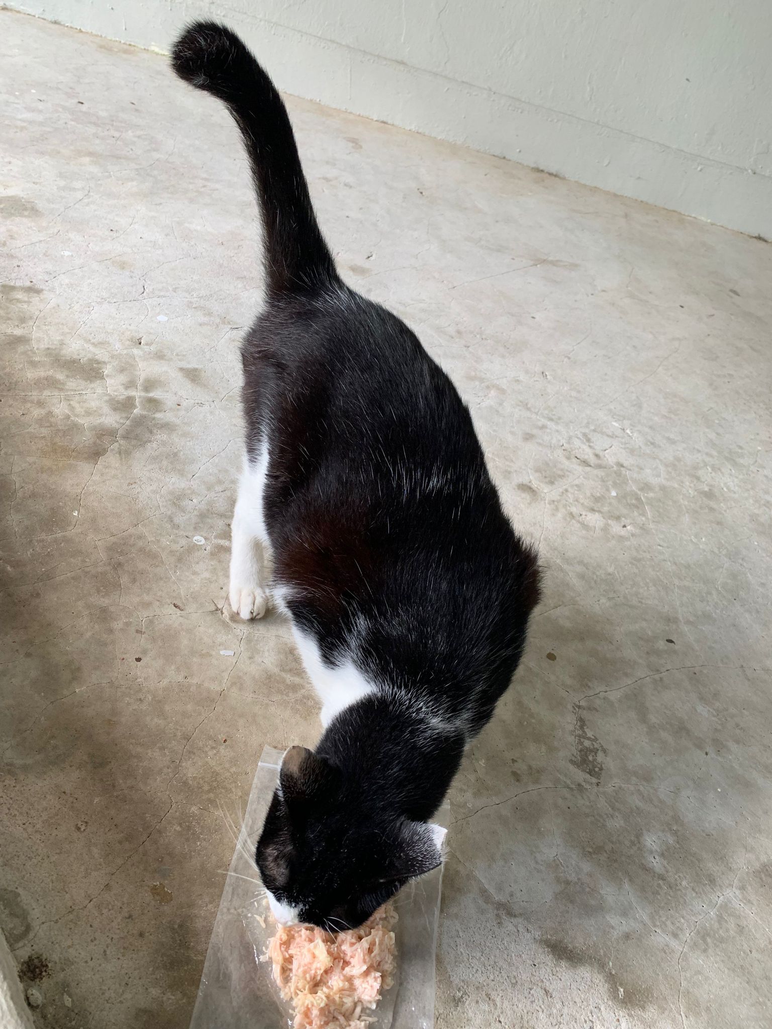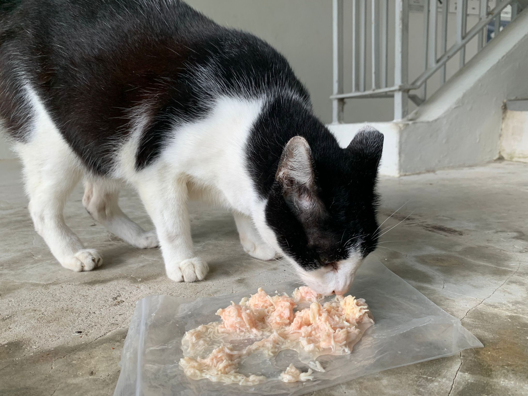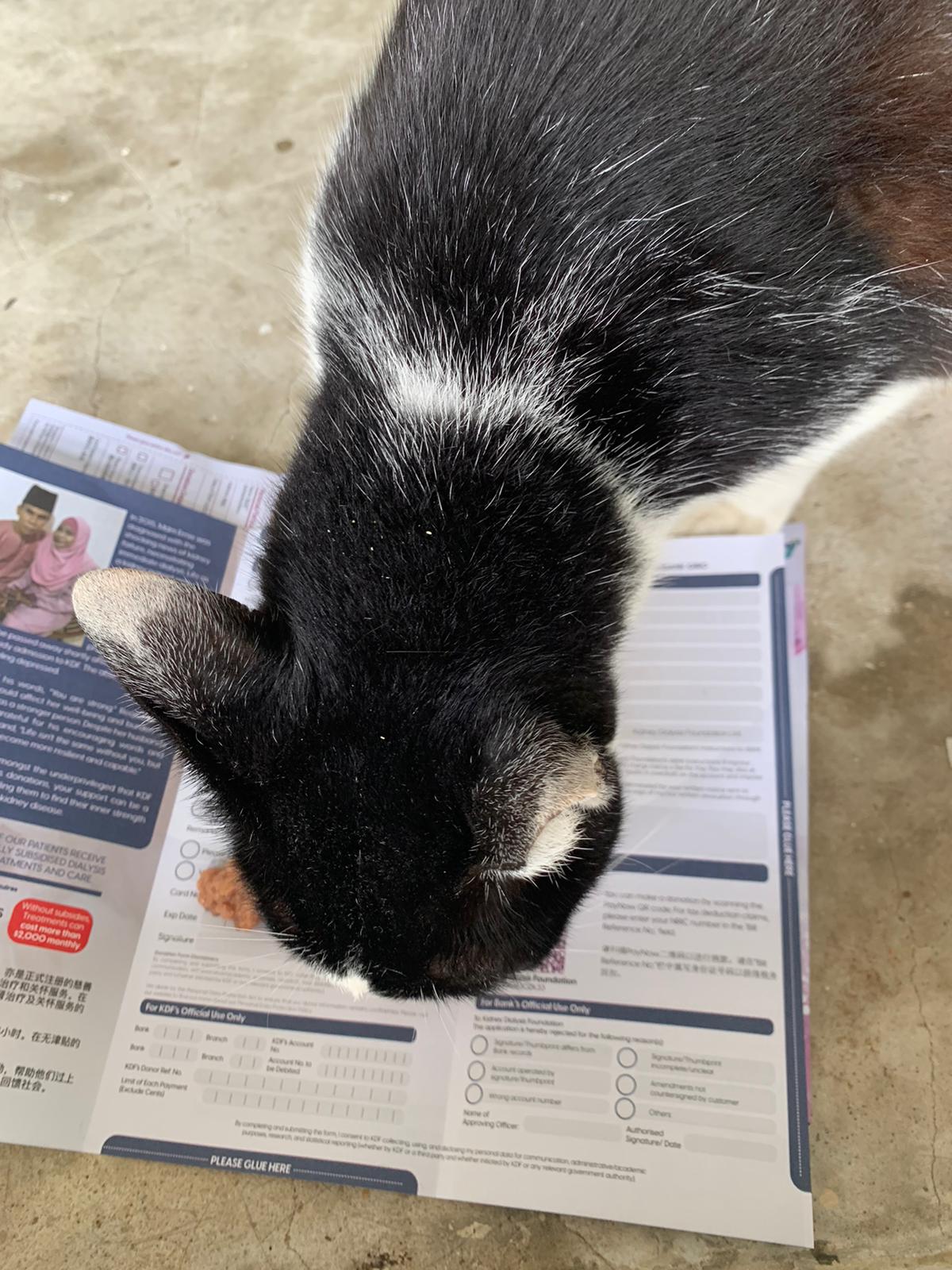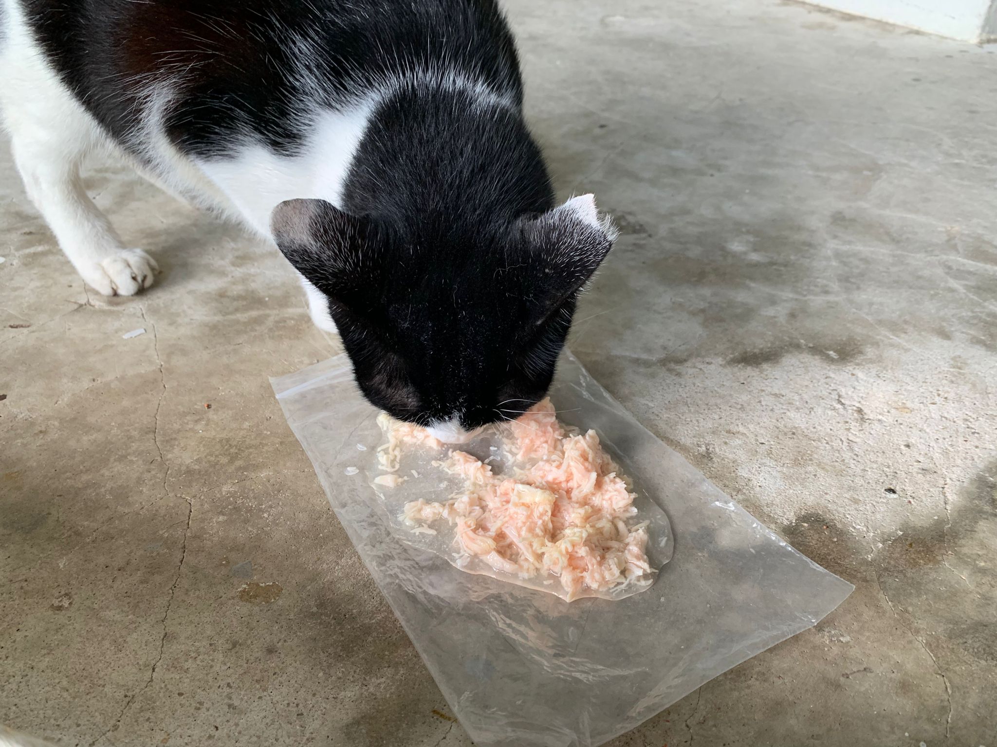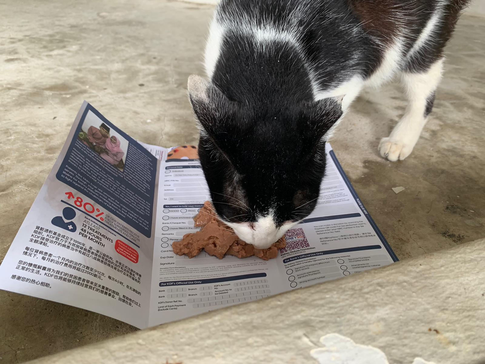 1240pm: saw xiao lian and he come to me, I ask him want food? Meow meow meow, haha I use my ziplock bag to serve food for him I can’t find papers. Given chicken w prawn un gravy – he got eat but 10% n he is urgent go pee so I got to throw alr n I got to go home.