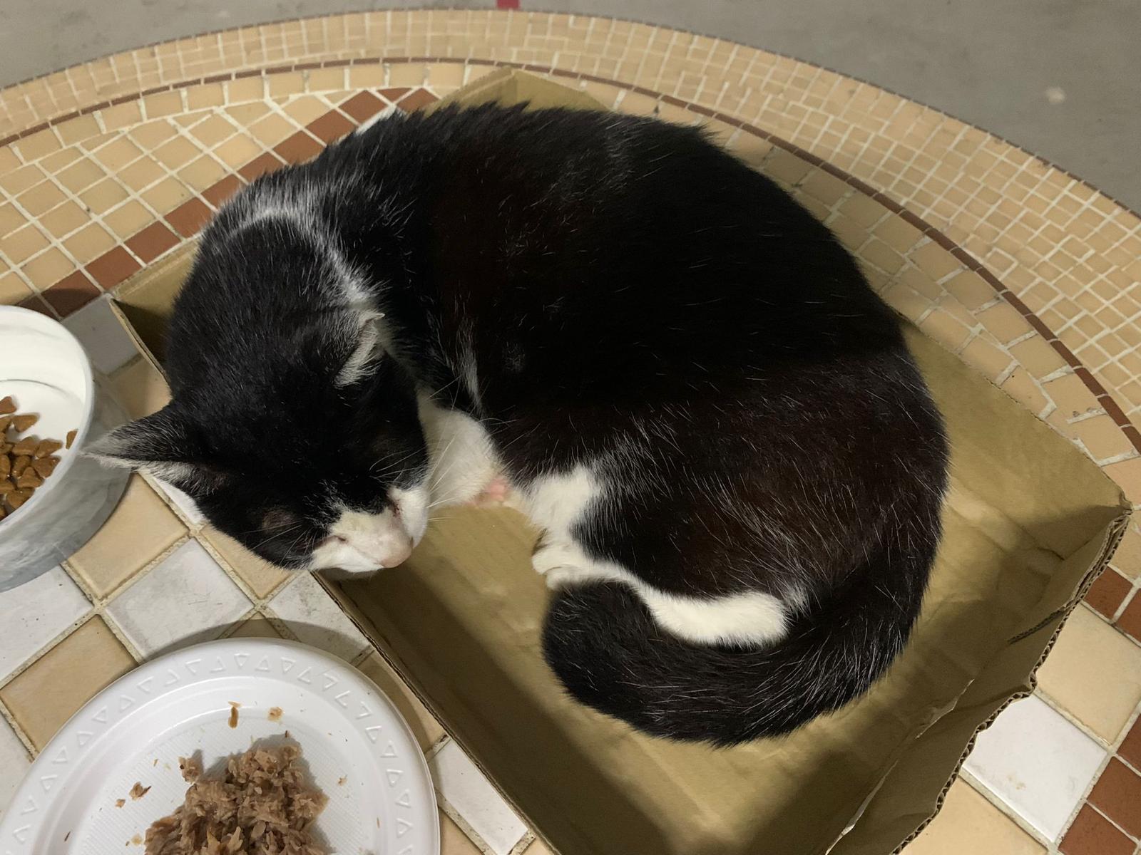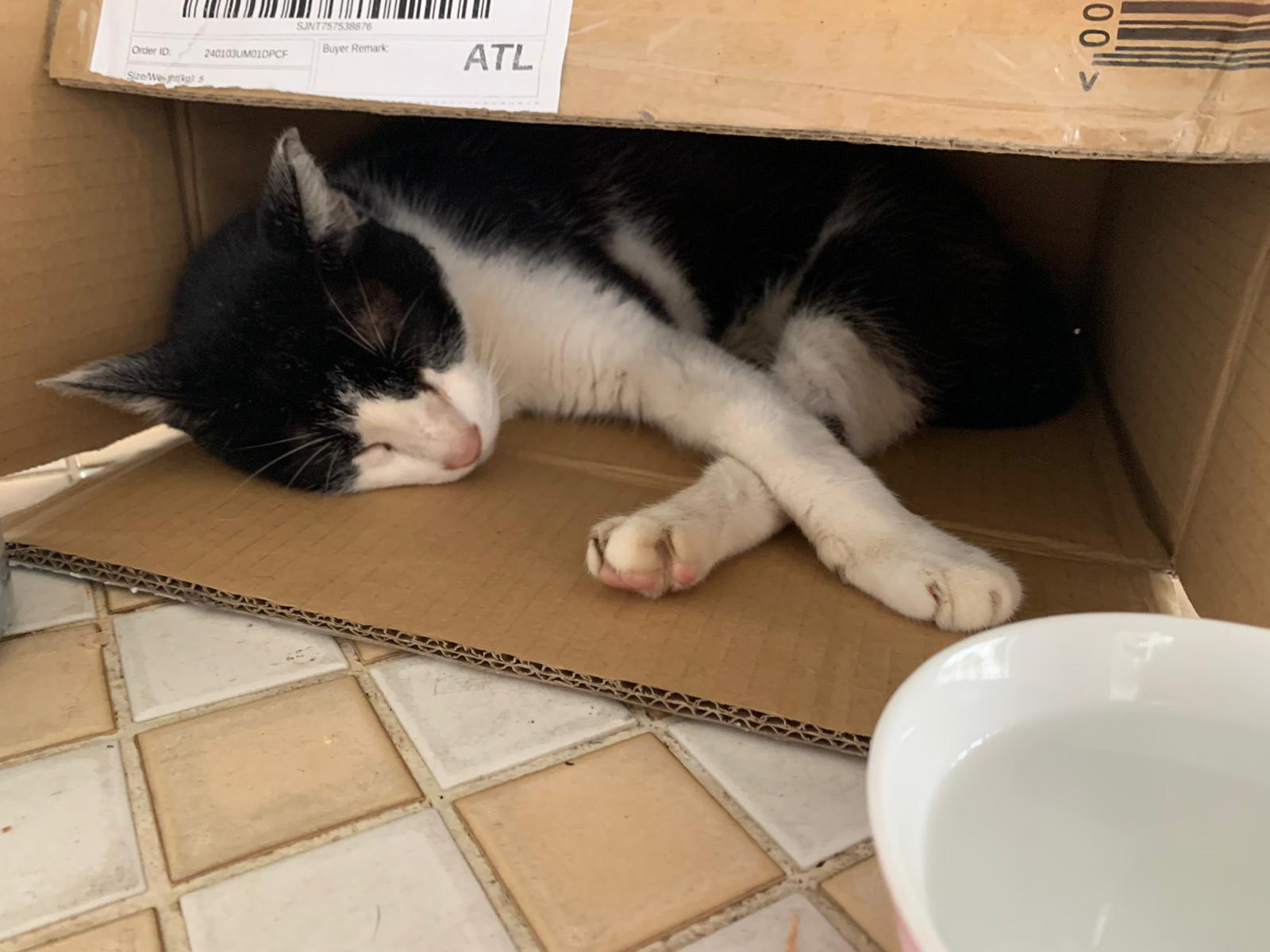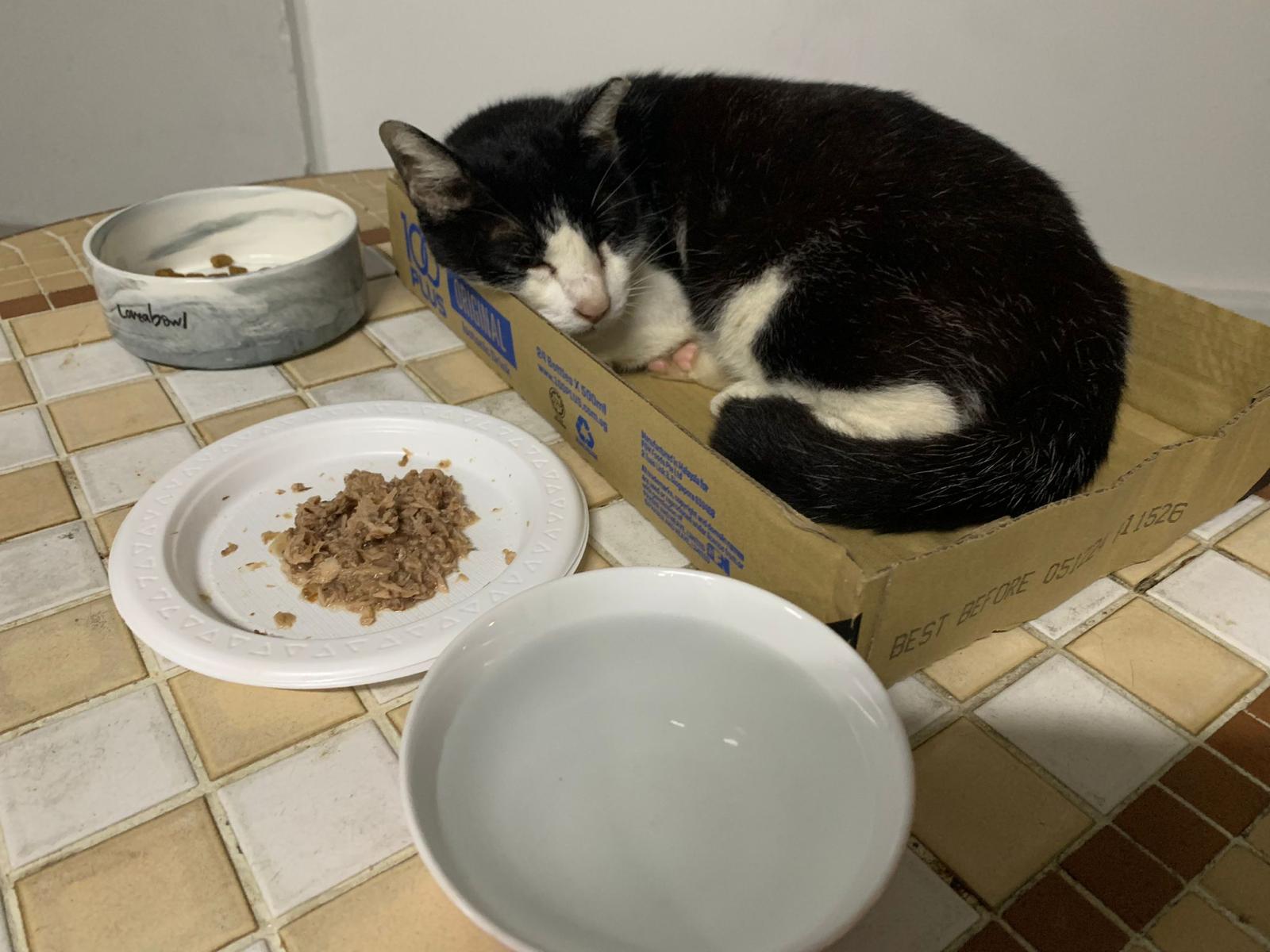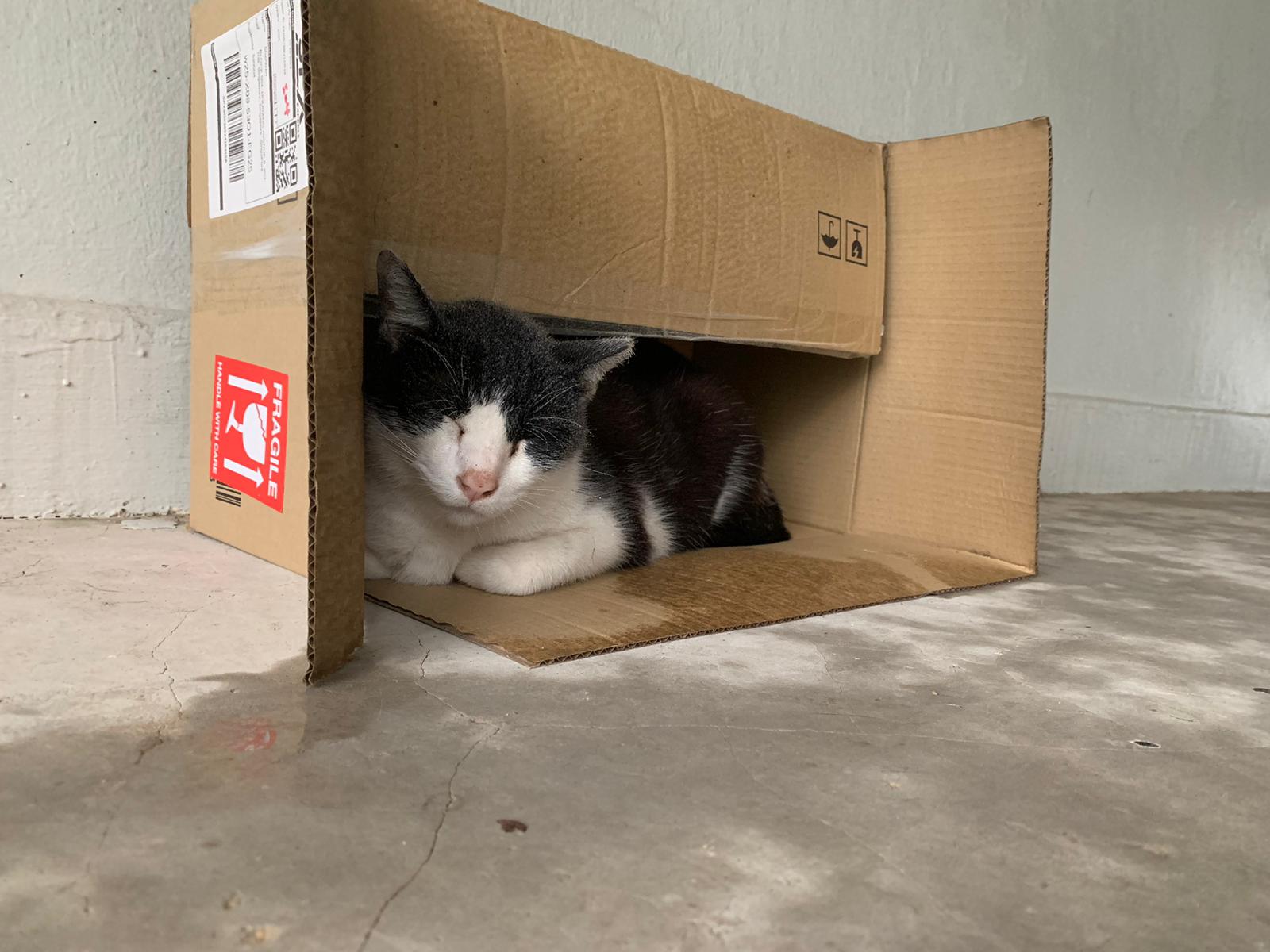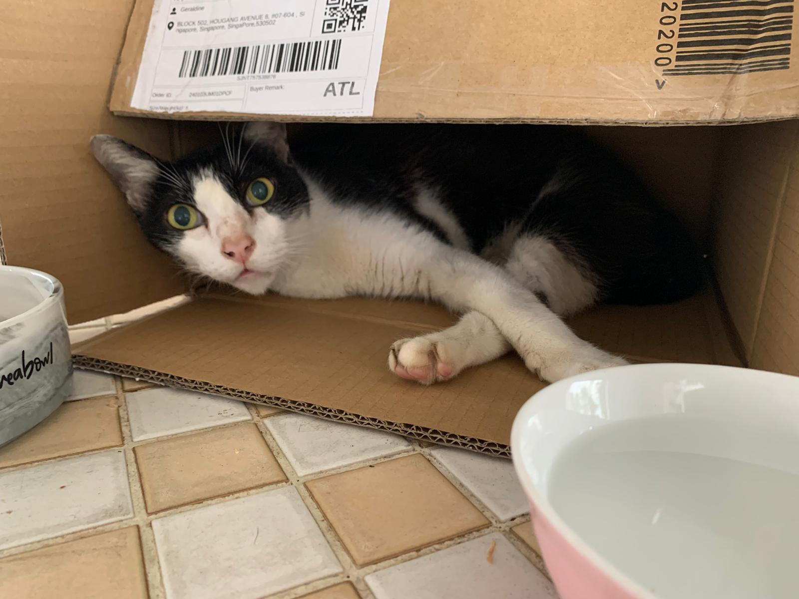 10pm+: super cute, xiao Lian like to hide and sleep in box too. Someone left a box for him to sleep in. My kibble bowl is back 🙂 I top up more kibble for him 🙂 sayang him a lot.