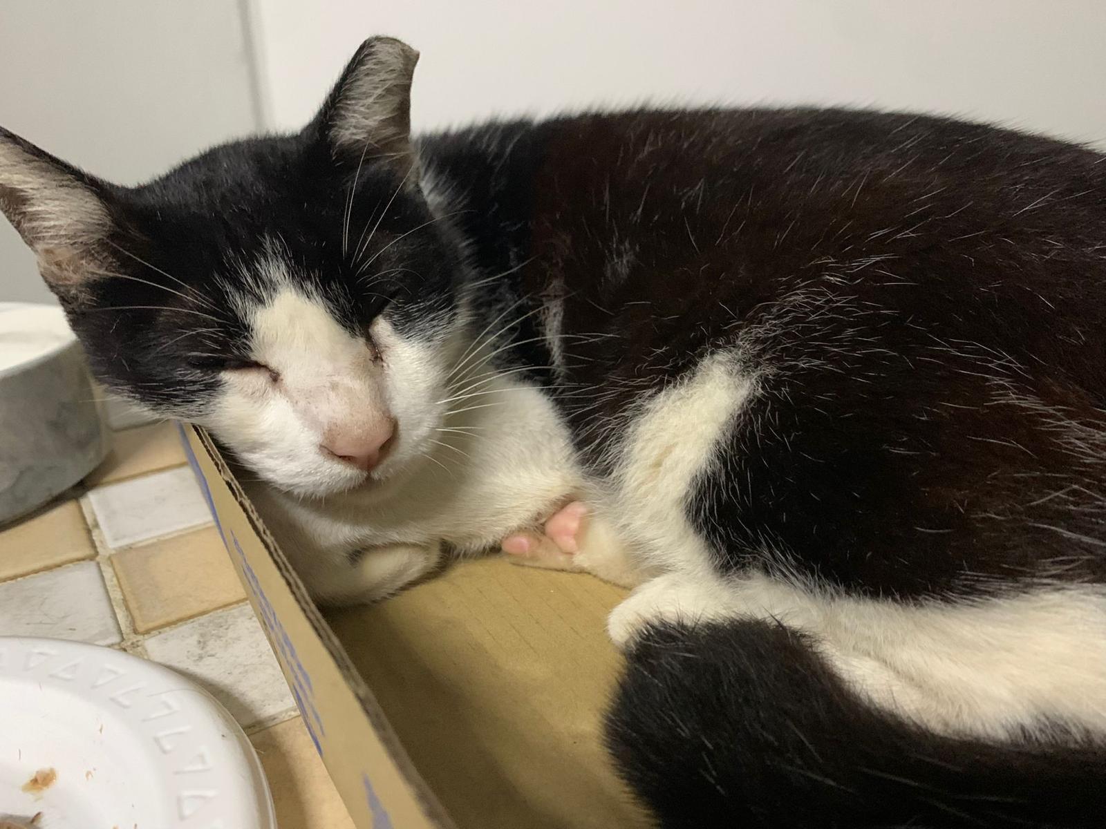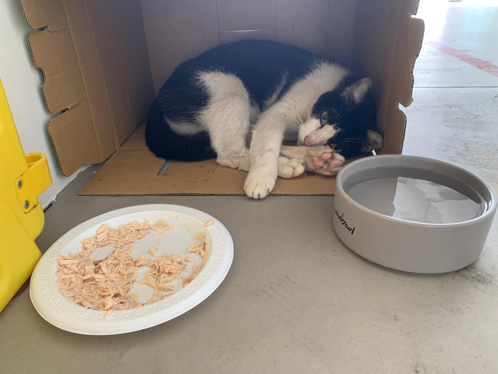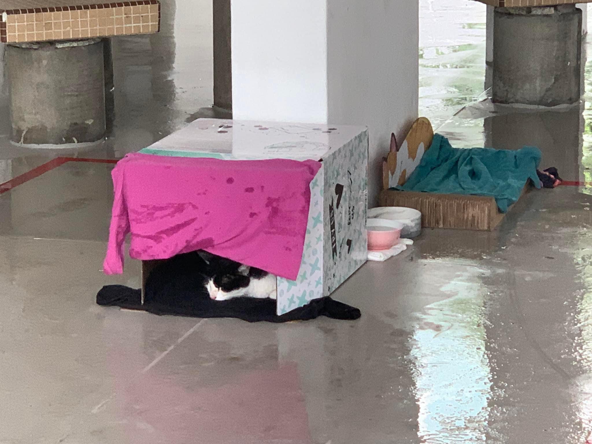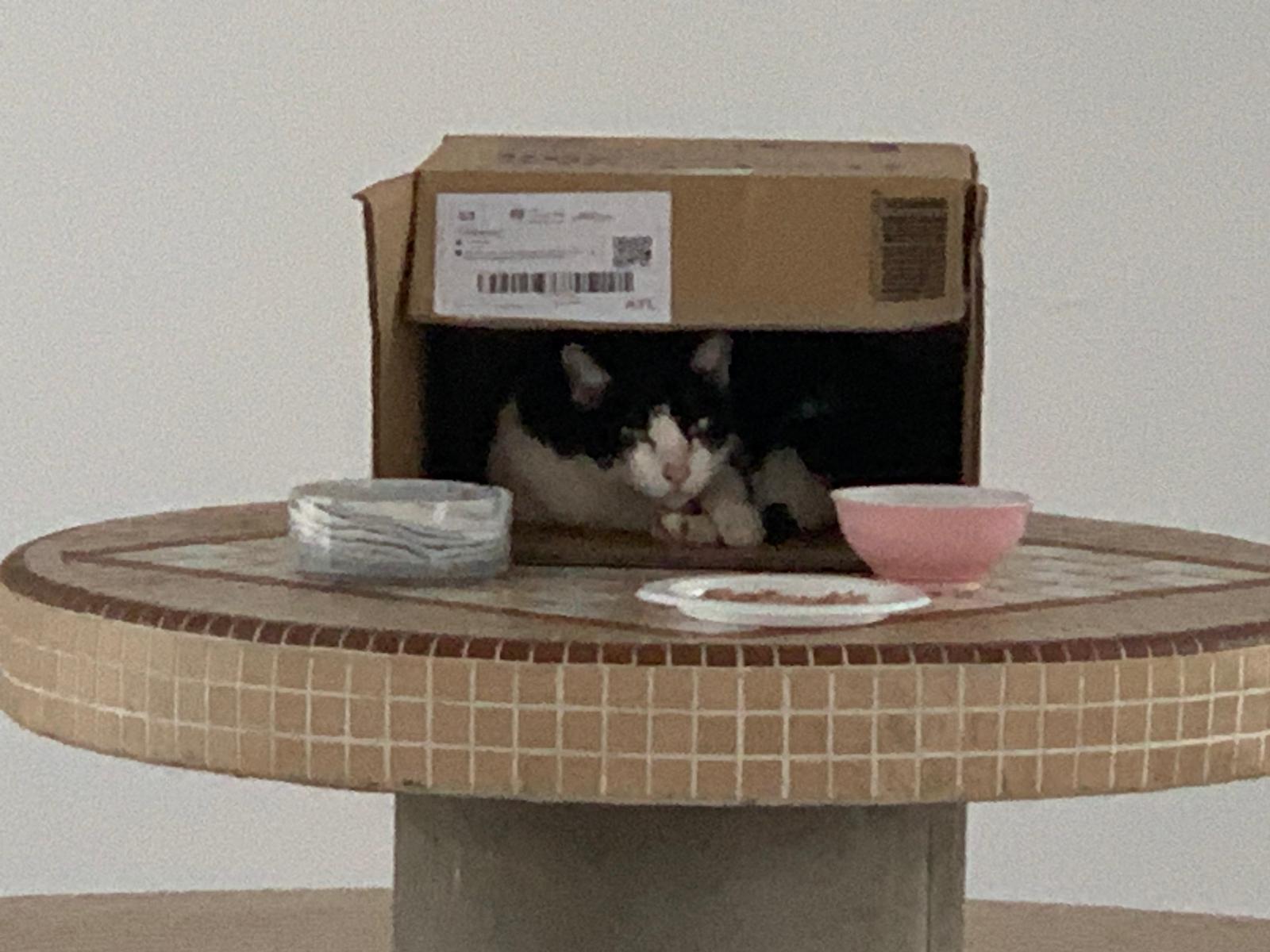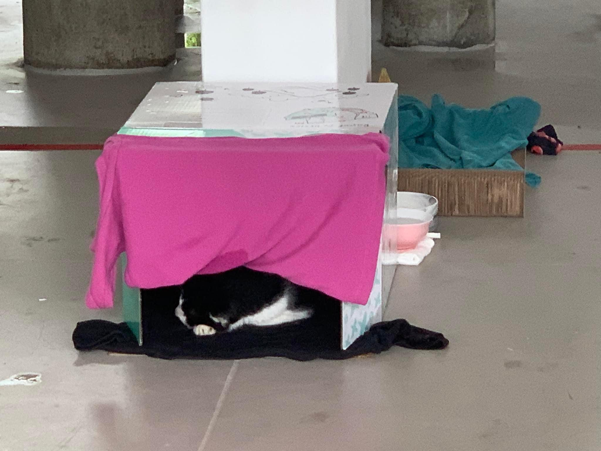 10pm+: super cute, xiao Lian like to hide and sleep in box too. Someone left a box for him to sleep in. My kibble bowl is back 🙂 I top up more kibble for him 🙂 sayang him a lot.