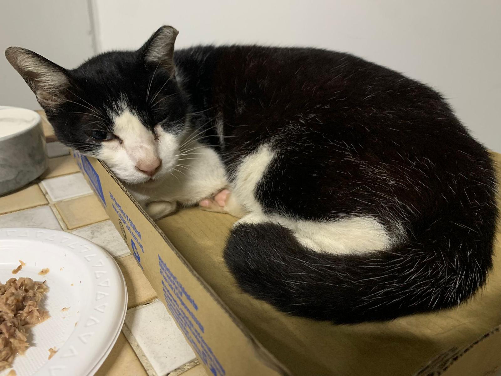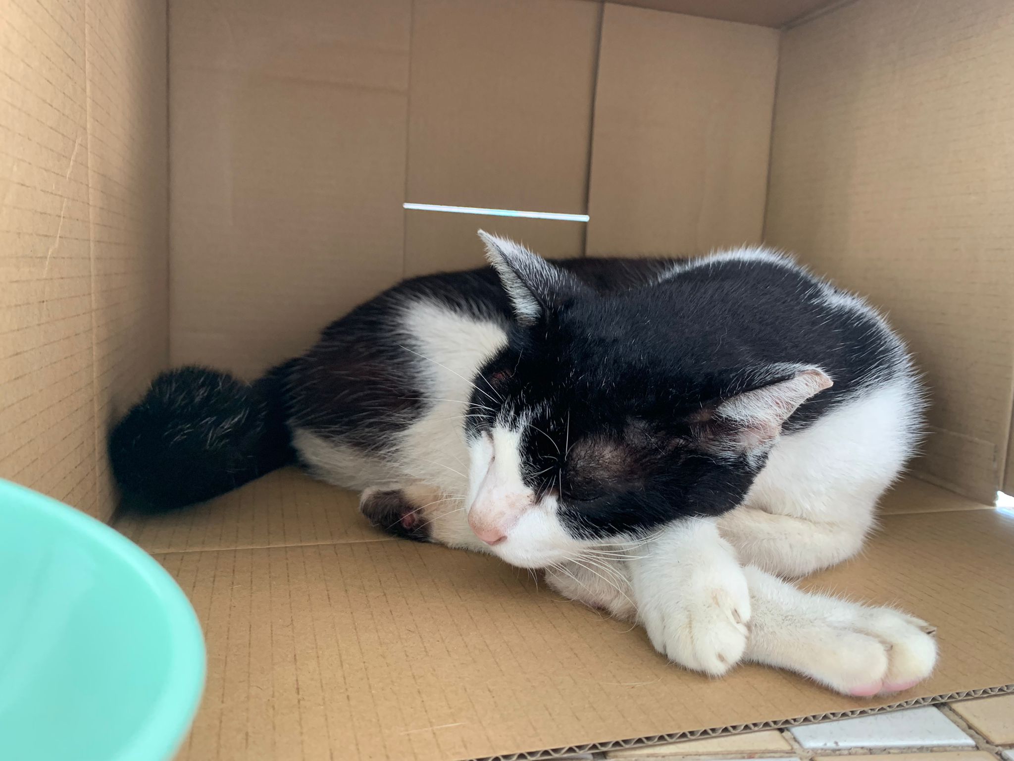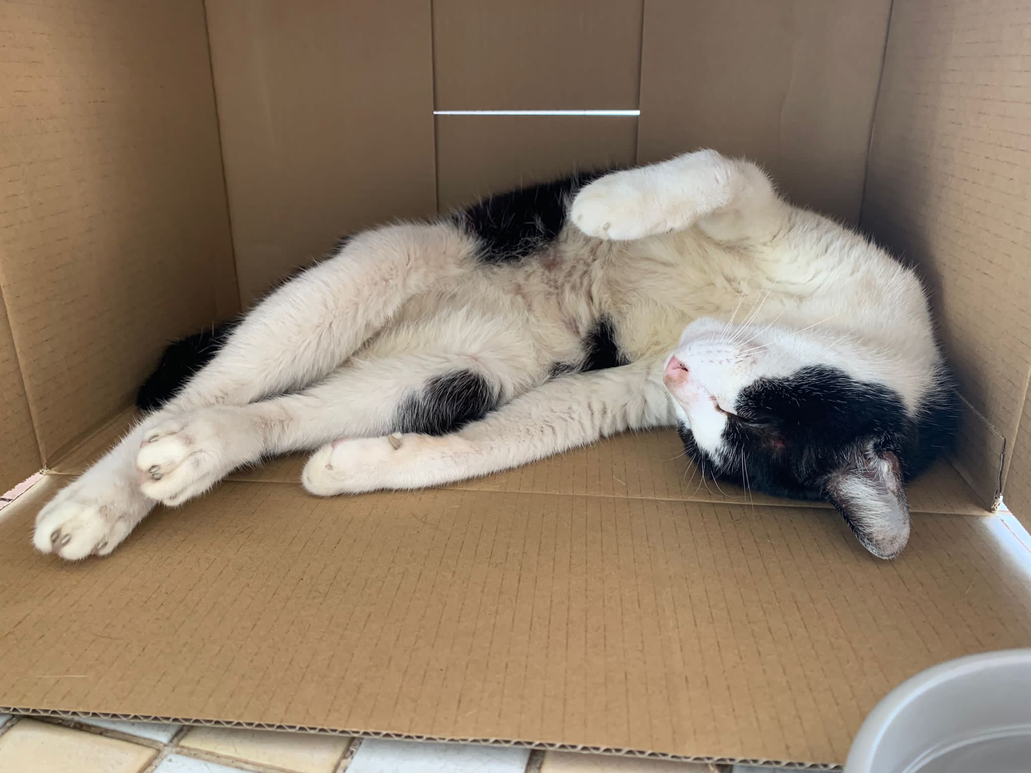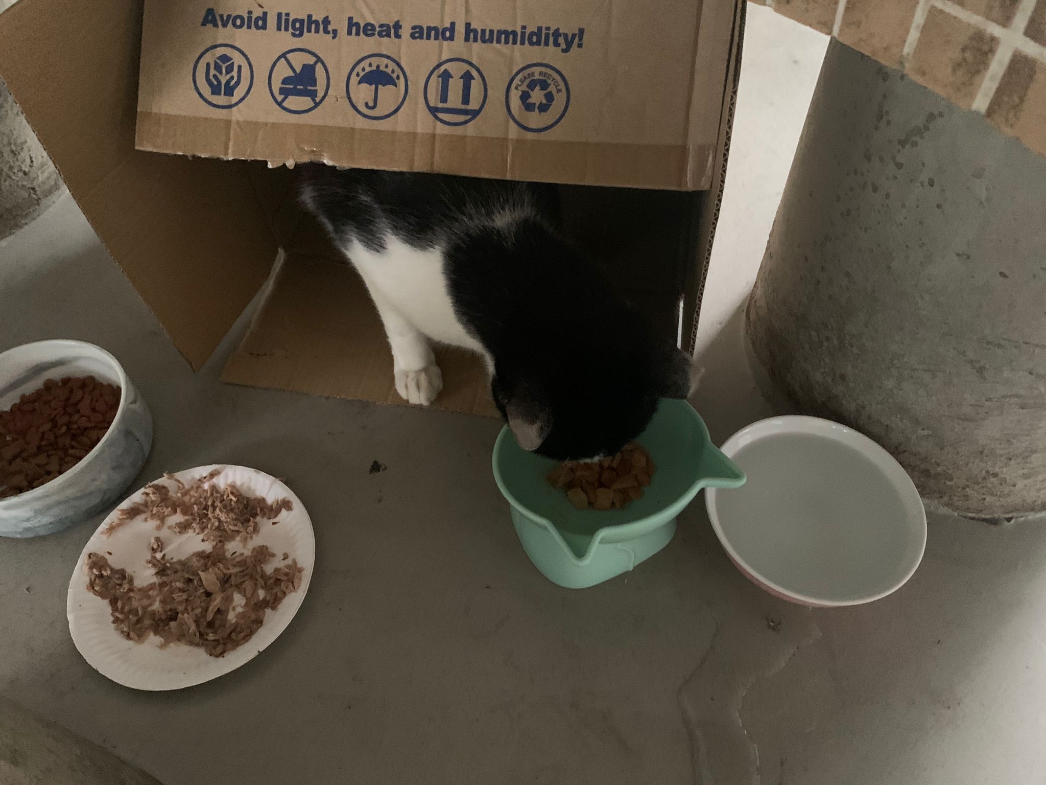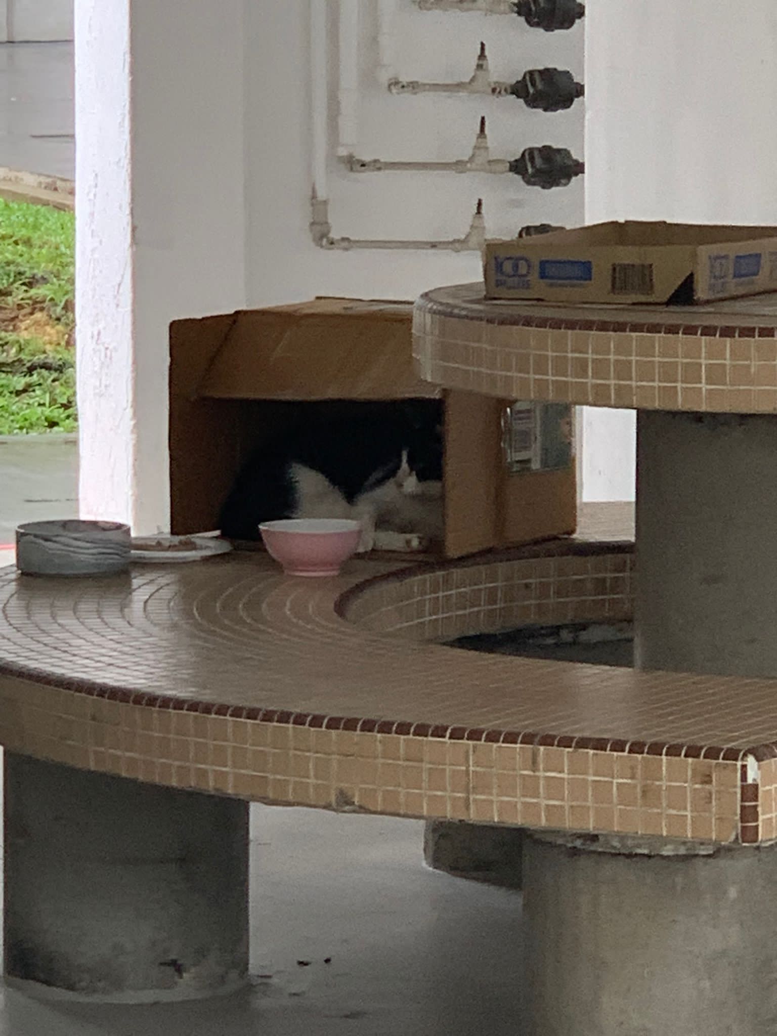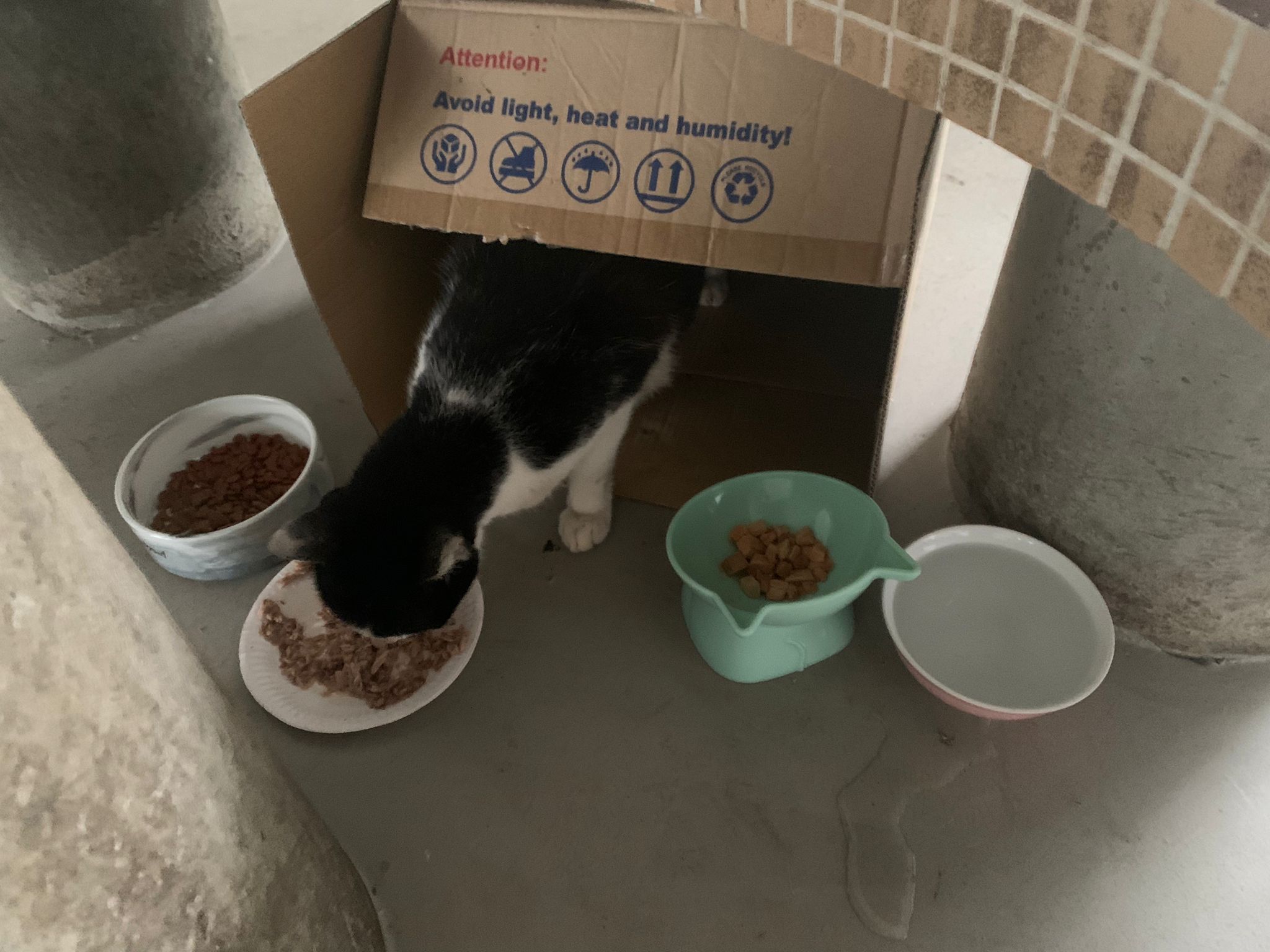 10pm+: super cute, xiao Lian like to hide and sleep in box too. Someone left a box for him to sleep in. My kibble bowl is back 🙂 I top up more kibble for him 🙂 sayang him a lot.