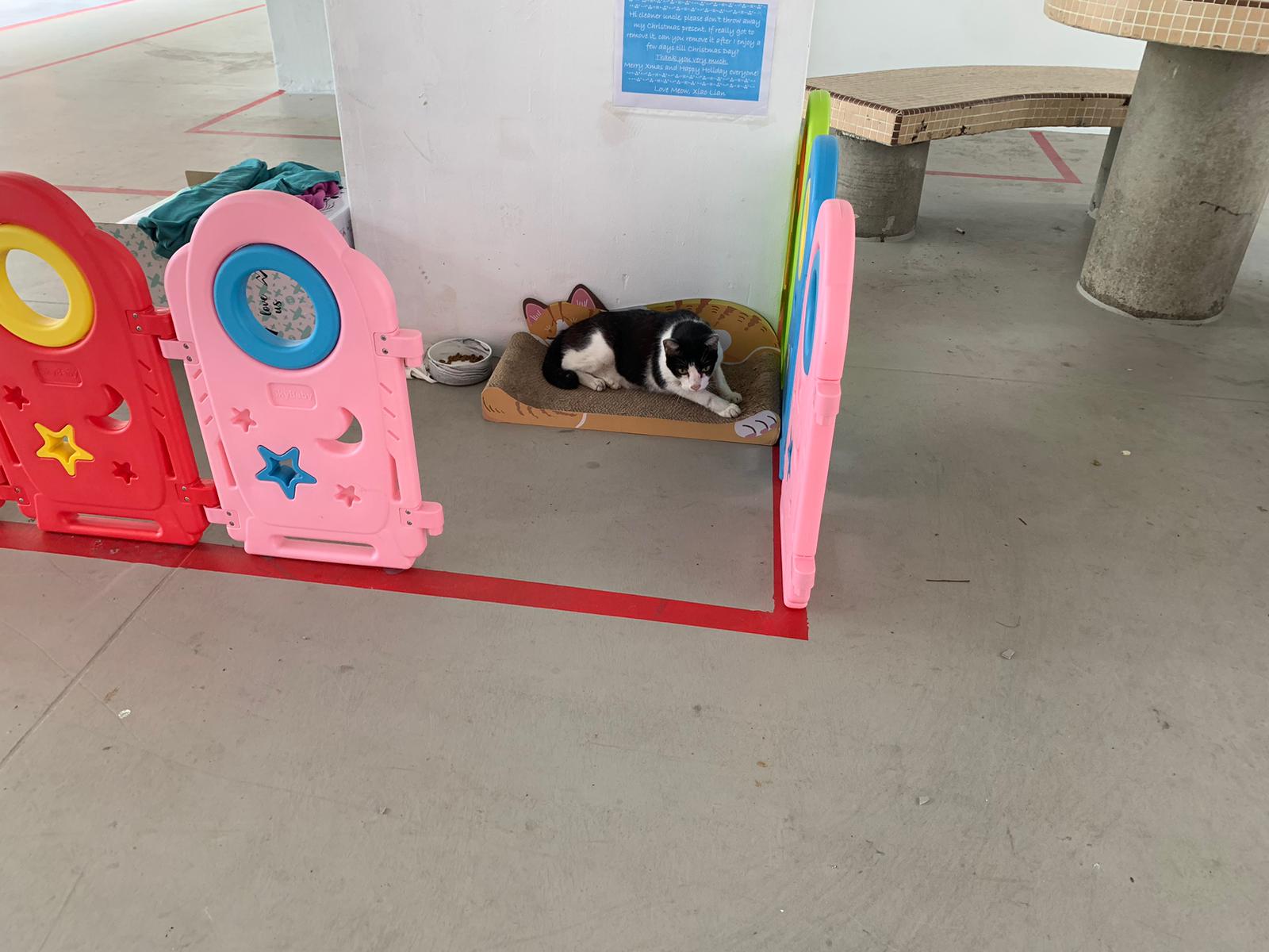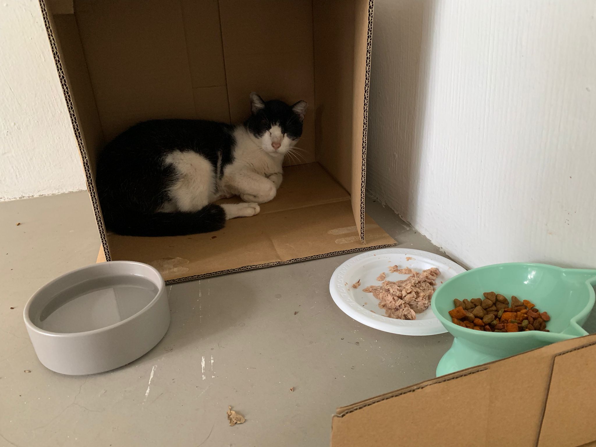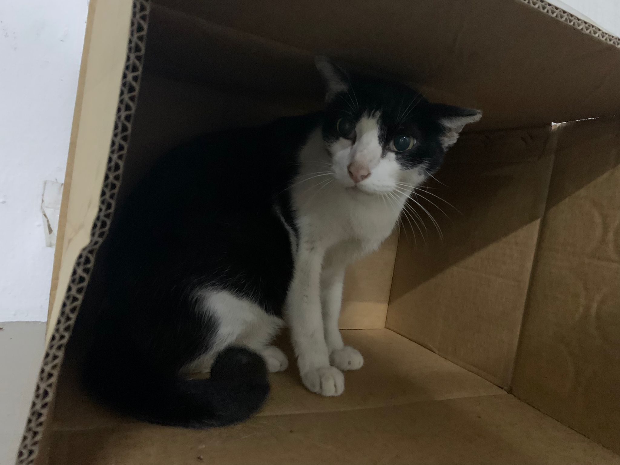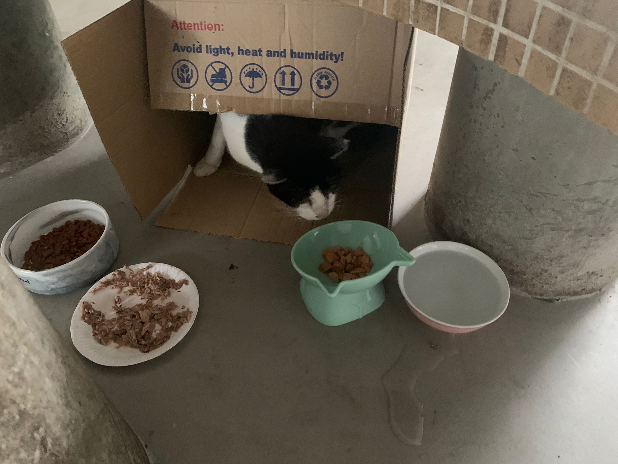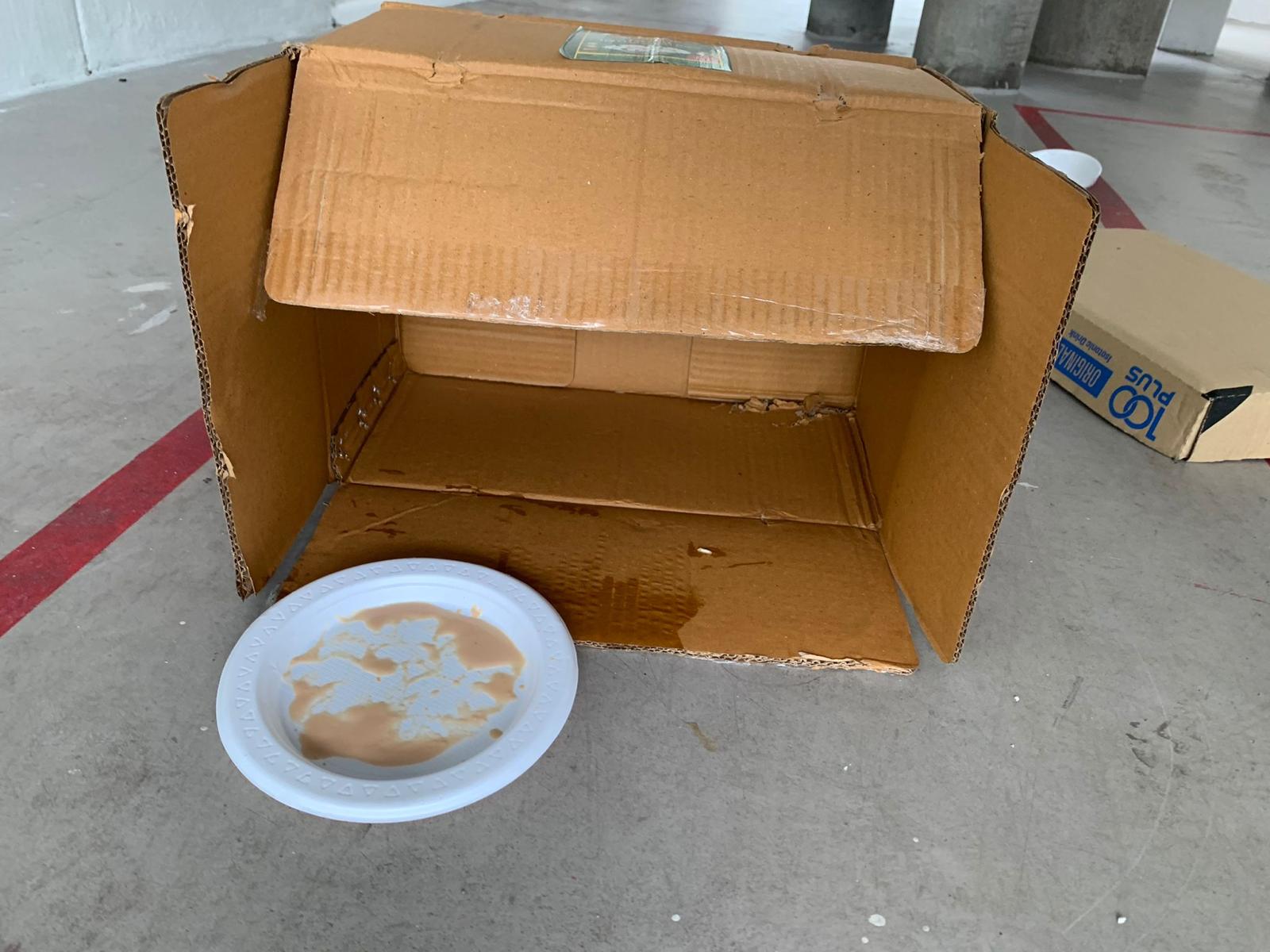 10pm+: super cute, xiao Lian like to hide and sleep in box too. Someone left a box for him to sleep in. My kibble bowl is back 🙂 I top up more kibble for him 🙂 sayang him a lot.