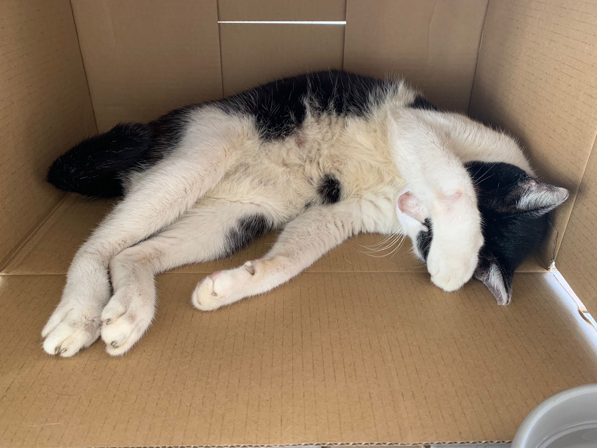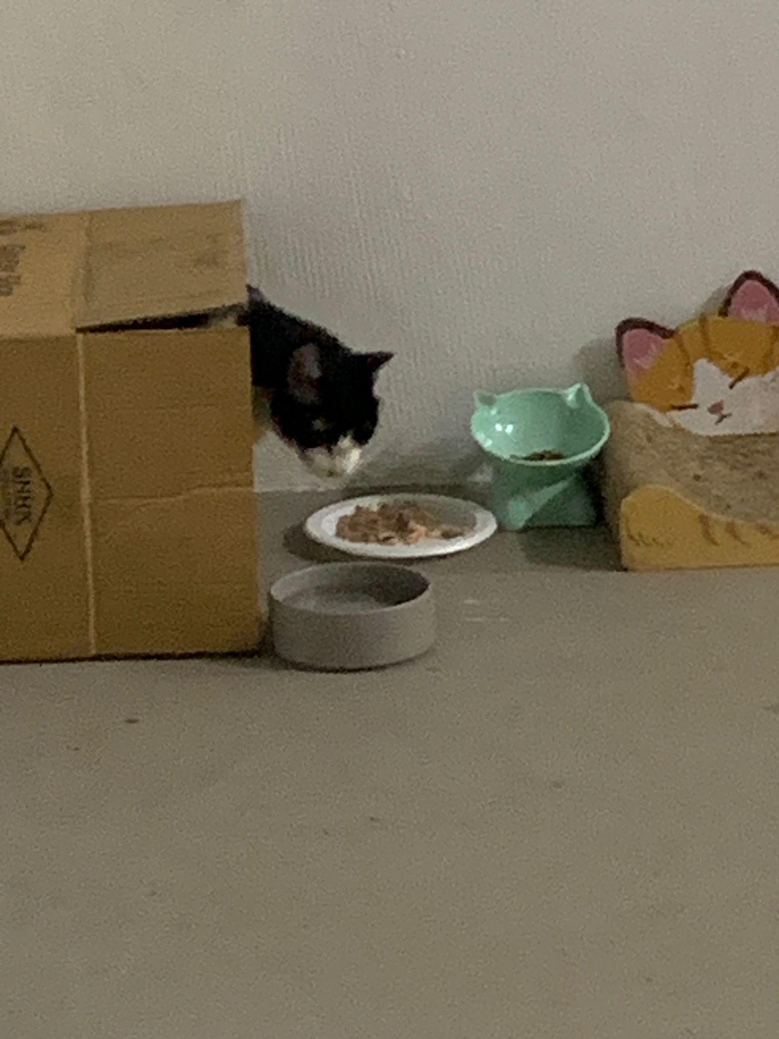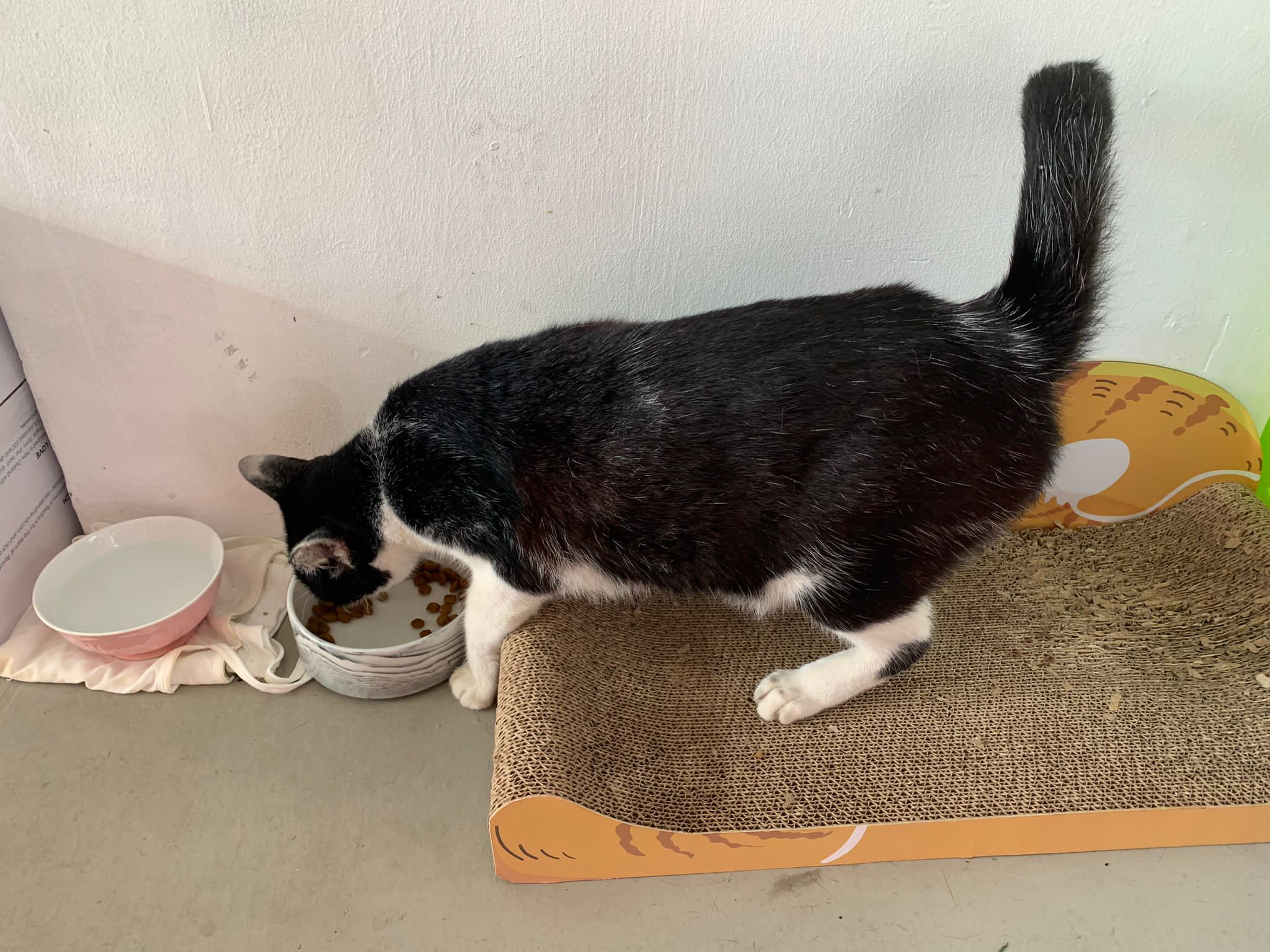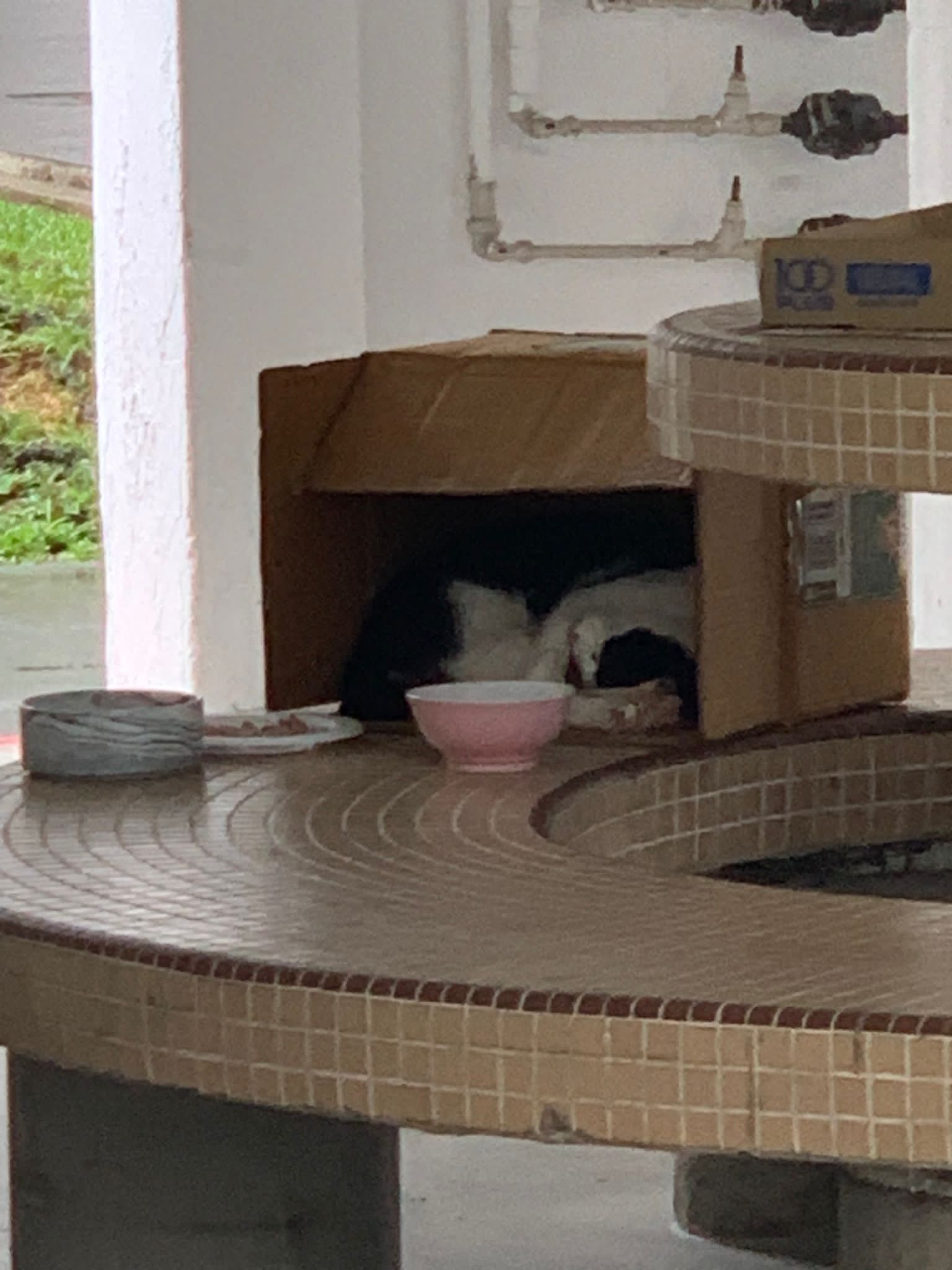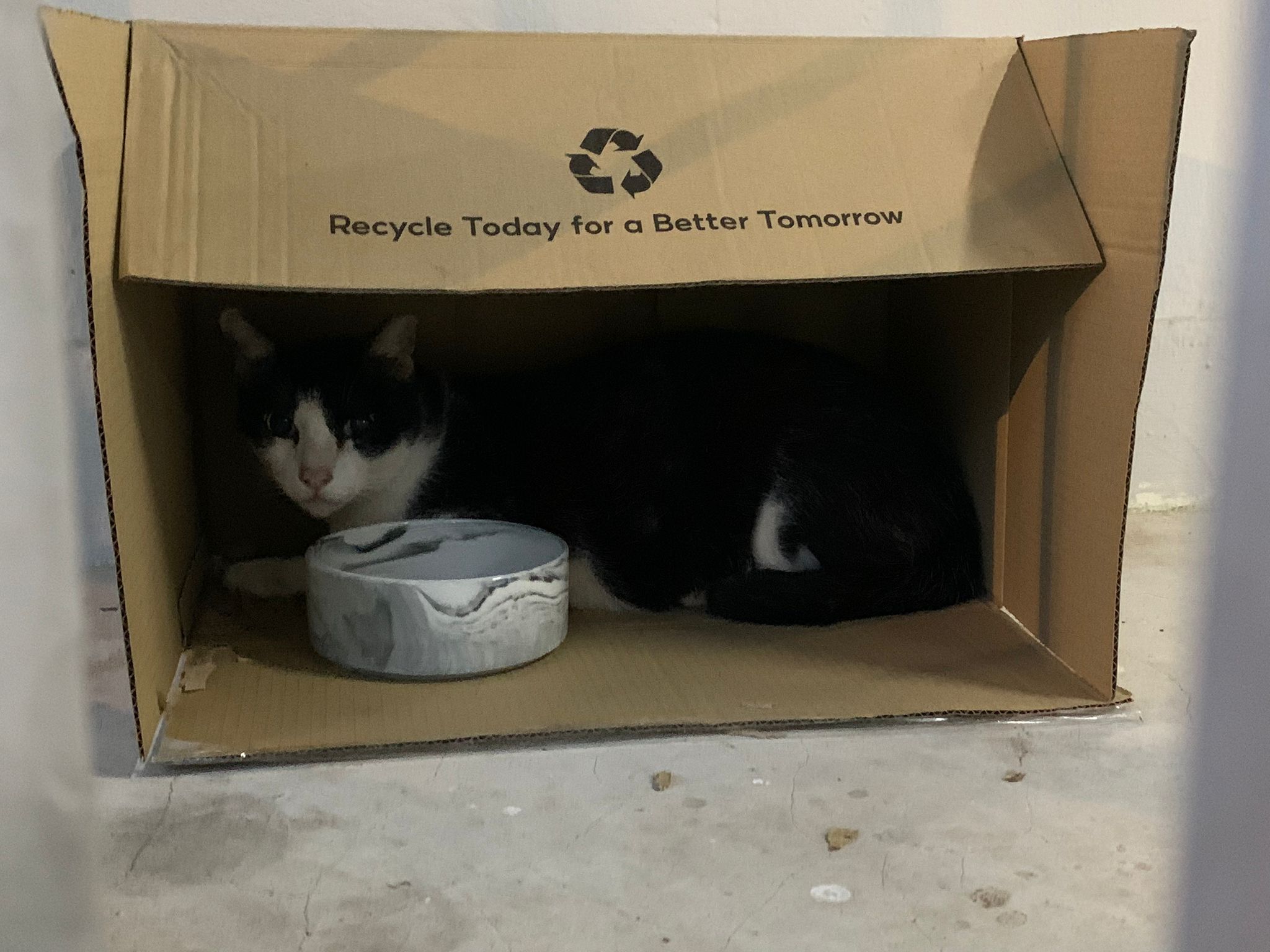 10pm+: super cute, xiao Lian like to hide and sleep in box too. Someone left a box for him to sleep in. My kibble bowl is back 🙂 I top up more kibble for him 🙂 sayang him a lot.
