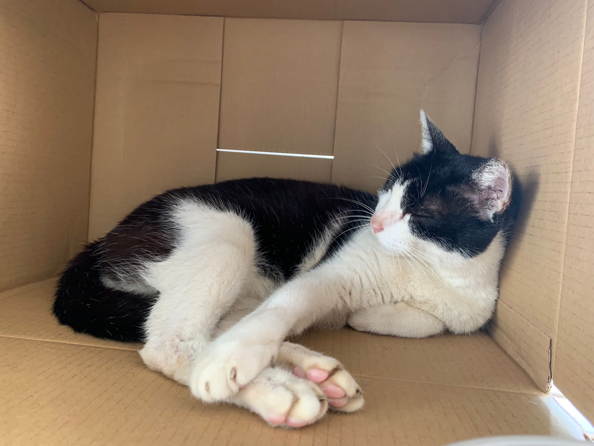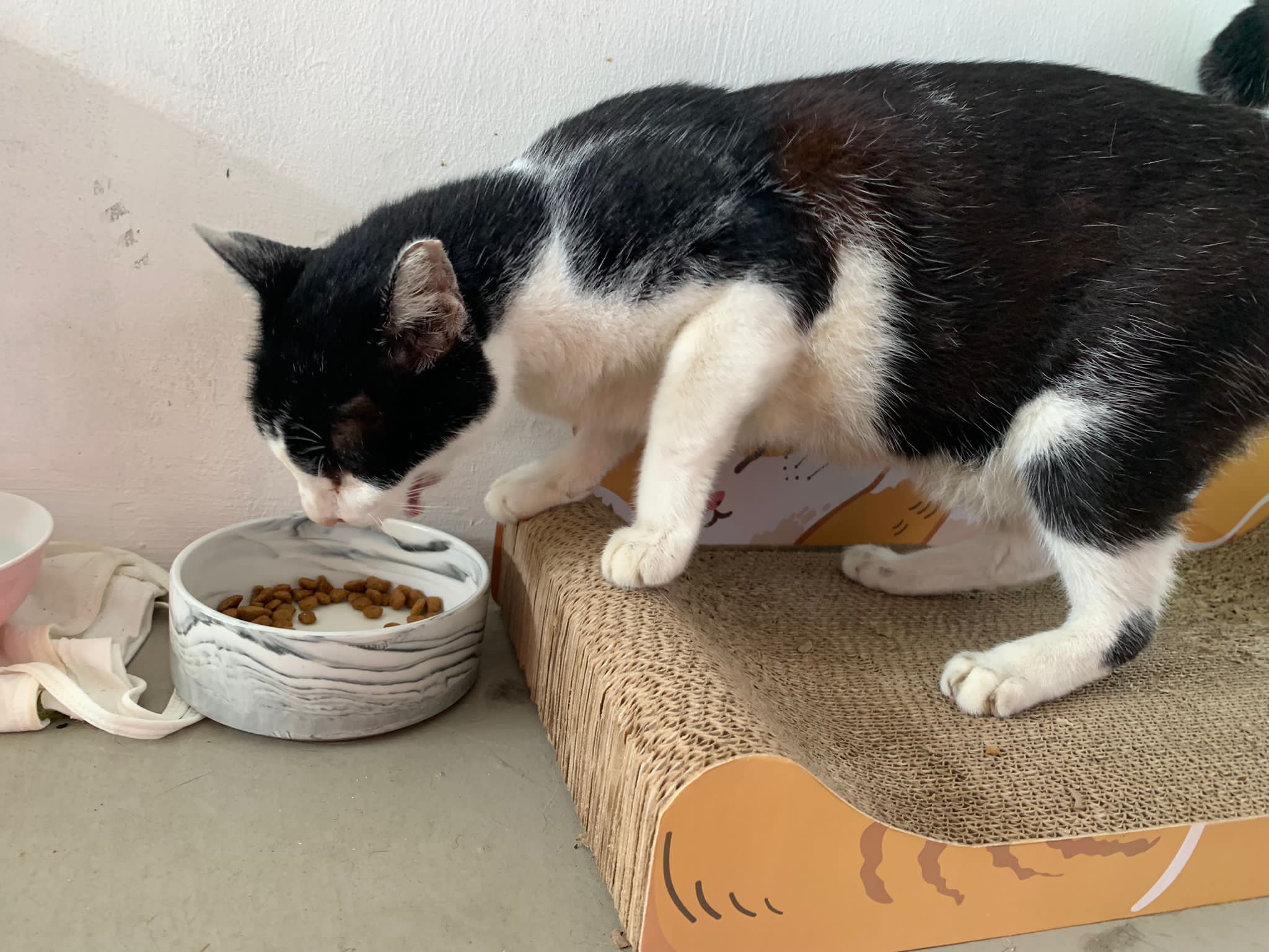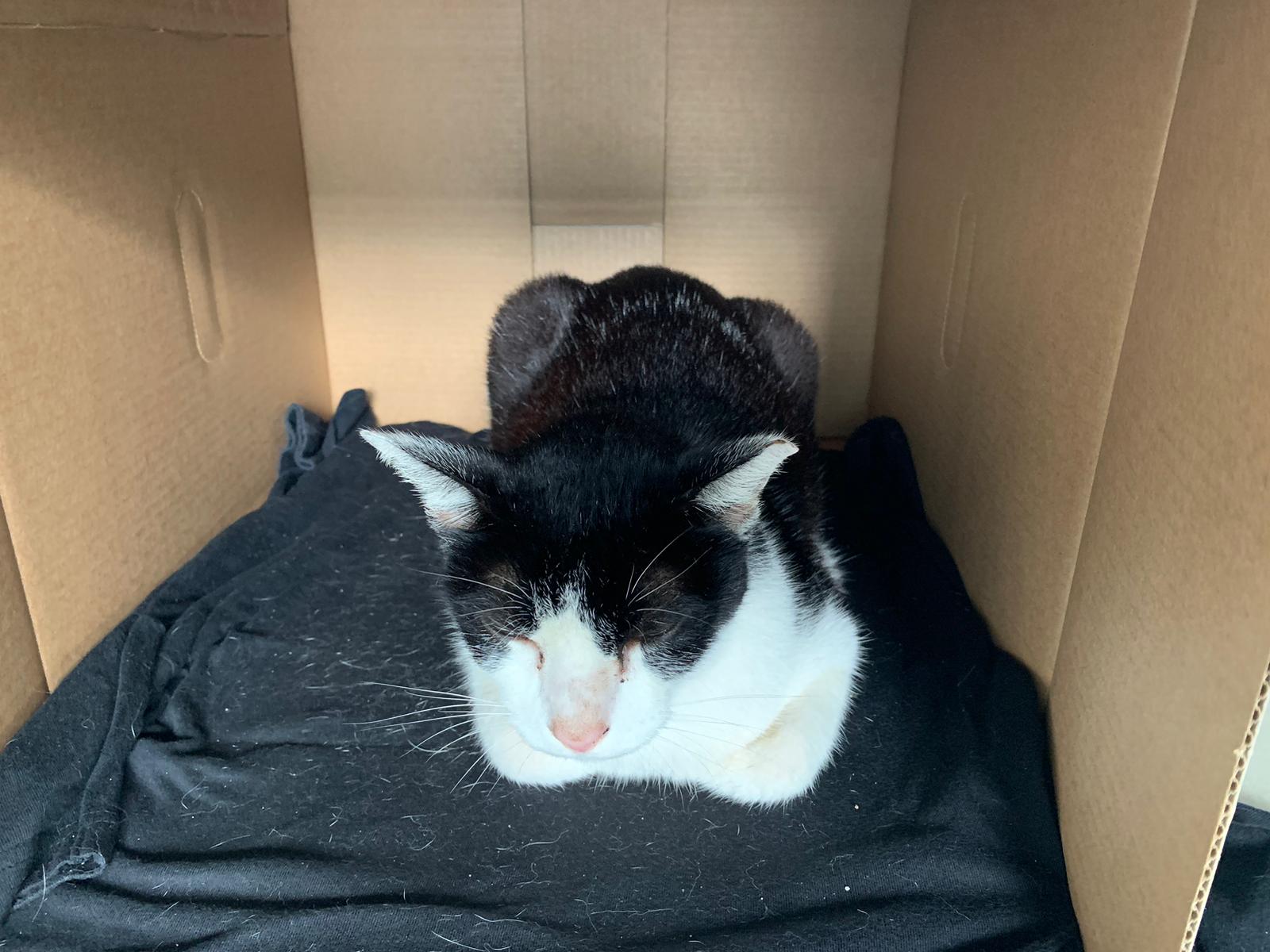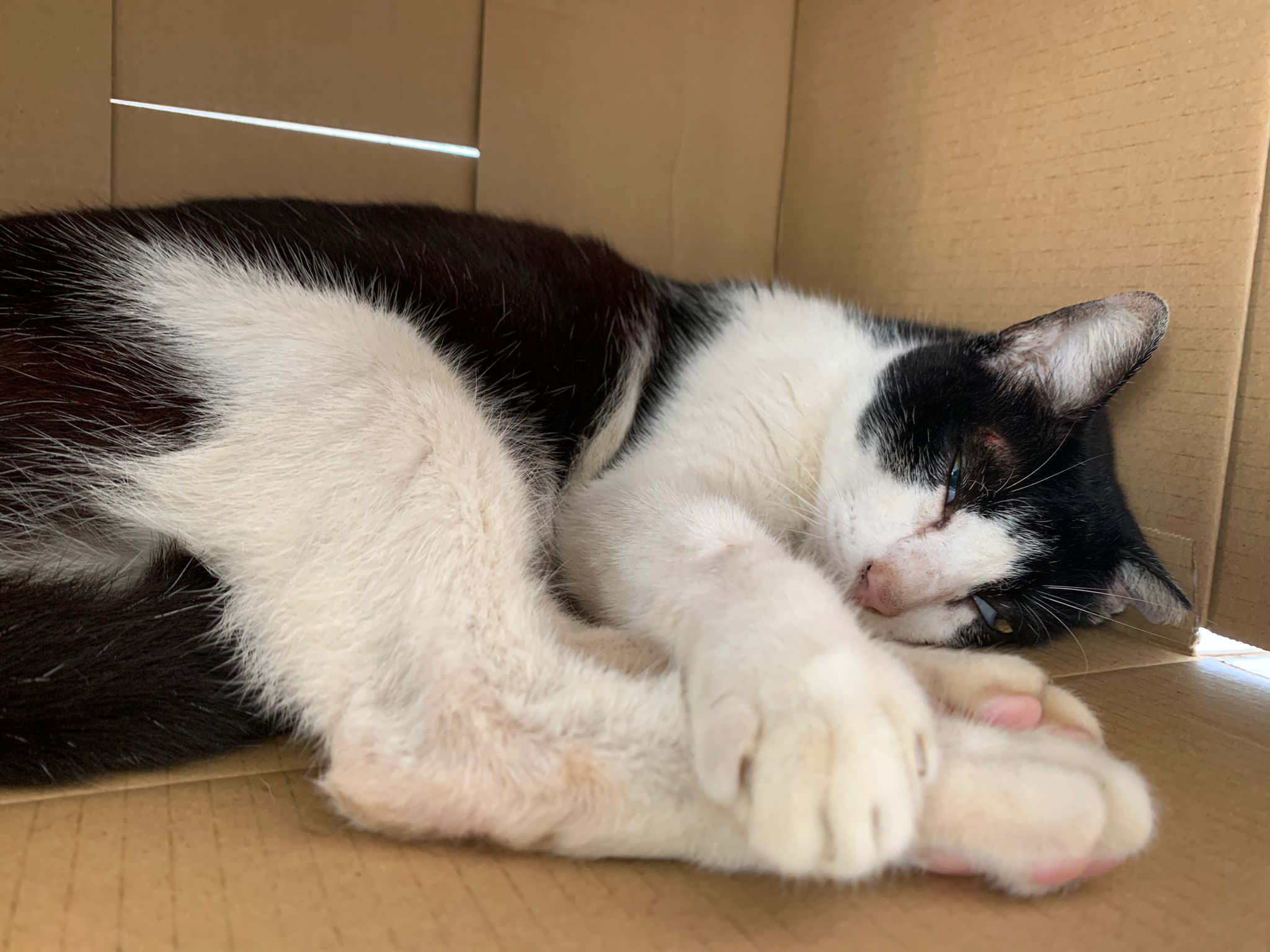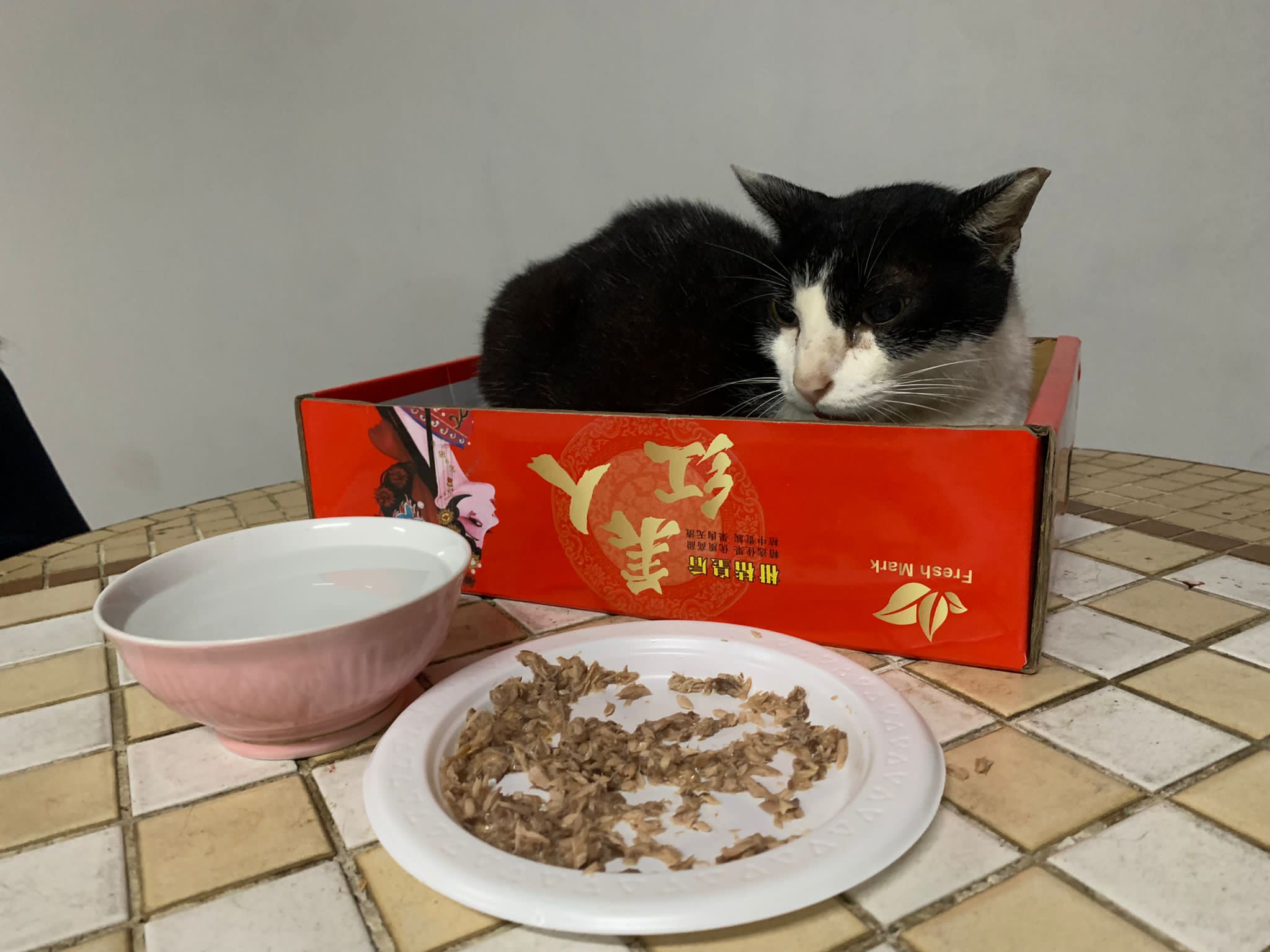 10pm+: super cute, xiao Lian like to hide and sleep in box too. Someone left a box for him to sleep in. My kibble bowl is back 🙂 I top up more kibble for him 🙂 sayang him a lot.