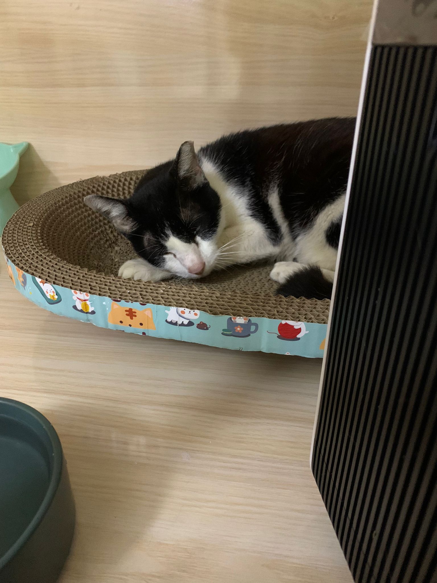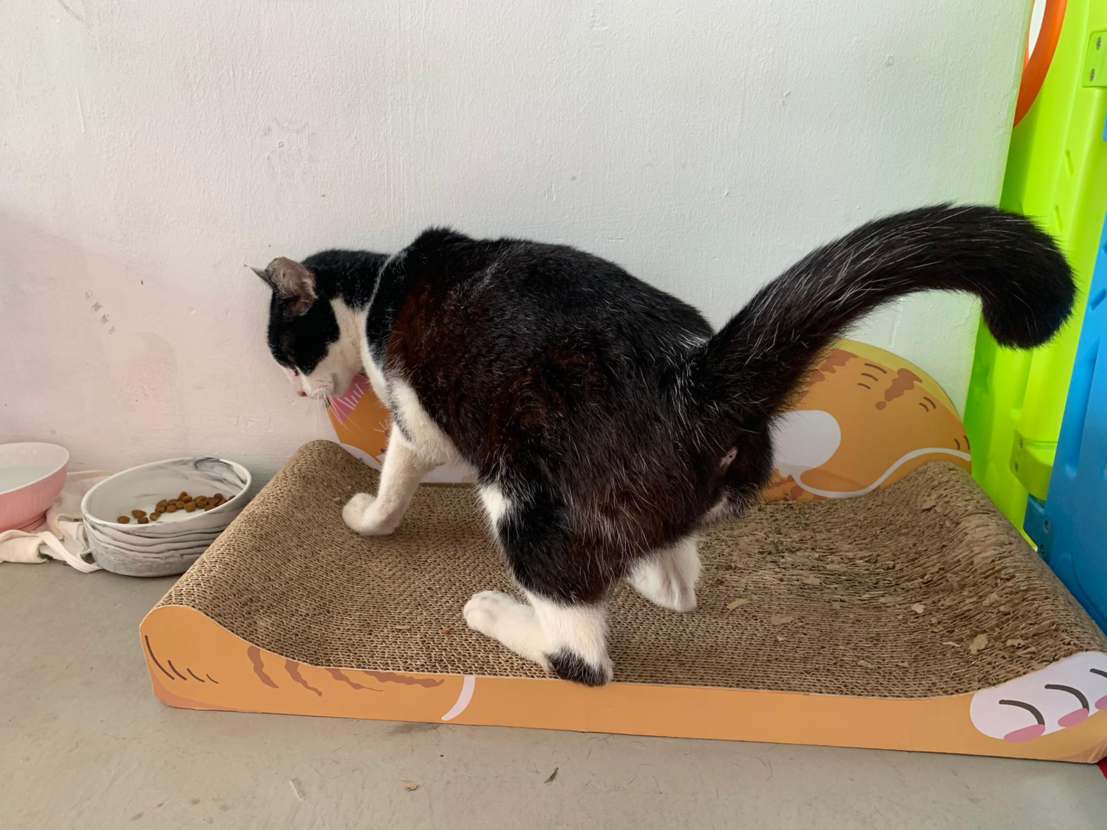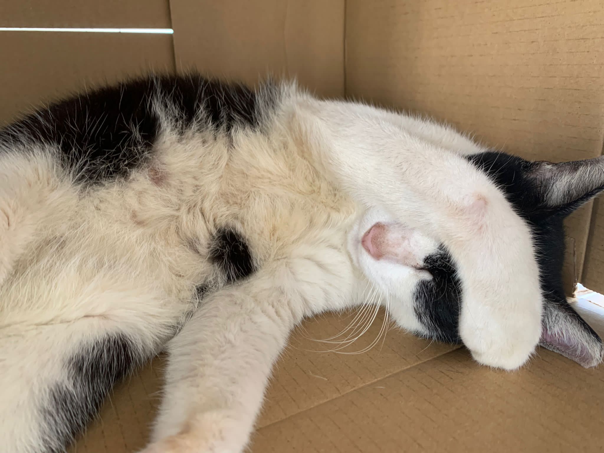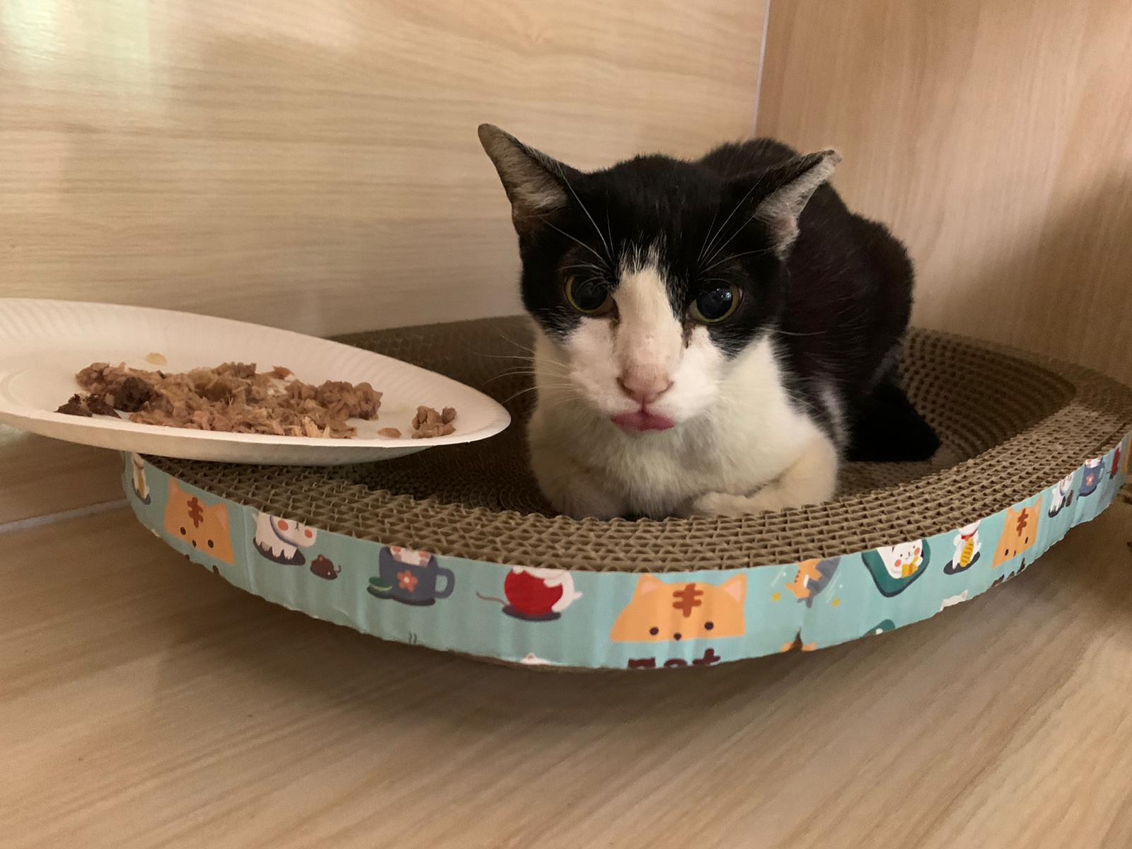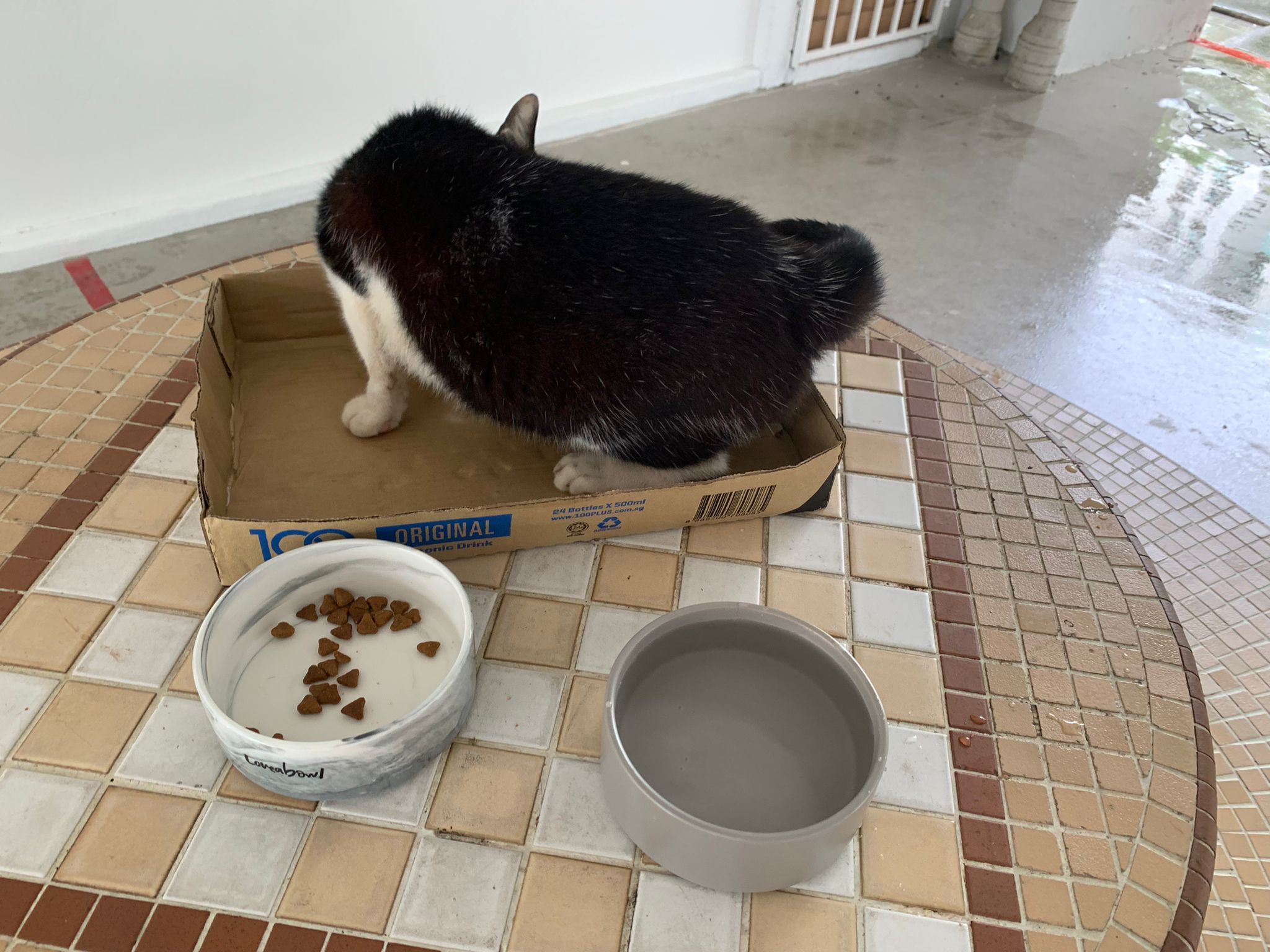 10pm+: super cute, xiao Lian like to hide and sleep in box too. Someone left a box for him to sleep in. My kibble bowl is back 🙂 I top up more kibble for him 🙂 sayang him a lot.