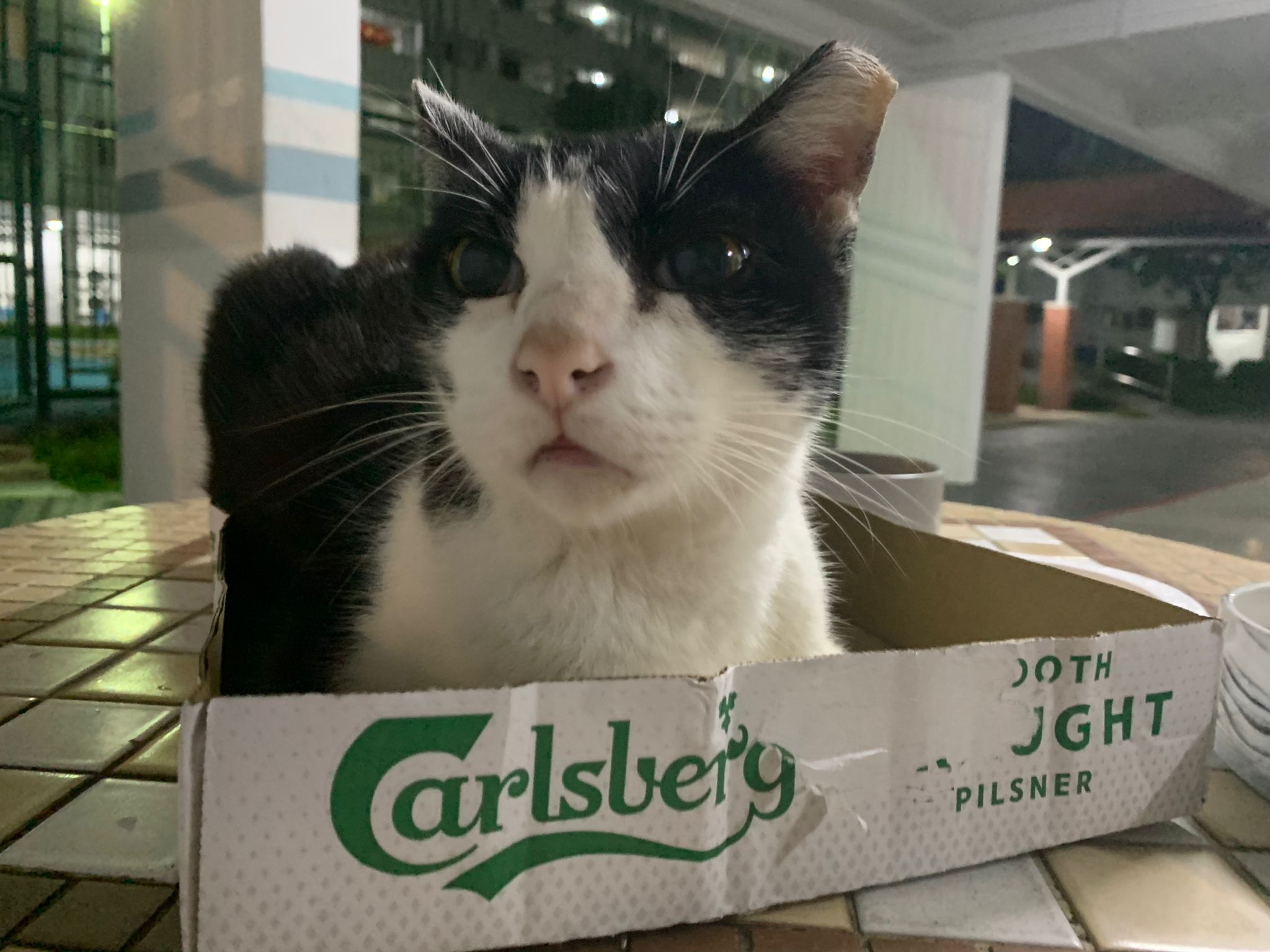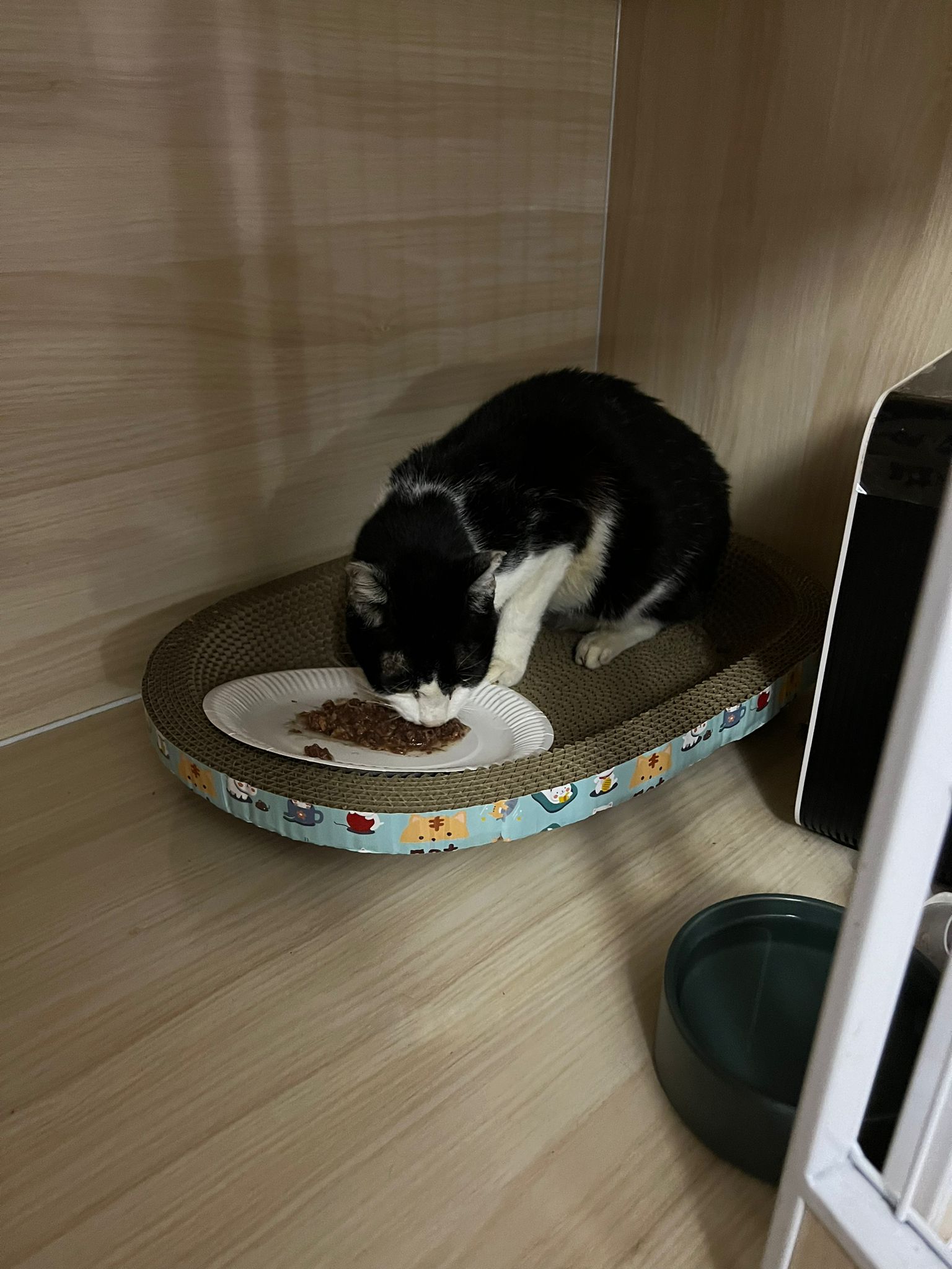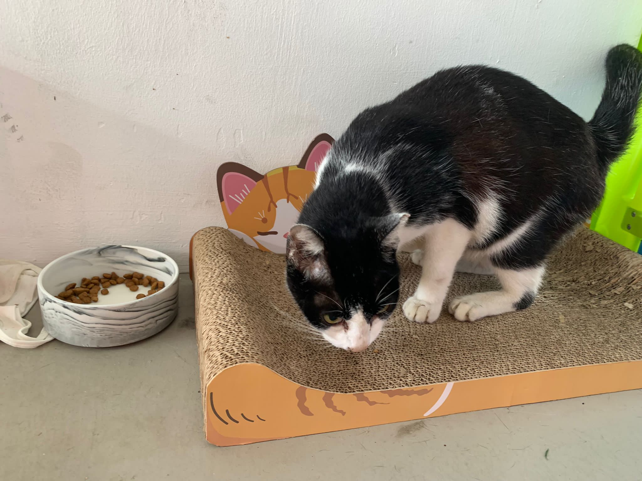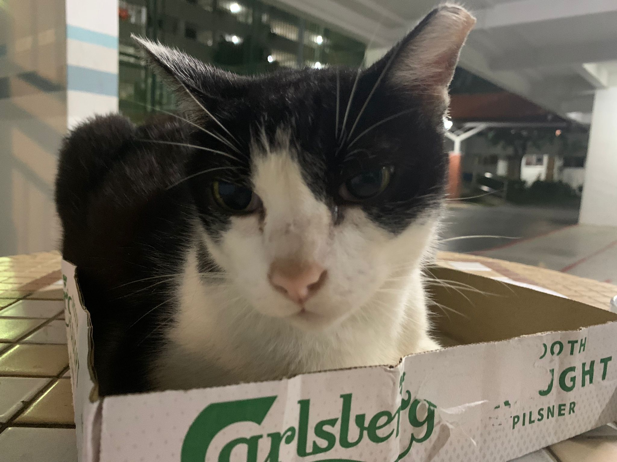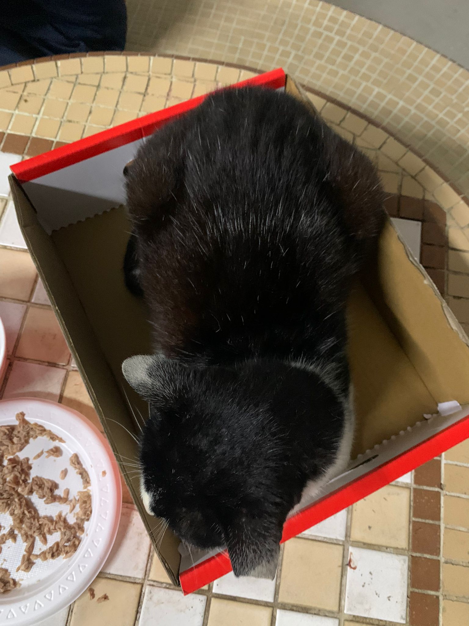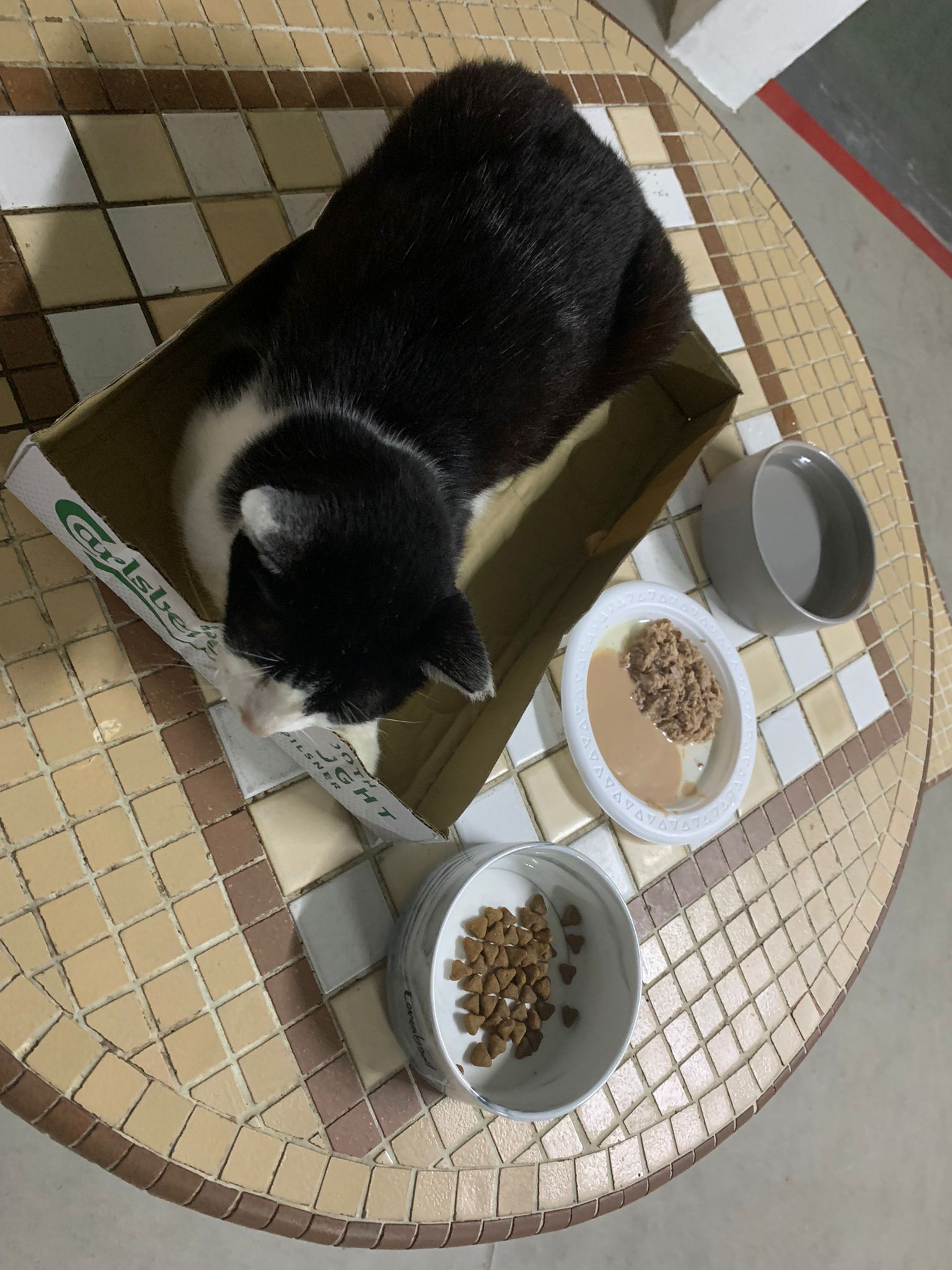 10pm+: super cute, xiao Lian like to hide and sleep in box too. Someone left a box for him to sleep in. My kibble bowl is back 🙂 I top up more kibble for him 🙂 sayang him a lot.