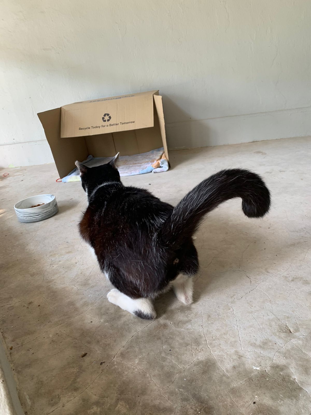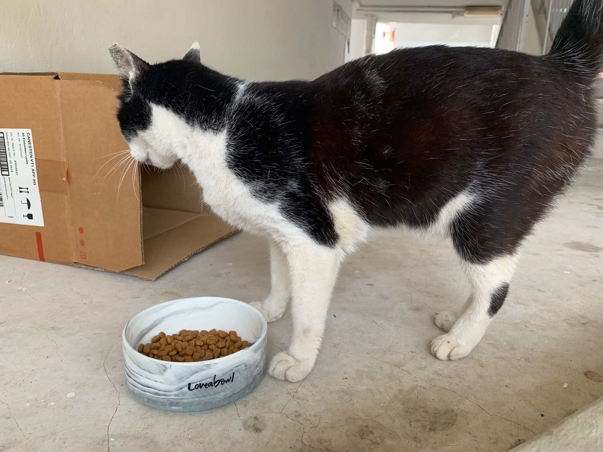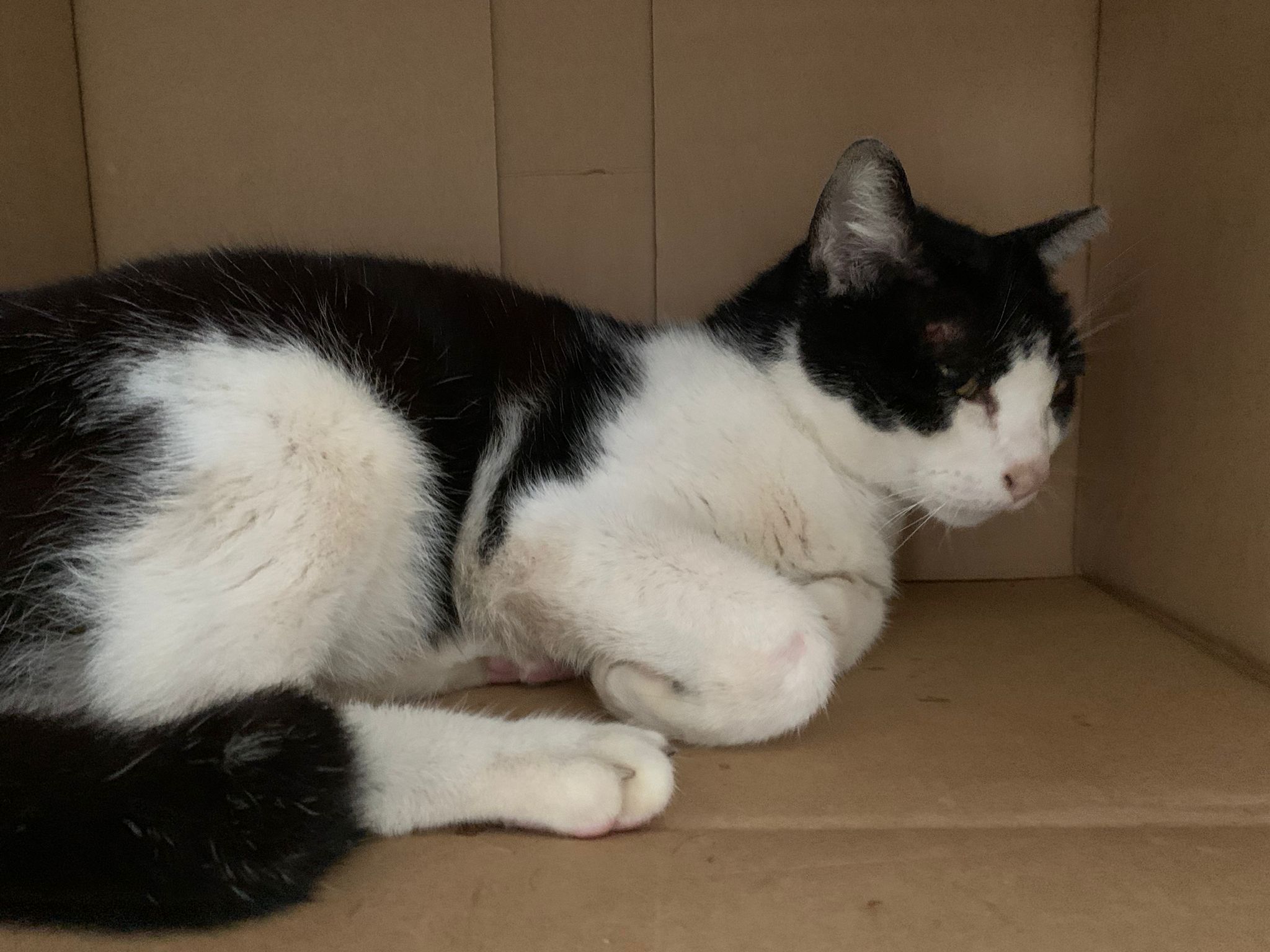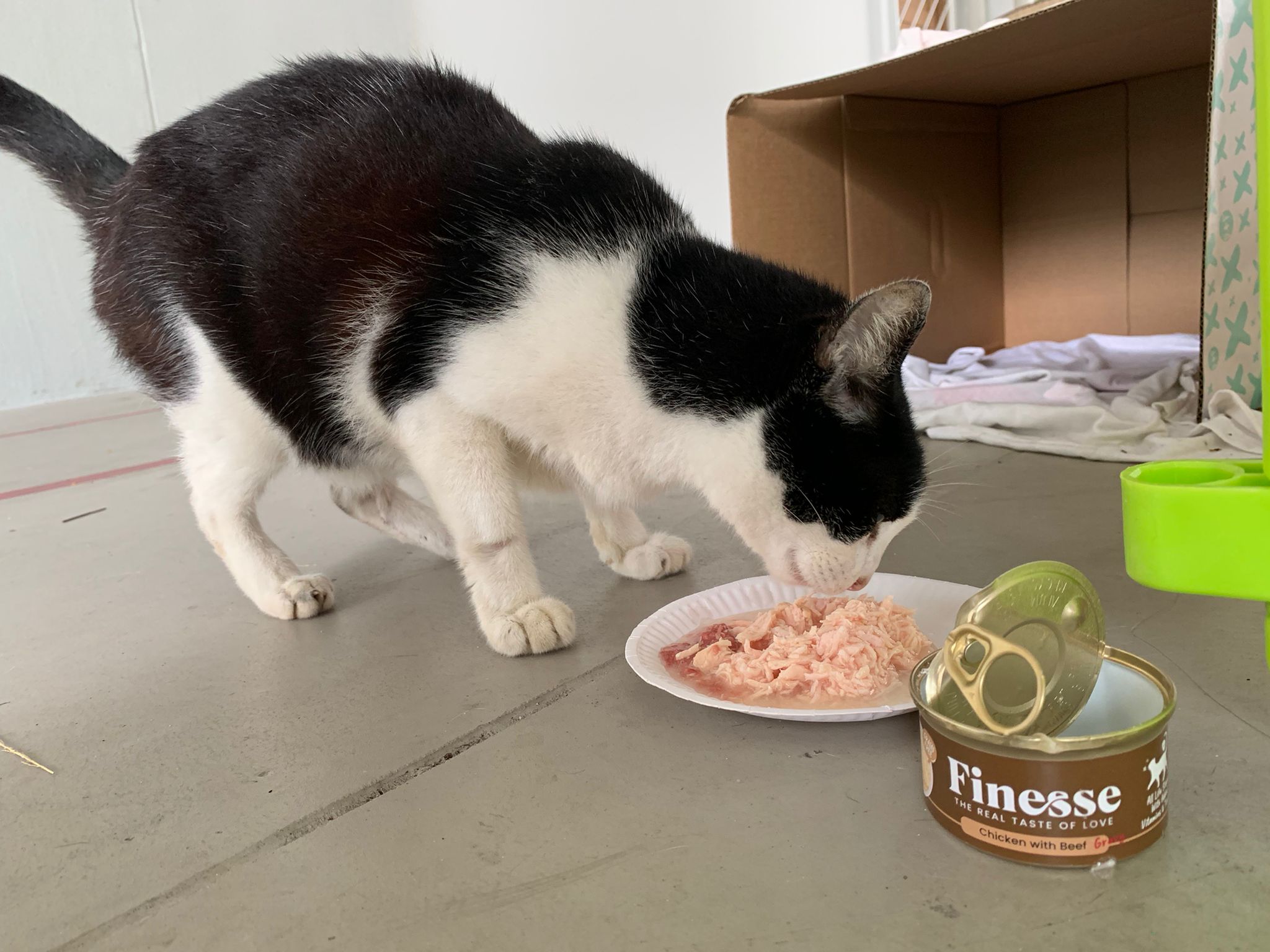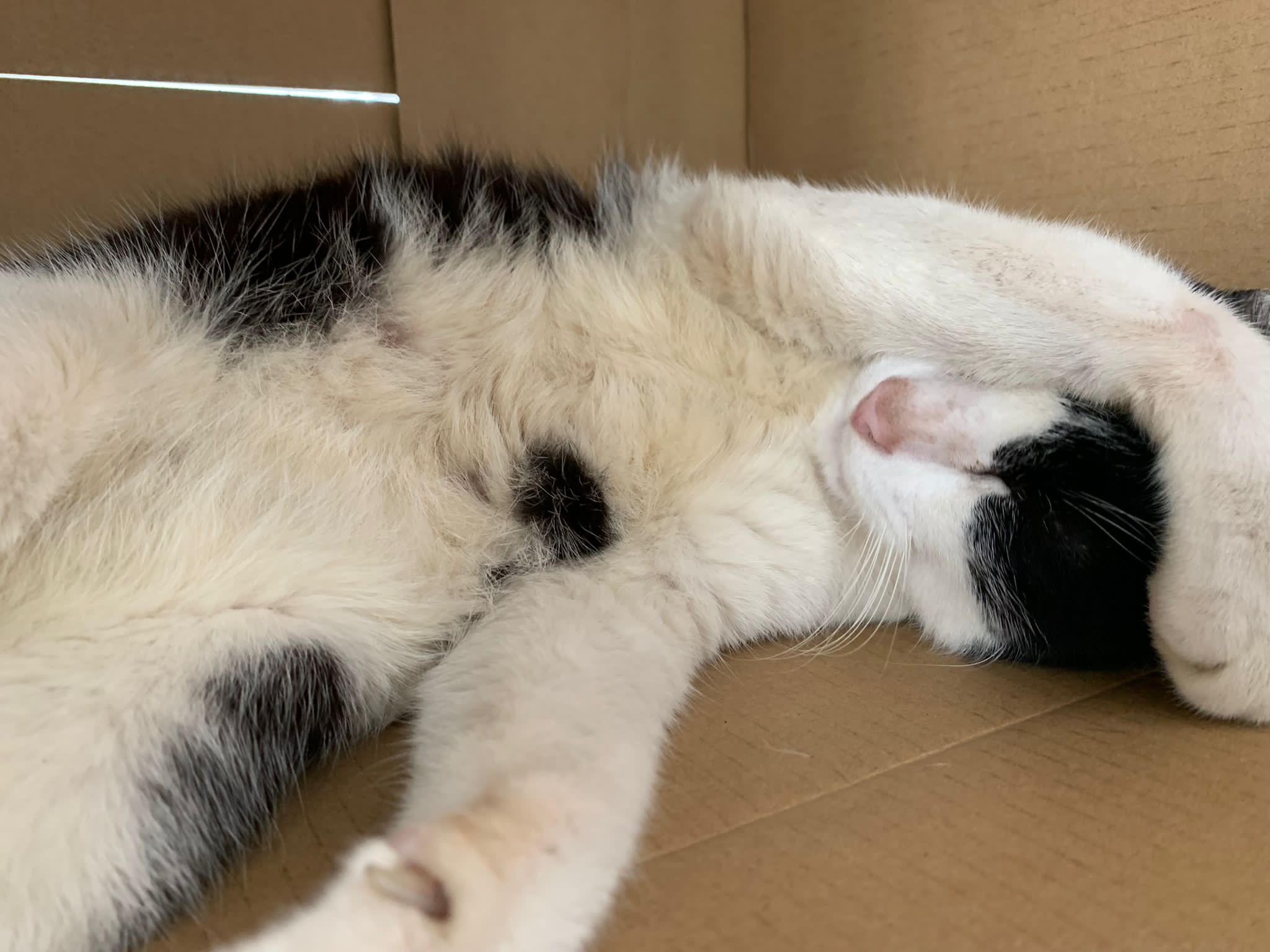10pm+: super cute, xiao Lian like to hide and sleep in box too. Someone left a box for him to sleep in. My kibble bowl is back 🙂 I top up more kibble for him 🙂 sayang him a lot.